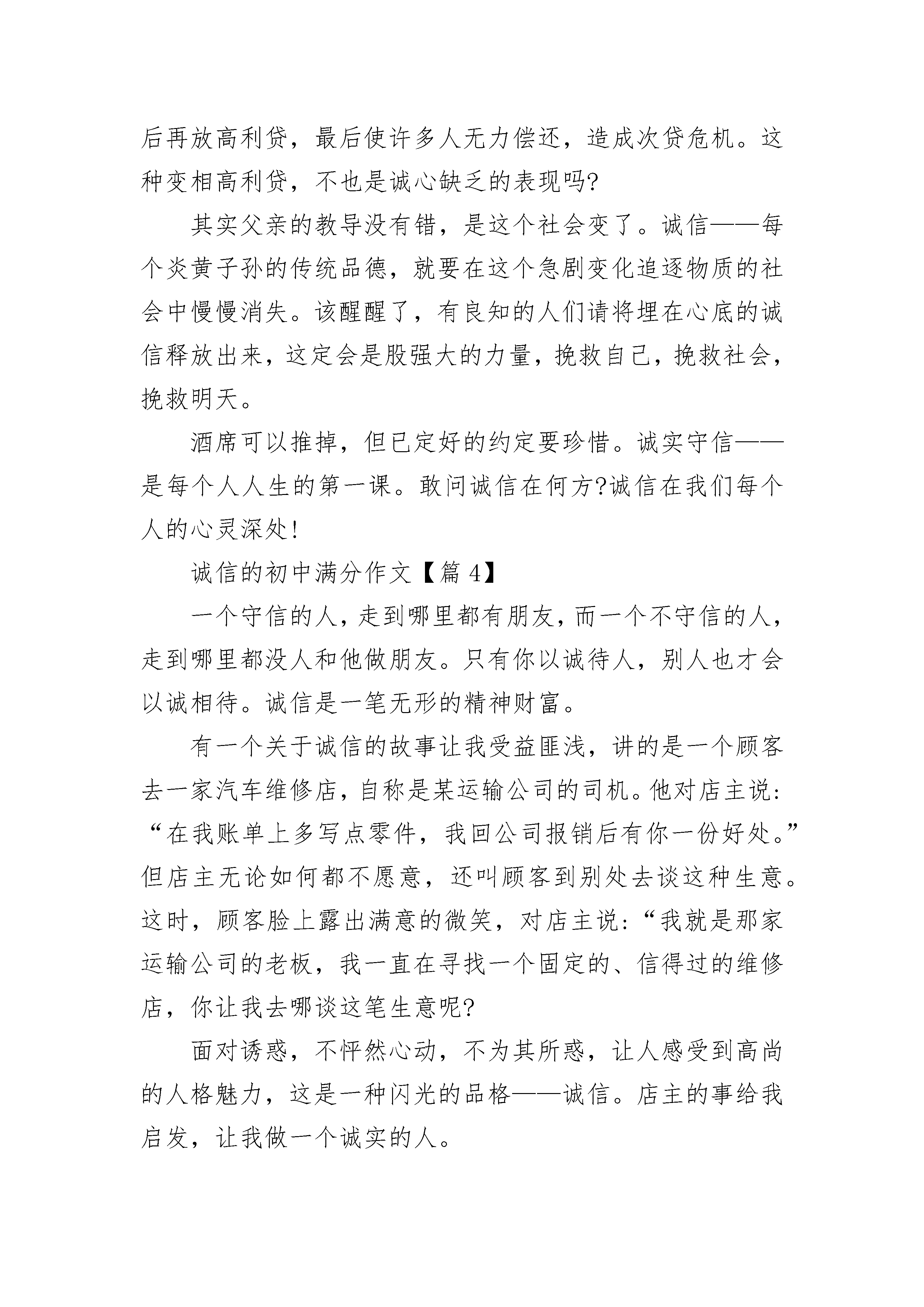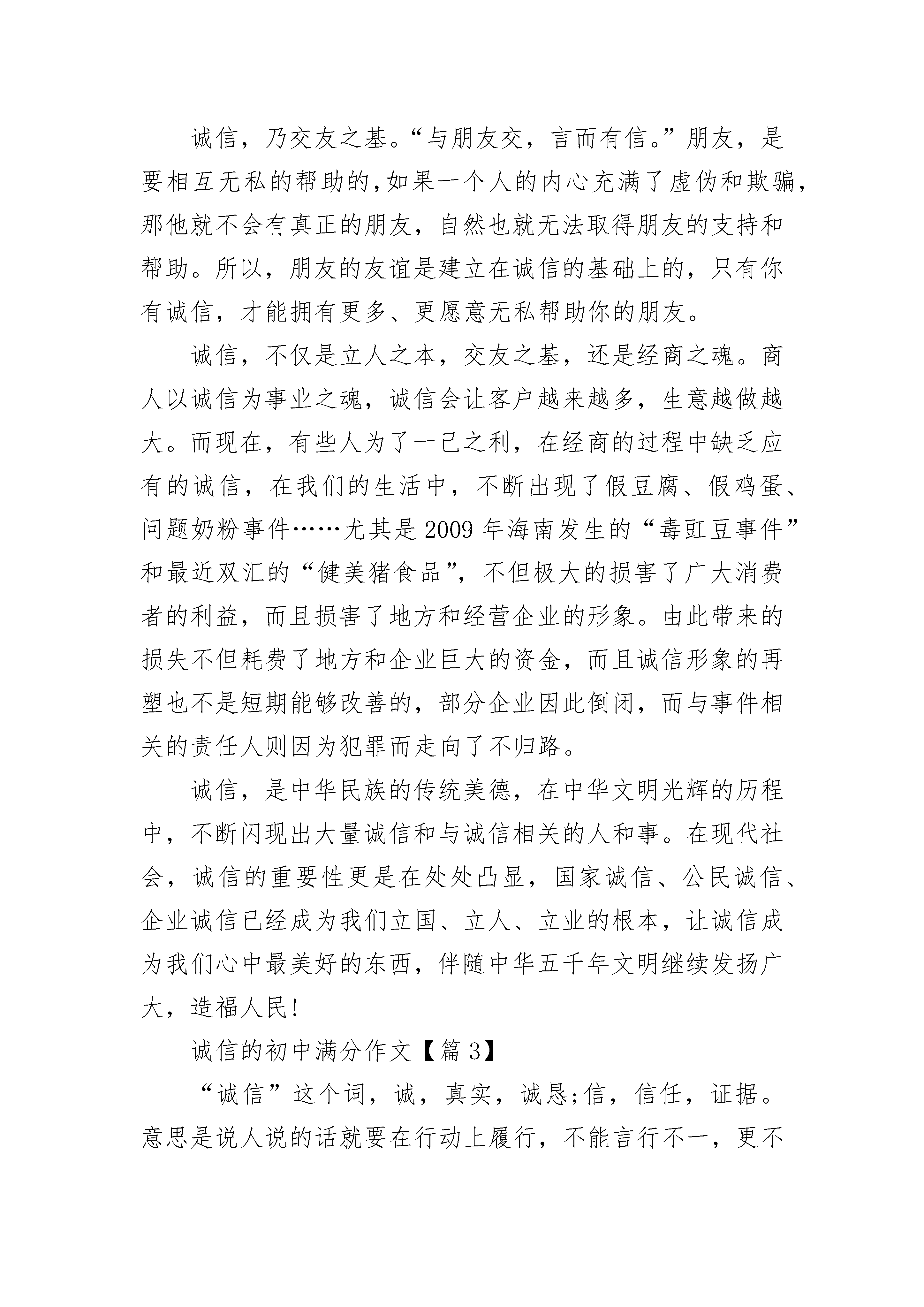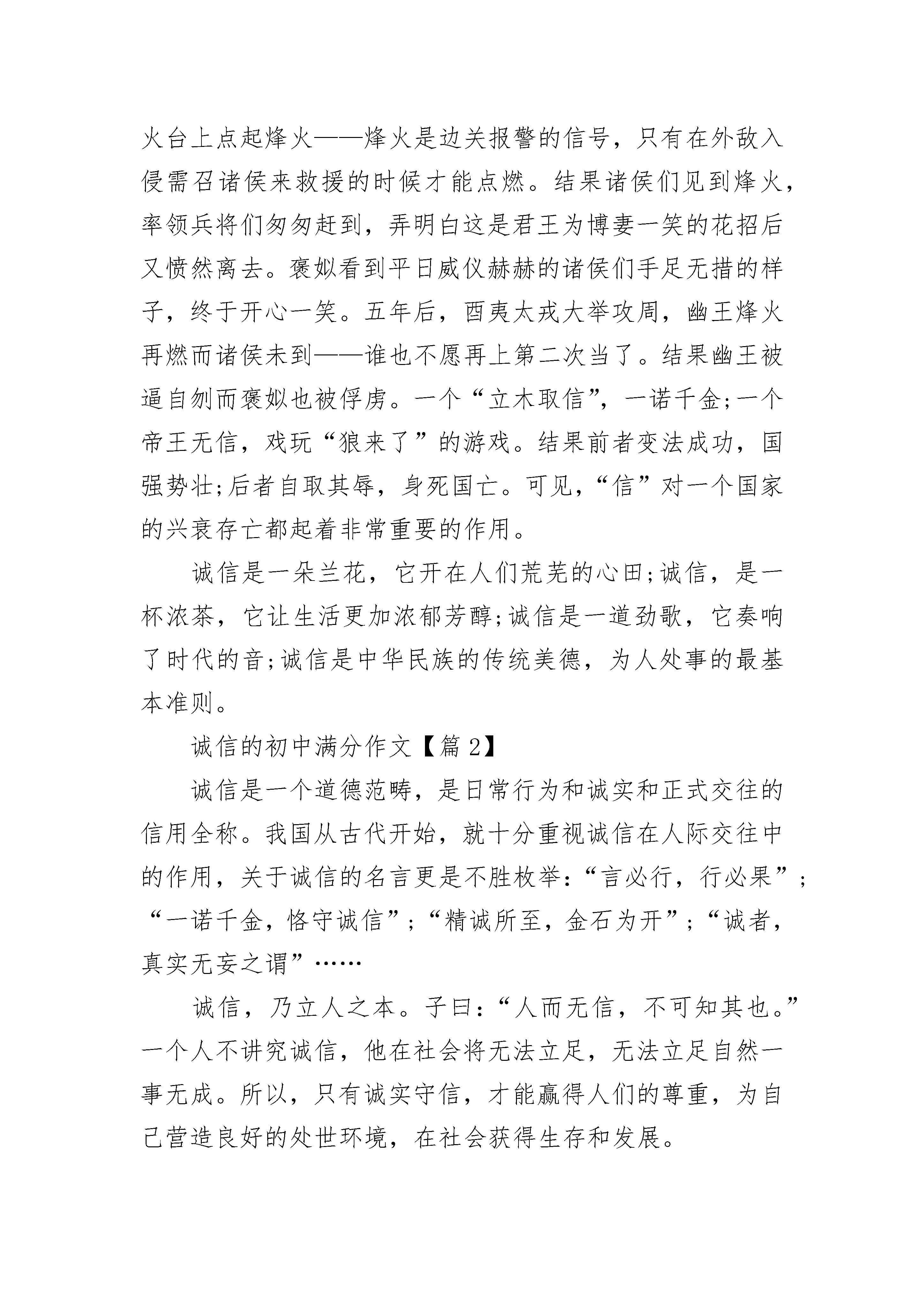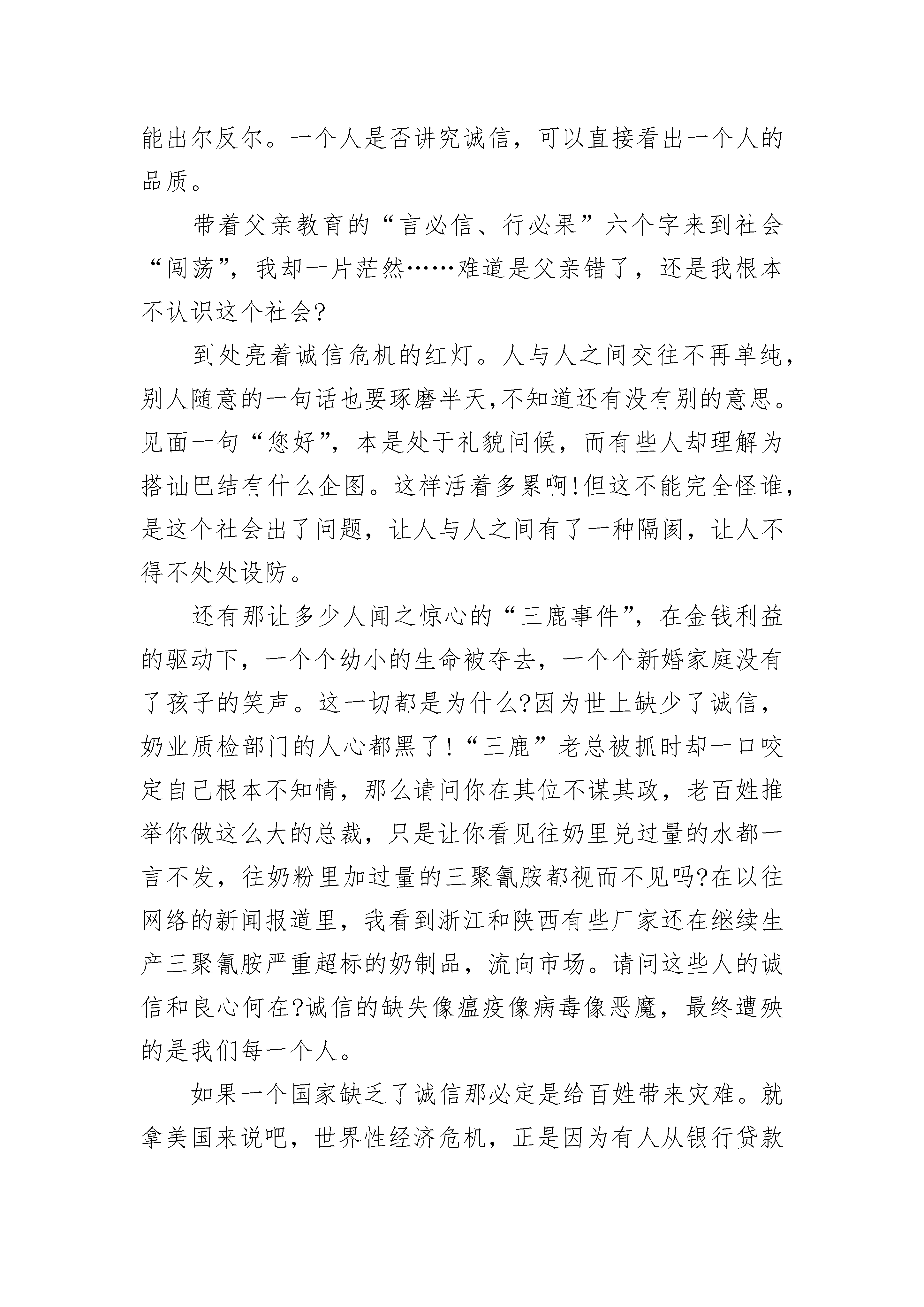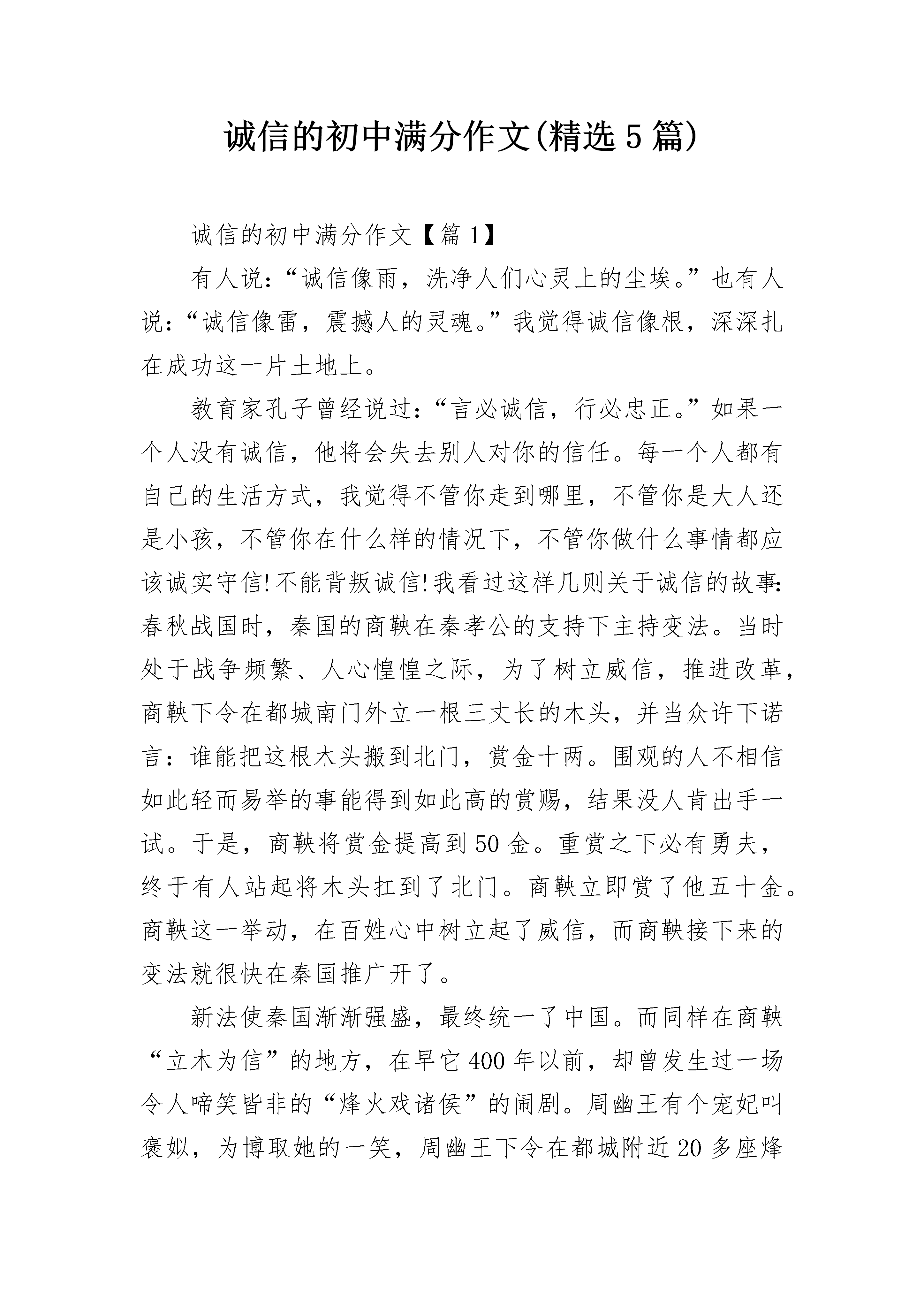 诚信的初中满分作文(精选5篇)诚信的初中满分作文【篇1】有人说:“诚信像雨,洗净人们心灵上的尘埃。”也有人说:“诚信像雷,震撼人的灵魂。”我觉得诚信像根,深深扎在成功这一片土地上。教育家孔子曾经说过:“言必诚信,行必忠正。”如果一个人没有诚信,他将会失去别人对你的信任。每一个人都有自己的生活方式,我觉得不管你走到哪里,不管你是大人还是小孩,不管你在什么样的情况下,不管你做什么事情都应该诚实守信!不能背叛诚信!我看过这样几则关于诚信的故事:春秋战国时,秦国的商鞅在秦孝公的支持下主持变法。当时处于战争频繁、人心惶惶之际,为了树立威信,推进改革,商鞅下令在都城南门外立一根三丈长的木头,并当众许下诺言:谁能把这根木头搬到北门,赏金十两。围观的人不相信如此轻而易举的事能得到如此高的赏赐,结果没人肯出手一试。于是,商鞅将赏金提高到50金。重赏之下必有勇夫,终于有人站起将木头扛到了北门。商鞅立即赏了他五十金。商鞅这一举动,在百姓心中树立起了威信,而商鞅接下来的变法就很快在秦国推广开了。新法使秦国渐渐强盛,最终统一了中国。而同样在商鞅“立木为信”的地方,在早它400年以前,却曾发生过一场令人啼笑皆非的“烽火戏诸侯”的闹剧。周幽王有个宠妃叫褒姒,为博取她的一笑,周幽王下令在都城附近20多座烽火台上点起烽火——烽火是边关报警的信号,只有在外敌入侵需召诸侯来救援的时候才能点燃。结果诸侯们见到烽火,率领兵将们匆匆赶到,弄明白这是君王为博妻一笑的花招后又愤然离去。褒姒看到平日威仪赫赫的诸侯们手足无措的样子,终于开心一笑。五年后,酉夷太戎大举攻周,幽王烽火再燃而诸侯未到——谁也不愿再上第二次当了。结果幽王被逼自刎而褒姒也被俘虏。一个“立木取信”,一诺千金;一个帝王无信,戏玩“狼来了”的游戏。结果前者变法成功,国强势壮;后者自取其辱,身死国亡。可见,“信”对一个国家的兴衰存亡都起着非常重要的作用。诚信是一朵兰花,它开在人们荒芜的心田;诚信,是一杯浓茶,它让生活更加浓郁芳醇;诚信是一道劲歌,它奏响了时代的音;诚信是中华民族的传统美德,为人处事的最基本准则。诚信的初中满分作文【篇2】诚信是一个道德范畴,是日常行为和诚实和正式交往的信用全称。我国从古代开始,就十分重视诚信在人际交往中的作用,关于诚信的名言更是不胜枚举:“言必行,行必果”;“一诺千金,恪守诚信”;“精诚所至,金石为开”;“诚者,真实无妄之谓”……诚信,乃立人之本。子曰:“人而无信,不可知其也。”一个人不讲究诚信,他在社会将无法立足,无法立足自然一事无成。所以,只有诚实守信,才能赢得人们的尊重,为自己营造良好的处世环境,在社会获得生存和发展。诚信,乃交友之基。“与朋友交,言而有信。”朋友,是要相互无私的帮助的,如果一个人的内心充满了虚伪和欺骗,那他就不会有真正的朋友,自然也就无法取得朋友的支持和帮助。所以,朋友的友谊是建立在诚信的基础上的,只有你有诚信,才能拥有更多、更愿意无私帮助你的朋友。诚信,不仅是立人之本,交友之基,还是经商之魂。商人以诚信为事业之魂,诚信会让客户越来越多,生意越做越大。而现在,有些人为了一己之利,在经商的过程中缺乏应有的诚信,在我们的生活中,不断出现了假豆腐、假鸡蛋、问题奶粉事件……尤其是2009年海南发生的“毒豇豆事件”和最近双汇的“健美猪食品”,不但极大的损害了广大消费者的利益,而且损害了地方和经营企业的形象。由此带来的损失不但耗费了地方和企业巨大的资金,而且诚信形象的再塑也不是短期能够改善的,部分企业因此倒闭,而与事件相关的责任人则因为犯罪而走向了不归路。诚信,是中华民族的传统美德,在中华文明光辉的历程中,不断闪现出大量诚信和与诚信相关的人和事。在现代社会,诚信的重要性更是在处处凸显,国家诚信、公民诚信、企业诚信已经成为我们立国、立人、立业的根本,让诚信成为我们心中最美好的东西,伴随中华五千年文明继续发扬广大,造福人民!诚信的初中满分作文【篇3】“诚信”这个词,诚,真实,诚恳;信,信任,证据。意思是说人说的话就要在行动上履行,不能言行不一,更不能出尔反尔。一个人是否讲究诚信,可以直接看出一个人的品质。带着父亲教育的“言必信、行必果”六个字来到社会“闯荡”,我却一片茫然……难道是父亲错了,还是我根本不认识这个社会?到处亮着诚信危机的红灯。人与人之间交往不再单纯,别人随意的一句话也要琢磨半天,不知道还有没有别的意思。见面一句“您好”,本是处于礼貌问候,而有些人却理解为搭讪巴结有什么企图。这样活着多累啊!但这不能完全怪谁,是这个社会出了问题,让人与人之间有了一种隔阂,让人不得不处处设防。还有那让多少人闻之惊心的“三鹿事件”,在金钱利益的驱动下,一个个幼小的生命被夺去,一个个新婚家庭没有了孩子的笑声。这一切都是为什么?因为世上缺少了诚信,奶业质检部门的人心都黑了!“三鹿”老