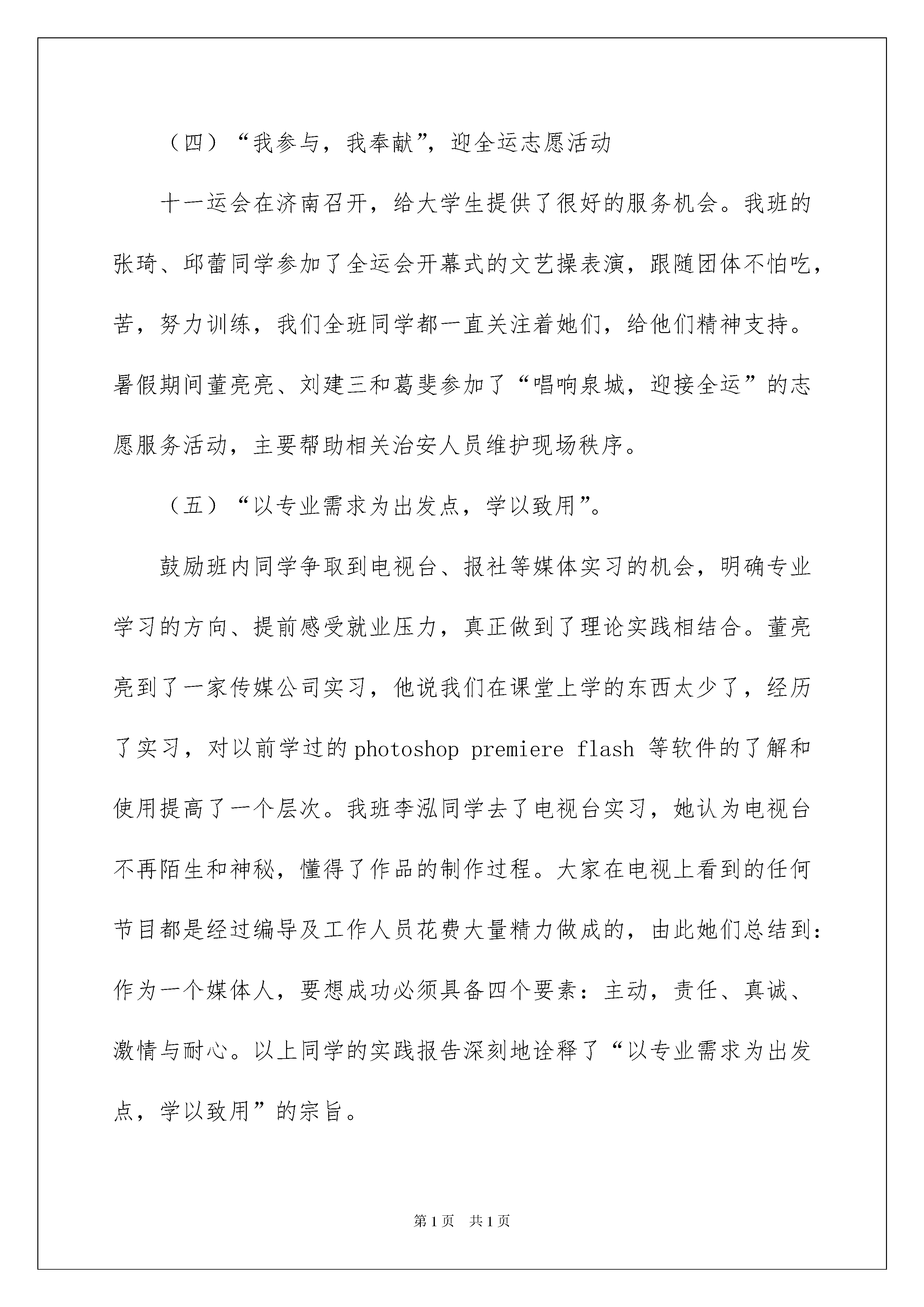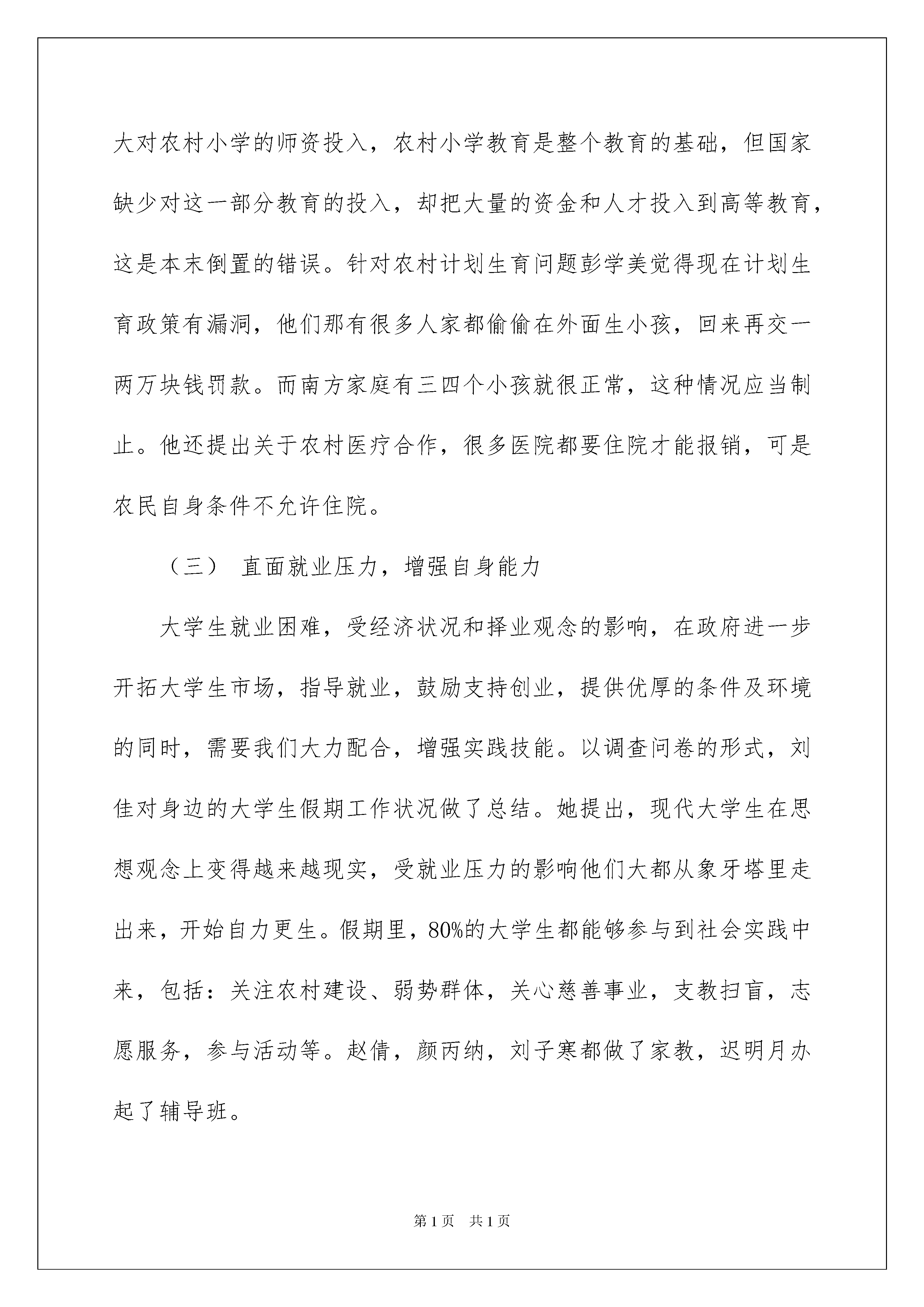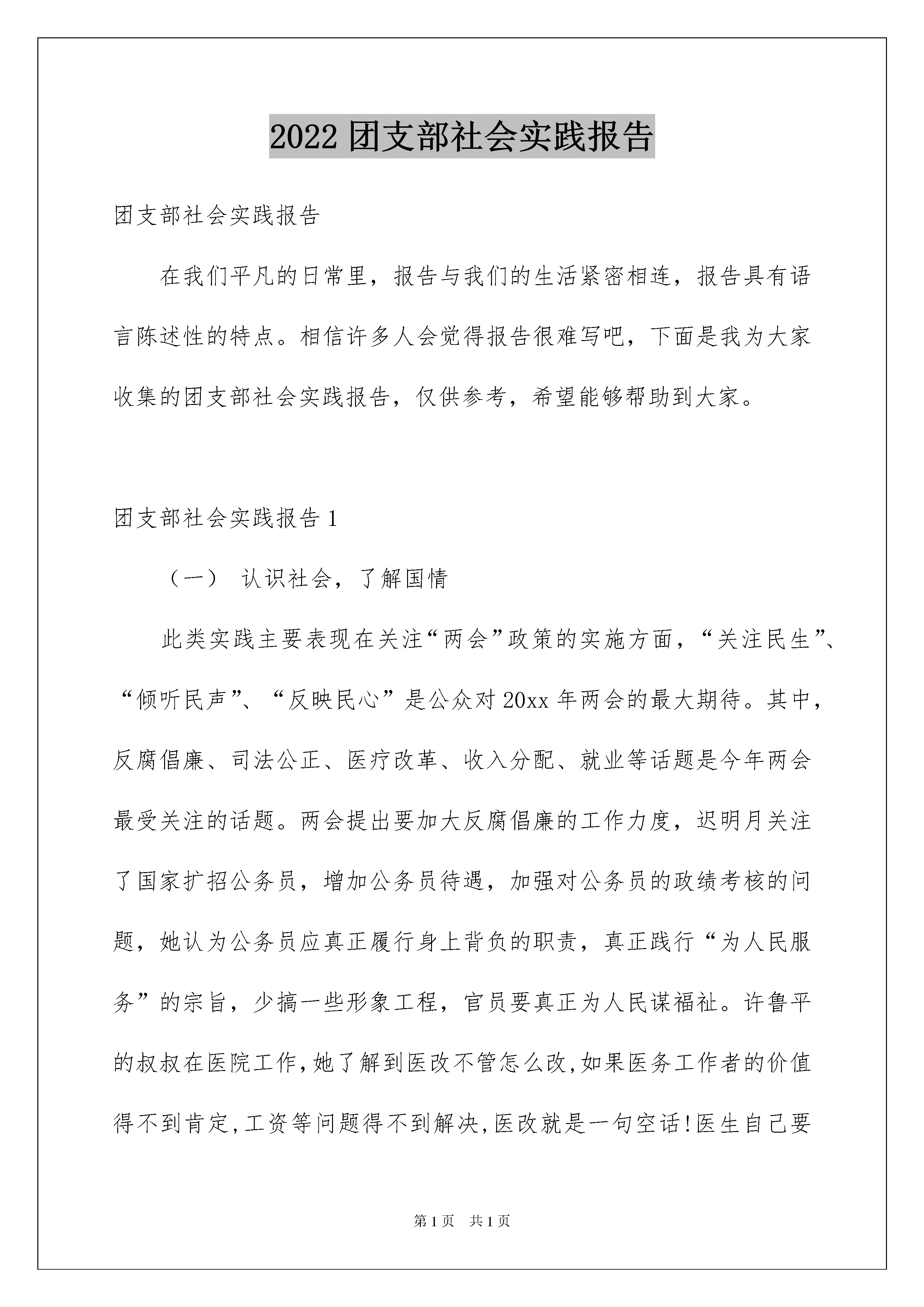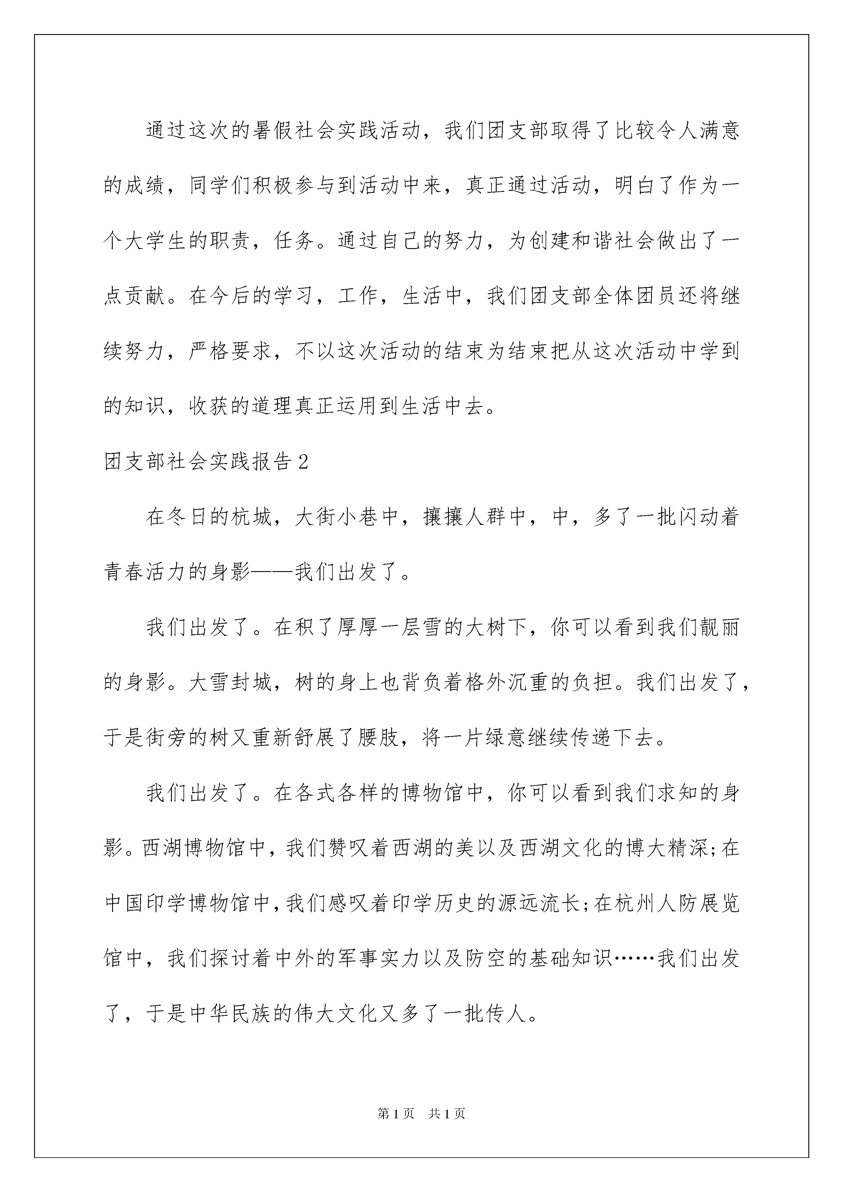 2022团支部社会实践报告团支部社会实践报告在我们平凡的日常里,报告与我们的生活紧密相连,报告具有语言陈述性的特点。相信许多人会觉得报告很难写吧,下面是我为大家收集的团支部社会实践报告,仅供参考,希望能够帮助到大家。团支部社会实践报告1(一)认识社会,了解国情此类实践主要表现在关注“两会”政策的实施方面,“关注民生”、“倾听民声”、“反映民心”是公众对20xx年两会的最大期待。其中,反腐倡廉、司法公正、医疗改革、收入分配、就业等话题是今年两会最受关注的话题。两会提出要加大反腐倡廉的工作力度,迟明月关注了国家扩招公务员,增加公务员待遇,加强对公务员的政绩考核的问题,她认为公务员应真正履行身上背负的职责,真正践行“为人民服务”的宗旨,少搞一些形象工程,官员要真正为人民谋福祉。许鲁平的叔叔在医院工作,她了解到医改不管怎么改,如果医务工作者的价值得不到肯定,工资等问题得不到解决,医改就是一句空话!医生自己要生存,还要养家,如果不解决这些问题,降低药价诊疗费是不现实的,也是不可能的。针对目前好多人怪我们社会保障制度不好,敬春宾认为这种现象归根到底还是我们太穷,以经济建设为中心,大力发展生产力增强综合国力,才是真理。他说他会一直关注两会,我对党、对国家、对社会、对同胞充满信心和爱心。关于教育制度方面朱瑞芹思考如何解决现今高等院校扩招而造成的一系列后果,像大学生增多会给社会带来极大的压力,大学生如何保持之前的天之骄子的地位。对于是否进行教育改革,高中学校是否分科,高考制度如何改,国家还有很长的路要走。(二)关注新农村建设十七大召开以后,全国范围内的建设新农村取得了长足进展。生活在农村的同学深刻的感受到了这一切,同时他们对新农村建设现状也有了自己的看法。颜丙纳说应进一步重视村级基层村委会成员的工资待遇、社会保险问题。工作在农村最基层的村委会成员,工作重担都压在他们的身上,千线万丝都要经过他们一孔,他们是农村社会稳定、经济发展的带头人,他们在职和退位时的待遇都少得可怜。刘建三针对农村教育提出自己的观点应该大力改善农村基础教育条件,加大对农村小学的师资投入,农村小学教育是整个教育的基础,但国家缺少对这一部分教育的投入,却把大量的资金和人才投入到高等教育,这是本末倒置的错误。针对农村计划生育问题彭学美觉得现在计划生育政策有漏洞,他们那有很多人家都偷偷在外面生小孩,回来再交一两万块钱罚款。而南方家庭有三四个小孩就很正常,这种情况应当制止。他还提出关于农村医疗合作,很多医院都要住院才能报销,可是农民自身条件不允许住院。(三)直面就业压力,增强自身能力大学生就业困难,受经济状况和择业观念的影响,在政府进一步开拓大学生市场,指导就业,鼓励支持创业,提供优厚的条件及环境的同时,需要我们大力配合,增强实践技能。以调查问卷的形式,刘佳对身边的大学生假期工作状况做了总结。她提出,现代大学生在思想观念上变得越来越现实,受就业压力的影响他们大都从象牙塔里走出来,开始自力更生。假期里,80%的大学生都能够参与到社会实践中来,包括:关注农村建设、弱势群体,关心慈善事业,支教扫盲,志愿服务,参与活动等。赵倩,颜丙纳,刘子寒都做了家教,迟明月办起了辅导班。(四)“我参与,我奉献”,迎全运志愿活动十一运会在济南召开,给大学生提供了很好的服务机会。我班的张琦、邱蕾同学参加了全运会开幕式的文艺操表演,跟随团体不怕吃,苦,努力训练,我们全班同学都一直关注着她们,给他们精神支持。暑假期间董亮亮、刘建三和葛斐参加了“唱响泉城,迎接全运”的志愿服务活动,主要帮助相关治安人员维护现场秩序。(五)“以专业需求为出发点,学以致用”。鼓励班内同学争取到电视台、报社等媒体实习的机会,明确专业学习的方向、提前感受就业压力,真正做到了理论实践相结合。董亮亮到了一家传媒公司实习,他说我们在课堂上学的东西太少了,经历了实习,对以前学过的photoshoppremiereflash等软件的了解和使用提高了一个层次。我班李泓同学去了电视台实习,她认为电视台不再陌生和神秘,懂得了作品的制作过程。大家在电视上看到的任何节目都是经过编导及工作人员花费大量精力做成的,由此她们总结到:作为一个媒体人,要想成功必须具备四个要素:主动,责任、真诚、激情与耐心。以上同学的实践报告深刻地诠释了“以专业需求为出发点,学以致用”的宗旨。通过这次的暑假社会实践活动,我们团支部取得了比较令人满意的成绩,同学们积极参与到活动中来,真正通过活动,明白了作为一个大学生的职责,任务。通过自己的努力,为创建和谐社会做出了一点贡献。在今后的学习,工作,生活中,我们团支部全体团员还将继续努力,严
