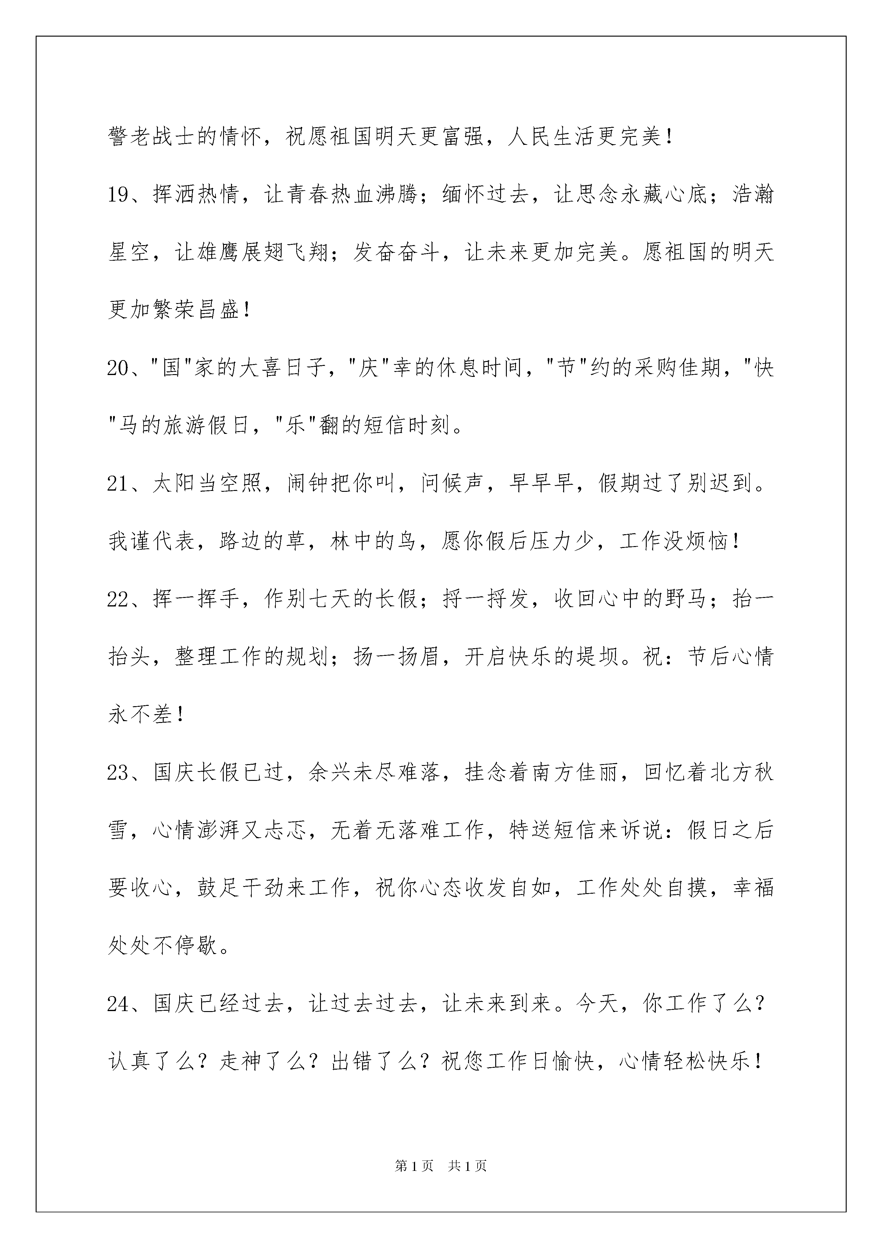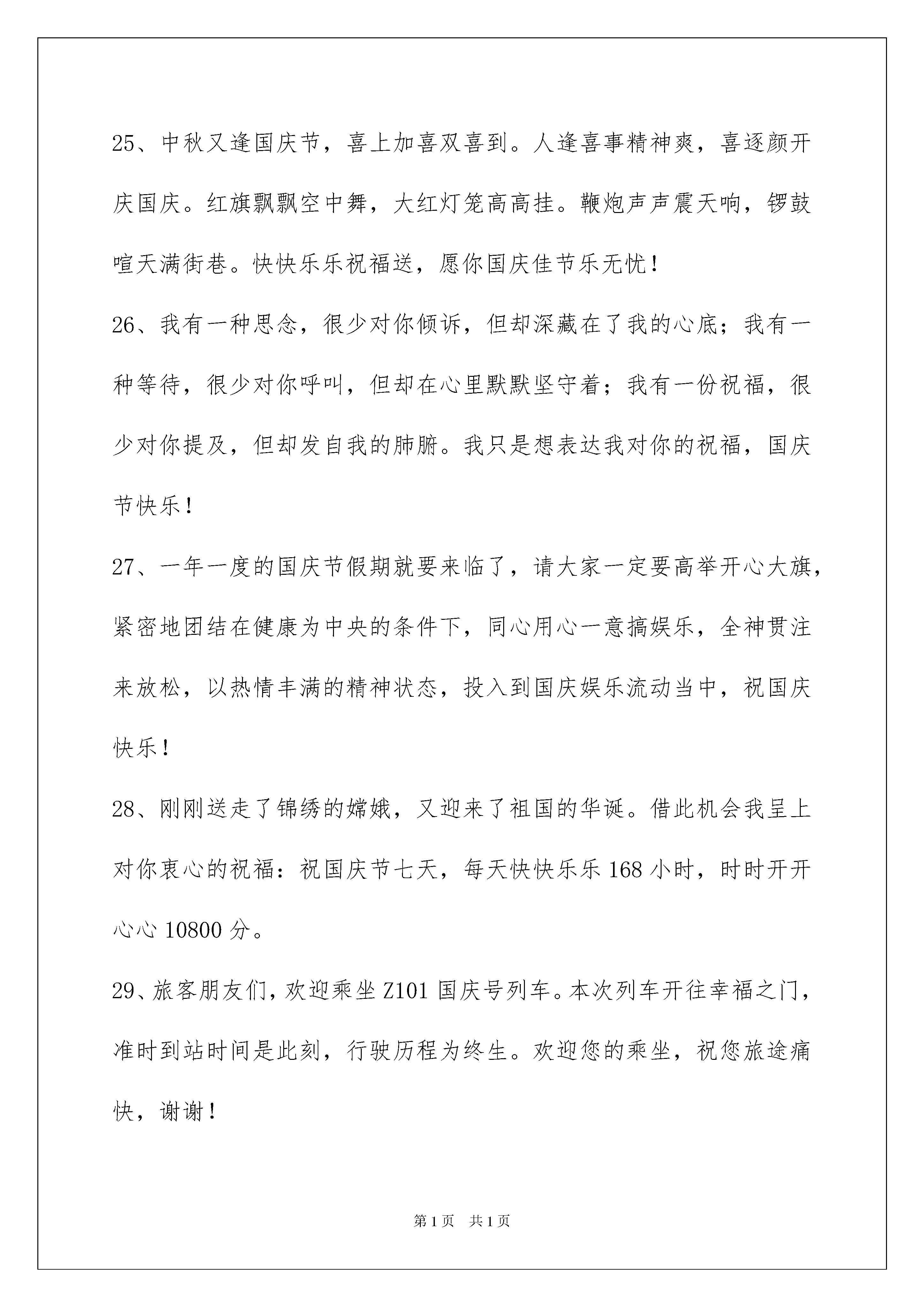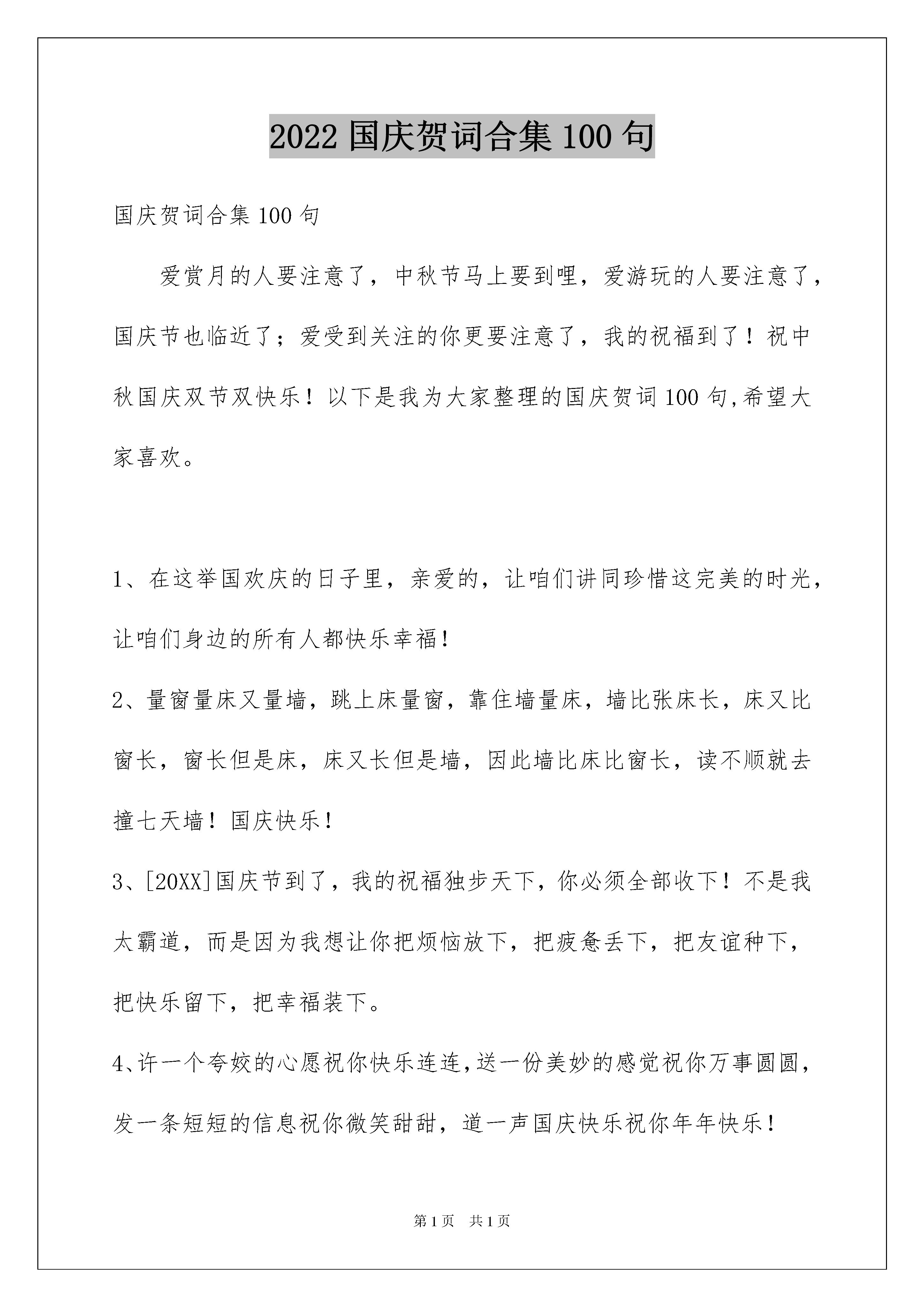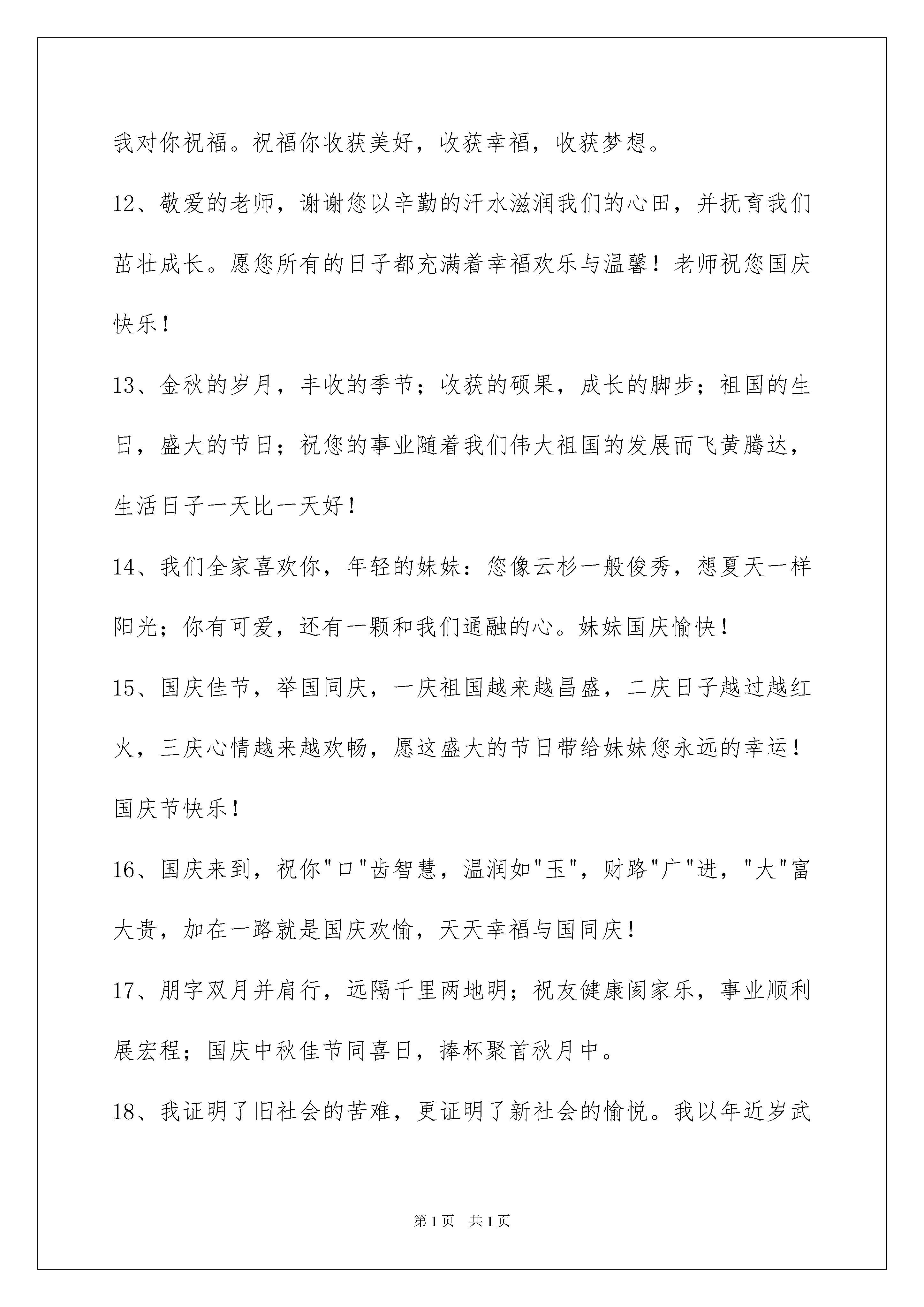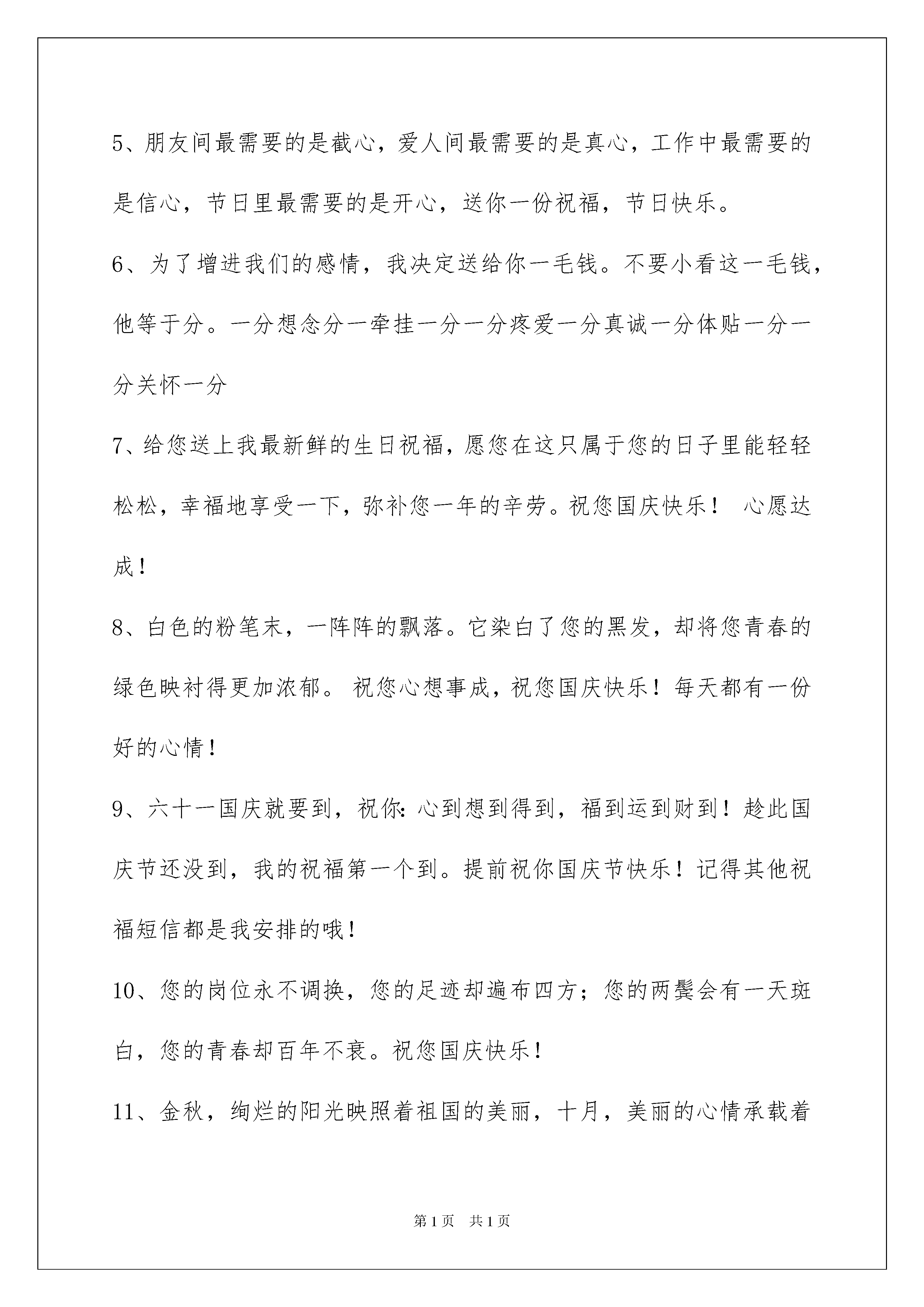 2022国庆贺词合集100句国庆贺词合集100句爱赏月的人要注意了,中秋节马上要到哩,爱游玩的人要注意了,国庆节也临近了;爱受到关注的你更要注意了,我的祝福到了!祝中秋国庆双节双快乐!以下是我为大家整理的国庆贺词100句,希望大家喜欢。1、在这举国欢庆的日子里,亲爱的,让咱们讲同珍惜这完美的时光,让咱们身边的所有人都快乐幸福!2、量窗量床又量墙,跳上床量窗,靠住墙量床,墙比张床长,床又比窗长,窗长但是床,床又长但是墙,因此墙比床比窗长,读不顺就去撞七天墙!国庆快乐!3、[20XX]国庆节到了,我的祝福独步天下,你必须全部收下!不是我太霸道,而是因为我想让你把烦恼放下,把疲惫丢下,把友谊种下,把快乐留下,把幸福装下。4、许一个夸姣的心愿祝你快乐连连,送一份美妙的感觉祝你万事圆圆,发一条短短的信息祝你微笑甜甜,道一声国庆快乐祝你年年快乐!5、朋友间最需要的是截心,爱人间最需要的是真心,工作中最需要的是信心,节日里最需要的是开心,送你一份祝福,节日快乐。6、为了增进我们的感情,我决定送给你一毛钱。不要小看这一毛钱,他等于分。一分想念分一牵挂一分一分疼爱一分真诚一分体贴一分一分关怀一分7、给您送上我最新鲜的生日祝福,愿您在这只属于您的日子里能轻轻松松,幸福地享受一下,弥补您一年的辛劳。祝您国庆快乐!心愿达成!8、白色的粉笔末,一阵阵的飘落。它染白了您的黑发,却将您青春的绿色映衬得更加浓郁。祝您心想事成,祝您国庆快乐!每天都有一份好的心情!9、六十一国庆就要到,祝你:心到想到得到,福到运到财到!趁此国庆节还没到,我的祝福第一个到。提前祝你国庆节快乐!记得其他祝福短信都是我安排的哦!10、您的岗位永不调换,您的足迹却遍布四方;您的两鬓会有一天斑白,您的青春却百年不衰。祝您国庆快乐!11、金秋,绚烂的阳光映照着祖国的美丽,十月,美丽的心情承载着我对你祝福。祝福你收获美好,收获幸福,收获梦想。12、敬爱的老师,谢谢您以辛勤的汗水滋润我们的心田,并抚育我们茁壮成长。愿您所有的日子都充满着幸福欢乐与温馨!老师祝您国庆快乐!13、金秋的岁月,丰收的季节;收获的硕果,成长的脚步;祖国的生日,盛大的节日;祝您的事业随着我们伟大祖国的发展而飞黄腾达,生活日子一天比一天好!14、我们全家喜欢你,年轻的妹妹:您像云杉一般俊秀,想夏天一样阳光;你有可爱,还有一颗和我们通融的心。妹妹国庆愉快!15、国庆佳节,举国同庆,一庆祖国越来越昌盛,二庆日子越过越红火,三庆心情越来越欢畅,愿这盛大的节日带给妹妹您永远的幸运!国庆节快乐!16、国庆来到,祝你"口"齿智慧,温润如"玉",财路"广"进,"大"富大贵,加在一路就是国庆欢愉,天天幸福与国同庆!17、朋字双月并肩行,远隔千里两地明;祝友健康阂家乐,事业顺利展宏程;国庆中秋佳节同喜日,捧杯聚首秋月中。18、我证明了旧社会的苦难,更证明了新社会的愉悦。我以年近岁武警老战士的情怀,祝愿祖国明天更富强,人民生活更完美!19、挥洒热情,让青春热血沸腾;缅怀过去,让思念永藏心底;浩瀚星空,让雄鹰展翅飞翔;发奋奋斗,让未来更加完美。愿祖国的明天更加繁荣昌盛!20、"国"家的大喜日子,"庆"幸的休息时间,"节"约的采购佳期,"快"马的旅游假日,"乐"翻的短信时刻。21、太阳当空照,闹钟把你叫,问候声,早早早,假期过了别迟到。我谨代表,路边的草,林中的鸟,愿你假后压力少,工作没烦恼!22、挥一挥手,作别七天的长假;捋一捋发,收回心中的野马;抬一抬头,整理工作的规划;扬一扬眉,开启快乐的堤坝。祝:节后心情永不差!23、国庆长假已过,余兴未尽难落,挂念着南方佳丽,回忆着北方秋雪,心情澎湃又忐忑,无着无落难工作,特送短信来诉说:假日之后要收心,鼓足干劲来工作,祝你心态收发自如,工作处处自摸,幸福处处不停歇。24、国庆已经过去,让过去过去,让未来到来。今天,你工作了么?认真了么?走神了么?出错了么?祝您工作日愉快,心情轻松快乐!25、中秋又逢国庆节,喜上加喜双喜到。人逢喜事精神爽,喜逐颜开庆国庆。红旗飘飘空中舞,大红灯笼高高挂。鞭炮声声震天响,锣鼓喧天满街巷。快快乐乐祝福送,愿你国庆佳节乐无忧!26、我有一种思念,很少对你倾诉,但却深藏在了我的心底;我有一种等待,很少对你呼叫,但却在心里默默坚守着;我有一份祝福,很少对你提及,但却发自我的肺腑。我只是想表达我对你的祝福,国庆节快乐!27、一年一度的国庆节假期就要来临了,请大家一定要高举开心大旗,紧密地团结在健康为中央的条件下,同心用心一意搞娱乐,全神贯注来放松,以热情丰满的精神状态,投入到国庆娱乐流动当中,祝国庆快乐!28、刚刚送走了锦绣的