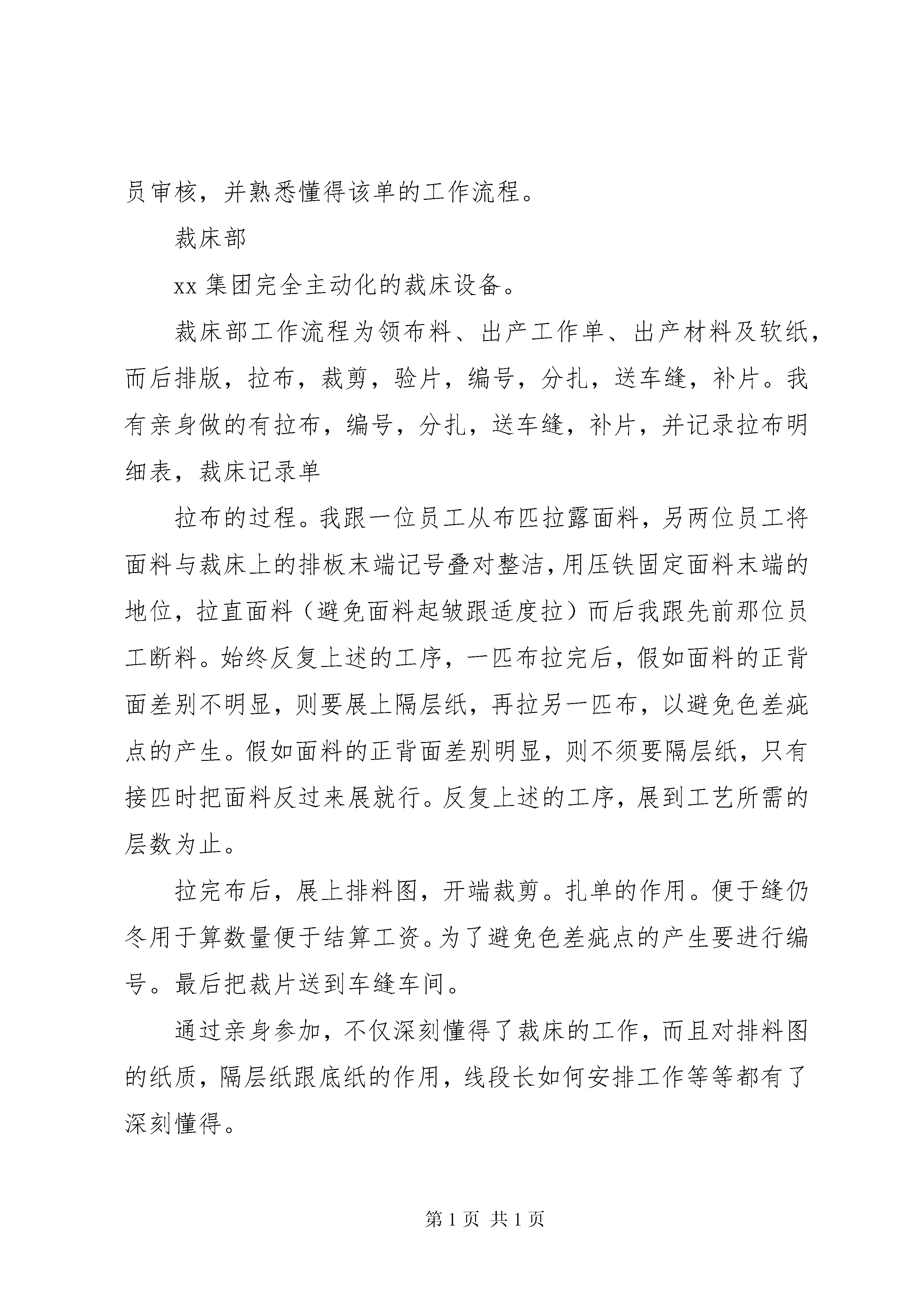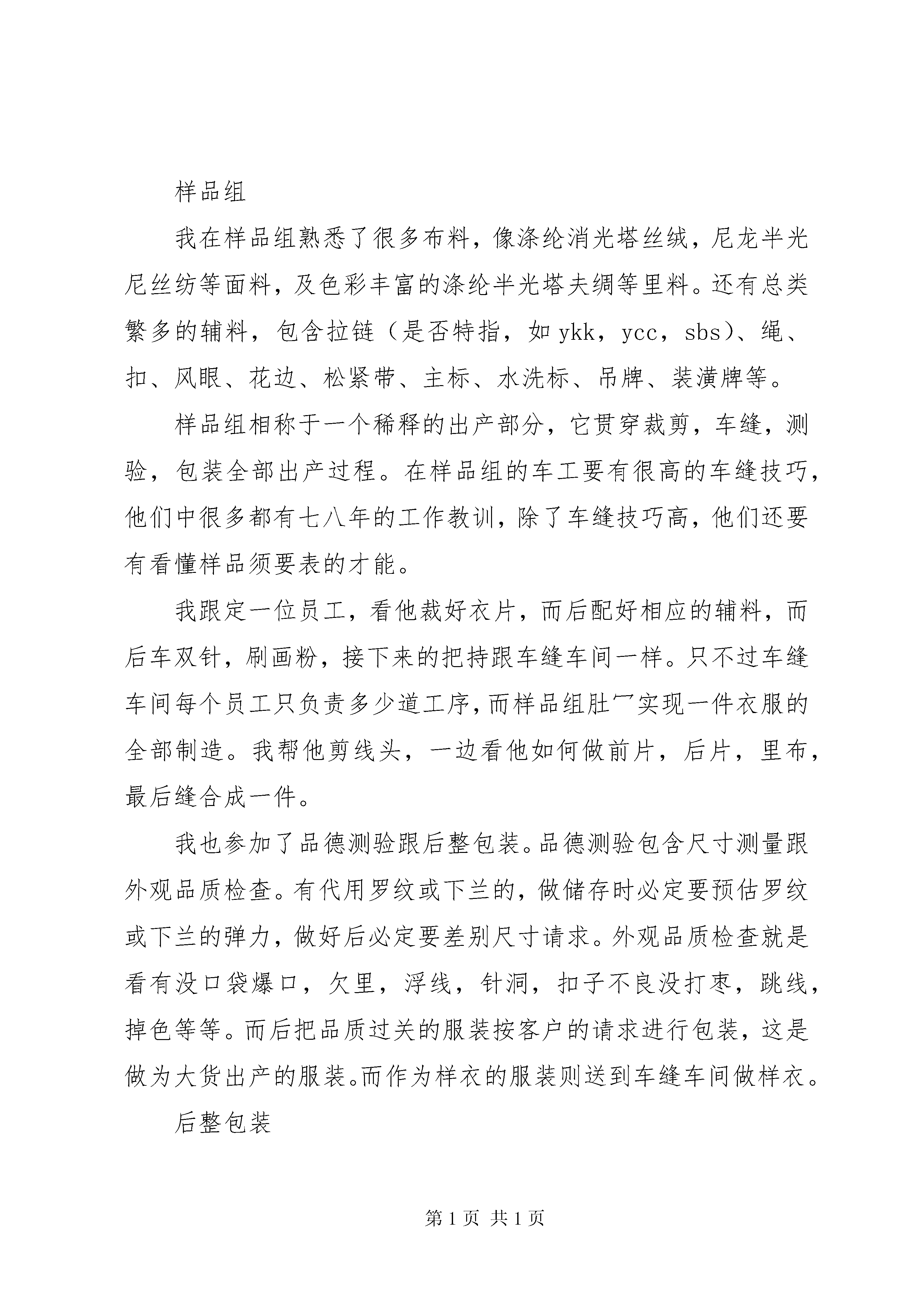 关于服装设计实习报告范文关于服装设计实习报告范文篇1这次实习我被安排到了xx集团的xx服饰意大利精品线长进行这次的重要实习场合,咱们都是在一线出产的处所进行学习,这里是出产男西服为重要的出产力量远销海外,这里面给人感慨最深的就是严格的管理轨制跟进步的出产设备。以下是我的毕业实习报告:车缝车间服装缝制出产过程的公平组织是进步服装出产的重要保障,其目标是使产品在缝制出产过程中的工艺路线最短,加工时光最省,耗费最小,出产出满意客户请求的产品。所以要做好工艺设计,也即把人,设备跟空间公平川组合起来。第一步就要做好车缝上线筹备工作:设定好工段人机安排图,由段长根据目标产量,对工段均衡出产做好人员调配,上交ie人员(本文来自中科软件园审核,并熟悉懂得该单的工作流程因为在车缝车间时光较长,而机台都是固定员工把持,主任也很难堪怎么给咱们调配工作。我禀着以起码的时光懂得最多公司的情况跟尽可能学到更多的常识的准则,采取了多看,多问,多着手,多猜忌的立场,在实现领导安排的任务情况下争夺多做事件,看了大量该公司的文件,如人机安排图,外发派工单,订单过程表,单元流水工序排图,出产配料单工艺制造单等等。在参观车间的过程中深进懂得了大货出产的工艺流程。对工段均衡出产做好人员调配,上交ie人员审核,并熟悉懂得该单的工作流程。裁床部xx集团完全主动化的裁床设备。裁床部工作流程为领布料、出产工作单、出产材料及软纸,而后排版,拉布,裁剪,验片,编号,分扎,送车缝,补片。我有亲身做的有拉布,编号,分扎,送车缝,补片,并记录拉布明细表,裁床记录单拉布的过程。我跟一位员工从布匹拉露面料,另两位员工将面料与裁床上的排板末端记号叠对整洁,用压铁固定面料末端的地位,拉直面料(避免面料起皱跟适度拉)而后我跟先前那位员工断料。始终反复上述的工序,一匹布拉完后,假如面料的正背面差别不明显,则要展上隔层纸,再拉另一匹布,以避免色差疵点的产生。假如面料的正背面差别明显,则不须要隔层纸,只有接匹时把面料反过来展就行。反复上述的工序,展到工艺所需的层数为止。拉完布后,展上排料图,开端裁剪。扎单的作用。便于缝仍冬用于算数量便于结算工资。为了避免色差疵点的产生要进行编号。最后把裁片送到车缝车间。通过亲身参加,不仅深刻懂得了裁床的工作,而且对排料图的纸质,隔层纸跟底纸的作用,线段长如何安排工作等等都有了深刻懂得。样品组我在样品组熟悉了很多布料,像涤纶消光塔丝绒,尼龙半光尼丝纺等面料,及色彩丰富的涤纶半光塔夫绸等里料。还有总类繁多的辅料,包含拉链(是否特指,如ykk,ycc,sbs)、绳、扣、风眼、花边、松紧带、主标、水洗标、吊牌、装潢牌等。样品组相称于一个稀释的出产部分,它贯穿裁剪,车缝,测验,包装全部出产过程。在样品组的车工要有很高的车缝技巧,他们中很多都有七八年的工作教训,除了车缝技巧高,他们还要有看懂样品须要表的才能。我跟定一位员工,看他裁好衣片,而后配好相应的辅料,而后车双针,刷画粉,接下来的把持跟车缝车间一样。只不过车缝车间每个员工只负责多少道工序,而样品组肚冖实现一件衣服的全部制造。我帮他剪线头,一边看他如何做前片,后片,里布,最后缝合成一件。我也参加了品德测验跟后整包装。品德测验包含尺寸测量跟外观品质检查。有代用罗纹或下兰的,做储存时必定要预估罗纹或下兰的弹力,做好后必定要差别尺寸请求。外观品质检查就是看有没口袋爆口,欠里,浮线,针洞,扣子不良没打枣,跳线,掉色等等。而后把品质过关的服装按客户的请求进行包装,这是做为大货出产的服装。而作为样衣的服装则送到车缝车间做样衣。后整包装在后整包装我做清剪线头,把脏污,画粉荡涤干净,并在做这些的时候把呈现爆口,断线,没扣子,欠拉绊,无吊钟,破洞等不良景象的服装挑出来及挂吊牌、备用扣、放眼镜捕嗌羸折叠衣服,还有根据装箱调配表填写外箱单。外箱单包含格式,色彩,尺码,北京法律翻译公司每箱数量,订单号,箱号。在后整包装要留心的事件还是很多的、总检组做为总检组的员工,必定要对服装测验常识非常懂得。我以总检组两天的实习经历对她们的工作请求做了实习报告总结。他们这是很重要的环节,因为他们差未多少就是相称于客户的请求。以上是我的实习报告,在实习过程中,我学会了很多,在当前的实际工作中,我会加倍尽力,使本人的工作做到更好。毕业实习作为本科教养的重要实际环节,其目标是结合大学阶段所学常识,对存在代表性的城市进行服饰、面料风行信息调研,分析、总结风行信息,并在服装公司进行实习,更全面的懂得服装出产状况、出产流程、出产工艺、销售状况等企业信息。通过实习培养同窗分析标题、解决标题标才能,收集毕业设计须要的信息,为顺利实现毕业设计打下良好的基本。在这一个多月的实习中我学到了很多以前在课堂上跟书本上基本就学不到的常识,甚至是以前渴看得悉的常识。在