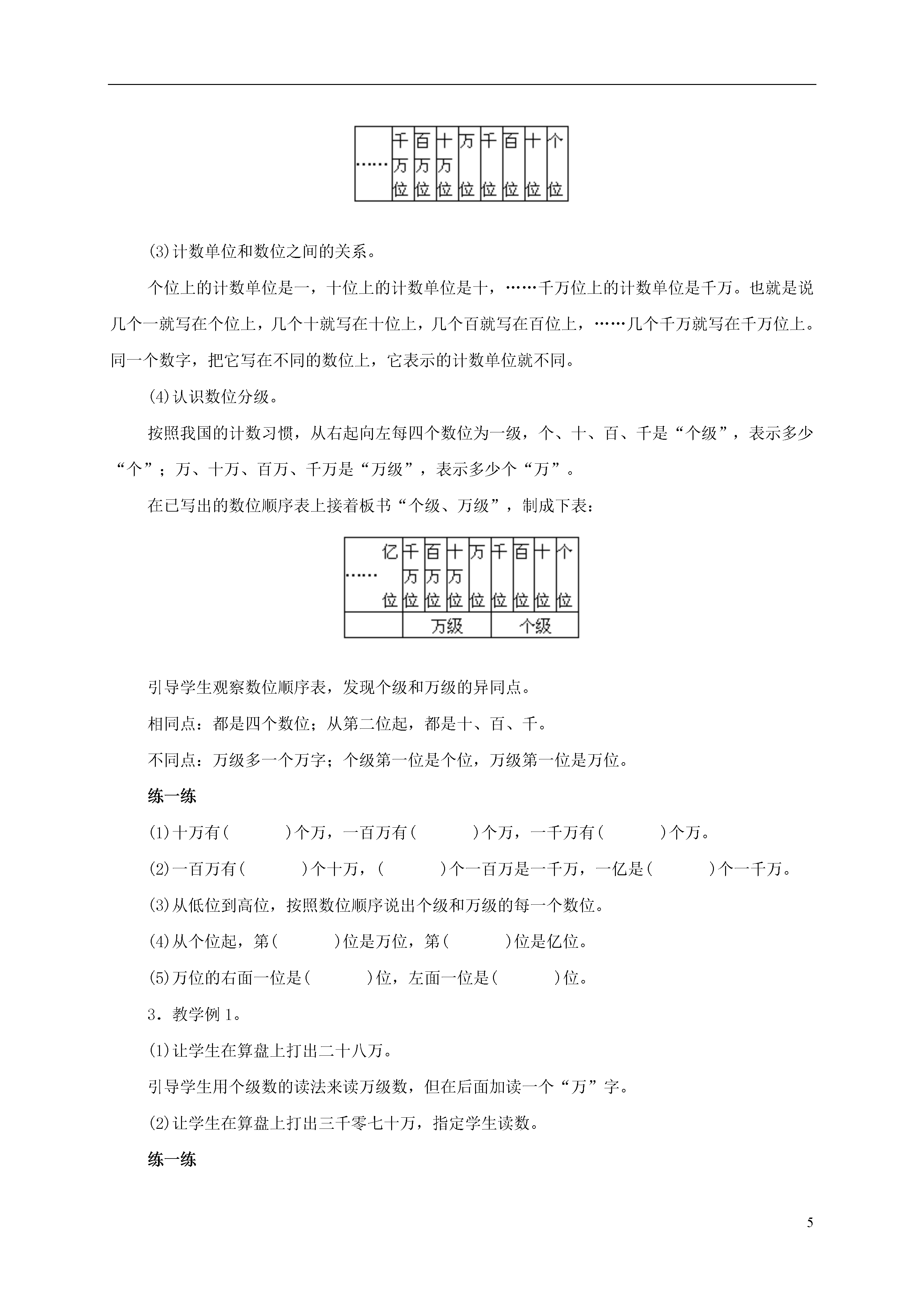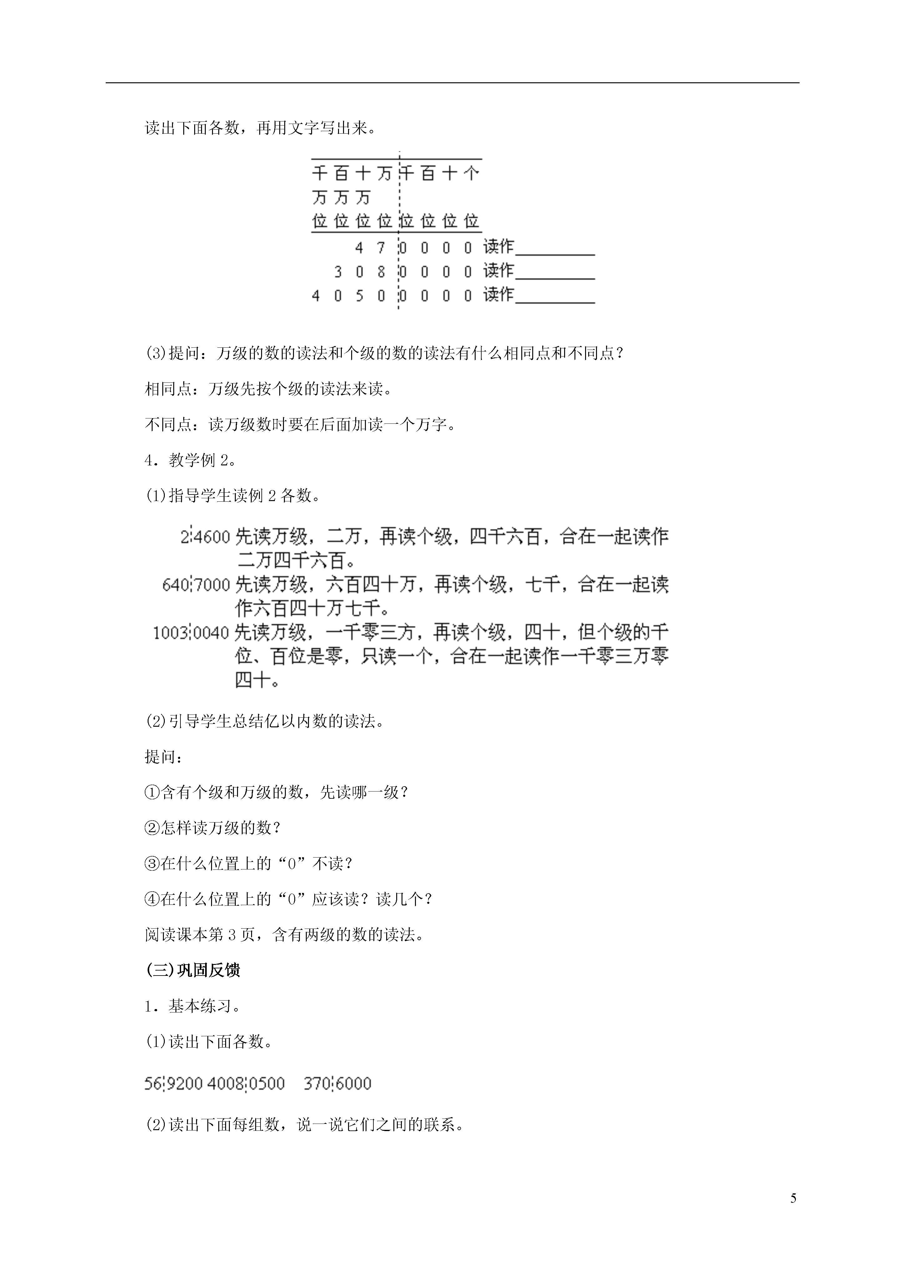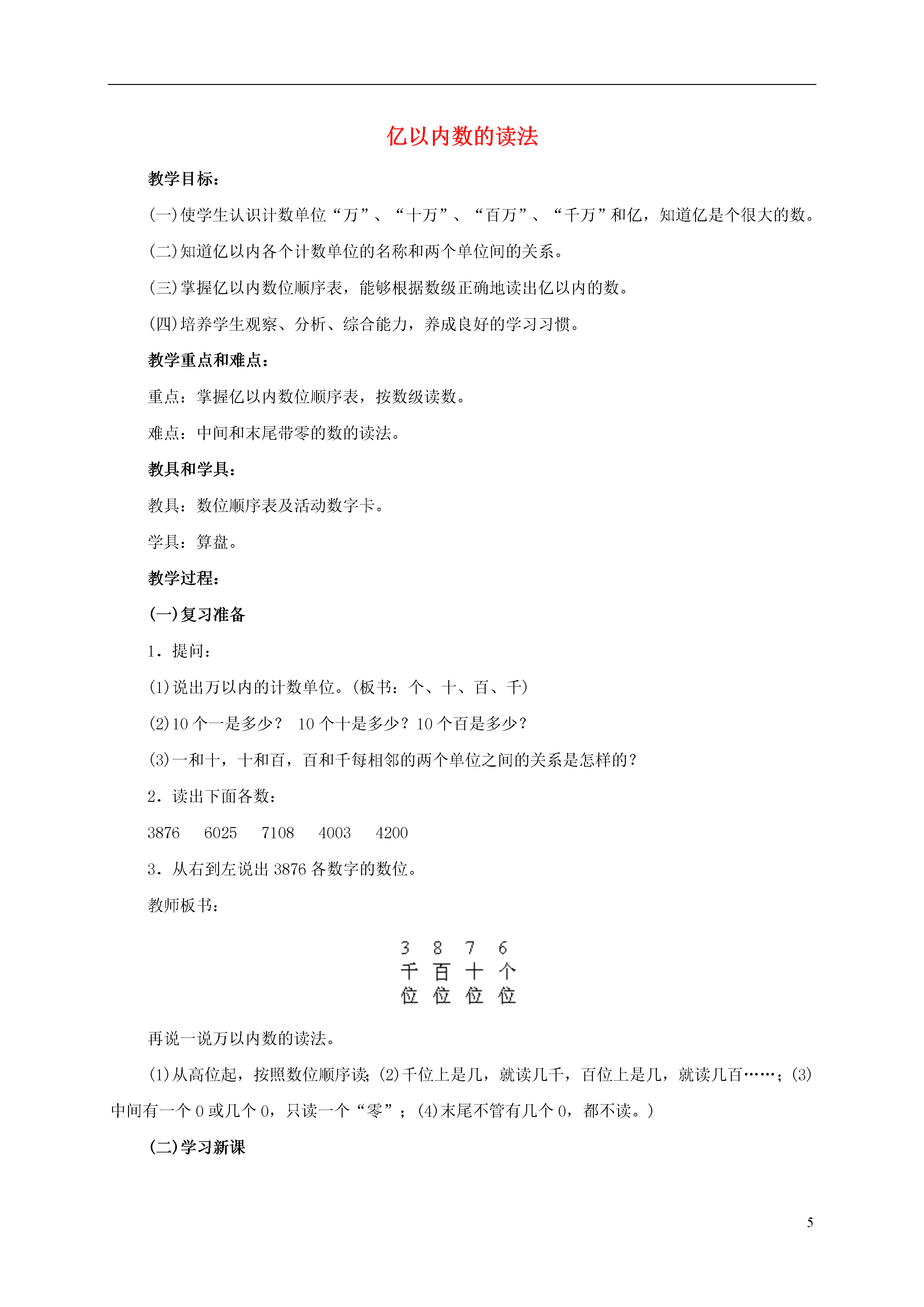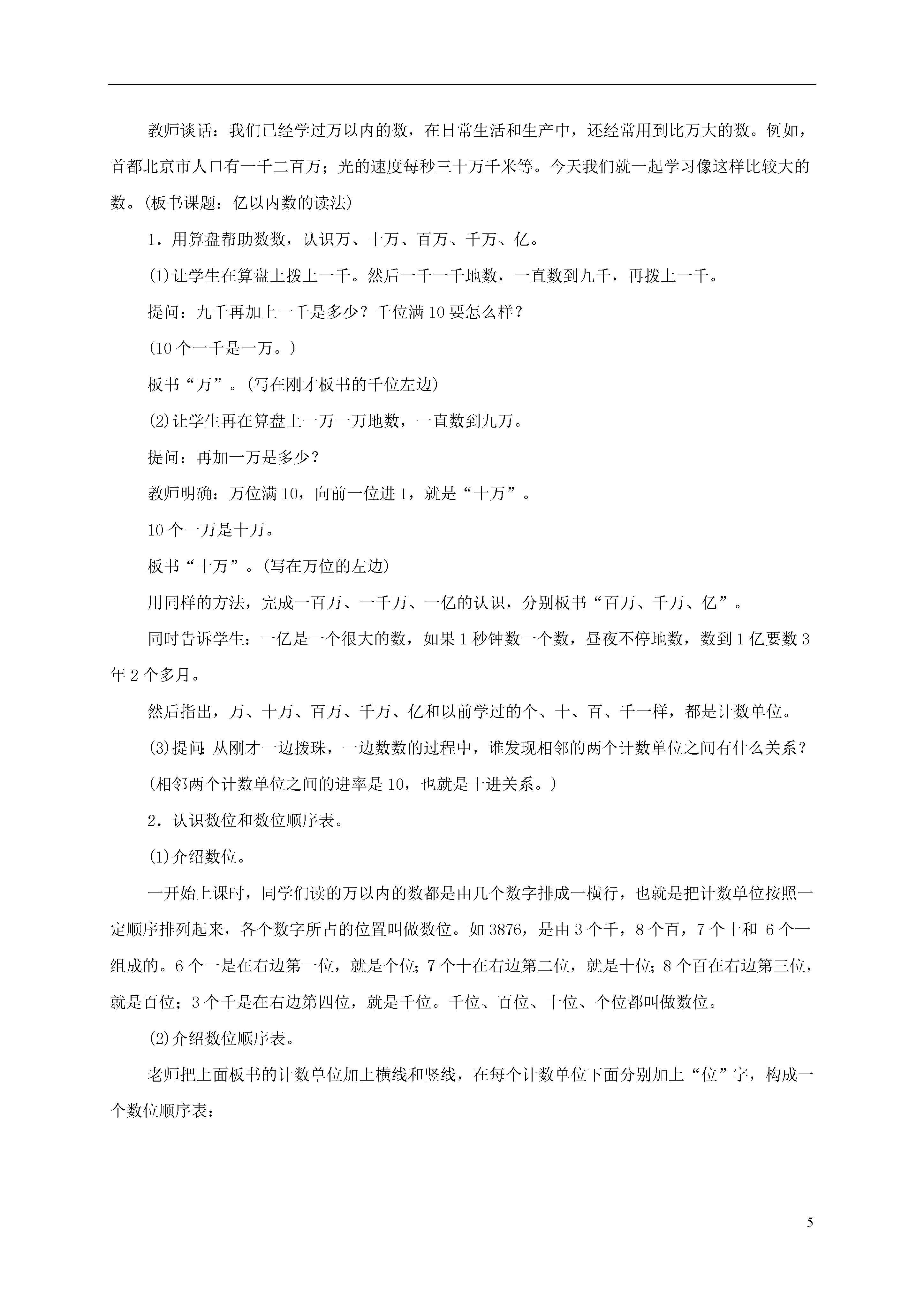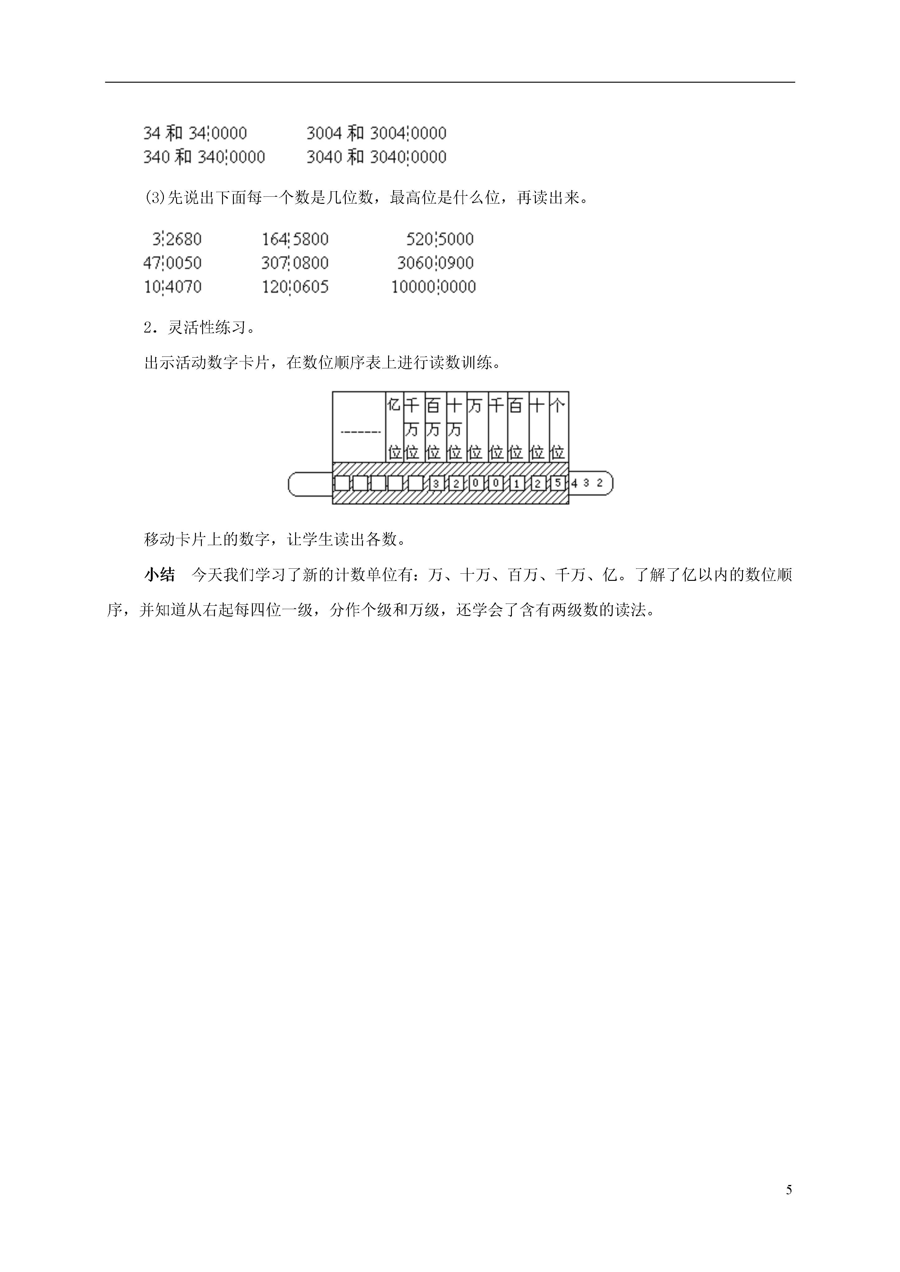 5亿以内数的读法教学目标:(一)使学生认识计数单位“万”、“十万”、“百万”、“千万”和亿,知道亿是个很大的数。(二)知道亿以内各个计数单位的名称和两个单位间的关系。(三)掌握亿以内数位顺序表,能够根据数级正确地读出亿以内的数。(四)培养学生观察、分析、综合能力,养成良好的学习习惯。教学重点和难点:重点:掌握亿以内数位顺序表,按数级读数。难点:中间和末尾带零的数的读法。教具和学具:教具:数位顺序表及活动数字卡。学具:算盘。教学过程:(一)复习准备1.提问:(1)说出万以内的计数单位。(板书:个、十、百、千)(2)10个一是多少?10个十是多少?10个百是多少?(3)一和十,十和百,百和千每相邻的两个单位之间的关系是怎样的?2.读出下面各数:387660257108400342003.从右到左说出3876各数字的数位。教师板书:再说一说万以内数的读法。(1)从高位起,按照数位顺序读;(2)千位上是几,就读几千,百位上是几,就读几百……;(3)中间有一个0或几个0,只读一个“零”;(4)末尾不管有几个0,都不读。)(二)学习新课教师谈话:我们已经学过万以内的数,在日常生活和生产中,还经常用到比万大的数。例如,首都北京市人口有一千二百万;光的速度每秒三十万千米等。今天我们就一起学习像这样比较大的数。(板书课题:亿以内数的读法)1.用算盘帮助数数,认识万、十万、百万、千万、亿。(1)让学生在算盘上拨上一千。然后一千一千地数,一直数到九千,再拨上一千。提问:九千再加上一千是多少?千位满10要怎么样?(10个一千是一万。)板书“万”。(写在刚才板书的千位左边)(2)让学生再在算盘上一万一万地数,一直数到九万。提问:再加一万是多少?教师明确:万位满10,向前一位进1,就是“十万”。10个一万是十万。板书“十万”。(写在万位的左边)用同样的方法,完成一百万、一千万、一亿的认识,分别板书“百万、千万、亿”。同时告诉学生:一亿是一个很大的数,如果1秒钟数一个数,昼夜不停地数,数到1亿要数3年2个多月。然后指出,万、十万、百万、千万、亿和以前学过的个、十、百、千一样,都是计数单位。(3)提问:从刚才一边拨珠,一边数数的过程中,谁发现相邻的两个计数单位之间有什么关系?(相邻两个计数单位之间的进率是10,也就是十进关系。)2.认识数位和数位顺序表。(1)介绍数位。一开始上课时,同学们读的万以内的数都是由几个数字排成一横行,也就是把计数单位按照一定顺序排列起来,各个数字所占的位置叫做数位。如3876,是由3个千,8个百,7个十和6个一组成的。6个一是在右边第一位,就是个位;7个十在右边第二位,就是十位;8个百在右边第三位,就是百位;3个千是在右边第四位,就是千位。千位、百位、十位、个位都叫做数位。(2)介绍数位顺序表。老师把上面板书的计数单位加上横线和竖线,在每个计数单位下面分别加上“位”字,构成一个数位顺序表:(3)计数单位和数位之间的关系。个位上的计数单位是一,十位上的计数单位是十,……千万位上的计数单位是千万。也就是说几个一就写在个位上,几个十就写在十位上,几个百就写在百位上,……几个千万就写在千万位上。同一个数字,把它写在不同的数位上,它表示的计数单位就不同。(4)认识数位分级。按照我国的计数习惯,从右起向左每四个数位为一级,个、十、百、千是“个级”,表示多少“个”;万、十万、百万、千万是“万级”,表示多少个“万”。在已写出的数位顺序表上接着板书“个级、万级”,制成下表:引导学生观察数位顺序表,发现个级和万级的异同点。相同点:都是四个数位;从第二位起,都是十、百、千。不同点:万级多一个万字;个级第一位是个位,万级第一位是万位。练一练(1)十万有()个万,一百万有()个万,一千万有()个万。(2)一百万有()个十万,()个一百万是一千万,一亿是()个一千万。(3)从低位到高位,按照数位顺序说出个级和万级的每一个数位。(4)从个位起,第()位是万位,第()位是亿位。(5)万位的右面一位是()位,左面一位是()位。3.教学例1。(1)让学生在算盘上打出二十八万。引导学生用个级数的读法来读万级数,但在后面加读一个“万”字。(2)让学生在算盘上打出三千零七十万,指定学生读数。练一练读出下面各数,再用文字写出来。(3)提问:万级的数的读法和个级的数的读法有什么相同点和不同点?相同点:万级先按个级的读法来读。不同点:读万级数时要在后面加读一个万字。4.教学例2。(1)指导学生读例2各数。(2)引导学生总结亿以内数的读法。提问:①含有个级和万级的数,先读哪一级?②怎样读万级的数?③在什么位