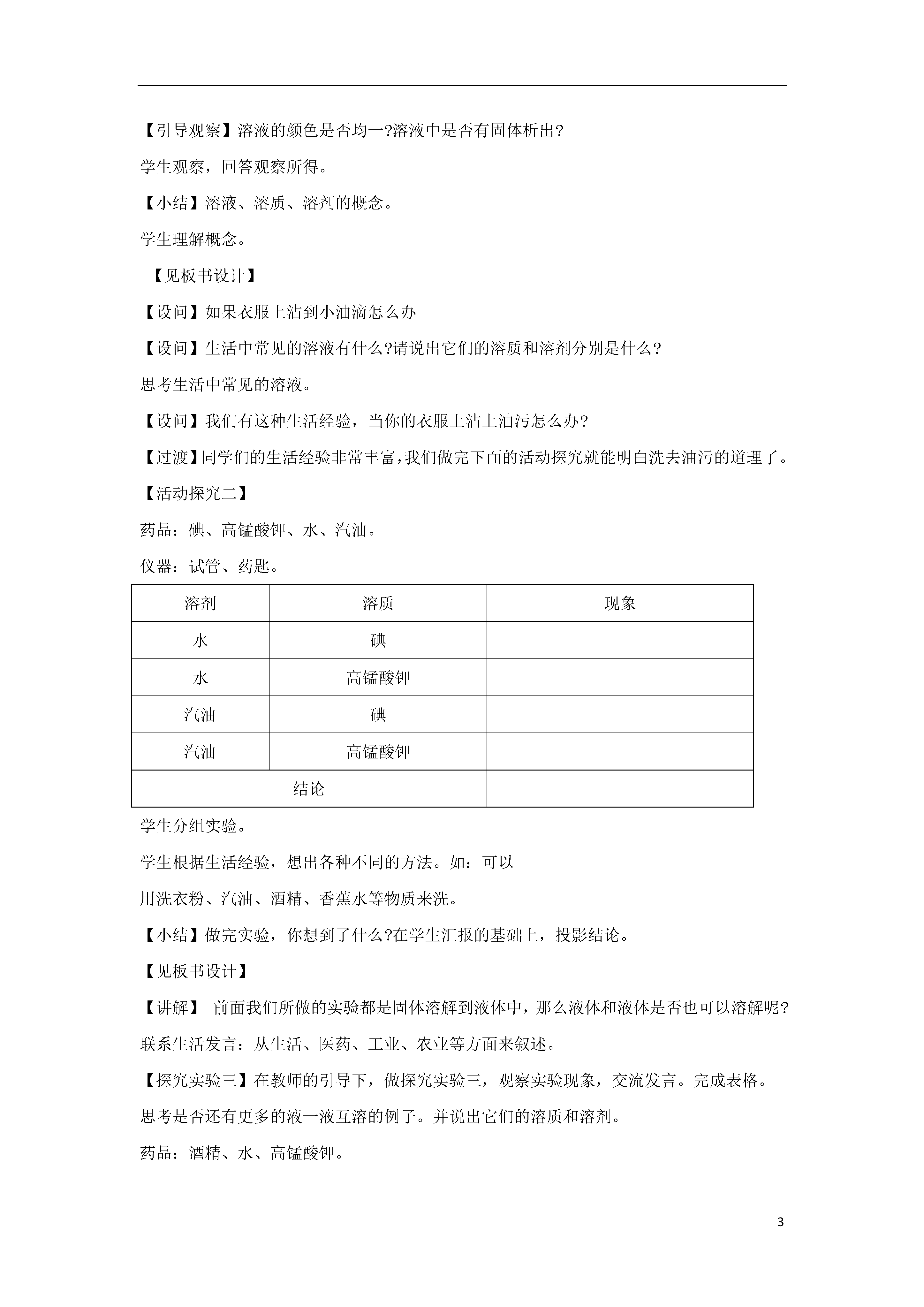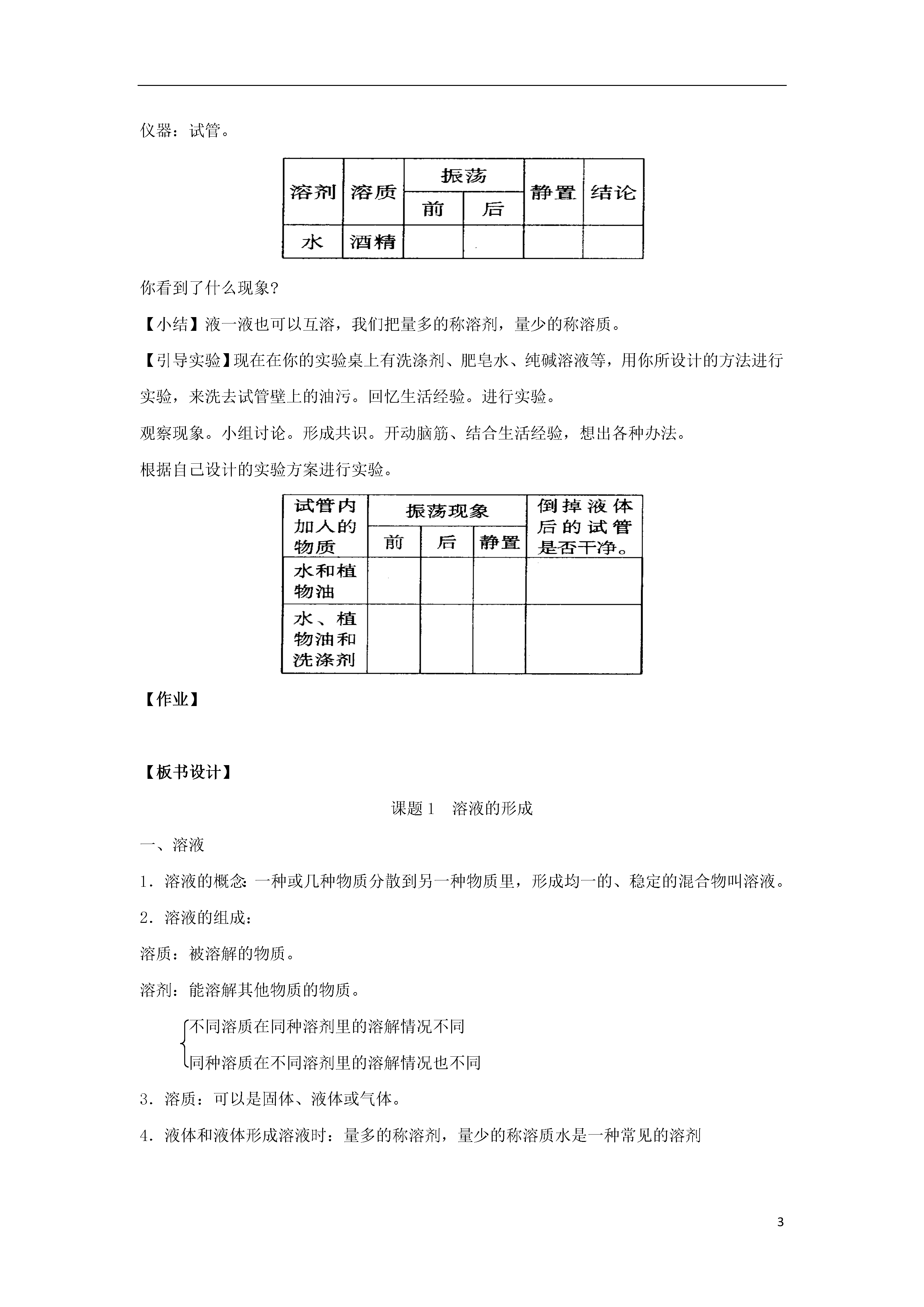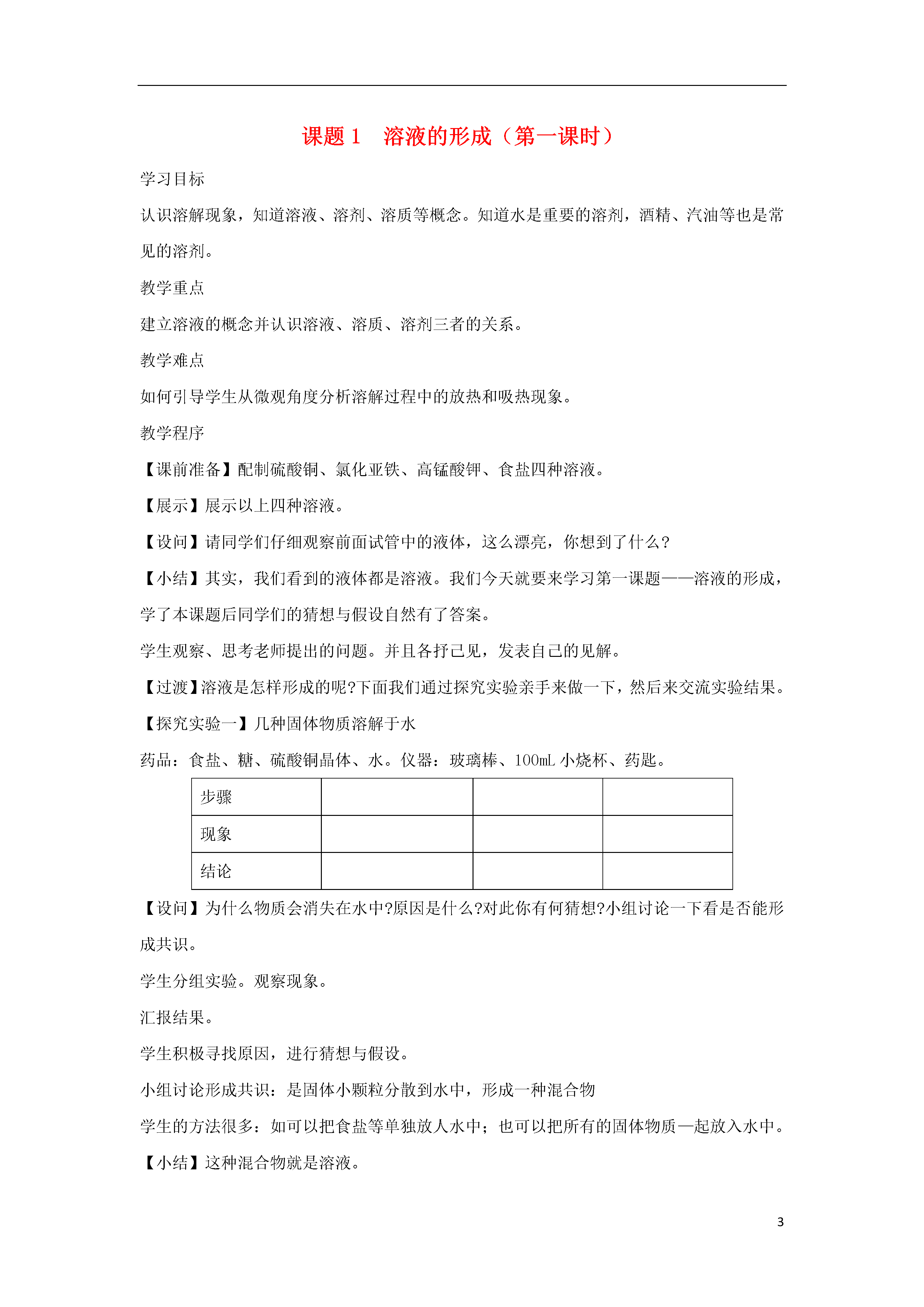 3课题1溶液的形成(第一课时)学习目标认识溶解现象,知道溶液、溶剂、溶质等概念。知道水是重要的溶剂,酒精、汽油等也是常见的溶剂。教学重点建立溶液的概念并认识溶液、溶质、溶剂三者的关系。教学难点如何引导学生从微观角度分析溶解过程中的放热和吸热现象。教学程序【课前准备】配制硫酸铜、氯化亚铁、高锰酸钾、食盐四种溶液。【展示】展示以上四种溶液。【设问】请同学们仔细观察前面试管中的液体,这么漂亮,你想到了什么?【小结】其实,我们看到的液体都是溶液。我们今天就要来学习第一课题——溶液的形成,学了本课题后同学们的猜想与假设自然有了答案。学生观察、思考老师提出的问题。并且各抒己见,发表自己的见解。【过渡】溶液是怎样形成的呢?下面我们通过探究实验亲手来做一下,然后来交流实验结果。【探究实验一】几种固体物质溶解于水药品:食盐、糖、硫酸铜晶体、水。仪器:玻璃棒、100mL小烧杯、药匙。步骤现象结论【设问】为什么物质会消失在水中?原因是什么?对此你有何猜想?小组讨论一下看是否能形成共识。学生分组实验。观察现象。汇报结果。学生积极寻找原因,进行猜想与假设。小组讨论形成共识:是固体小颗粒分散到水中,形成一种混合物学生的方法很多:如可以把食盐等单独放人水中;也可以把所有的固体物质—起放入水中。【小结】这种混合物就是溶液。【引导观察】溶液的颜色是否均一?溶液中是否有固体析出?学生观察,回答观察所得。【小结】溶液、溶质、溶剂的概念。学生理解概念。【见板书设计】【设问】如果衣服上沾到小油滴怎么办【设问】生活中常见的溶液有什么?请说出它们的溶质和溶剂分别是什么?思考生活中常见的溶液。【设问】我们有这种生活经验,当你的衣服上沾上油污怎么办?【过渡】同学们的生活经验非常丰富,我们做完下面的活动探究就能明白洗去油污的道理了。【活动探究二】药品:碘、高锰酸钾、水、汽油。仪器:试管、药匙。溶剂溶质现象水碘水高锰酸钾汽油碘汽油高锰酸钾结论学生分组实验。学生根据生活经验,想出各种不同的方法。如:可以用洗衣粉、汽油、酒精、香蕉水等物质来洗。【小结】做完实验,你想到了什么?在学生汇报的基础上,投影结论。【见板书设计】【讲解】前面我们所做的实验都是固体溶解到液体中,那么液体和液体是否也可以溶解呢?联系生活发言:从生活、医药、工业、农业等方面来叙述。【探究实验三】在教师的引导下,做探究实验三,观察实验现象,交流发言。完成表格。思考是否还有更多的液一液互溶的例子。并说出它们的溶质和溶剂。药品:酒精、水、高锰酸钾。仪器:试管。你看到了什么现象?【小结】液一液也可以互溶,我们把量多的称溶剂,量少的称溶质。【引导实验】现在在你的实验桌上有洗涤剂、肥皂水、纯碱溶液等,用你所设计的方法进行实验,来洗去试管壁上的油污。回忆生活经验。进行实验。观察现象。小组讨论。形成共识。开动脑筋、结合生活经验,想出各种办法。根据自己设计的实验方案进行实验。【作业】【板书设计】课题1溶液的形成一、溶液1.溶液的概念:一种或几种物质分散到另一种物质里,形成均一的、稳定的混合物叫溶液。2.溶液的组成:溶质:被溶解的物质。溶剂:能溶解其他物质的物质。不同溶质在同种溶剂里的溶解情况不同同种溶质在不同溶剂里的溶解情况也不同3.溶质:可以是固体、液体或气体。4.液体和液体形成溶液时:量多的称溶剂,量少的称溶质水是一种常见的溶剂