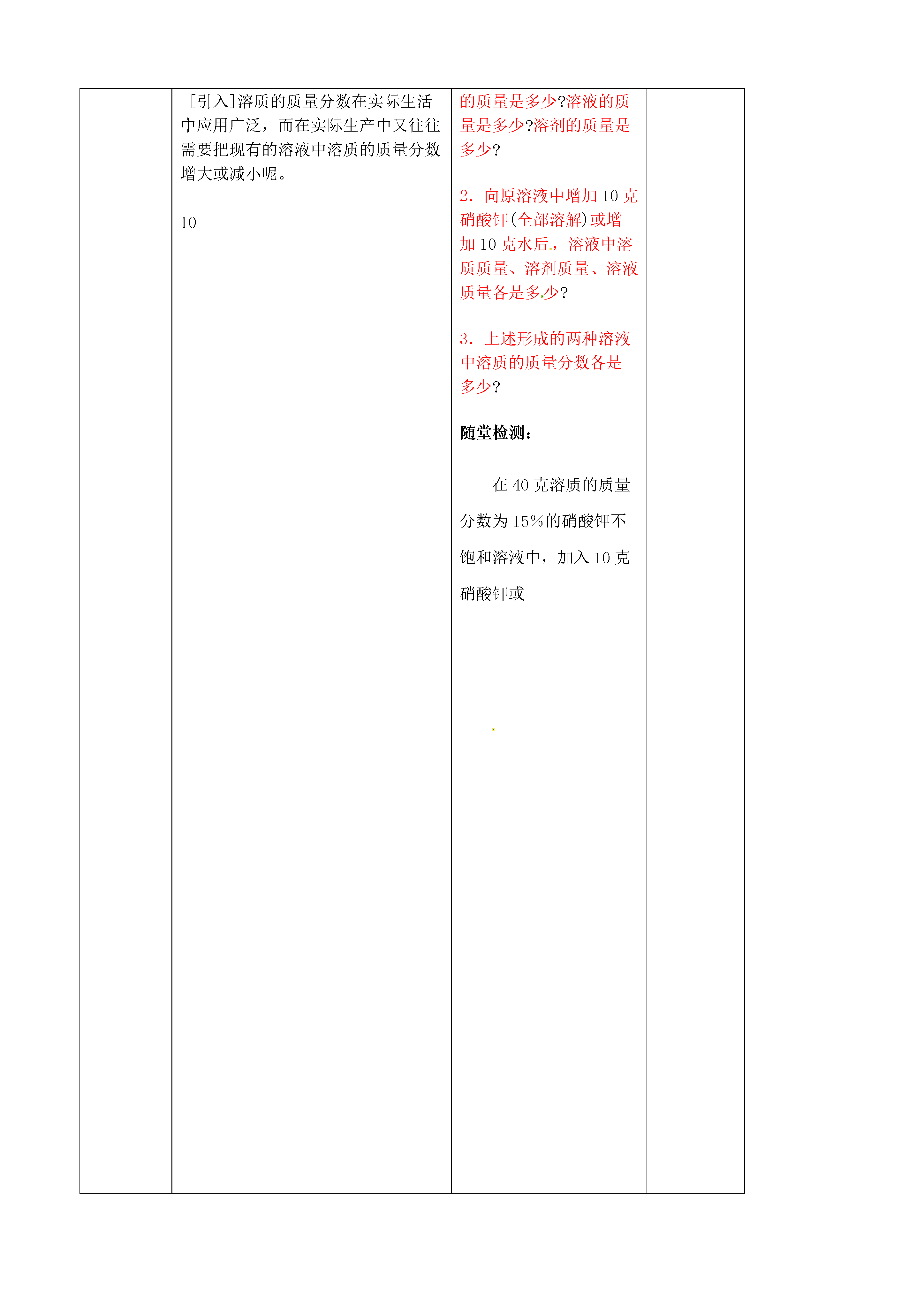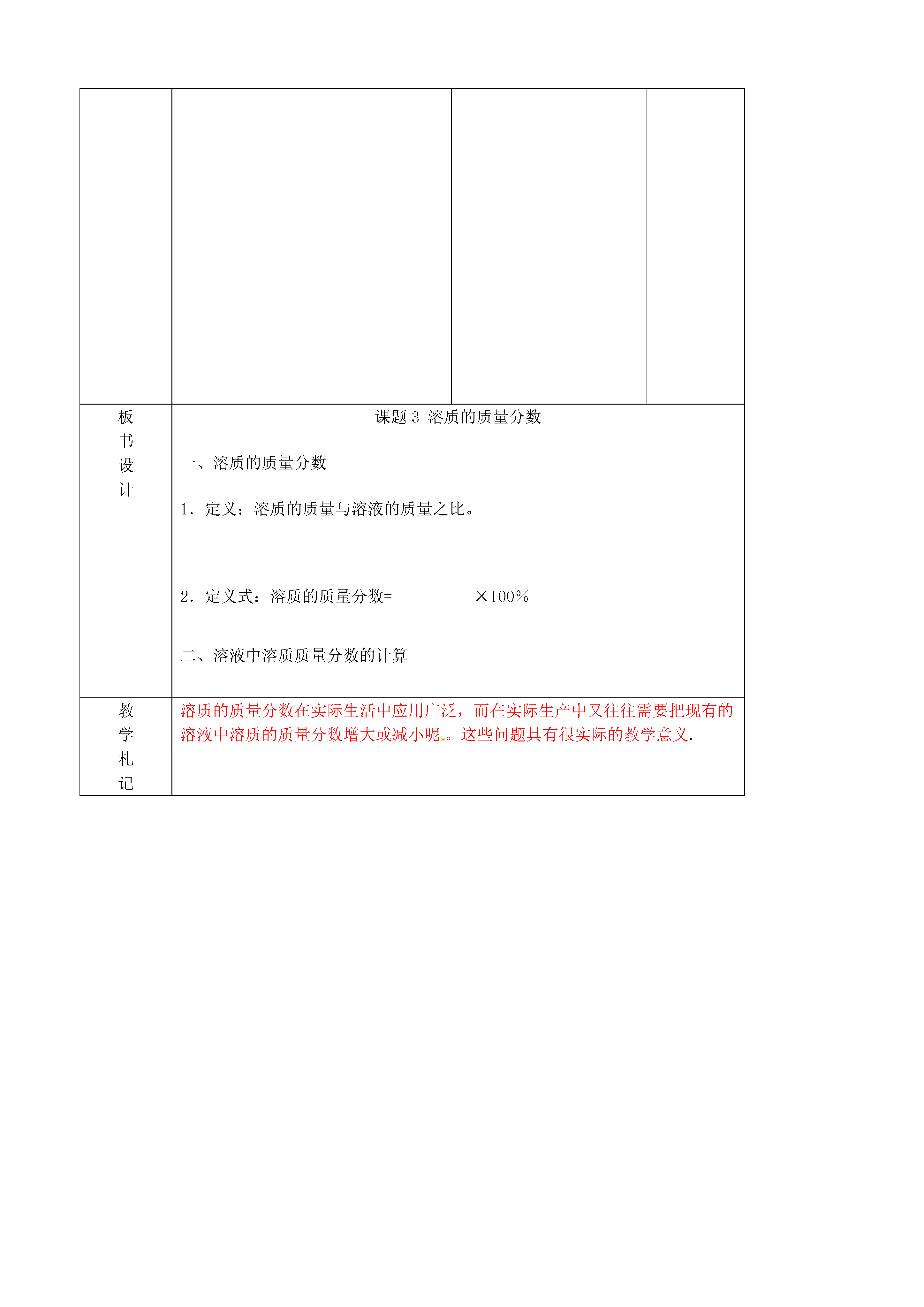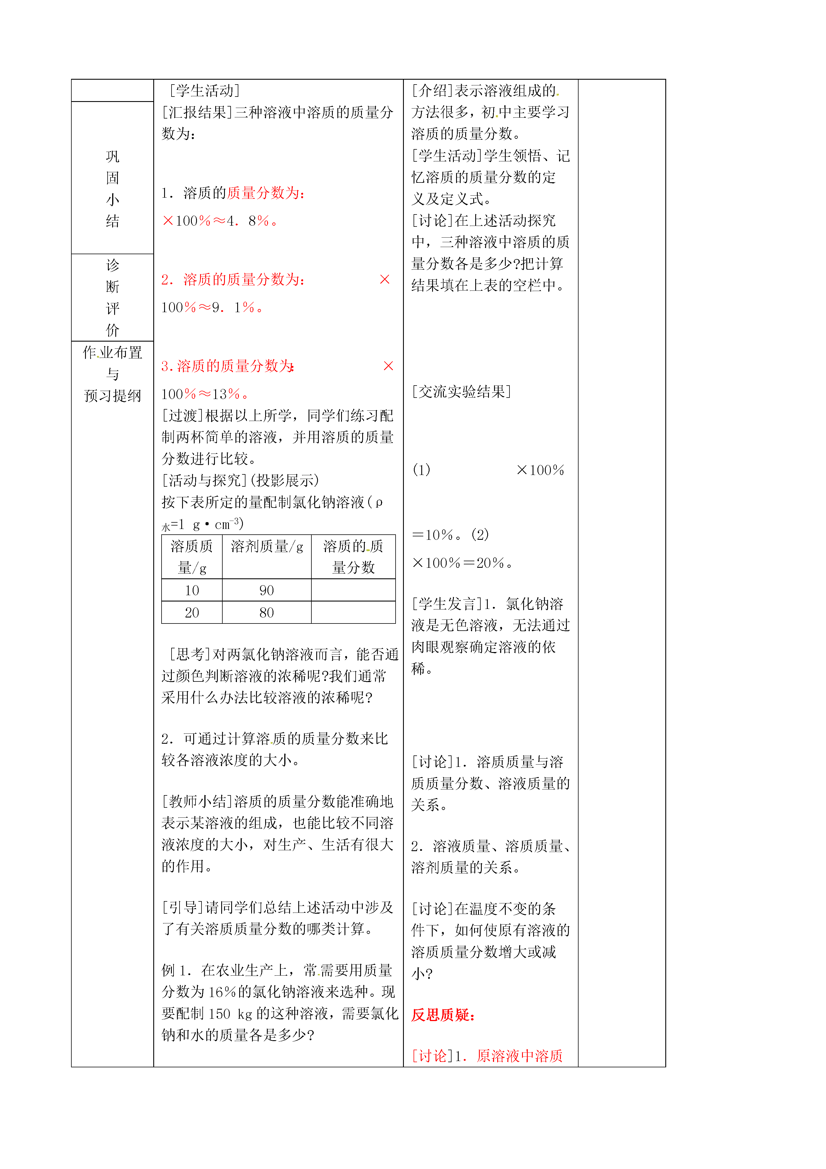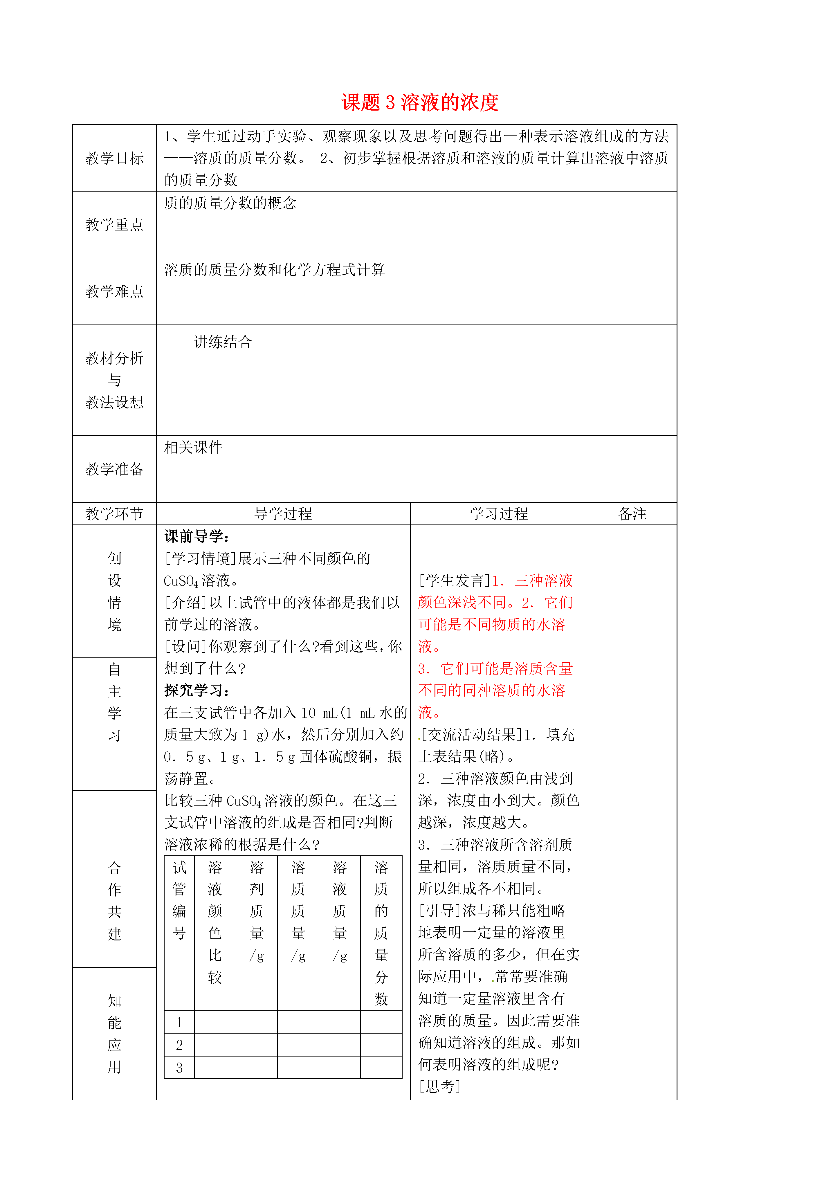 课题3溶液的浓度教学目标1、学生通过动手实验、观察现象以及思考问题得出一种表示溶液组成的方法——溶质的质量分数。2、初步掌握根据溶质和溶液的质量计算出溶液中溶质的质量分数教学重点质的质量分数的概念教学难点溶质的质量分数和化学方程式计算教材分析与教法设想讲练结合教学准备相关课件教学环节导学过程学习过程备注创设情境课前导学:[学习情境]展示三种不同颜色的CuSO4溶液。[介绍]以上试管中的液体都是我们以前学过的溶液。[设问]你观察到了什么?看到这些,你想到了什么?探究学习:在三支试管中各加入10mL(1mL水的质量大致为1g)水,然后分别加入约0.5g、1g、1.5g固体硫酸铜,振荡静置。比较三种CuSO4溶液的颜色。在这三支试管中溶液的组成是否相同?判断溶液浓稀的根据是什么?试管编号溶液颜色比较溶剂质量/g溶质质量/g溶液质量/g溶质的质量分数123[学生活动][汇报结果]三种溶液中溶质的质量分数为:1.溶质的质量分数为:×100%≈4.8%。2.溶质的质量分数为:×100%≈9.1%。3.溶质的质量分数为:×100%≈13%。[过渡]根据以上所学,同学们练习配制两杯简单的溶液,并用溶质的质量分数进行比较。[活动与探究](投影展示)按下表所定的量配制氯化钠溶液(ρ水=1g·cm-3)溶质质量/g溶剂质量/g溶质的质量分数10902080[思考]对两氯化钠溶液而言,能否通过颜色判断溶液的浓稀呢?我们通常采用什么办法比较溶液的浓稀呢?2.可通过计算溶质的质量分数来比较各溶液浓度的大小。[教师小结]溶质的质量分数能准确地表示某溶液的组成,也能比较不同溶液浓度的大小,对生产、生活有很大的作用。[引导]请同学们总结上述活动中涉及了有关溶质质量分数的哪类计算。例1.在农业生产上,常需要用质量分数为16%的氯化钠溶液来选种。现要配制150kg的这种溶液,需要氯化钠和水的质量各是多少?[引入]溶质的质量分数在实际生活中应用广泛,而在实际生产中又往往需要把现有的溶液中溶质的质量分数增大或减小呢。10[学生发言]1.三种溶液颜色深浅不同。2.它们可能是不同物质的水溶液。3.它们可能是溶质含量不同的同种溶质的水溶液。[交流活动结果]1.填充上表结果(略)。2.三种溶液颜色由浅到深,浓度由小到大。颜色越深,浓度越大。3.三种溶液所含溶剂质量相同,溶质质量不同,所以组成各不相同。[引导]浓与稀只能粗略地表明一定量的溶液里所含溶质的多少,但在实际应用中,常常要准确知道一定量溶液里含有溶质的质量。因此需要准确知道溶液的组成。那如何表明溶液的组成呢?[思考][介绍]表示溶液组成的方法很多,初中主要学习溶质的质量分数。[学生活动]学生领悟、记忆溶质的质量分数的定义及定义式。[讨论]在上述活动探究中,三种溶液中溶质的质量分数各是多少?把计算结果填在上表的空栏中。[交流实验结果](1)×100%=10%。(2)×100%=20%。[学生发言]1.氯化钠溶液是无色溶液,无法通过肉眼观察确定溶液的依稀。[讨论]1.溶质质量与溶质质量分数、溶液质量的关系。2.溶液质量、溶质质量、溶剂质量的关系。[讨论]在温度不变的条件下,如何使原有溶液的溶质质量分数增大或减小?反思质疑:[讨论]1.原溶液中溶质的质量是多少?溶液的质量是多少?溶剂的质量是多少?2.向原溶液中增加10克硝酸钾(全部溶解)或增加10克水后,溶液中溶质质量、溶剂质量、溶液质量各是多少?3.上述形成的两种溶液中溶质的质量分数各是多少?随堂检测:在40克溶质的质量分数为15%的硝酸钾不饱和溶液中,加入10克硝酸钾或自主学习合作共建知能应用巩固小结诊断评价作业布置与预习提纲板书设计课题3溶质的质量分数一、溶质的质量分数1.定义:溶质的质量与溶液的质量之比。2.定义式:溶质的质量分数=×100%二、溶液中溶质质量分数的计算教学札记溶质的质量分数在实际生活中应用广泛,而在实际生产中又往往需要把现有的溶液中溶质的质量分数增大或减小呢。这些问题具有很实际的教学意义.