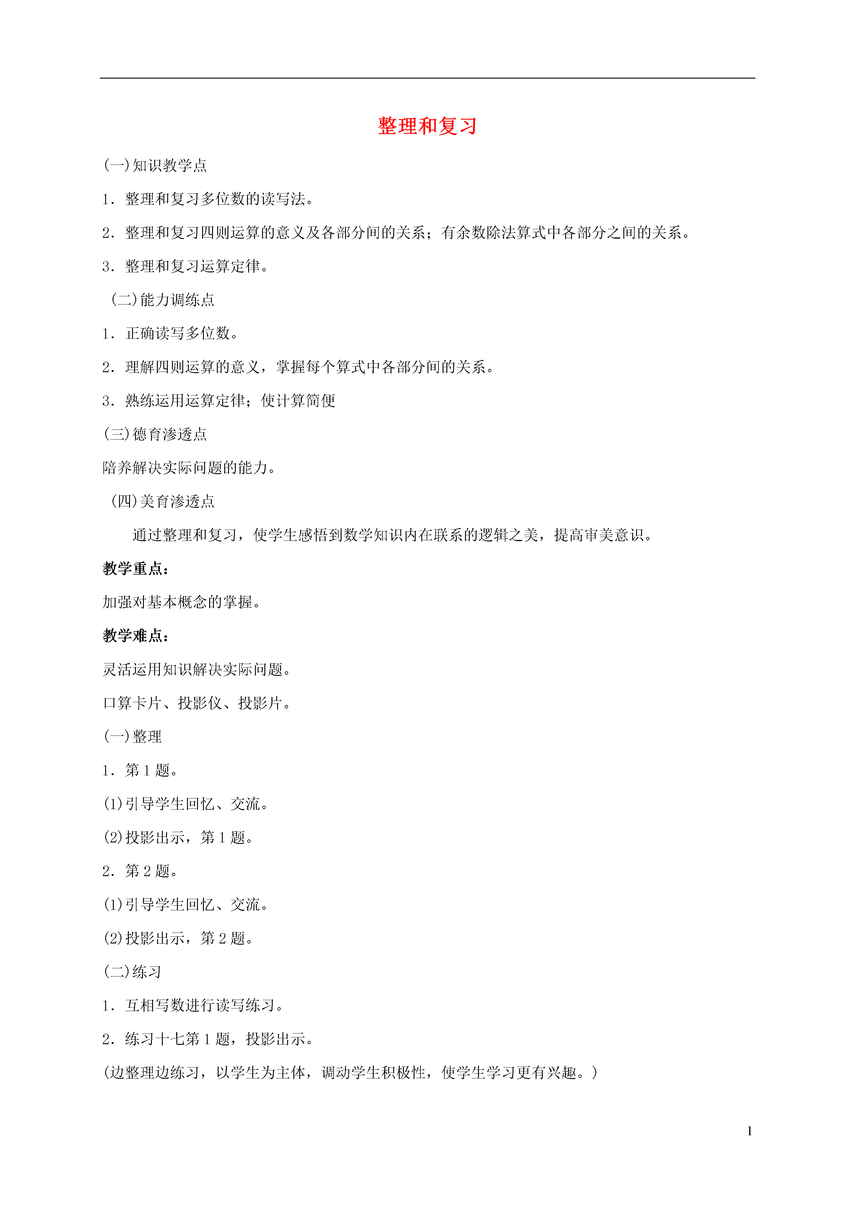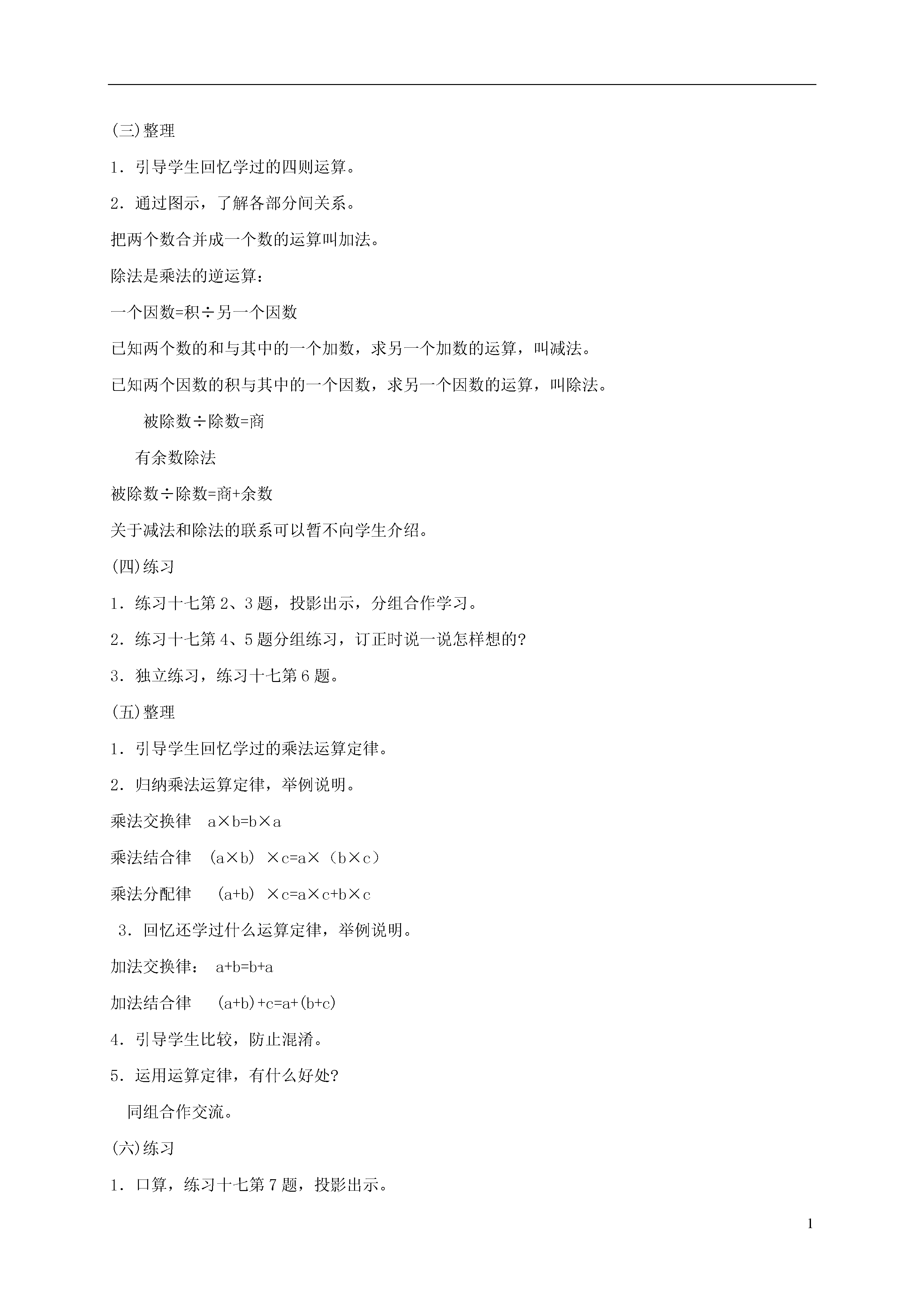 1整理和复习(一)知识教学点1.整理和复习多位数的读写法。2.整理和复习四则运算的意义及各部分间的关系;有余数除法算式中各部分之间的关系。3.整理和复习运算定律。(二)能力调练点1.正确读写多位数。2.理解四则运算的意义,掌握每个算式中各部分间的关系。3.熟练运用运算定律;使计算简便(三)德育渗透点陪养解决实际问题的能力。(四)美育渗透点通过整理和复习,使学生感悟到数学知识内在联系的逻辑之美,提高审美意识。教学重点:加强对基本概念的掌握。教学难点:灵活运用知识解决实际问题。口算卡片、投影仪、投影片。(一)整理1.第1题。(1)引导学生回忆、交流。(2)投影出示,第1题。2.第2题。(1)引导学生回忆、交流。(2)投影出示,第2题。(二)练习1.互相写数进行读写练习。2.练习十七第1题,投影出示。(边整理边练习,以学生为主体,调动学生积极性,使学生学习更有兴趣。)(三)整理1.引导学生回忆学过的四则运算。2.通过图示,了解各部分间关系。把两个数合并成一个数的运算叫加法。除法是乘法的逆运算:一个因数=积÷另一个因数已知两个数的和与其中的一个加数,求另一个加数的运算,叫减法。已知两个因数的积与其中的一个因数,求另一个因数的运算,叫除法。被除数÷除数=商有余数除法被除数÷除数=商+余数关于减法和除法的联系可以暂不向学生介绍。(四)练习1.练习十七第2、3题,投影出示,分组合作学习。2.练习十七第4、5题分组练习,订正时说一说怎样想的?3.独立练习,练习十七第6题。(五)整理1.引导学生回忆学过的乘法运算定律。2.归纳乘法运算定律,举例说明。乘法交换律a×b=b×a乘法结合律(a×b)×c=a×(b×c)乘法分配律(a+b)×c=a×c+b×c3.回忆还学过什么运算定律,举例说明。加法交换律:a+b=b+a加法结合律(a+b)+c=a+(b+c)4.引导学生比较,防止混淆。5.运用运算定律,有什么好处?同组合作交流。(六)练习1.口算,练习十七第7题,投影出示。2.练习十七第8题,投影出示。3.练习十七第9题,分组合作学习,互相订正。4.独立练习,练习十七第10、11题。(整理和练习,可以穿插进行,边整理边练习,使学生掌握概念,提高计算能独立练习可视为作业。)(七)全课小结