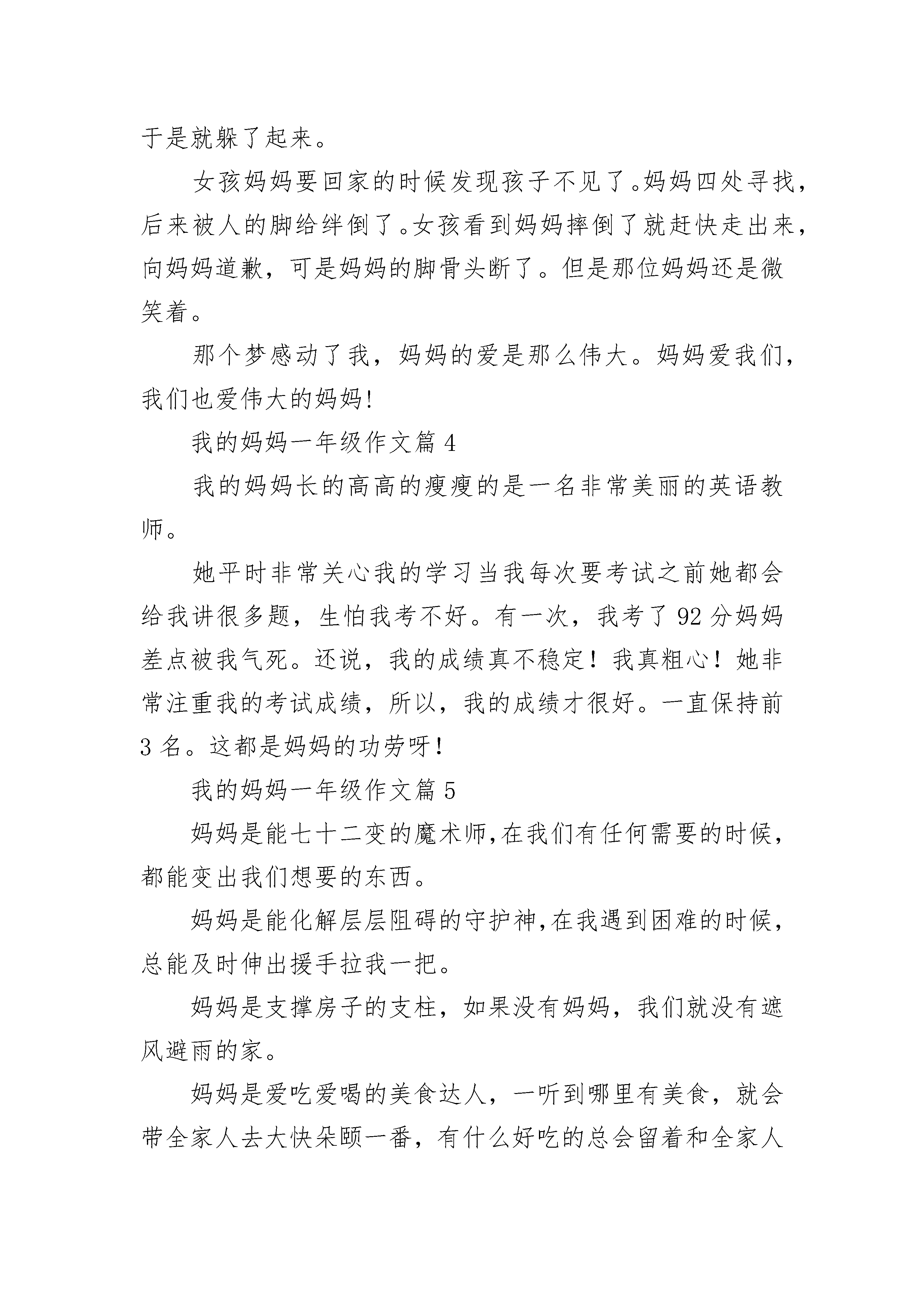 我的妈妈一年级作文5篇今天,我来给大家介绍一下我的妈妈吧!我妈妈昨天剪了发,变成了一个短发妈妈,而且头发还染成红色的,她就成了红色短发妈妈,我很喜欢她的发型,她还有像葡萄乌黑的眼睛,弯弯的眉毛,我很喜欢她。在我生病的时候她会照料我,带我去看病,给我买药,还给我工作挣钱,我很爱她,我要好好刻苦学习,长大给她买东西。我的妈妈一年级作文篇2我有一个勤劳的好妈妈,每天除了上班,还要照顾我们一家人的生活。妈妈每天早早起床,等我醒来的时候,她已经把香喷喷的饭菜摆在桌子上了。妈妈除了做饭、我洗衣服、收拾屋子,每天还要辅导我学习,给我讲故事,教给我知识和做人的道理。每当我听见《世上只有妈妈好》这首歌时,我就想对妈妈说:“妈妈,你辛苦了,我爱你!我的妈妈一年级作文篇3星期六的晚上,我做了一个梦,梦见了一个小朋友和他的妈妈去超市买东西。事情发生了,一个小女孩看到了一个东西很好吃而且还是秋游的时候同学分给她吃的。于是小女孩要买,妈妈看了一下价格有点儿贵就不给他买。那个小女孩心想妈妈太狠了。于是就躲了起来。女孩妈妈要回家的时候发现孩子不见了。妈妈四处寻找,后来被人的脚给绊倒了。女孩看到妈妈摔倒了就赶快走出来,向妈妈道歉,可是妈妈的脚骨头断了。但是那位妈妈还是微笑着。那个梦感动了我,妈妈的爱是那么伟大。妈妈爱我们,我们也爱伟大的妈妈!我的妈妈一年级作文篇4我的妈妈长的高高的瘦瘦的是一名非常美丽的英语教师。她平时非常关心我的学习当我每次要考试之前她都会给我讲很多题,生怕我考不好。有一次,我考了92分妈妈差点被我气死。还说,我的成绩真不稳定!我真粗心!她非常注重我的考试成绩,所以,我的成绩才很好。一直保持前3名。这都是妈妈的功劳呀!我的妈妈一年级作文篇5妈妈是能七十二变的魔术师,在我们有任何需要的时候,都能变出我们想要的东西。妈妈是能化解层层阻碍的守护神,在我遇到困难的时候,总能及时伸出援手拉我一把。妈妈是支撑房子的支柱,如果没有妈妈,我们就没有遮风避雨的家。妈妈是爱吃爱喝的美食达人,一听到哪里有美食,就会带全家人去大快朵颐一番,有什么好吃的总会留着和全家人共享。