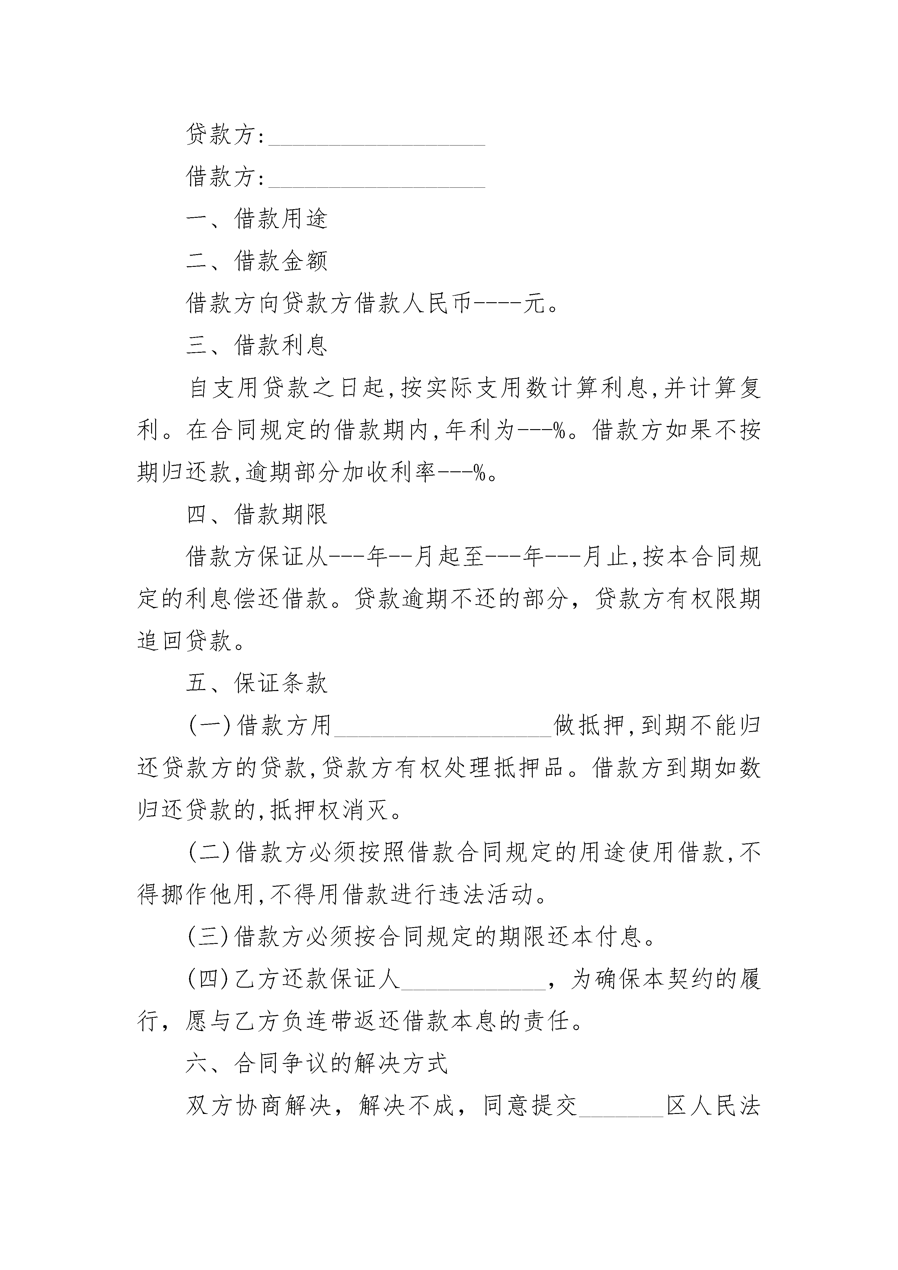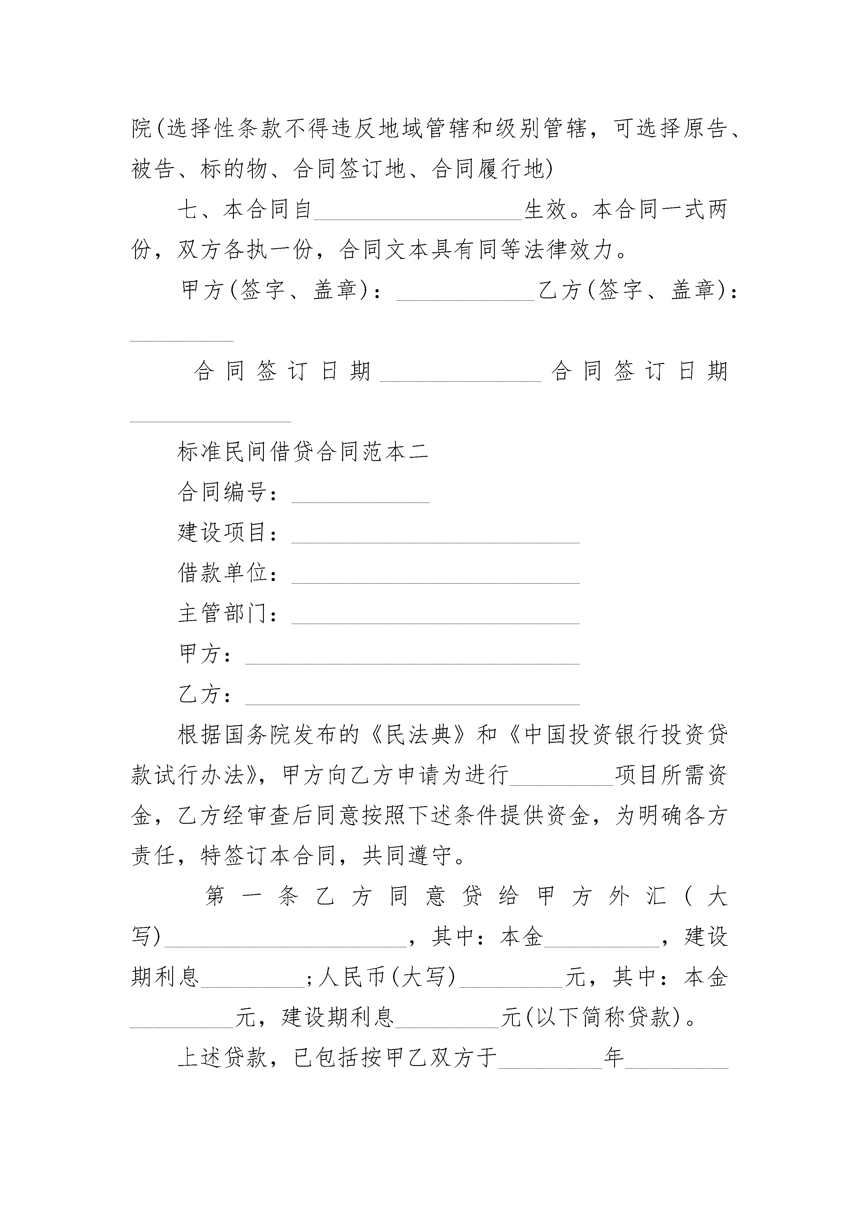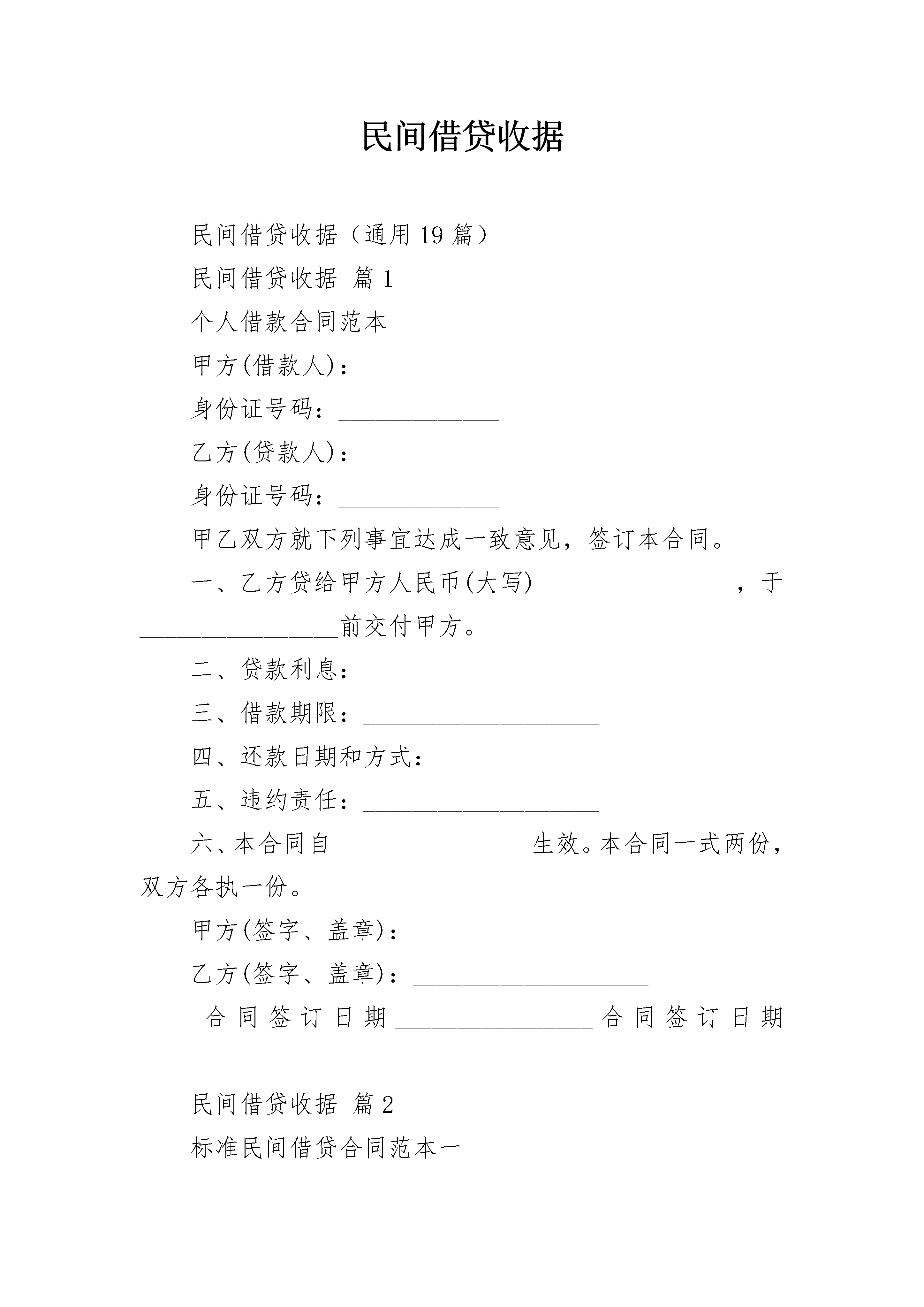 民间借贷收据民间借贷收据(通用19篇)民间借贷收据篇1个人借款合同范本甲方(借款人):___________________身份证号码:_____________乙方(贷款人):___________________身份证号码:_____________甲乙双方就下列事宜达成一致意见,签订本合同。一、乙方贷给甲方人民币(大写)________________,于________________前交付甲方。二、贷款利息:___________________三、借款期限:___________________四、还款日期和方式:_____________五、违约责任:___________________六、本合同自________________生效。本合同一式两份,双方各执一份。甲方(签字、盖章):___________________乙方(签字、盖章):___________________合同签订日期________________合同签订日期________________民间借贷收据篇2标准民间借贷合同范本一贷款方:__________________借款方:__________________一、借款用途二、借款金额借款方向贷款方借款人民币----元。三、借款利息自支用贷款之日起,按实际支用数计算利息,并计算复利。在合同规定的借款期内,年利为---%。借款方如果不按期归还款,逾期部分加收利率---%。四、借款期限借款方保证从---年--月起至---年---月止,按本合同规定的利息偿还借款。贷款逾期不还的部分,贷款方有权限期追回贷款。五、保证条款(一)借款方用__________________做抵押,到期不能归还贷款方的贷款,贷款方有权处理抵押品。借款方到期如数归还贷款的,抵押权消灭。(二)借款方必须按照借款合同规定的用途使用借款,不得挪作他用,不得用借款进行违法活动。(三)借款方必须按合同规定的期限还本付息。(四)乙方还款保证人____________,为确保本契约的履行,愿与乙方负连带返还借款本息的责任。六、合同争议的解决方式双方协商解决,解决不成,同意提交_______区人民法院(选择性条款不得违反地域管辖和级别管辖,可选择原告、被告、标的物、合同签订地、合同履行地)七、本合同自__________________生效。本合同一式两份,双方各执一份,合同文本具有同等法律效力。甲方(签字、盖章):____________乙方(签字、盖章):_________合同签订日期______________合同签订日期______________标准民间借贷合同范本二合同编号:____________建设项目:_________________________借款单位:_________________________主管部门:_________________________甲方:_____________________________乙方:_____________________________根据国务院发布的《民法典》和《中国投资银行投资贷款试行办法》,甲方向乙方申请为进行_________项目所需资金,乙方经审查后同意按照下述条件提供资金,为明确各方责任,特签订本合同,共同遵守。第一条乙方同意贷给甲方外汇(大写)_____________________,其中:本金__________,建设期利息_________;人民币(大写)_________元,其中:本金_________元,建设期利息_________元(以下简称贷款)。上述贷款,已包括按甲乙双方于_________年_________月_________日签订的准备贷款协议支用的外汇(大写)_________。第二条贷款期限自_________年_________月_________日起至_________年_________月_________日止,其中宽限期自_________年_________月_________日至_________年_________月_________日。第三条甲方按本合同所借的外汇和人民币贷款,都必须在乙方开立账户。本合同签署后一个月内,甲方应向乙方提送本年度投资贷款年度用款计划(以下简称用款计划并在项目用款期内每一会计年度终了三十天前,提送下年度用款计划,经乙方审查同意后按季存入甲方开立的存款账户使用,自转存之日起,乙方计收贷款利息,同时对未支用部分的存款,向甲方支付存款利息。第四条乙方按审查同意的用款计划,保证及时向甲方提供贷款资金。如未按期提供,乙方应按未提供的贷款数额和延期天数,付给甲方违约金。违约金数额按第六条规定的固定年息或浮动年息(按起息日的年息计算)加百分之二十计付。第五条甲方用款需要超过本合同规