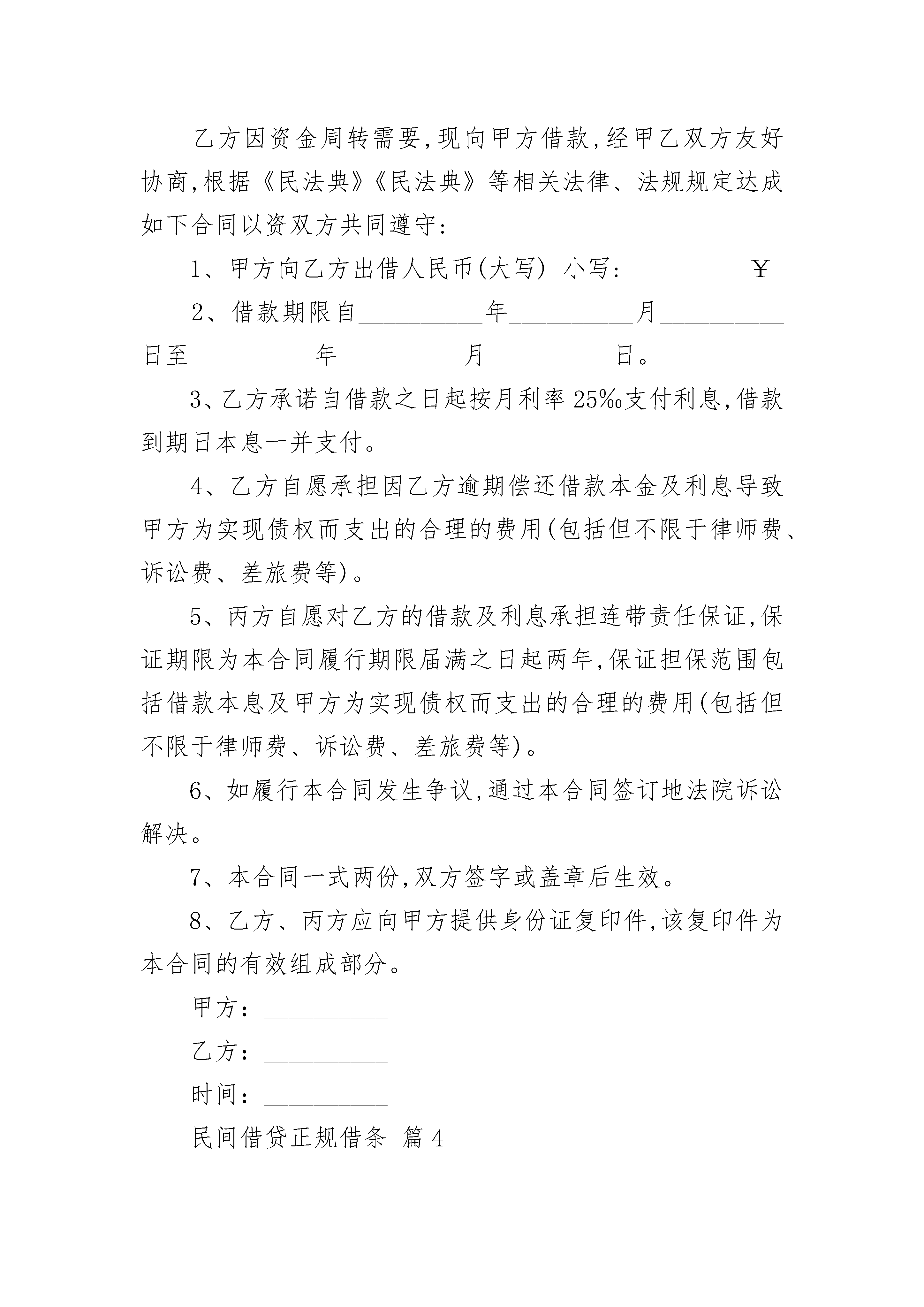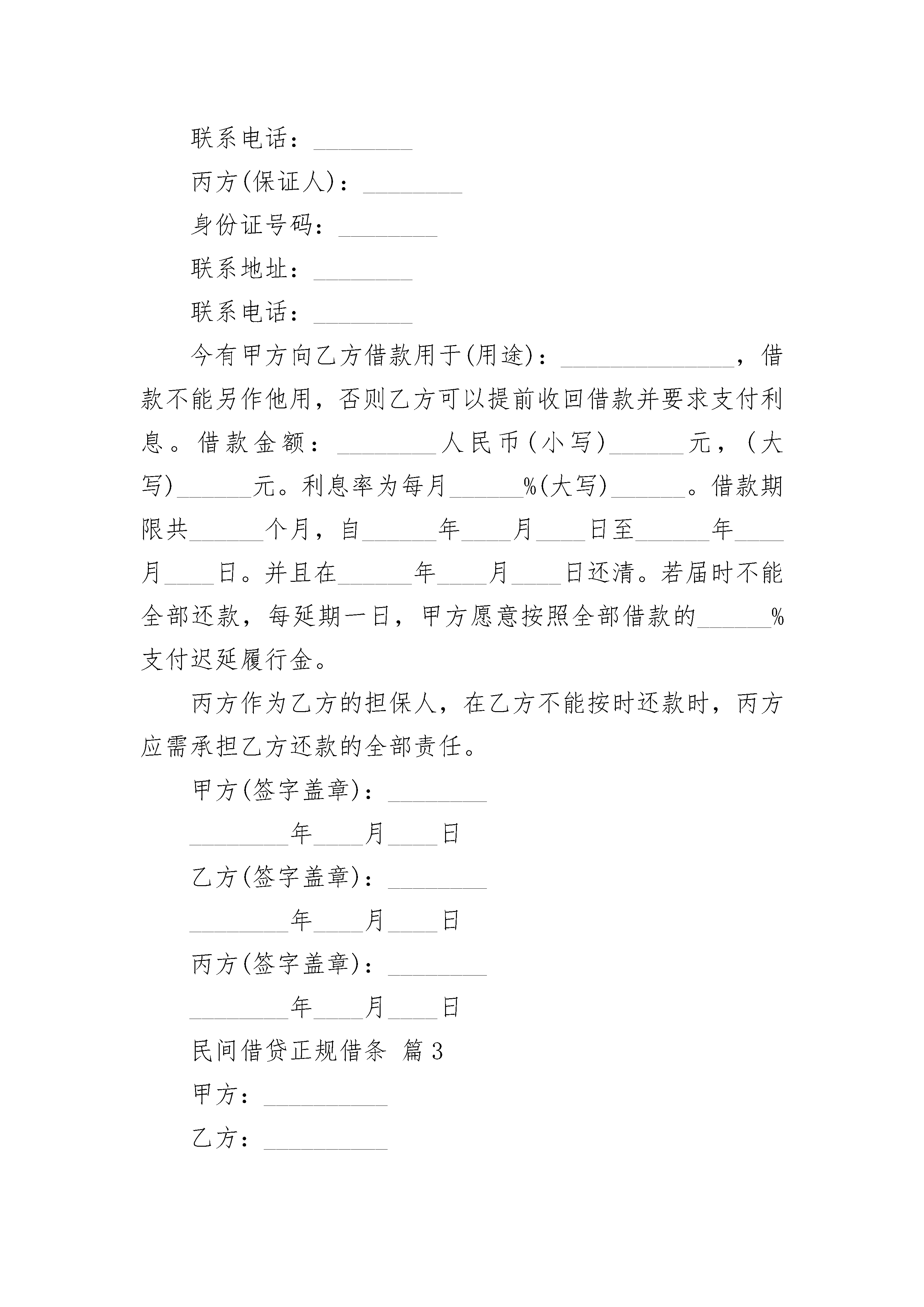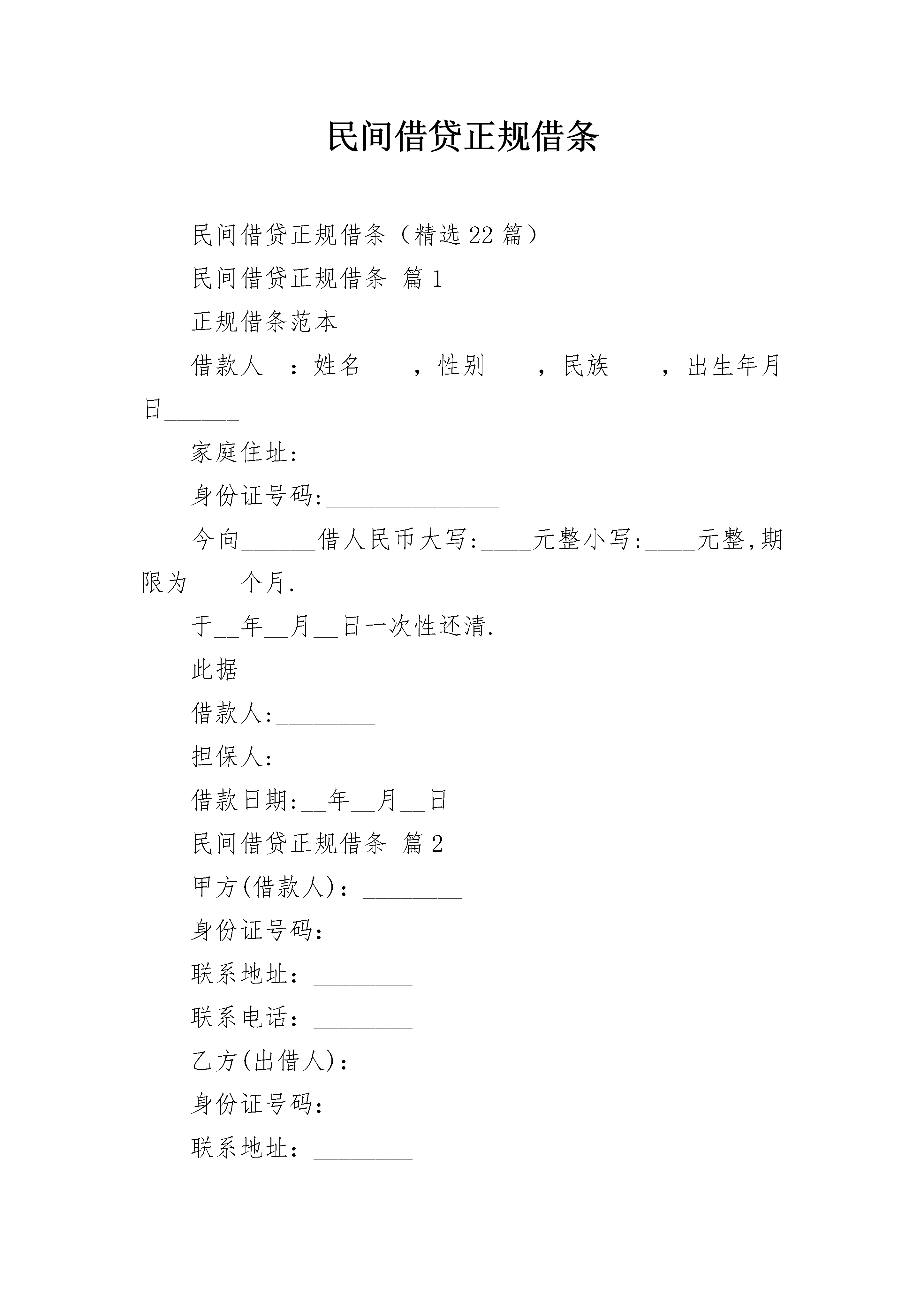 民间借贷正规借条民间借贷正规借条(精选22篇)民间借贷正规借条篇1正规借条范本借款人:姓名____,性别____,民族____,出生年月日______家庭住址:________________身份证号码:______________今向______借人民币大写:____元整小写:____元整,期限为____个月.于__年__月__日一次性还清.此据借款人:________担保人:________借款日期:__年__月__日民间借贷正规借条篇2甲方(借款人):________身份证号码:________联系地址:________联系电话:________乙方(出借人):________身份证号码:________联系地址:________联系电话:________丙方(保证人):________身份证号码:________联系地址:________联系电话:________今有甲方向乙方借款用于(用途):______________,借款不能另作他用,否则乙方可以提前收回借款并要求支付利息。借款金额:________人民币(小写)______元,(大写)______元。利息率为每月______%(大写)______。借款期限共______个月,自______年____月____日至______年____月____日。并且在______年____月____日还清。若届时不能全部还款,每延期一日,甲方愿意按照全部借款的______%支付迟延履行金。丙方作为乙方的担保人,在乙方不能按时还款时,丙方应需承担乙方还款的全部责任。甲方(签字盖章):________________年____月____日乙方(签字盖章):________________年____月____日丙方(签字盖章):________________年____月____日民间借贷正规借条篇3甲方:__________乙方:__________乙方因资金周转需要,现向甲方借款,经甲乙双方友好协商,根据《民法典》《民法典》等相关法律、法规规定达成如下合同以资双方共同遵守:1、甲方向乙方出借人民币(大写)小写:__________¥2、借款期限自__________年__________月__________日至__________年__________月__________日。3、乙方承诺自借款之日起按月利率25‰支付利息,借款到期日本息一并支付。4、乙方自愿承担因乙方逾期偿还借款本金及利息导致甲方为实现债权而支出的合理的费用(包括但不限于律师费、诉讼费、差旅费等)。5、丙方自愿对乙方的借款及利息承担连带责任保证,保证期限为本合同履行期限届满之日起两年,保证担保范围包括借款本息及甲方为实现债权而支出的合理的费用(包括但不限于律师费、诉讼费、差旅费等)。6、如履行本合同发生争议,通过本合同签订地法院诉讼解决。7、本合同一式两份,双方签字或盖章后生效。8、乙方、丙方应向甲方提供身份证复印件,该复印件为本合同的有效组成部分。甲方:__________乙方:__________时间:__________民间借贷正规借条篇4导读:随着法律意识的不断增强,人们在借贷过程中为了更好的保障双方的权益不仅仅单纯的写一张借条,而是签订书面的借款合同,有的还要保证人做担保,将保证条款和保证人在借款合同中写明。下面我们就来看看民间借贷合同的范本是怎样的。个人借款合同范本甲方(借款人):_____________________身份证号码:_________________________乙方(贷款人):_____________________身份证号码:_________________________一、双方就借款事项达成一致,约定如下:二、借款金额借款方向贷款方借人民币_________万元。三、借款利息自支用贷款之日起,按实际支用数计算利息,并计算复利。在合同规定的借款期内,年利为_________。借款方如果不按期归还款,逾期部分加收利率_________。四、借款期限借款方保证从_________年_________月起至_________年_________月止,按本合同规定的利息偿还借款。贷款逾期不还的部分,贷款方有权限期追回贷款。五、条款变更因国家变更利率,需要变更合同条款时,由双方签订变更合同的文件,作为本合同的组成部分。六、权利义务贷款方有权监督贷款的使用情况,了解借款方的偿债能力等情况。借款方应如实提供有关的资料。借款方如不按合同规定使用贷款,贷款方有权收回部分贷款,并对违约部分参照银行规定加收罚息。贷款方提前还款的,应按规定减收利息。七、保证条款(一)借款方用自有房屋6间做抵押,到期不能归还贷款方的贷款,贷款方有权处理抵押品。借款方到期如数归还贷款的,抵押权消灭。(