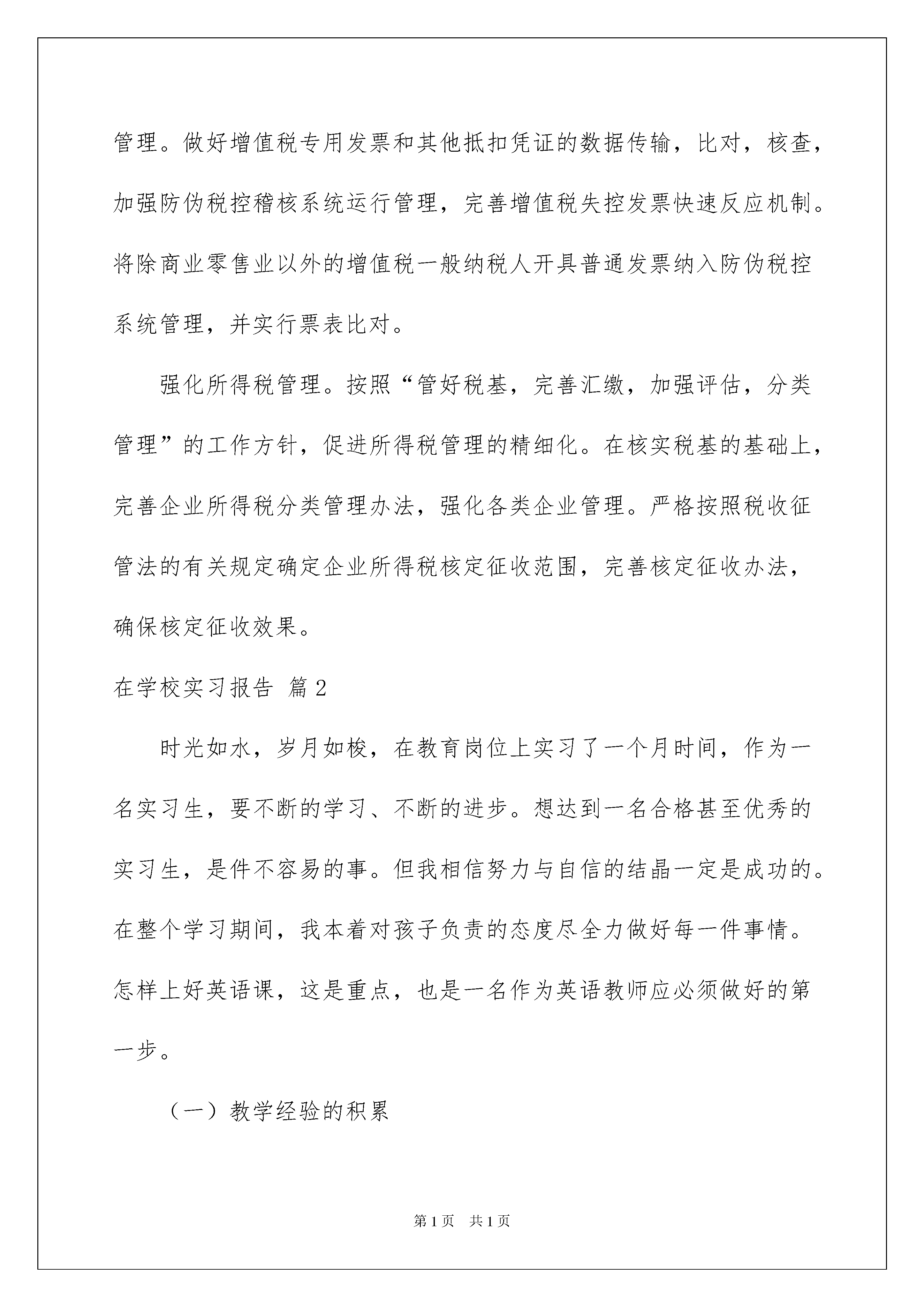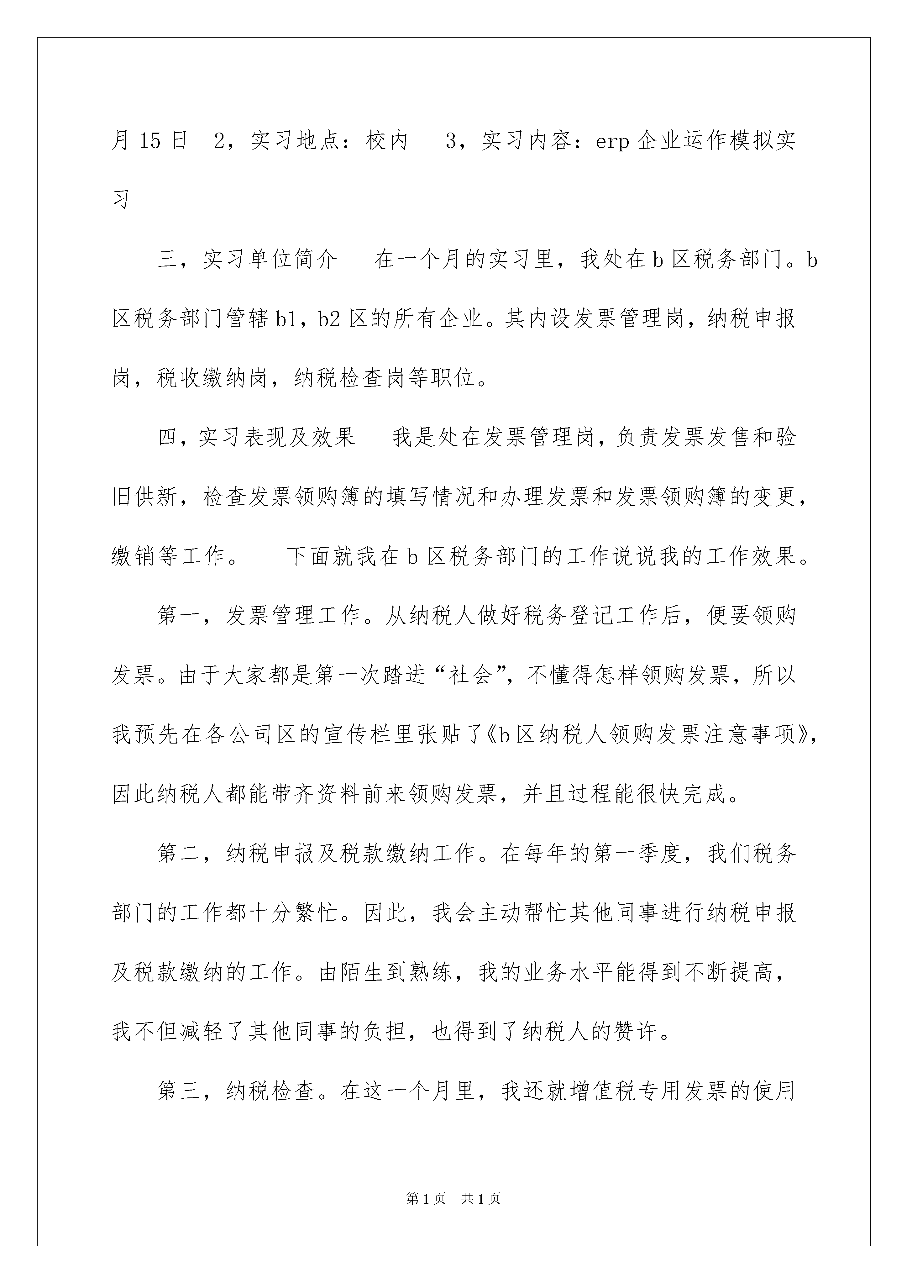 2022在学校实习报告合集七篇在学校实习报告合集七篇在当下这个社会中,报告使用的次数愈发增长,报告具有双向沟通性的特点。其实写报告并没有想象中那么难,下面是我帮大家整理的在学校实习报告7篇,仅供参考,希望能够帮助到大家。在学校实习报告篇1一,实习目的及意义我们的毕业实习分为校内模拟实习和校外实地实习。其中校内模拟实习是通过构建模拟企业运作的虚拟环境,从而达到在虚拟环境中运用已经掌握的专业知识,进行企业运作的模拟演练,进而熟悉企业的运作。在校内组织企业运作模拟实习,除了可以解决财经类院校普遍存在的学生在实际企业实习无法接触核心业务,难以体现实习作用及实习基地不足的问题外,对培养和提高我们综合素质有着特殊的意义:第一,能检验和巩固我们的专业知识。第二,能提高我们的综合素质和能力。二,实习的基本情况1,实习时间:xx年12月7日-xx年1月15日2,实习地点:校内3,实习内容:erp企业运作模拟实习三,实习单位简介在一个月的实习里,我处在b区税务部门。b区税务部门管辖b1,b2区的所有企业。其内设发票管理岗,纳税申报岗,税收缴纳岗,纳税检查岗等职位。四,实习表现及效果我是处在发票管理岗,负责发票发售和验旧供新,检查发票领购簿的填写情况和办理发票和发票领购簿的变更,缴销等工作。下面就我在b区税务部门的工作说说我的工作效果。第一,发票管理工作。从纳税人做好税务登记工作后,便要领购发票。由于大家都是第一次踏进“社会”,不懂得怎样领购发票,所以我预先在各公司区的宣传栏里张贴了《b区纳税人领购发票注意事项》,因此纳税人都能带齐资料前来领购发票,并且过程能很快完成。第二,纳税申报及税款缴纳工作。在每年的第一季度,我们税务部门的工作都十分繁忙。因此,我会主动帮忙其他同事进行纳税申报及税款缴纳的工作。由陌生到熟练,我的业务水平能得到不断提高,我不但减轻了其他同事的负担,也得到了纳税人的赞许。第三,纳税检查。在这一个月里,我还就增值税专用发票的使用情况对纳税人进行了专项检查。查获了2家企业不按照规定向第三方购买增值税专用发票,并对其进行行政处罚。第四,沟通交流工作。平时我也会抽空到其他税务部门进行交流,取长补短,以不断完善我们局的税务工作。在我们的共同努力下,这一个月里,我们局都取得了很好的成绩。第一,采取有力措施,确保3年税收收入任务完成。全面落实税收计划。加强对税收计划执行情况的管理,认真进行收入指标考核,定期检查分析税收形势,努力提高税收收入预测水平。认真做好税收征期申报,审核和税款入库工作。充分利用现有系统资源,做好数据的提炼与分析工作。要注重对纳税申报与征收管理,税源监控,税务稽查等税收信息的研究,强化申报指标的考核,不断提高申报质量。保证税款及时,正确,足额入库,严格入库级次,严防混库,错库。进一步强化重点税源监控。落实税收管理员制度,结合实际创新出有效,有力的管理措施和办法,掌握工作主动权。及时掌握和了解企业生产经营状况,做到情况明,数据准,监控有力。第二,完善基础工作,有效提高征管质量和效率。进一步明确税收管理员岗位职责,工作内容,工作要求及对其的监督管理。量力而行,因地制宜,科学界定税收管理员职责,完善税收管理员工作流程,提升税收管理员工作水平。积极探索有效的管理方式,建立科学的配套制度,提高税收管理员工作效率。按照强化管理,优化服务,开展纳税评估工作,降低税收风险,减少税款流失,提高征管质量效率。制定纳税评估工作实施办法,业务流程和工作计划,开展税收分析,开展行业税负监控,建立健全分税种纳税评估指标体系和评估模型,明确职责分工,对开展评估工作情况进行考核评价。完善税收分析制度,综合利用征管基础资料和各种数据信息,探索创新税收分析方法,制定税收分析规程,提高税收预测水平。完善欠税公告制度,做好相关管理工作。严格按照规定和程序审批延期缴纳税款,加强对延期缴纳税款的管理。规范和优化纳税服务,健全纳税服务体系,保护纳税人合法权益。梳理征管工作流程,进一步清理简并报表资料,依法合理简化办税环节,减轻纳税人负担,提高办税效率。第三,规范各项税收管理,切实提高征管水平。加强流转税的管理。做好增值税专用发票和其他抵扣凭证的数据传输,比对,核查,加强防伪税控稽核系统运行管理,完善增值税失控发票快速反应机制。将除商业零售业以外的增值税一般纳税人开具普通发票纳入防伪税控系统管理,并实行票表比对。强化所得税管理。按照“管好税基,完善汇缴,加强评估,分类管理”的工作方针,促进所得税管理的精细化。在核实税基的基础上,完善企业所得税分类管理办法,强化各类企业管理。严格按照税收征管法的有关规定确定企业所得税