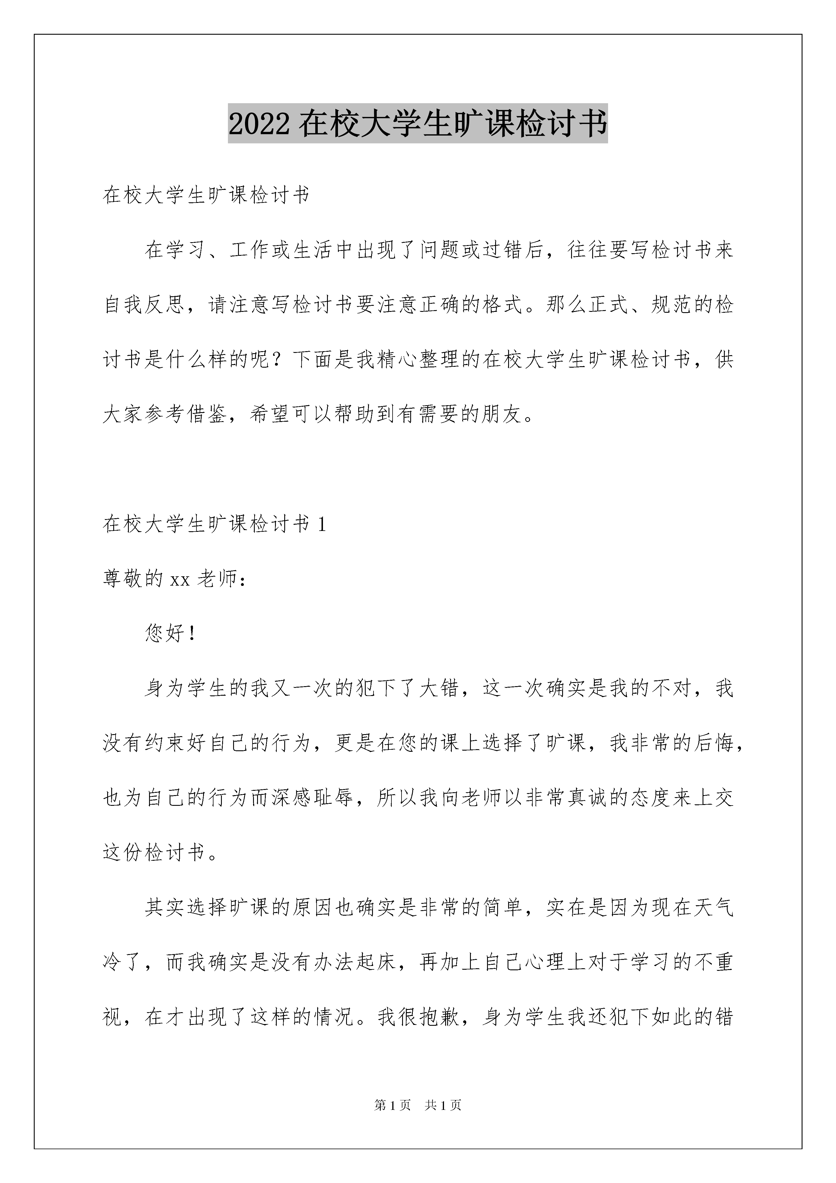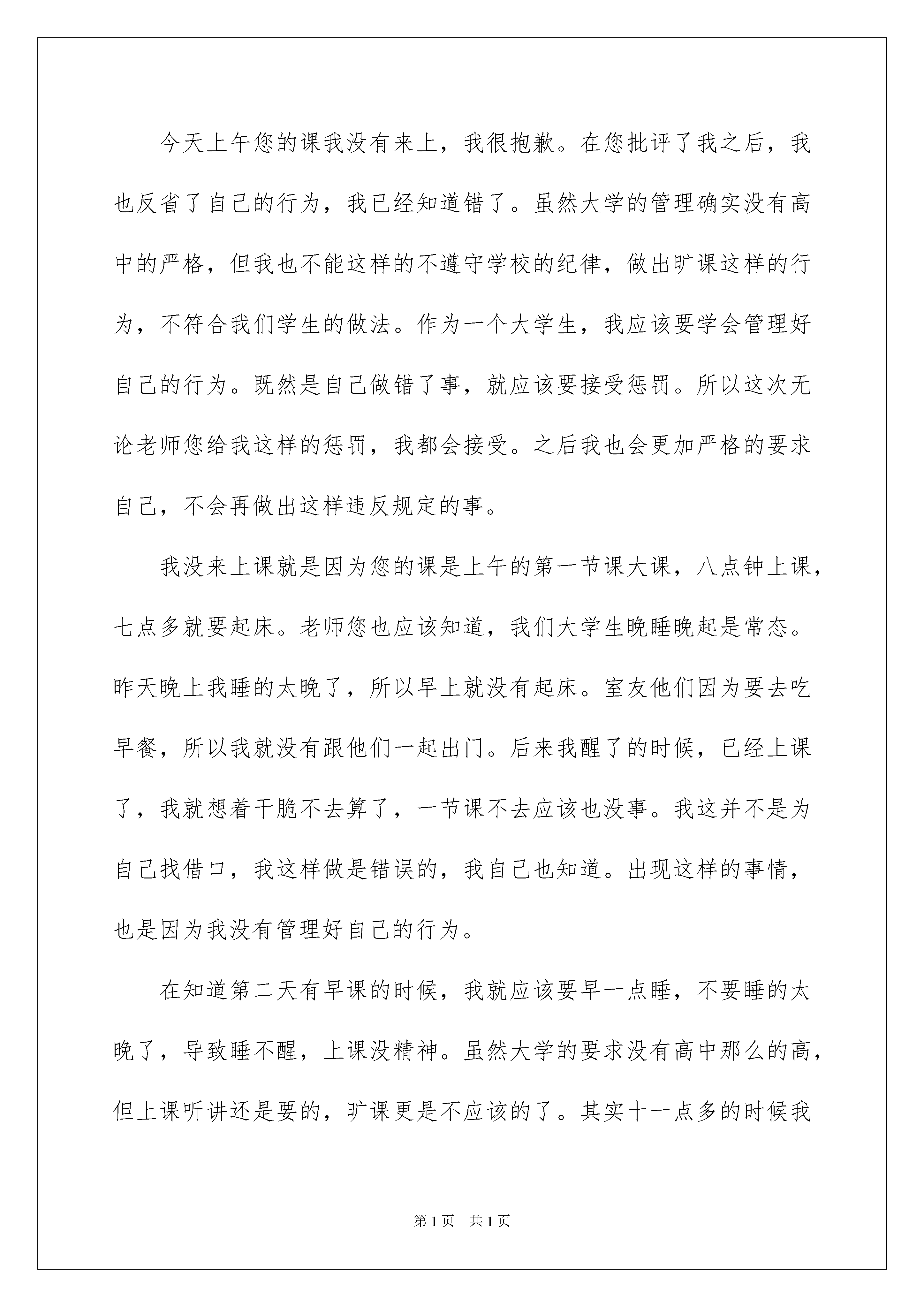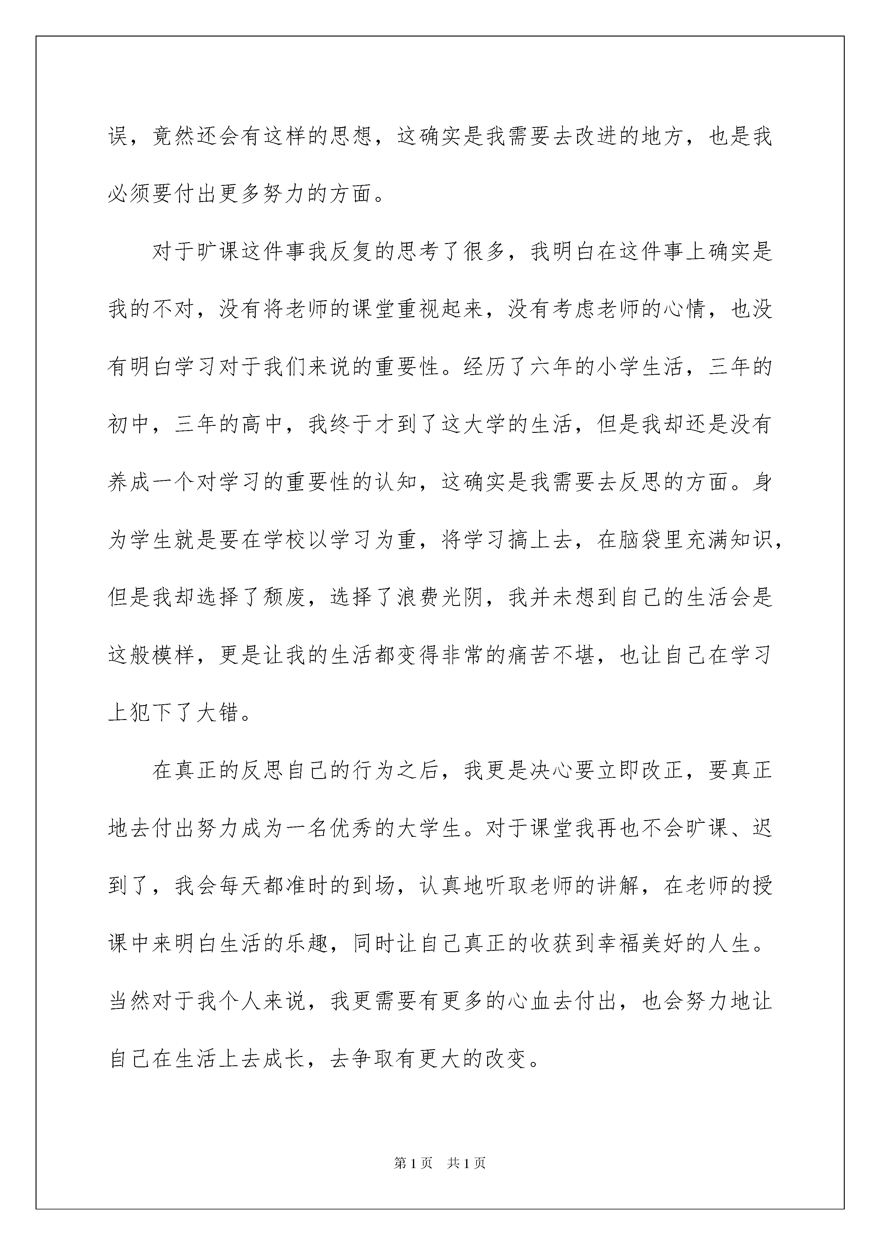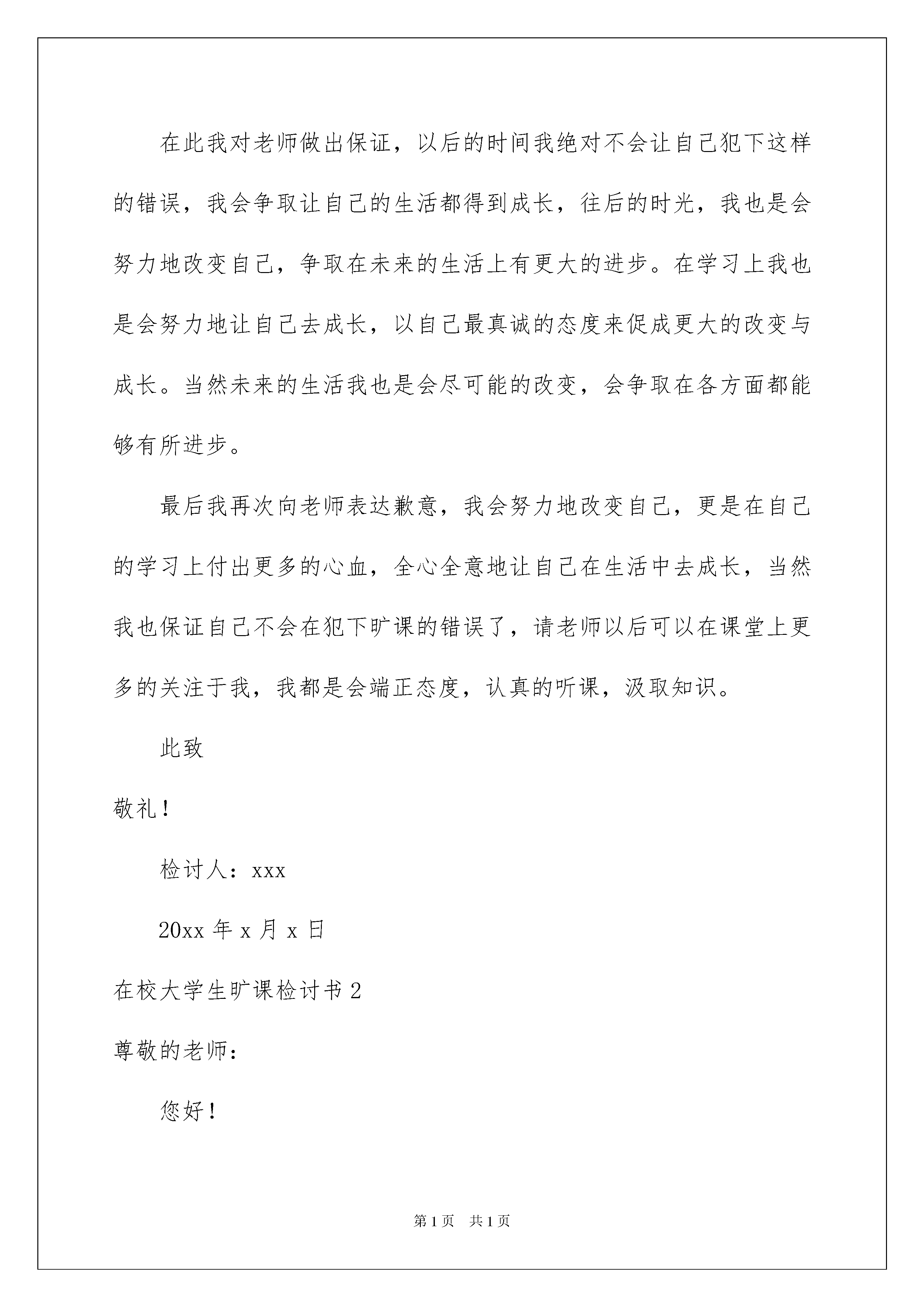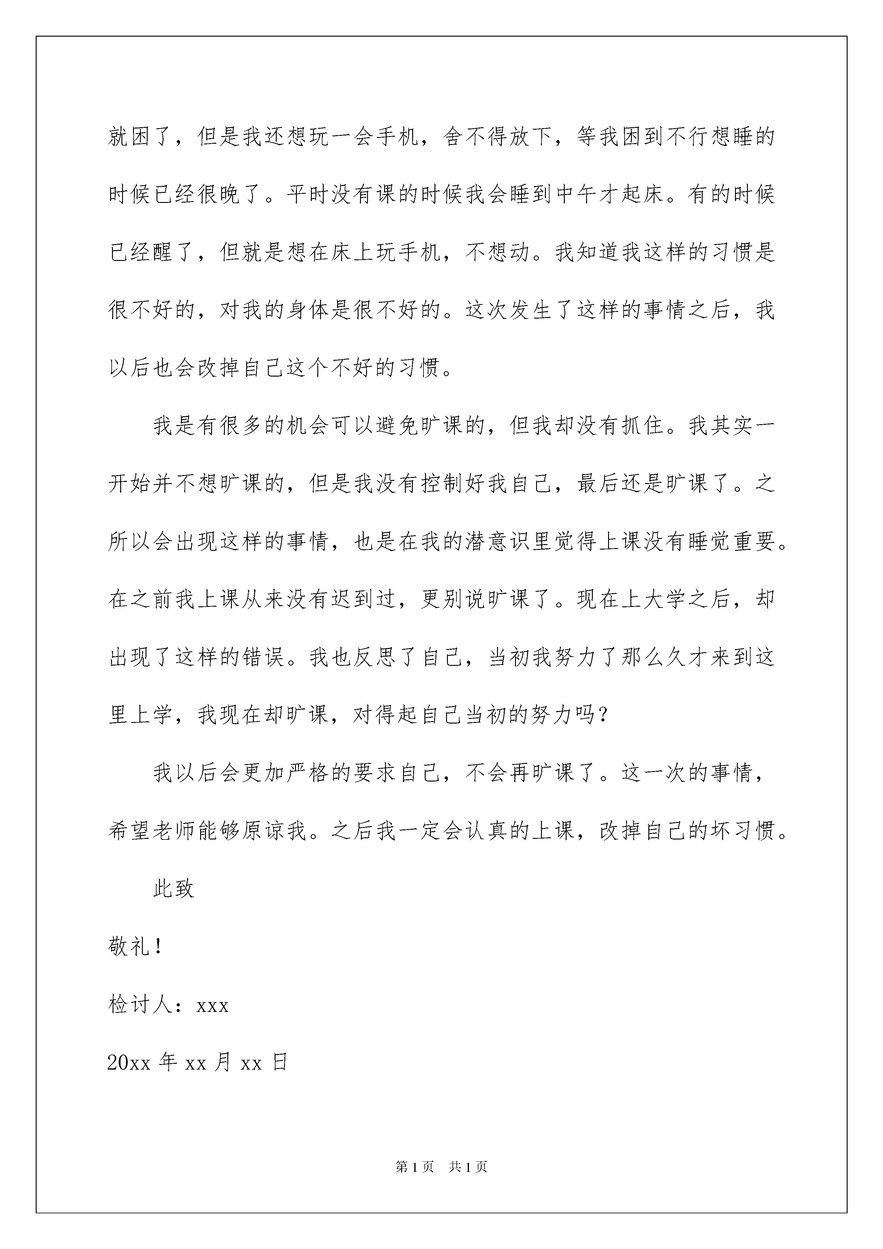 2022在校大学生旷课检讨书在校大学生旷课检讨书在学习、工作或生活中出现了问题或过错后,往往要写检讨书来自我反思,请注意写检讨书要注意正确的格式。那么正式、规范的检讨书是什么样的呢?下面是我精心整理的在校大学生旷课检讨书,供大家参考借鉴,希望可以帮助到有需要的朋友。在校大学生旷课检讨书1尊敬的xx老师:您好!身为学生的我又一次的犯下了大错,这一次确实是我的不对,我没有约束好自己的行为,更是在您的课上选择了旷课,我非常的后悔,也为自己的行为而深感耻辱,所以我向老师以非常真诚的态度来上交这份检讨书。其实选择旷课的原因也确实是非常的简单,实在是因为现在天气冷了,而我确实是没有办法起床,再加上自己心理上对于学习的不重视,在才出现了这样的情况。我很抱歉,身为学生我还犯下如此的错误,竟然还会有这样的思想,这确实是我需要去改进的地方,也是我必须要付出更多努力的方面。对于旷课这件事我反复的思考了很多,我明白在这件事上确实是我的不对,没有将老师的课堂重视起来,没有考虑老师的心情,也没有明白学习对于我们来说的重要性。经历了六年的小学生活,三年的初中,三年的高中,我终于才到了这大学的生活,但是我却还是没有养成一个对学习的重要性的认知,这确实是我需要去反思的方面。身为学生就是要在学校以学习为重,将学习搞上去,在脑袋里充满知识,但是我却选择了颓废,选择了浪费光阴,我并未想到自己的生活会是这般模样,更是让我的生活都变得非常的痛苦不堪,也让自己在学习上犯下了大错。在真正的反思自己的行为之后,我更是决心要立即改正,要真正地去付出努力成为一名优秀的大学生。对于课堂我再也不会旷课、迟到了,我会每天都准时的到场,认真地听取老师的讲解,在老师的授课中来明白生活的乐趣,同时让自己真正的收获到幸福美好的人生。当然对于我个人来说,我更需要有更多的心血去付出,也会努力地让自己在生活上去成长,去争取有更大的改变。在此我对老师做出保证,以后的时间我绝对不会让自己犯下这样的错误,我会争取让自己的生活都得到成长,往后的时光,我也是会努力地改变自己,争取在未来的生活上有更大的进步。在学习上我也是会努力地让自己去成长,以自己最真诚的态度来促成更大的改变与成长。当然未来的生活我也是会尽可能的改变,会争取在各方面都能够有所进步。最后我再次向老师表达歉意,我会努力地改变自己,更是在自己的学习上付出更多的心血,全心全意地让自己在生活中去成长,当然我也保证自己不会在犯下旷课的错误了,请老师以后可以在课堂上更多的关注于我,我都是会端正态度,认真的听课,汲取知识。此致敬礼!检讨人:xxx20xx年x月x日在校大学生旷课检讨书2尊敬的老师:您好!今天上午您的课我没有来上,我很抱歉。在您批评了我之后,我也反省了自己的行为,我已经知道错了。虽然大学的管理确实没有高中的严格,但我也不能这样的不遵守学校的纪律,做出旷课这样的行为,不符合我们学生的做法。作为一个大学生,我应该要学会管理好自己的行为。既然是自己做错了事,就应该要接受惩罚。所以这次无论老师您给我这样的惩罚,我都会接受。之后我也会更加严格的要求自己,不会再做出这样违反规定的事。我没来上课就是因为您的课是上午的第一节课大课,八点钟上课,七点多就要起床。老师您也应该知道,我们大学生晚睡晚起是常态。昨天晚上我睡的太晚了,所以早上就没有起床。室友他们因为要去吃早餐,所以我就没有跟他们一起出门。后来我醒了的时候,已经上课了,我就想着干脆不去算了,一节课不去应该也没事。我这并不是为自己找借口,我这样做是错误的,我自己也知道。出现这样的事情,也是因为我没有管理好自己的行为。在知道第二天有早课的时候,我就应该要早一点睡,不要睡的太晚了,导致睡不醒,上课没精神。虽然大学的要求没有高中那么的高,但上课听讲还是要的,旷课更是不应该的了。其实十一点多的时候我就困了,但是我还想玩一会手机,舍不得放下,等我困到不行想睡的时候已经很晚了。平时没有课的时候我会睡到中午才起床。有的时候已经醒了,但就是想在床上玩手机,不想动。我知道我这样的习惯是很不好的,对我的身体是很不好的。这次发生了这样的事情之后,我以后也会改掉自己这个不好的习惯。我是有很多的机会可以避免旷课的,但我却没有抓住。我其实一开始并不想旷课的,但是我没有控制好我自己,最后还是旷课了。之所以会出现这样的事情,也是在我的潜意识里觉得上课没有睡觉重要。在之前我上课从来没有迟到过,更别说旷课了。现在上大学之后,却出现了这样的错误。我也反思了自己,当初我努力了那么久才来到这里上学,我现在却旷课,对得起自己当初的努力吗?我以后会更加严格的要求自己,不会再旷课了。这一次的事情,希