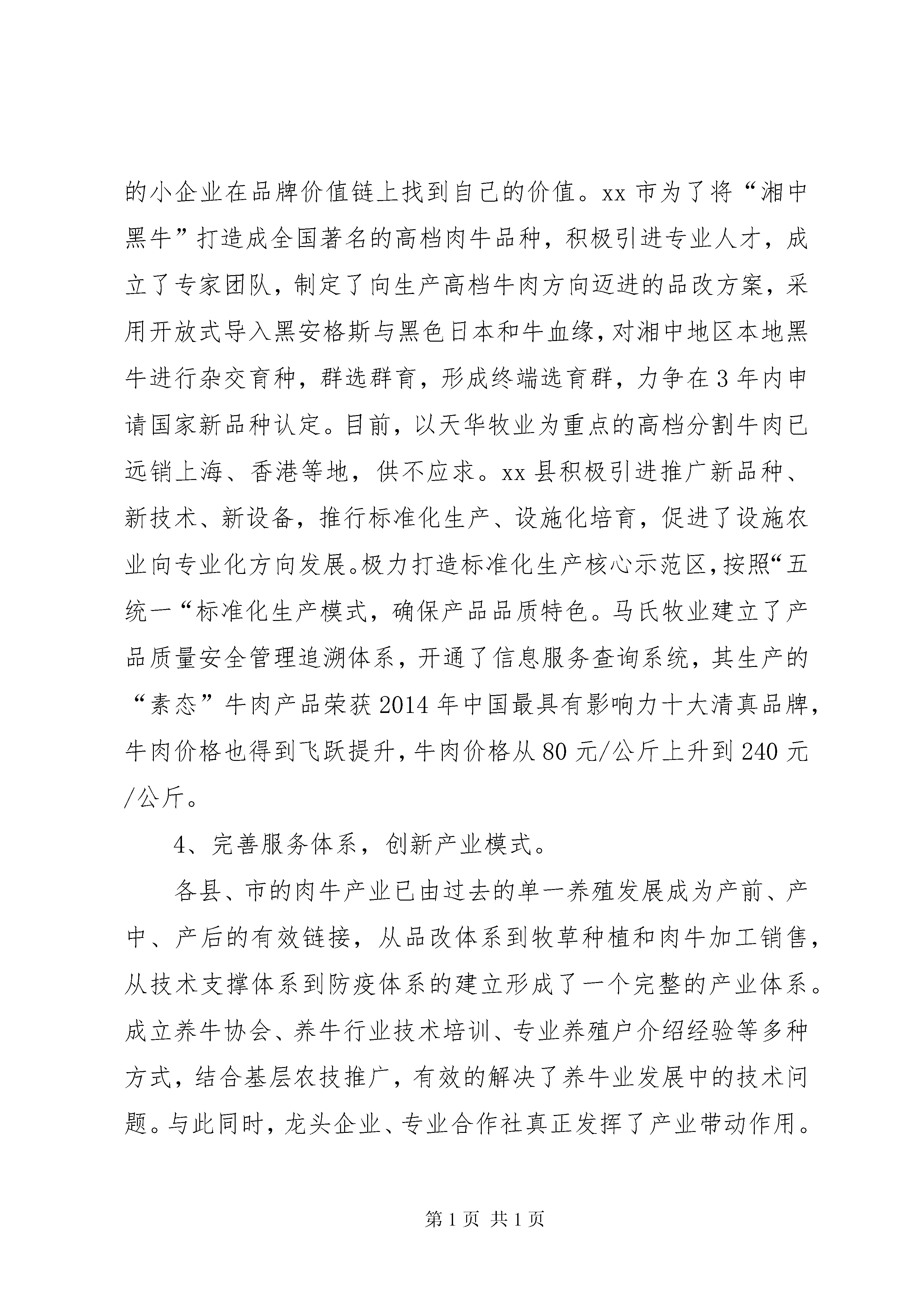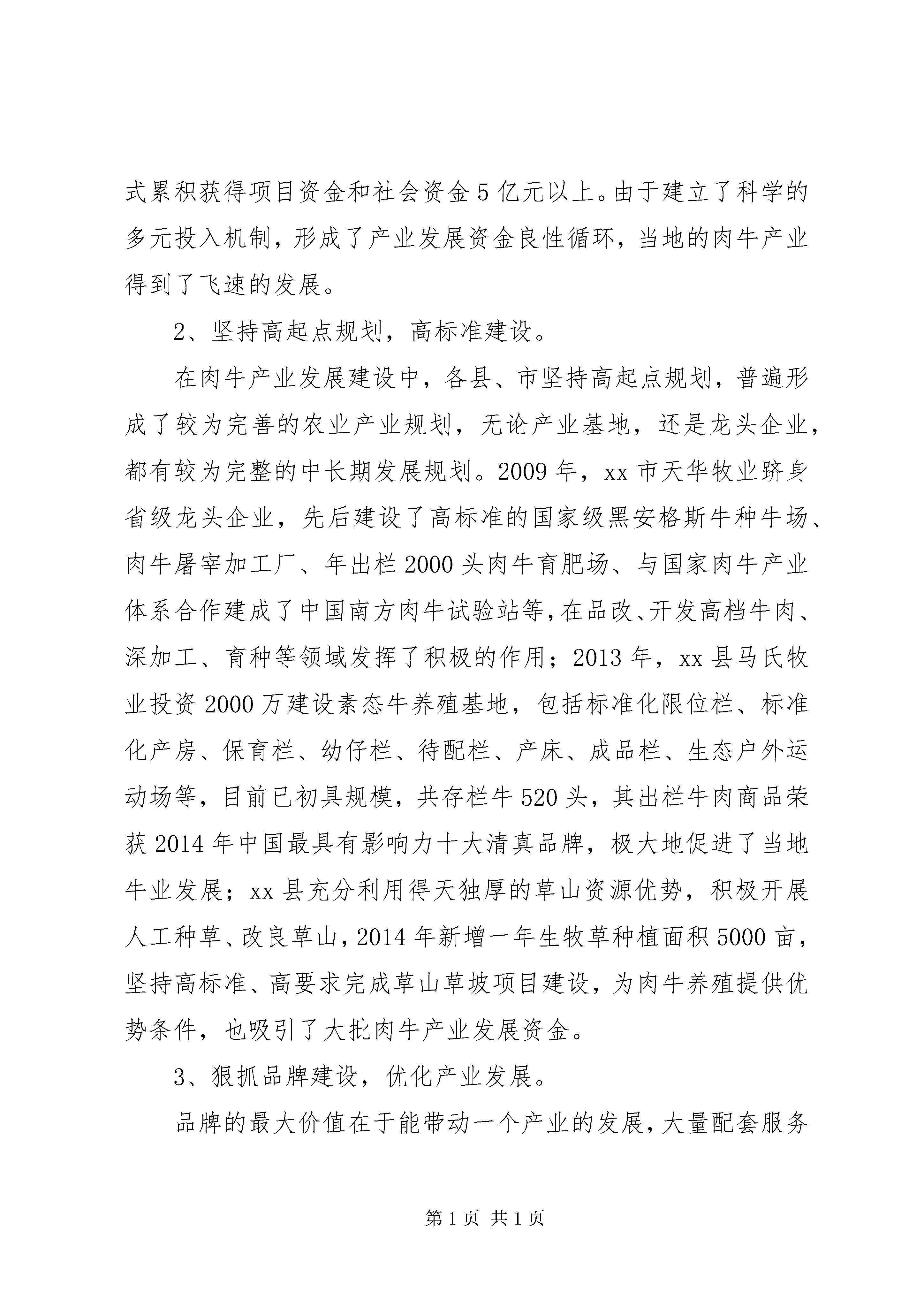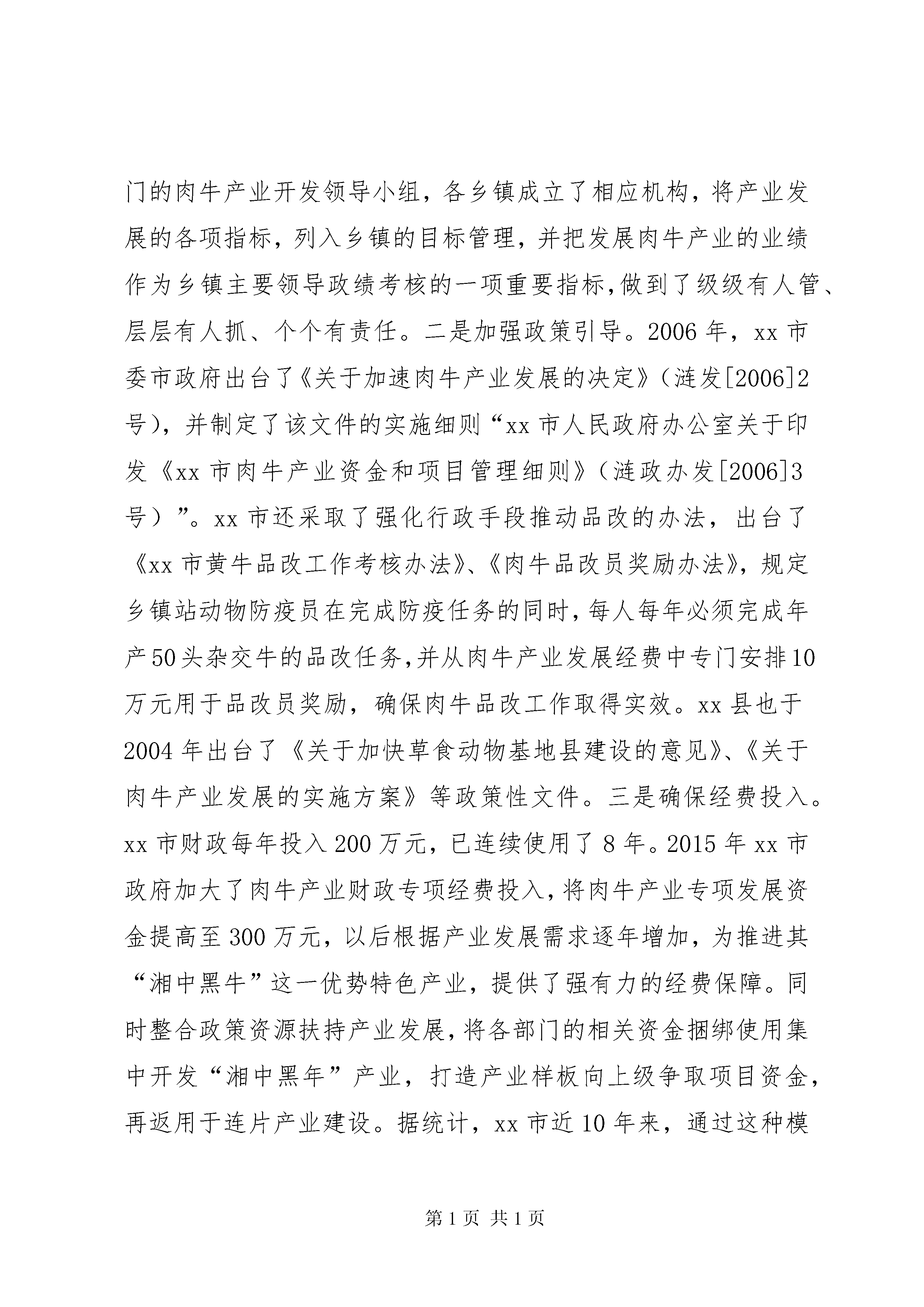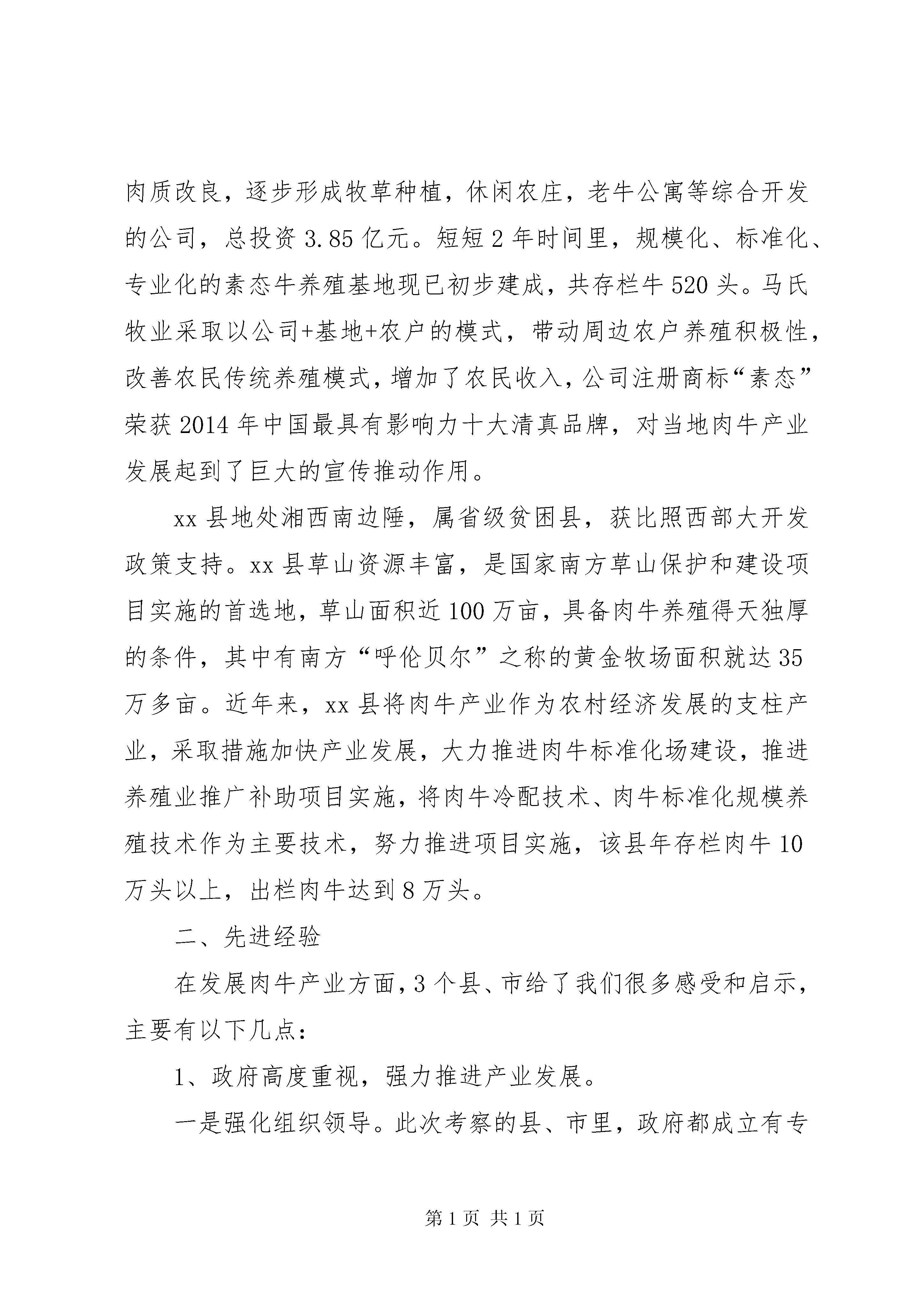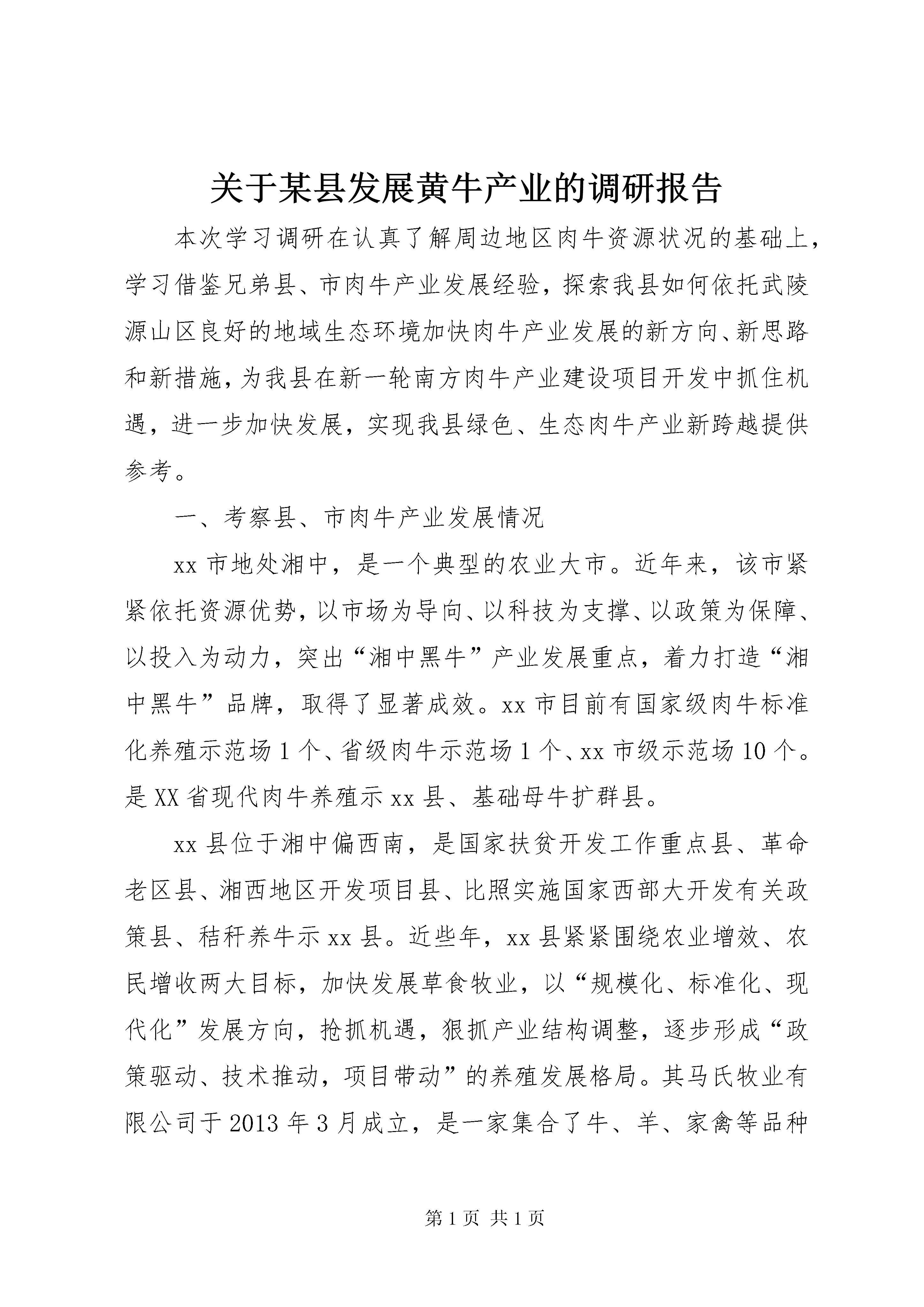 关于某县发展黄牛产业的调研报告本次学习调研在认真了解周边地区肉牛资源状况的基础上,学习借鉴兄弟县、市肉牛产业发展经验,探索我县如何依托武陵源山区良好的地域生态环境加快肉牛产业发展的新方向、新思路和新措施,为我县在新一轮南方肉牛产业建设项目开发中抓住机遇,进一步加快发展,实现我县绿色、生态肉牛产业新跨越提供参考。一、考察县、市肉牛产业发展情况xx市地处湘中,是一个典型的农业大市。近年来,该市紧紧依托资源优势,以市场为导向、以科技为支撑、以政策为保障、以投入为动力,突出“湘中黑牛”产业发展重点,着力打造“湘中黑牛”品牌,取得了显著成效。xx市目前有国家级肉牛标准化养殖示范场1个、省级肉牛示范场1个、xx市级示范场10个。是XX省现代肉牛养殖示xx县、基础母牛扩群县。xx县位于湘中偏西南,是国家扶贫开发工作重点县、革命老区县、湘西地区开发项目县、比照实施国家西部大开发有关政策县、秸秆养牛示xx县。近些年,xx县紧紧围绕农业增效、农民增收两大目标,加快发展草食牧业,以“规模化、标准化、现代化”发展方向,抢抓机遇,狠抓产业结构调整,逐步形成“政策驱动、技术推动,项目带动”的养殖发展格局。其马氏牧业有限公司于2013年3月成立,是一家集合了牛、羊、家禽等品种肉质改良,逐步形成牧草种植,休闲农庄,老牛公寓等综合开发的公司,总投资3.85亿元。短短2年时间里,规模化、标准化、专业化的素态牛养殖基地现已初步建成,共存栏牛520头。马氏牧业采取以公司+基地+农户的模式,带动周边农户养殖积极性,改善农民传统养殖模式,增加了农民收入,公司注册商标“素态”荣获2014年中国最具有影响力十大清真品牌,对当地肉牛产业发展起到了巨大的宣传推动作用。xx县地处湘西南边陲,属省级贫困县,获比照西部大开发政策支持。xx县草山资源丰富,是国家南方草山保护和建设项目实施的首选地,草山面积近100万亩,具备肉牛养殖得天独厚的条件,其中有南方“呼伦贝尔”之称的黄金牧场面积就达35万多亩。近年来,xx县将肉牛产业作为农村经济发展的支柱产业,采取措施加快产业发展,大力推进肉牛标准化场建设,推进养殖业推广补助项目实施,将肉牛冷配技术、肉牛标准化规模养殖技术作为主要技术,努力推进项目实施,该县年存栏肉牛10万头以上,出栏肉牛达到8万头。二、先进经验在发展肉牛产业方面,3个县、市给了我们很多感受和启示,主要有以下几点:1、政府高度重视,强力推进产业发展。一是强化组织领导。此次考察的县、市里,政府都成立有专门的肉牛产业开发领导小组,各乡镇成立了相应机构,将产业发展的各项指标,列入乡镇的目标管理,并把发展肉牛产业的业绩作为乡镇主要领导政绩考核的一项重要指标,做到了级级有人管、层层有人抓、个个有责任。二是加强政策引导。2006年,xx市委市政府出台了《关于加速肉牛产业发展的决定》(涟发[2006]2号),并制定了该文件的实施细则“xx市人民政府办公室关于印发《xx市肉牛产业资金和项目管理细则》(涟政办发[2006]3号)”。xx市还采取了强化行政手段推动品改的办法,出台了《xx市黄牛品改工作考核办法》、《肉牛品改员奖励办法》,规定乡镇站动物防疫员在完成防疫任务的同时,每人每年必须完成年产50头杂交牛的品改任务,并从肉牛产业发展经费中专门安排10万元用于品改员奖励,确保肉牛品改工作取得实效。xx县也于2004年出台了《关于加快草食动物基地县建设的意见》、《关于肉牛产业发展的实施方案》等政策性文件。三是确保经费投入。xx市财政每年投入200万元,已连续使用了8年。2015年xx市政府加大了肉牛产业财政专项经费投入,将肉牛产业专项发展资金提高至300万元,以后根据产业发展需求逐年增加,为推进其“湘中黑牛”这一优势特色产业,提供了强有力的经费保障。同时整合政策资源扶持产业发展,将各部门的相关资金捆绑使用集中开发“湘中黑年”产业,打造产业样板向上级争取项目资金,再返用于连片产业建设。据统计,xx市近10年来,通过这种模式累积获得项目资金和社会资金5亿元以上。由于建立了科学的多元投入机制,形成了产业发展资金良性循环,当地的肉牛产业得到了飞速的发展。2、坚持高起点规划,高标准建设。在肉牛产业发展建设中,各县、市坚持高起点规划,普遍形成了较为完善的农业产业规划,无论产业基地,还是龙头企业,都有较为完整的中长期发展规划。2009年,xx市天华牧业跻身省级龙头企业,先后建设了高标准的国家级黑安格斯牛种牛场、肉牛屠宰加工厂、年出栏2000头肉牛育肥场、与国家肉牛产业体系合作建成了中国南方肉牛试验站等,在品改、开发高档牛肉、深加工、育种等领域发挥了积极的作用;2013年,xx县马氏牧业投资2000万建设素态牛养殖基地,包括标准化限位栏、标准化产房、保育栏、幼仔栏、待配栏、产床、成品栏、