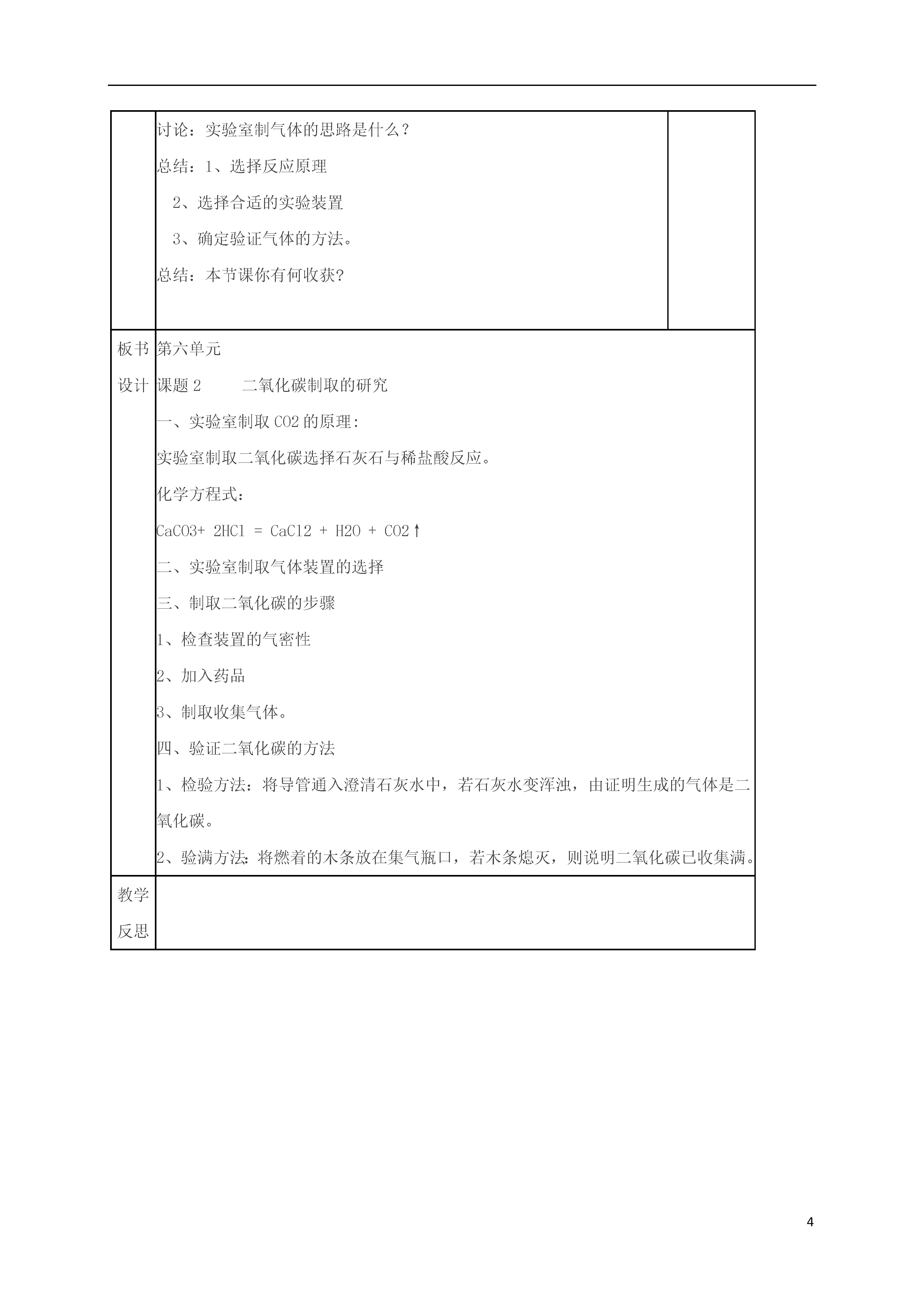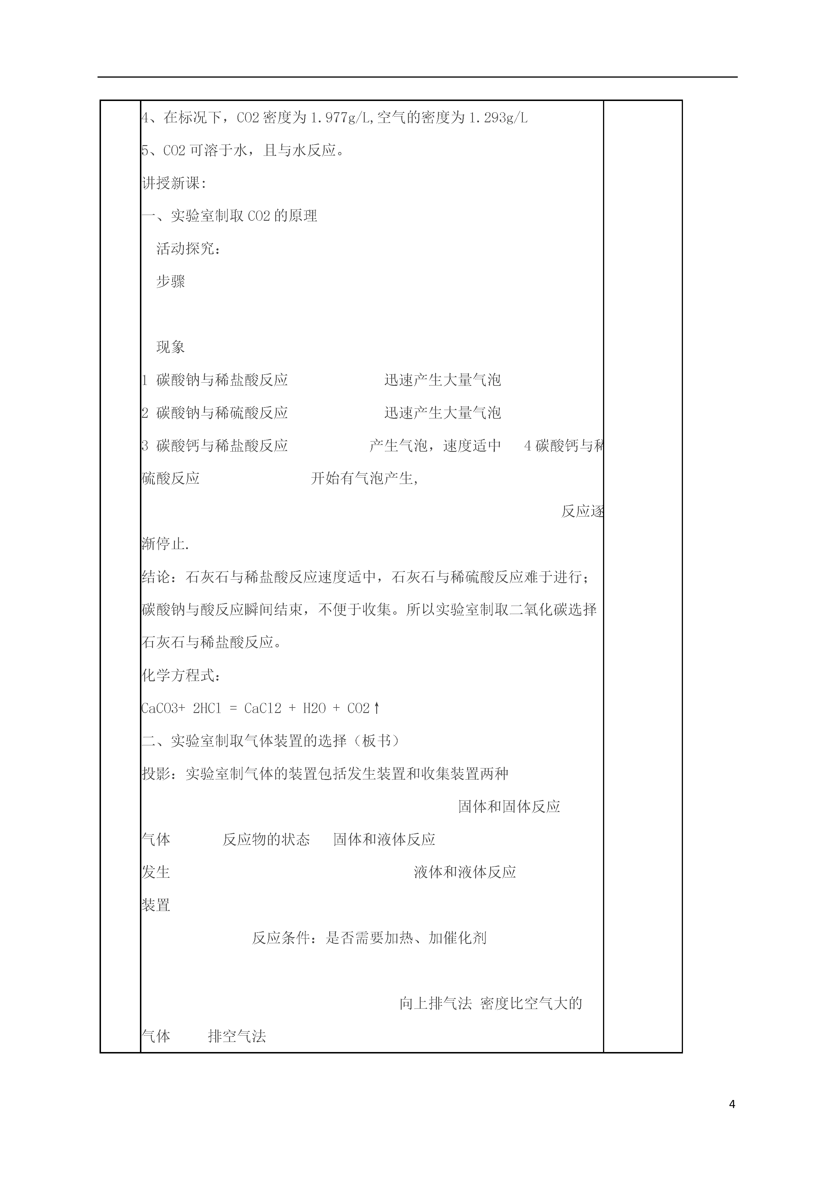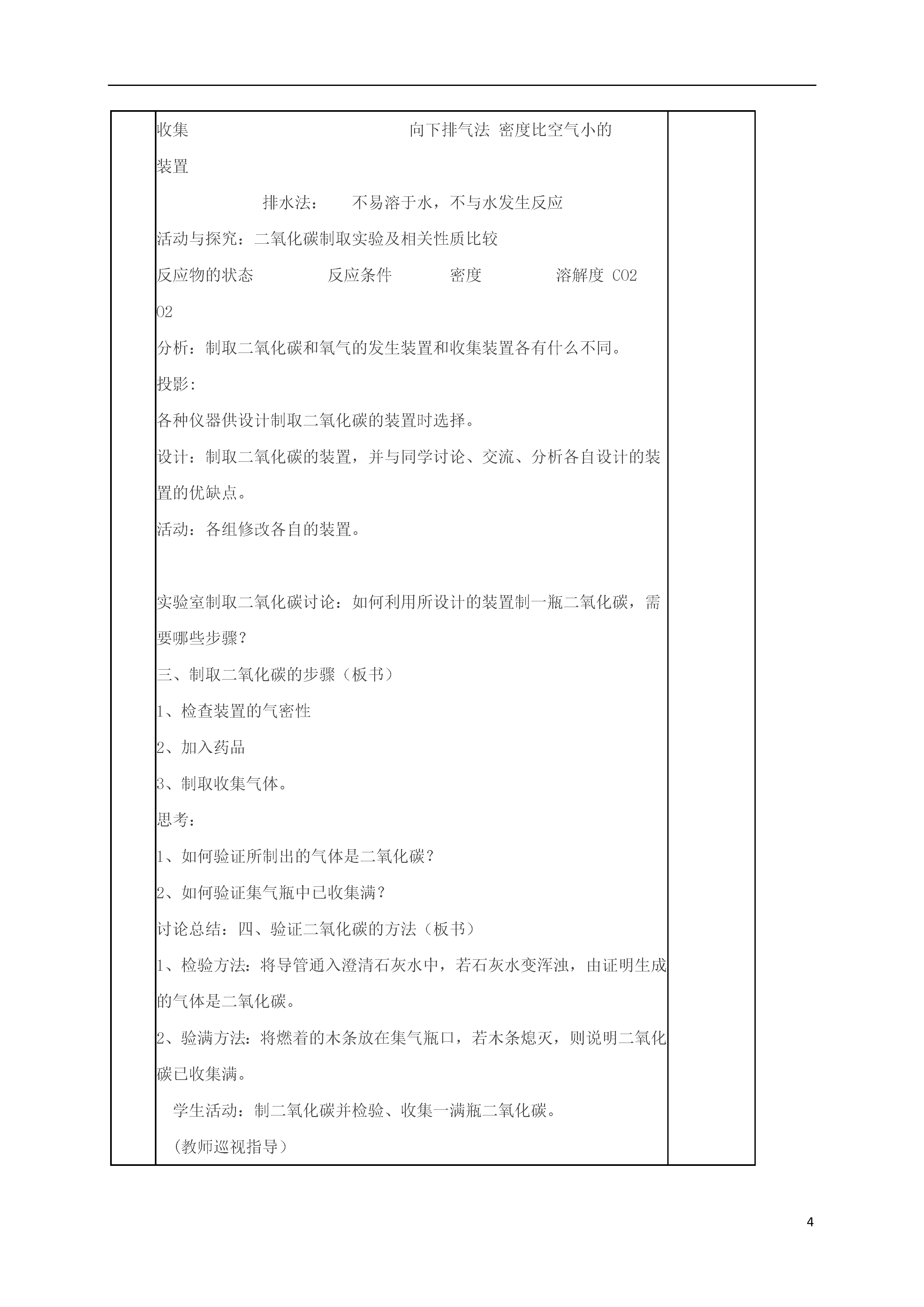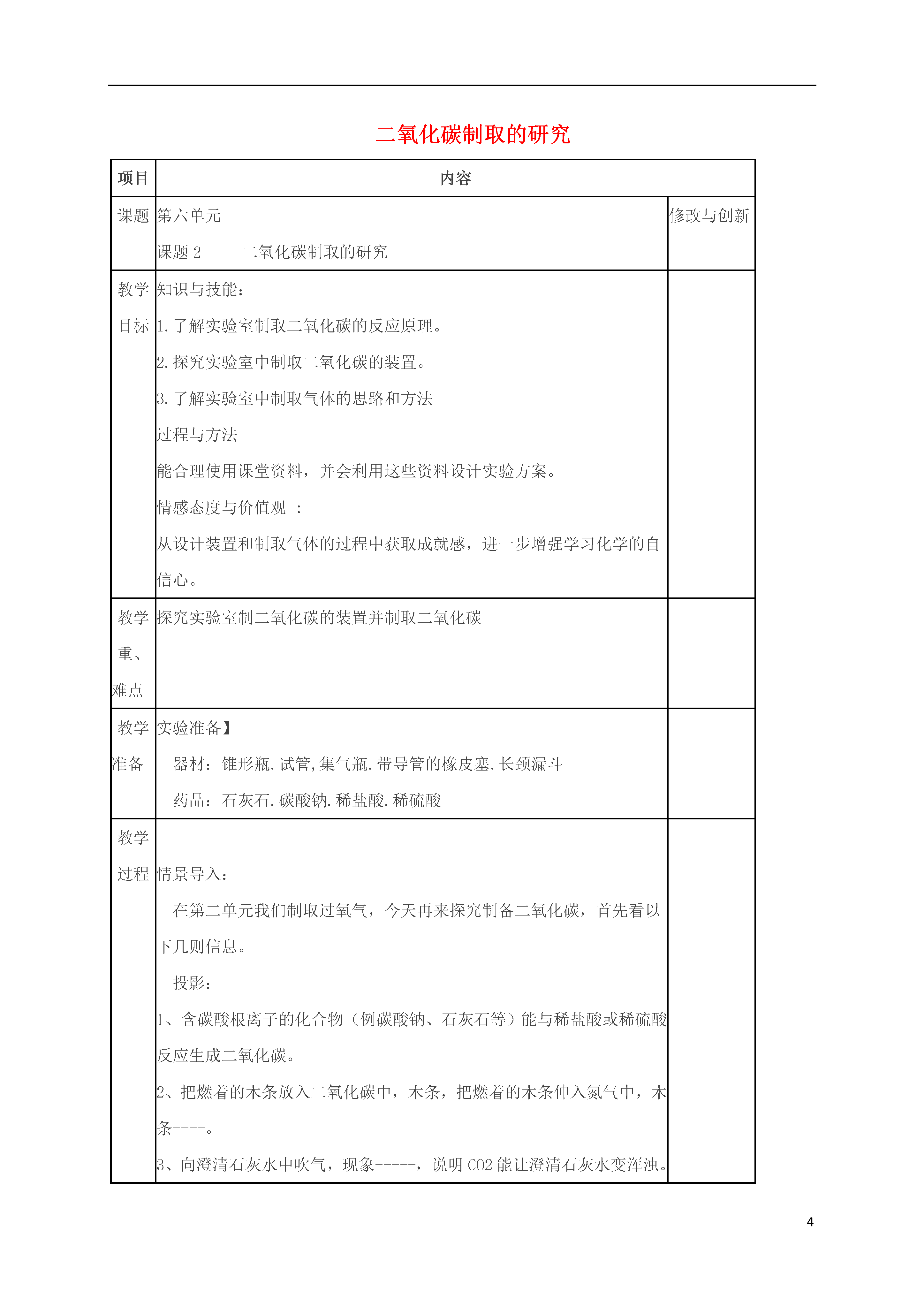 4二氧化碳制取的研究项目内容课题第六单元课题2二氧化碳制取的研究修改与创新教学目标知识与技能:1.了解实验室制取二氧化碳的反应原理。2.探究实验室中制取二氧化碳的装置。3.了解实验室中制取气体的思路和方法过程与方法能合理使用课堂资料,并会利用这些资料设计实验方案。情感态度与价值观:从设计装置和制取气体的过程中获取成就感,进一步增强学习化学的自信心。教学重、难点探究实验室制二氧化碳的装置并制取二氧化碳教学准备实验准备】器材:锥形瓶.试管,集气瓶.带导管的橡皮塞.长颈漏斗药品:石灰石.碳酸钠.稀盐酸.稀硫酸教学过程情景导入:在第二单元我们制取过氧气,今天再来探究制备二氧化碳,首先看以下几则信息。投影:1、含碳酸根离子的化合物(例碳酸钠、石灰石等)能与稀盐酸或稀硫酸反应生成二氧化碳。2、把燃着的木条放入二氧化碳中,木条,把燃着的木条伸入氮气中,木条----。3、向澄清石灰水中吹气,现象-----,说明CO2能让澄清石灰水变浑浊。4、在标况下,CO2密度为1.977g/L,空气的密度为1.293g/L5、CO2可溶于水,且与水反应。讲授新课:一、实验室制取CO2的原理活动探究:步骤现象1碳酸钠与稀盐酸反应迅速产生大量气泡2碳酸钠与稀硫酸反应迅速产生大量气泡3碳酸钙与稀盐酸反应产生气泡,速度适中4碳酸钙与稀硫酸反应开始有气泡产生,反应逐渐停止.结论:石灰石与稀盐酸反应速度适中,石灰石与稀硫酸反应难于进行;碳酸钠与酸反应瞬间结束,不便于收集。所以实验室制取二氧化碳选择石灰石与稀盐酸反应。化学方程式:CaCO3+2HCl=CaCl2+H2O+CO2↑二、实验室制取气体装置的选择(板书)投影:实验室制气体的装置包括发生装置和收集装置两种固体和固体反应气体反应物的状态固体和液体反应发生液体和液体反应装置反应条件:是否需要加热、加催化剂向上排气法密度比空气大的气体排空气法收集向下排气法密度比空气小的装置排水法:不易溶于水,不与水发生反应活动与探究:二氧化碳制取实验及相关性质比较反应物的状态反应条件密度溶解度CO2O2分析:制取二氧化碳和氧气的发生装置和收集装置各有什么不同。投影:各种仪器供设计制取二氧化碳的装置时选择。设计:制取二氧化碳的装置,并与同学讨论、交流、分析各自设计的装置的优缺点。活动:各组修改各自的装置。实验室制取二氧化碳讨论:如何利用所设计的装置制一瓶二氧化碳,需要哪些步骤?三、制取二氧化碳的步骤(板书)1、检查装置的气密性2、加入药品3、制取收集气体。思考:1、如何验证所制出的气体是二氧化碳?2、如何验证集气瓶中已收集满?讨论总结:四、验证二氧化碳的方法(板书)1、检验方法:将导管通入澄清石灰水中,若石灰水变浑浊,由证明生成的气体是二氧化碳。2、验满方法:将燃着的木条放在集气瓶口,若木条熄灭,则说明二氧化碳已收集满。学生活动:制二氧化碳并检验、收集一满瓶二氧化碳。(教师巡视指导)讨论:实验室制气体的思路是什么?总结:1、选择反应原理2、选择合适的实验装置3、确定验证气体的方法。总结:本节课你有何收获?板书设计第六单元课题2二氧化碳制取的研究一、实验室制取CO2的原理:实验室制取二氧化碳选择石灰石与稀盐酸反应。化学方程式:CaCO3+2HCl=CaCl2+H2O+CO2↑二、实验室制取气体装置的选择三、制取二氧化碳的步骤1、检查装置的气密性2、加入药品3、制取收集气体。四、验证二氧化碳的方法1、检验方法:将导管通入澄清石灰水中,若石灰水变浑浊,由证明生成的气体是二氧化碳。2、验满方法:将燃着的木条放在集气瓶口,若木条熄灭,则说明二氧化碳已收集满。教学反思