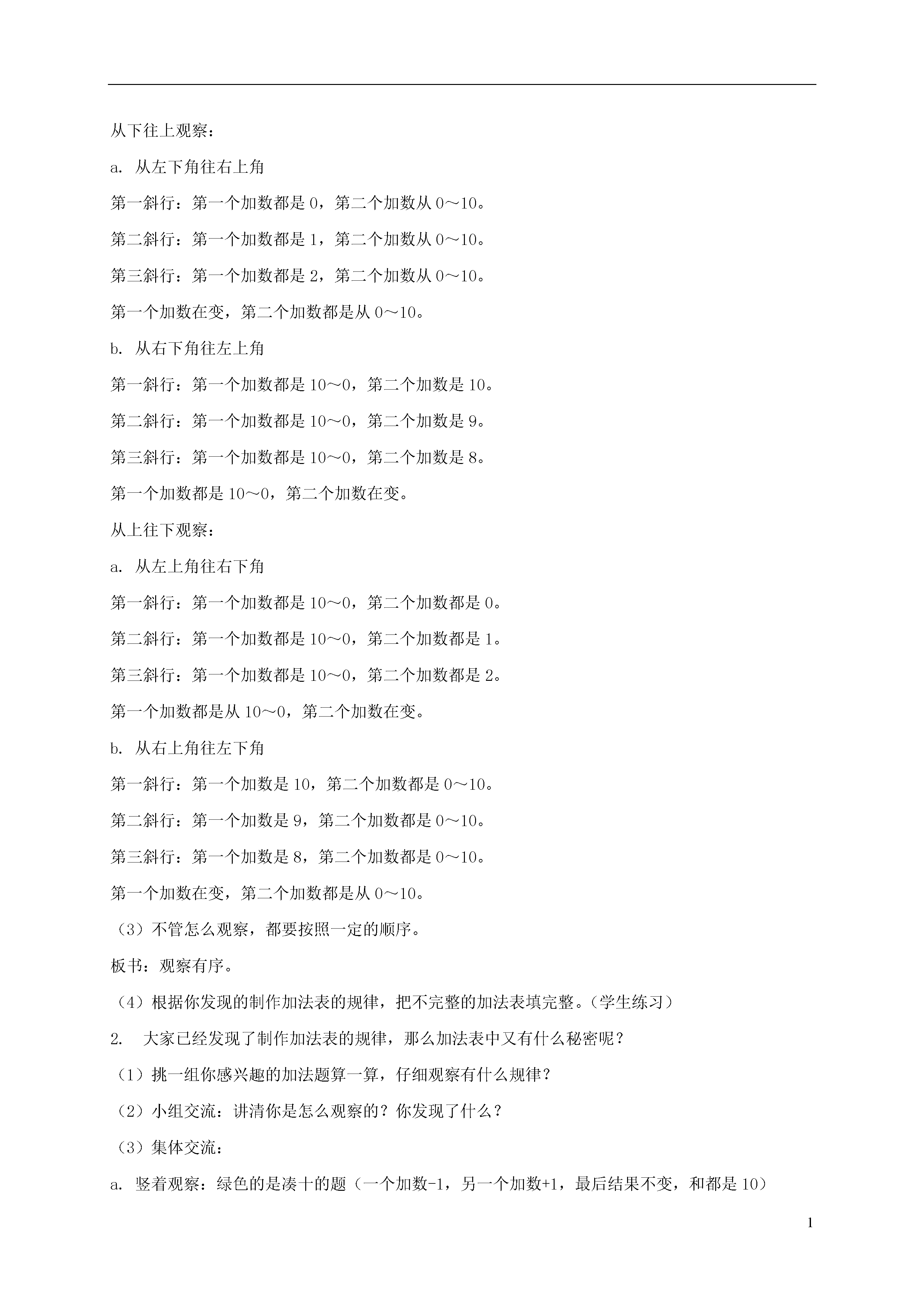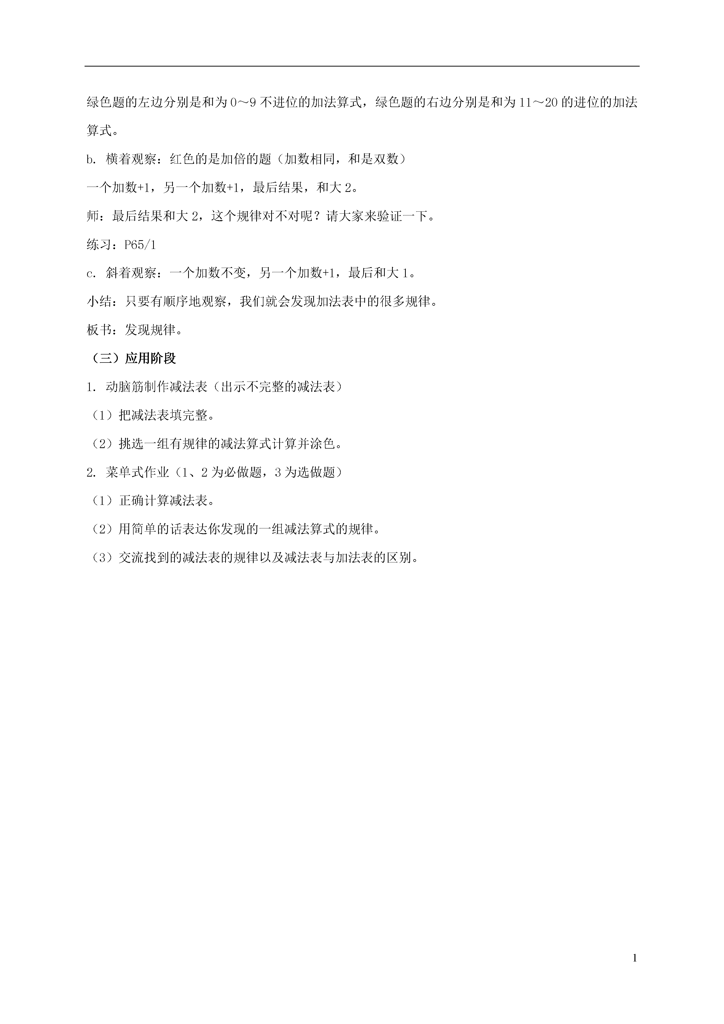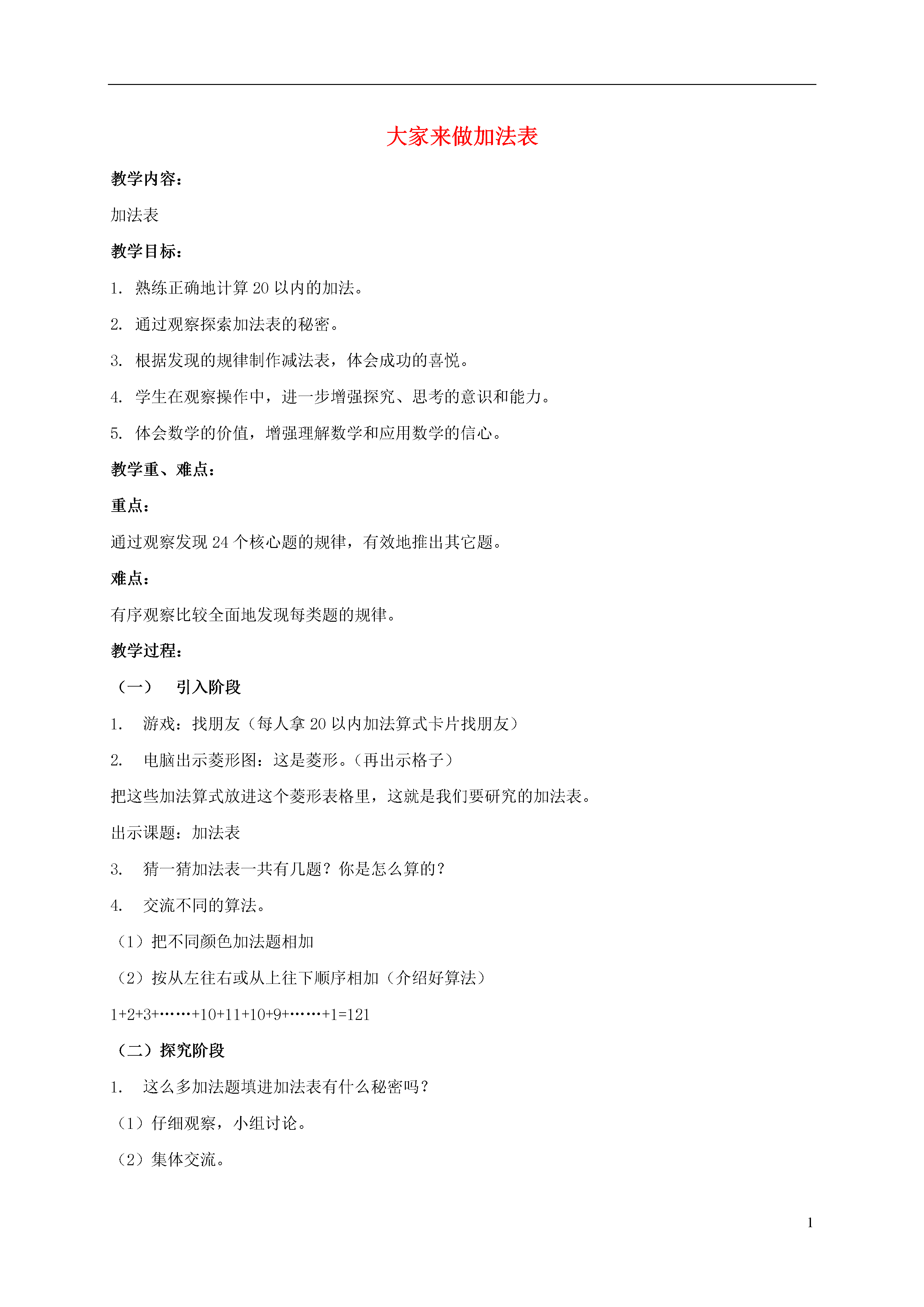 1大家来做加法表教学内容:加法表教学目标:1.熟练正确地计算20以内的加法。2.通过观察探索加法表的秘密。3.根据发现的规律制作减法表,体会成功的喜悦。4.学生在观察操作中,进一步增强探究、思考的意识和能力。5.体会数学的价值,增强理解数学和应用数学的信心。教学重、难点:重点:通过观察发现24个核心题的规律,有效地推出其它题。难点:有序观察比较全面地发现每类题的规律。教学过程:(一)引入阶段1.游戏:找朋友(每人拿20以内加法算式卡片找朋友)2.电脑出示菱形图:这是菱形。(再出示格子)把这些加法算式放进这个菱形表格里,这就是我们要研究的加法表。出示课题:加法表3.猜一猜加法表一共有几题?你是怎么算的?4.交流不同的算法。(1)把不同颜色加法题相加(2)按从左往右或从上往下顺序相加(介绍好算法)1+2+3+……+10+11+10+9+……+1=121(二)探究阶段1.这么多加法题填进加法表有什么秘密吗?(1)仔细观察,小组讨论。(2)集体交流。从下往上观察:a.从左下角往右上角第一斜行:第一个加数都是0,第二个加数从0~10。第二斜行:第一个加数都是1,第二个加数从0~10。第三斜行:第一个加数都是2,第二个加数从0~10。第一个加数在变,第二个加数都是从0~10。b.从右下角往左上角第一斜行:第一个加数都是10~0,第二个加数是10。第二斜行:第一个加数都是10~0,第二个加数是9。第三斜行:第一个加数都是10~0,第二个加数是8。第一个加数都是10~0,第二个加数在变。从上往下观察:a.从左上角往右下角第一斜行:第一个加数都是10~0,第二个加数都是0。第二斜行:第一个加数都是10~0,第二个加数都是1。第三斜行:第一个加数都是10~0,第二个加数都是2。第一个加数都是从10~0,第二个加数在变。b.从右上角往左下角第一斜行:第一个加数是10,第二个加数都是0~10。第二斜行:第一个加数是9,第二个加数都是0~10。第三斜行:第一个加数是8,第二个加数都是0~10。第一个加数在变,第二个加数都是从0~10。(3)不管怎么观察,都要按照一定的顺序。板书:观察有序。(4)根据你发现的制作加法表的规律,把不完整的加法表填完整。(学生练习)2.大家已经发现了制作加法表的规律,那么加法表中又有什么秘密呢?(1)挑一组你感兴趣的加法题算一算,仔细观察有什么规律?(2)小组交流:讲清你是怎么观察的?你发现了什么?(3)集体交流:a.竖着观察:绿色的是凑十的题(一个加数-1,另一个加数+1,最后结果不变,和都是10)绿色题的左边分别是和为0~9不进位的加法算式,绿色题的右边分别是和为11~20的进位的加法算式。b.横着观察:红色的是加倍的题(加数相同,和是双数)一个加数+1,另一个加数+1,最后结果,和大2。师:最后结果和大2,这个规律对不对呢?请大家来验证一下。练习:P65/1c.斜着观察:一个加数不变,另一个加数+1,最后和大1。小结:只要有顺序地观察,我们就会发现加法表中的很多规律。板书:发现规律。(三)应用阶段1.动脑筋制作减法表(出示不完整的减法表)(1)把减法表填完整。(2)挑选一组有规律的减法算式计算并涂色。2.菜单式作业(1、2为必做题,3为选做题)(1)正确计算减法表。(2)用简单的话表达你发现的一组减法算式的规律。(3)交流找到的减法表的规律以及减法表与加法表的区别。