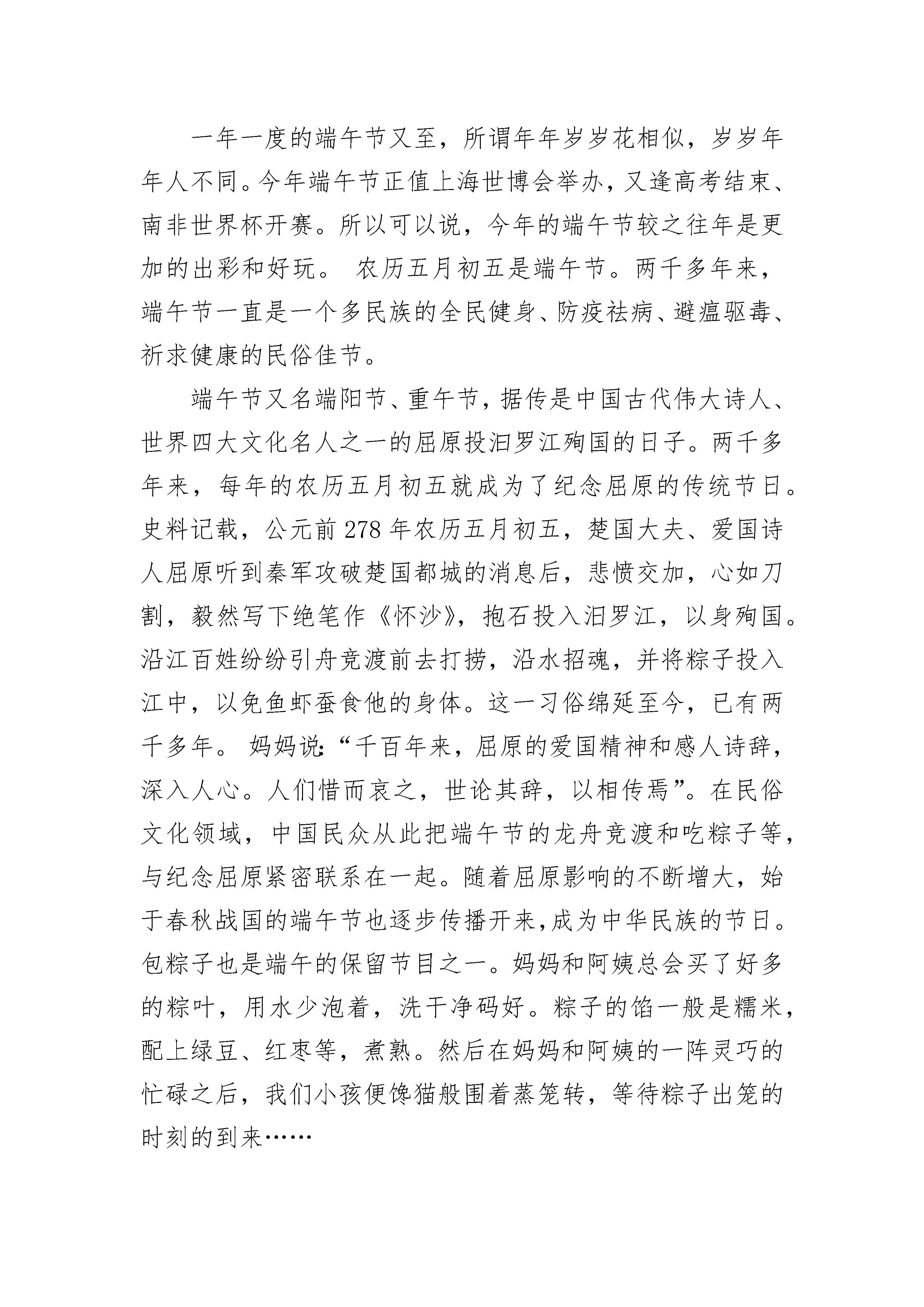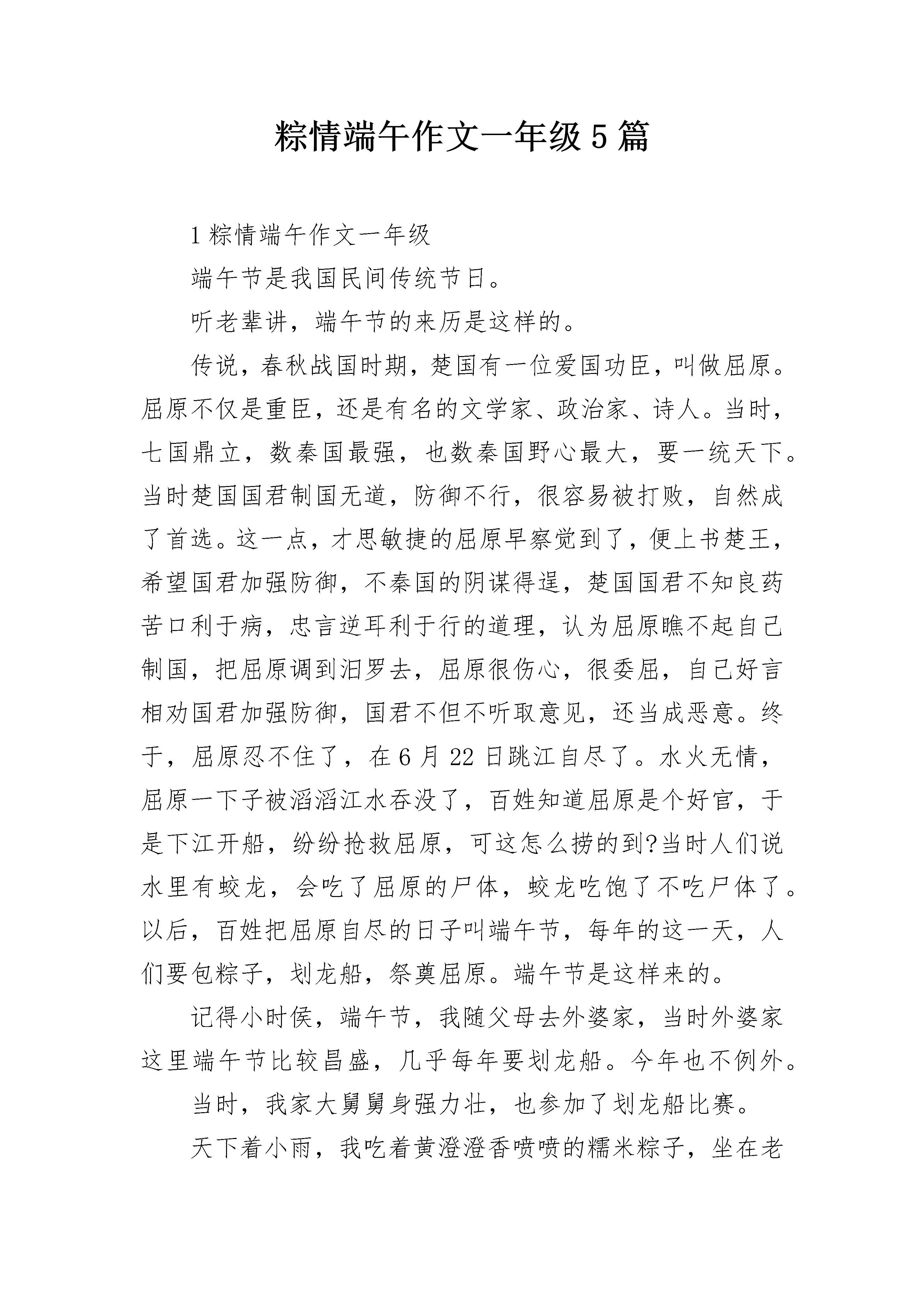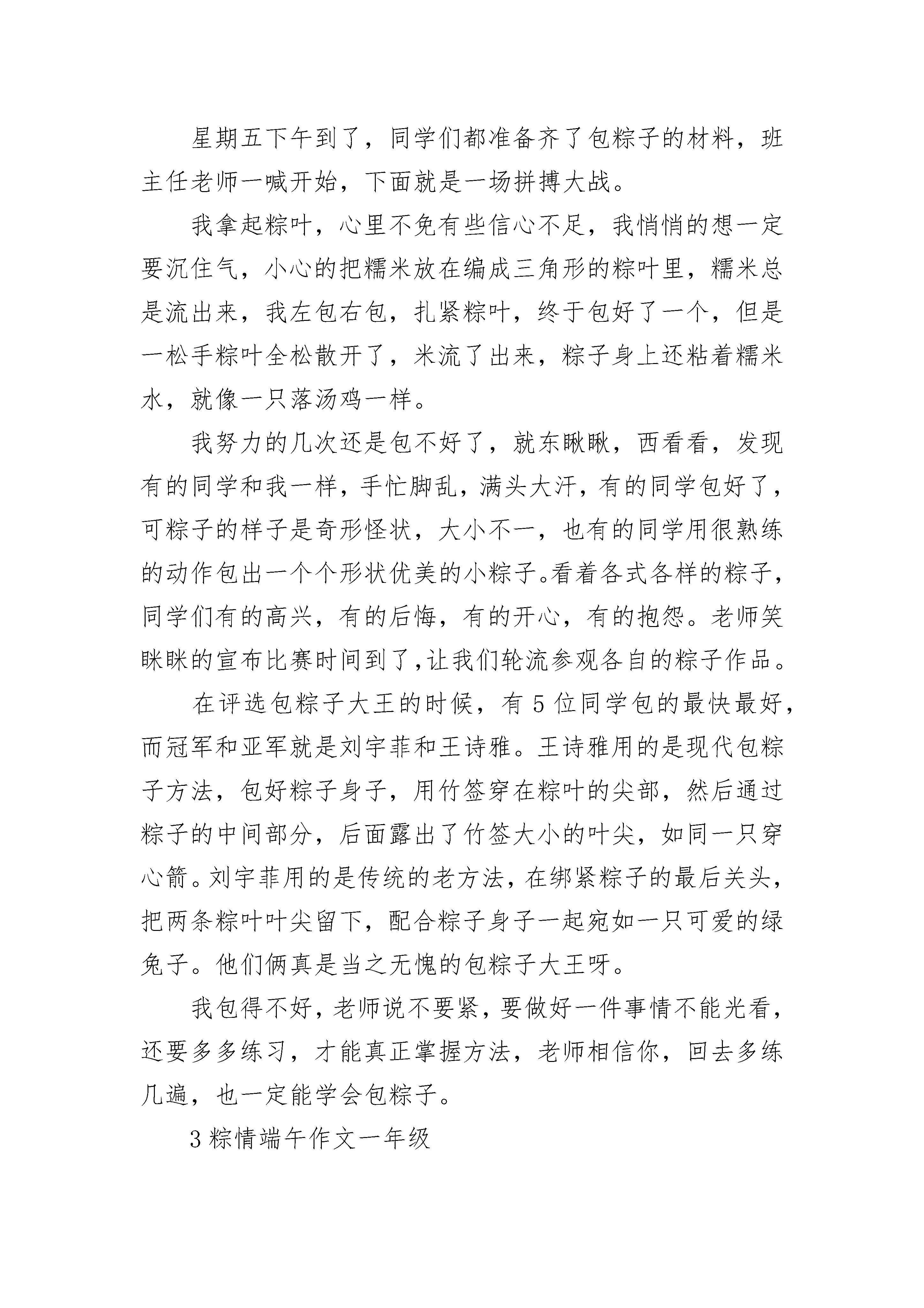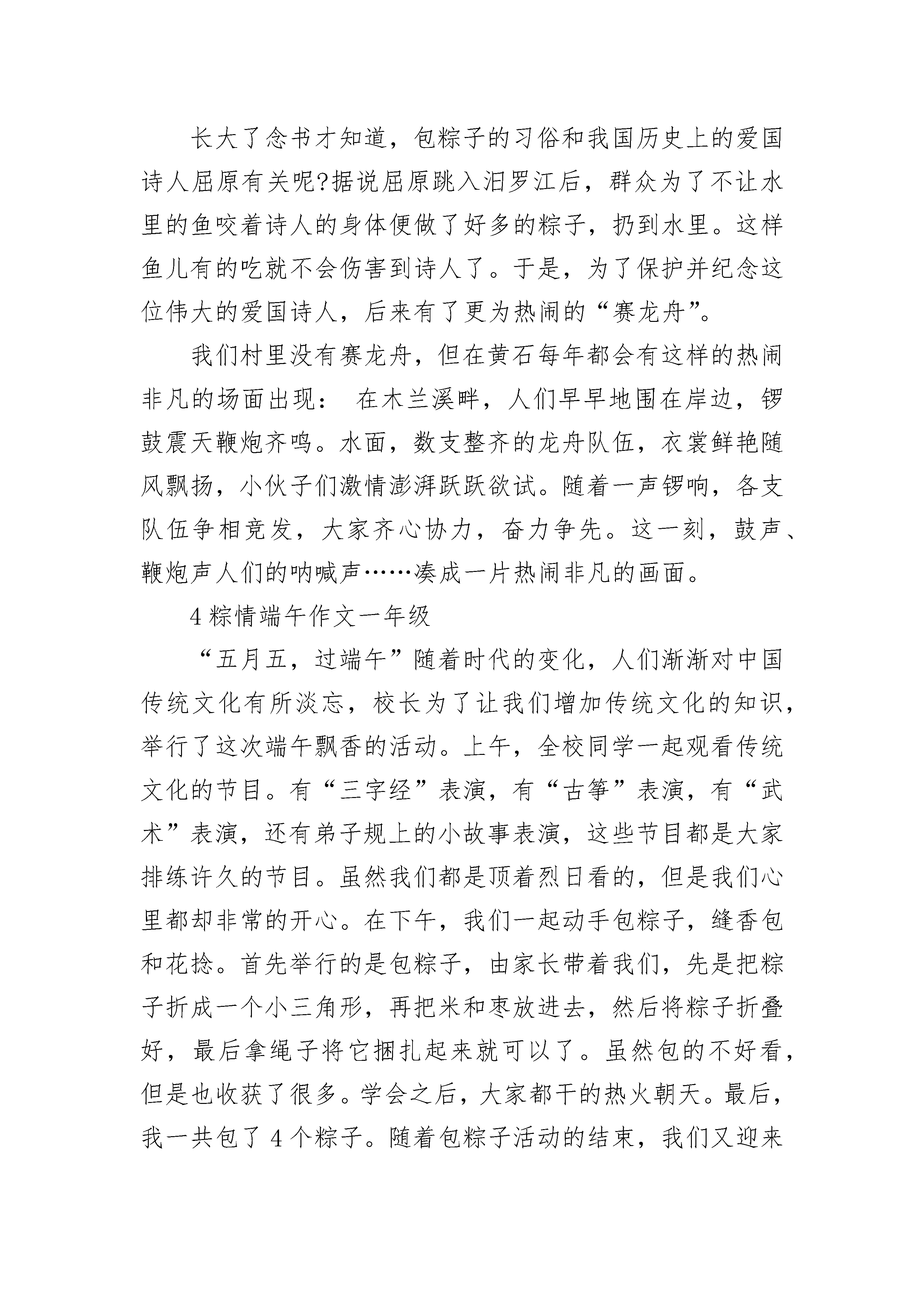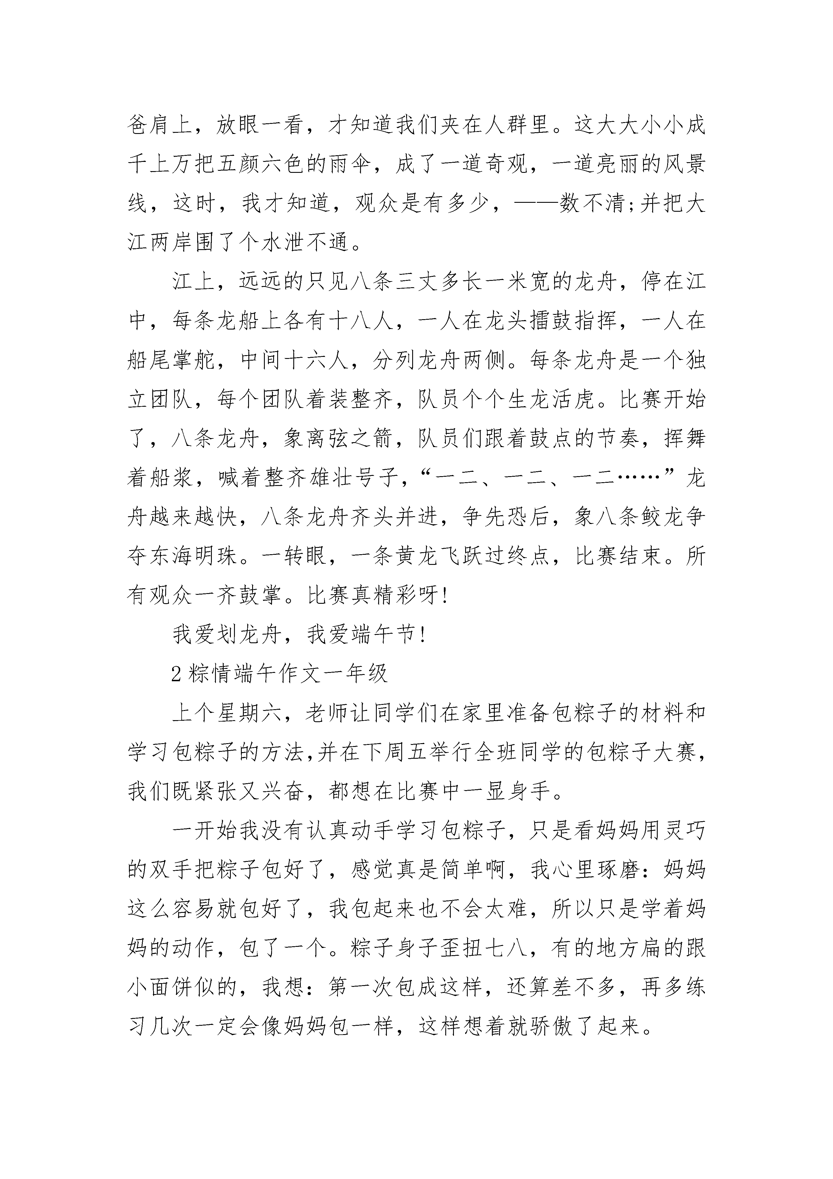 粽情端午作文一年级5篇1粽情端午作文一年级端午节是我国民间传统节日。听老辈讲,端午节的来历是这样的。传说,春秋战国时期,楚国有一位爱国功臣,叫做屈原。屈原不仅是重臣,还是有名的文学家、政治家、诗人。当时,七国鼎立,数秦国最强,也数秦国野心最大,要一统天下。当时楚国国君制国无道,防御不行,很容易被打败,自然成了首选。这一点,才思敏捷的屈原早察觉到了,便上书楚王,希望国君加强防御,不秦国的阴谋得逞,楚国国君不知良药苦口利于病,忠言逆耳利于行的道理,认为屈原瞧不起自己制国,把屈原调到汨罗去,屈原很伤心,很委屈,自己好言相劝国君加强防御,国君不但不听取意见,还当成恶意。终于,屈原忍不住了,在6月22日跳江自尽了。水火无情,屈原一下子被滔滔江水吞没了,百姓知道屈原是个好官,于是下江开船,纷纷抢救屈原,可这怎么捞的到?当时人们说水里有蛟龙,会吃了屈原的尸体,蛟龙吃饱了不吃尸体了。以后,百姓把屈原自尽的日子叫端午节,每年的这一天,人们要包粽子,划龙船,祭奠屈原。端午节是这样来的。记得小时侯,端午节,我随父母去外婆家,当时外婆家这里端午节比较昌盛,几乎每年要划龙船。今年也不例外。当时,我家大舅舅身强力壮,也参加了划龙船比赛。天下着小雨,我吃着黄澄澄香喷喷的糯米粽子,坐在老爸肩上,放眼一看,才知道我们夹在人群里。这大大小小成千上万把五颜六色的雨伞,成了一道奇观,一道亮丽的风景线,这时,我才知道,观众是有多少,——数不清;并把大江两岸围了个水泄不通。江上,远远的只见八条三丈多长一米宽的龙舟,停在江中,每条龙船上各有十八人,一人在龙头擂鼓指挥,一人在船尾掌舵,中间十六人,分列龙舟两侧。每条龙舟是一个独立团队,每个团队着装整齐,队员个个生龙活虎。比赛开始了,八条龙舟,象离弦之箭,队员们跟着鼓点的节奏,挥舞着船浆,喊着整齐雄壮号子,“一二、一二、一二……”龙舟越来越快,八条龙舟齐头并进,争先恐后,象八条鲛龙争夺东海明珠。一转眼,一条黄龙飞跃过终点,比赛结束。所有观众一齐鼓掌。比赛真精彩呀!我爱划龙舟,我爱端午节!2粽情端午作文一年级上个星期六,老师让同学们在家里准备包粽子的材料和学习包粽子的方法,并在下周五举行全班同学的包粽子大赛,我们既紧张又兴奋,都想在比赛中一显身手。一开始我没有认真动手学习包粽子,只是看妈妈用灵巧的双手把粽子包好了,感觉真是简单啊,我心里琢磨:妈妈这么容易就包好了,我包起来也不会太难,所以只是学着妈妈的动作,包了一个。粽子身子歪扭七八,有的地方扁的跟小面饼似的,我想:第一次包成这样,还算差不多,再多练习几次一定会像妈妈包一样,这样想着就骄傲了起来。星期五下午到了,同学们都准备齐了包粽子的材料,班主任老师一喊开始,下面就是一场拼搏大战。我拿起粽叶,心里不免有些信心不足,我悄悄的想一定要沉住气,小心的把糯米放在编成三角形的粽叶里,糯米总是流出来,我左包右包,扎紧粽叶,终于包好了一个,但是一松手粽叶全松散开了,米流了出来,粽子身上还粘着糯米水,就像一只落汤鸡一样。我努力的几次还是包不好了,就东瞅瞅,西看看,发现有的同学和我一样,手忙脚乱,满头大汗,有的同学包好了,可粽子的样子是奇形怪状,大小不一,也有的同学用很熟练的动作包出一个个形状优美的小粽子。看着各式各样的粽子,同学们有的高兴,有的后悔,有的开心,有的抱怨。老师笑眯眯的宣布比赛时间到了,让我们轮流参观各自的粽子作品。在评选包粽子大王的时候,有5位同学包的最快最好,而冠军和亚军就是刘宇菲和王诗雅。王诗雅用的是现代包粽子方法,包好粽子身子,用竹签穿在粽叶的尖部,然后通过粽子的中间部分,后面露出了竹签大小的叶尖,如同一只穿心箭。刘宇菲用的是传统的老方法,在绑紧粽子的最后关头,把两条粽叶叶尖留下,配合粽子身子一起宛如一只可爱的绿兔子。他们俩真是当之无愧的包粽子大王呀。我包得不好,老师说不要紧,要做好一件事情不能光看,还要多多练习,才能真正掌握方法,老师相信你,回去多练几遍,也一定能学会包粽子。3粽情端午作文一年级一年一度的端午节又至,所谓年年岁岁花相似,岁岁年年人不同。今年端午节正值上海世博会举办,又逢高考结束、南非世界杯开赛。所以可以说,今年的端午节较之往年是更加的出彩和好玩。农历五月初五是端午节。两千多年来,端午节一直是一个多民族的全民健身、防疫祛病、避瘟驱毒、祈求健康的民俗佳节。端午节又名端阳节、重午节,据传是中国古代伟大诗人、世界四大文化名人之一的屈原投汩罗江殉国的日子。两千多年来,每年的农历五月初五就成为了纪念屈原的传统节日。史料记载,公元前278年农历五月初五,楚国大夫、爱国诗人屈原听到秦军攻破楚国都城的消息后,悲愤交加,心如刀割,毅然写下绝笔作《怀沙》,抱石投入汨罗江,以身殉国。沿江百姓纷纷引舟竞渡前去打捞,沿水招魂,并将粽子投入江中,以免鱼虾蚕食他的身体。这一习俗绵延至