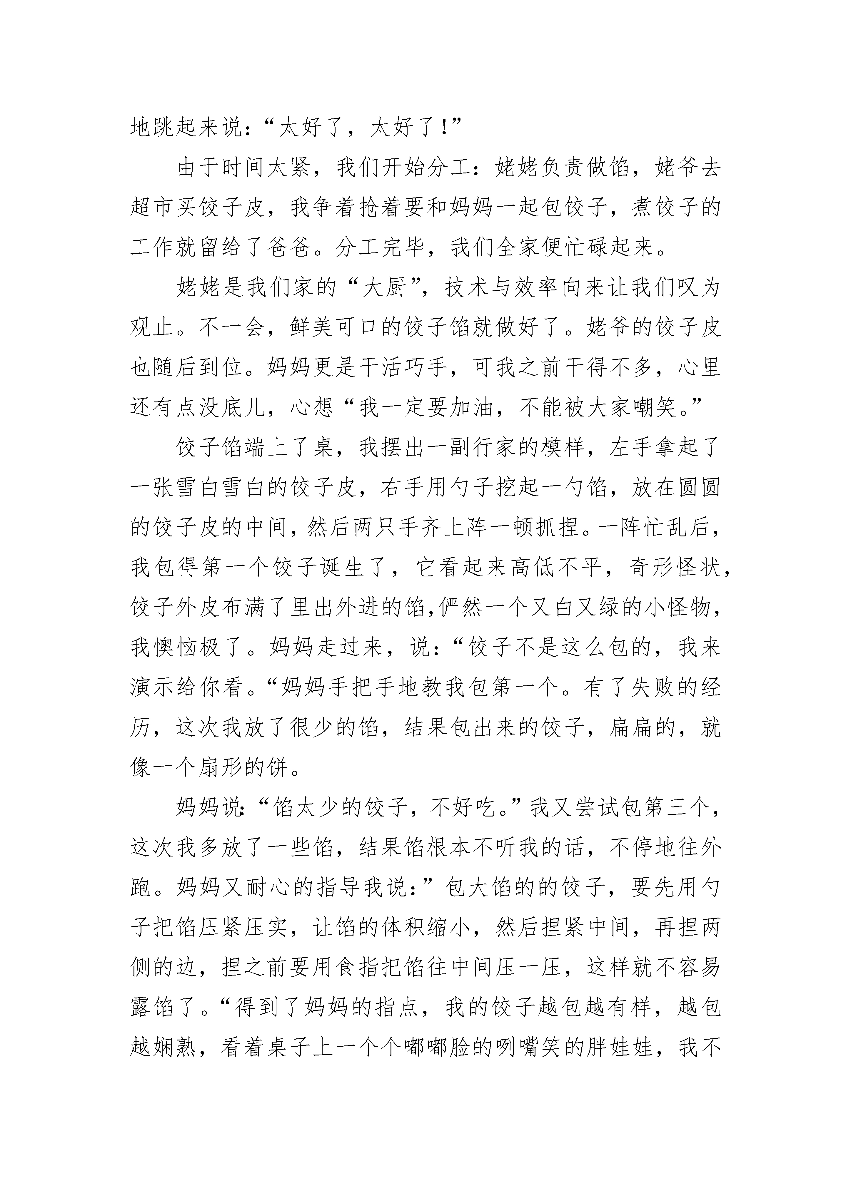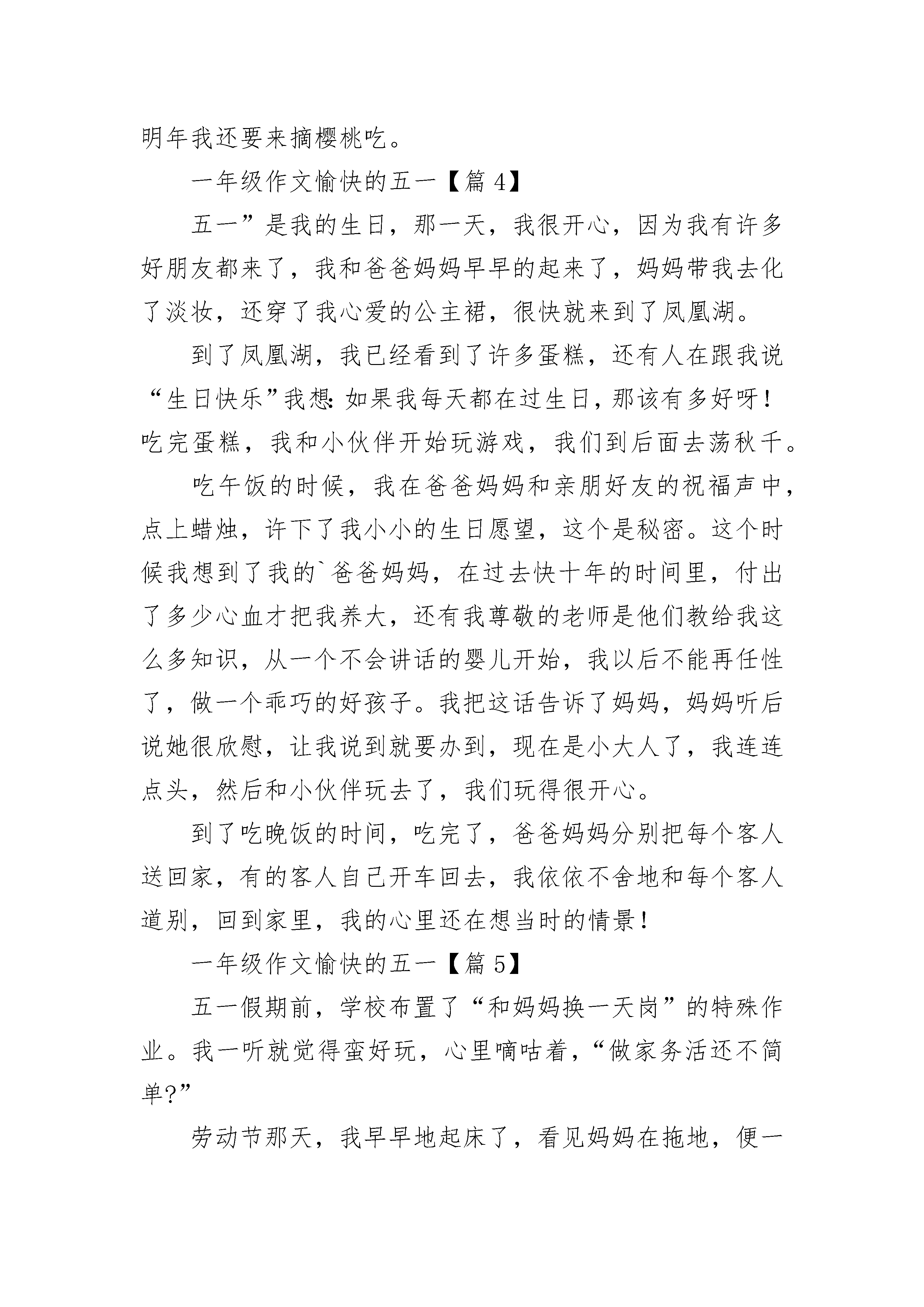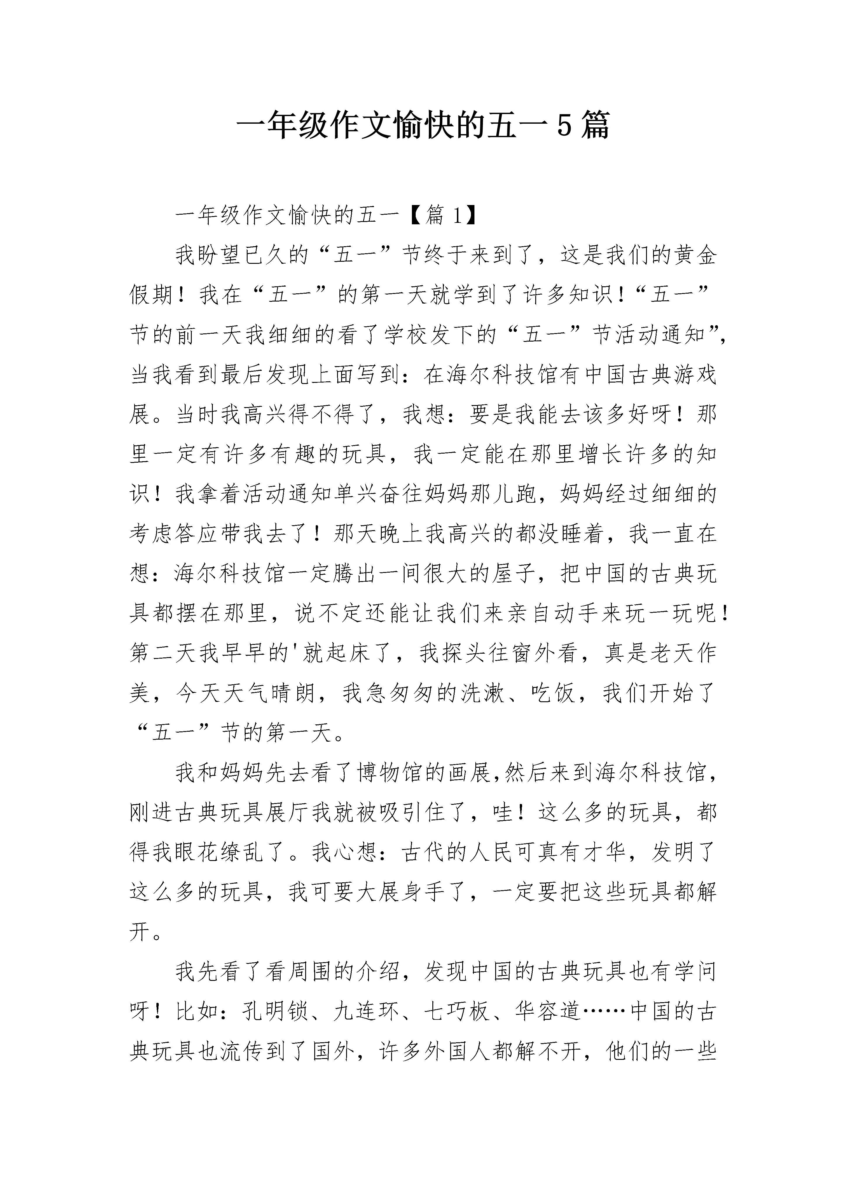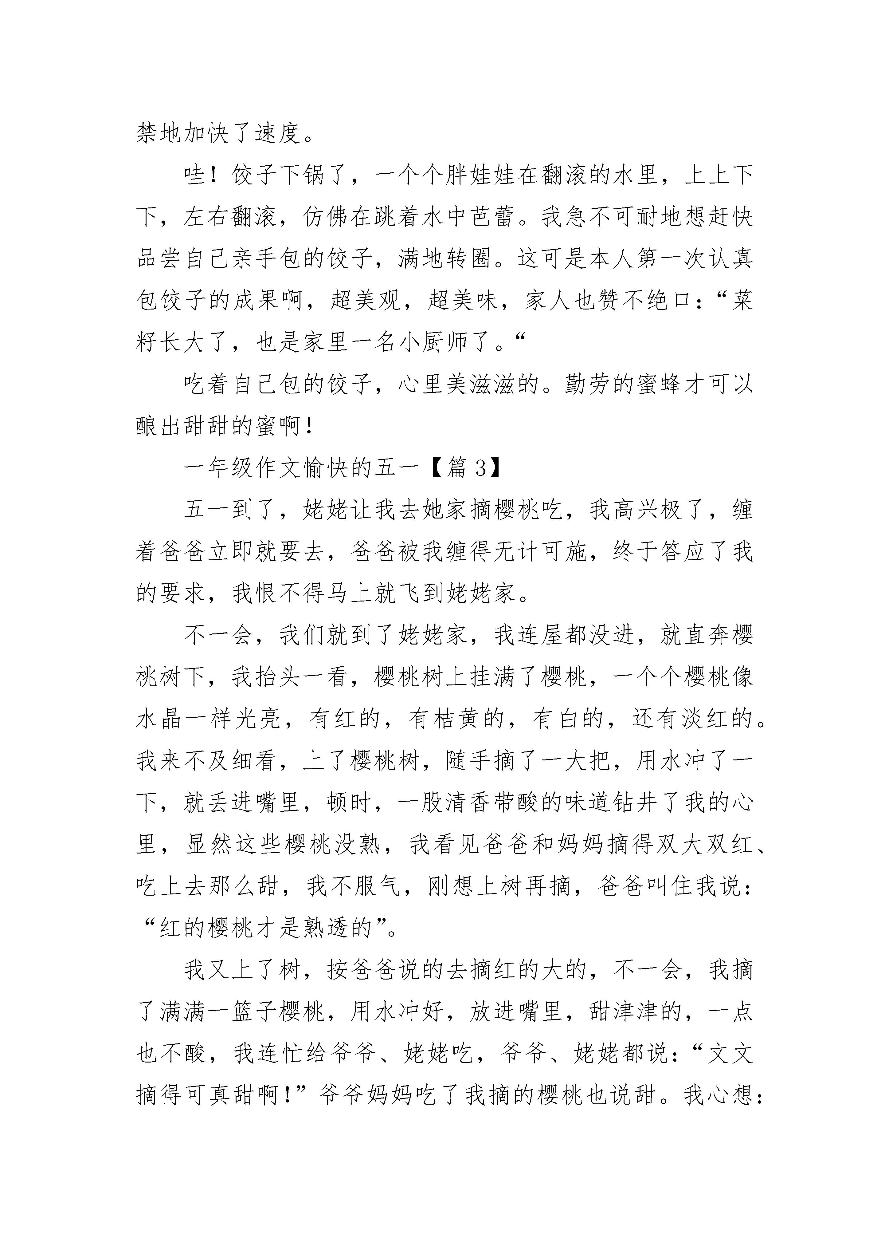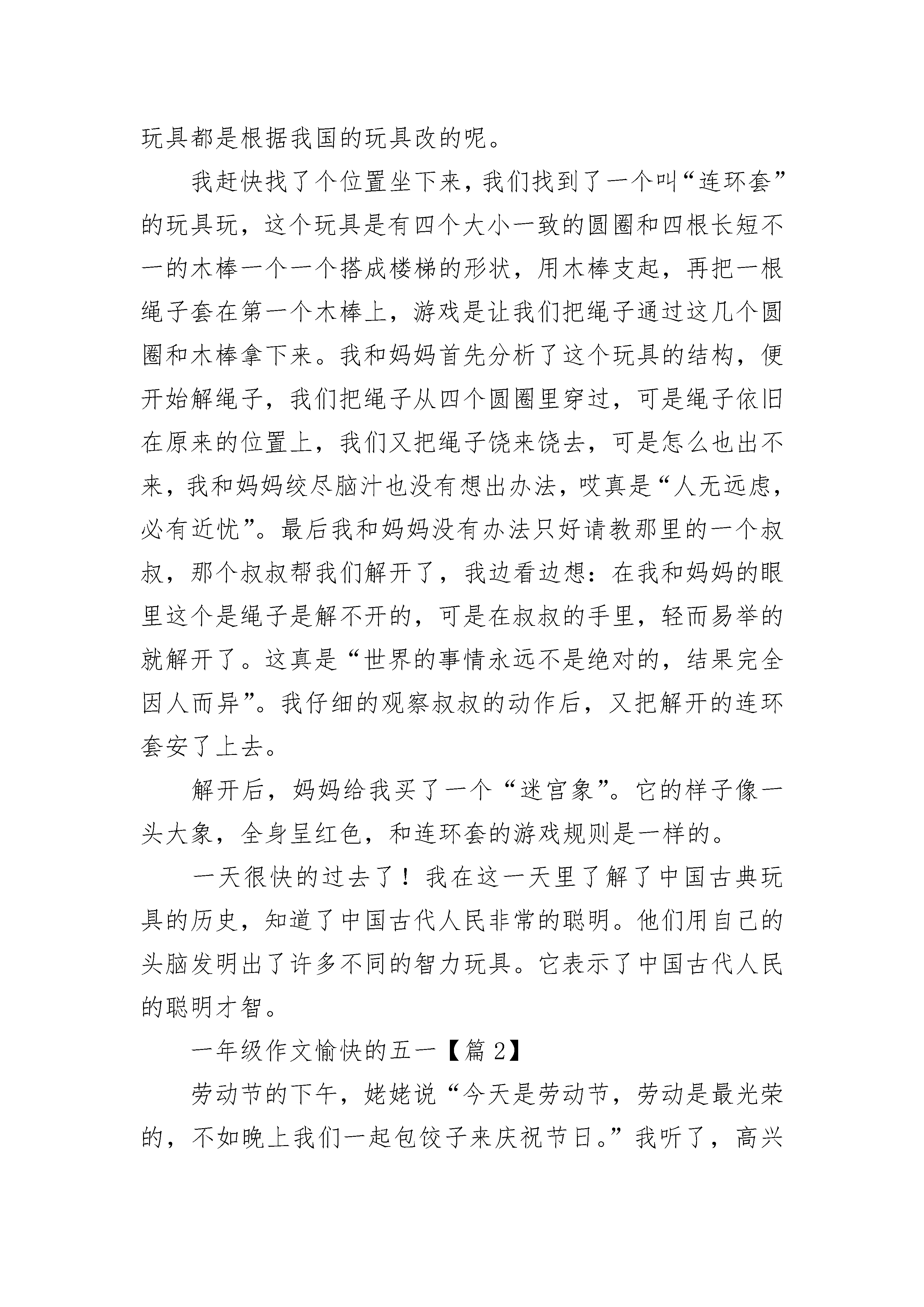一年级作文愉快的五一5篇一年级作文愉快的五一【篇1】我盼望已久的“五一”节终于来到了,这是我们的黄金假期!我在“五一”的第一天就学到了许多知识!“五一”节的前一天我细细的看了学校发下的“五一”节活动通知”,当我看到最后发现上面写到:在海尔科技馆有中国古典游戏展。当时我高兴得不得了,我想:要是我能去该多好呀!那里一定有许多有趣的玩具,我一定能在那里增长许多的知识!我拿着活动通知单兴奋往妈妈那儿跑,妈妈经过细细的考虑答应带我去了!那天晚上我高兴的都没睡着,我一直在想:海尔科技馆一定腾出一间很大的屋子,把中国的古典玩具都摆在那里,说不定还能让我们来亲自动手来玩一玩呢!第二天我早早的'就起床了,我探头往窗外看,真是老天作美,今天天气晴朗,我急匆匆的洗漱、吃饭,我们开始了“五一”节的第一天。我和妈妈先去看了博物馆的画展,然后来到海尔科技馆,刚进古典玩具展厅我就被吸引住了,哇!这么多的玩具,都得我眼花缭乱了。我心想:古代的人民可真有才华,发明了这么多的玩具,我可要大展身手了,一定要把这些玩具都解开。我先看了看周围的介绍,发现中国的古典玩具也有学问呀!比如:孔明锁、九连环、七巧板、华容道……中国的古典玩具也流传到了国外,许多外国人都解不开,他们的一些玩具都是根据我国的玩具改的呢。我赶快找了个位置坐下来,我们找到了一个叫“连环套”的玩具玩,这个玩具是有四个大小一致的圆圈和四根长短不一的木棒一个一个搭成楼梯的形状,用木棒支起,再把一根绳子套在第一个木棒上,游戏是让我们把绳子通过这几个圆圈和木棒拿下来。我和妈妈首先分析了这个玩具的结构,便开始解绳子,我们把绳子从四个圆圈里穿过,可是绳子依旧在原来的位置上,我们又把绳子饶来饶去,可是怎么也出不来,我和妈妈绞尽脑汁也没有想出办法,哎真是“人无远虑,必有近忧”。最后我和妈妈没有办法只好请教那里的一个叔叔,那个叔叔帮我们解开了,我边看边想:在我和妈妈的眼里这个是绳子是解不开的,可是在叔叔的手里,轻而易举的就解开了。这真是“世界的事情永远不是绝对的,结果完全因人而异”。我仔细的观察叔叔的动作后,又把解开的连环套安了上去。解开后,妈妈给我买了一个“迷宫象”。它的样子像一头大象,全身呈红色,和连环套的游戏规则是一样的。一天很快的过去了!我在这一天里了解了中国古典玩具的历史,知道了中国古代人民非常的聪明。他们用自己的头脑发明出了许多不同的智力玩具。它表示了中国古代人民的聪明才智。一年级作文愉快的五一【篇2】劳动节的下午,姥姥说“今天是劳动节,劳动是最光荣的,不如晚上我们一起包饺子来庆祝节日。”我听了,高兴地跳起来说:“太好了,太好了!”由于时间太紧,我们开始分工:姥姥负责做馅,姥爷去超市买饺子皮,我争着抢着要和妈妈一起包饺子,煮饺子的工作就留给了爸爸。分工完毕,我们全家便忙碌起来。姥姥是我们家的“大厨”,技术与效率向来让我们叹为观止。不一会,鲜美可口的饺子馅就做好了。姥爷的饺子皮也随后到位。妈妈更是干活巧手,可我之前干得不多,心里还有点没底儿,心想“我一定要加油,不能被大家嘲笑。”饺子馅端上了桌,我摆出一副行家的模样,左手拿起了一张雪白雪白的饺子皮,右手用勺子挖起一勺馅,放在圆圆的饺子皮的中间,然后两只手齐上阵一顿抓捏。一阵忙乱后,我包得第一个饺子诞生了,它看起来高低不平,奇形怪状,饺子外皮布满了里出外进的馅,俨然一个又白又绿的小怪物,我懊恼极了。妈妈走过来,说:“饺子不是这么包的,我来演示给你看。“妈妈手把手地教我包第一个。有了失败的经历,这次我放了很少的馅,结果包出来的饺子,扁扁的,就像一个扇形的饼。妈妈说:“馅太少的饺子,不好吃。”我又尝试包第三个,这次我多放了一些馅,结果馅根本不听我的话,不停地往外跑。妈妈又耐心的指导我说:”包大馅的的饺子,要先用勺子把馅压紧压实,让馅的体积缩小,然后捏紧中间,再捏两侧的边,捏之前要用食指把馅往中间压一压,这样就不容易露馅了。“得到了妈妈的指点,我的饺子越包越有样,越包越娴熟,看着桌子上一个个嘟嘟脸的咧嘴笑的胖娃娃,我不禁地加快了速度。哇!饺子下锅了,一个个胖娃娃在翻滚的水里,上上下下,左右翻滚,仿佛在跳着水中芭蕾。我急不可耐地想赶快品尝自己亲手包的饺子,满地转圈。这可是本人第一次认真包饺子的成果啊,超美观,超美味,家人也赞不绝口:“菜籽长大了,也是家里一名小厨师了。“吃着自己包的饺子,心里美滋滋的。勤劳的蜜蜂才可以酿出甜甜的蜜啊!一年级作文愉快的五一【篇3】五一到了,姥姥让我去她家摘樱桃吃,我高兴极了,缠着爸爸立即就要去,爸爸被我缠得无计可施,终于答应了我的要求,我恨不得马上就飞到姥姥家。不一会,我们就到了姥姥家,我连屋都没进,就直奔樱桃树下,我抬头一看,樱桃树上挂满了樱桃,一个个樱桃像水晶一样光亮,有红的,有桔黄的,有白的,还有淡红的。我来不及细看,上了樱桃树,随