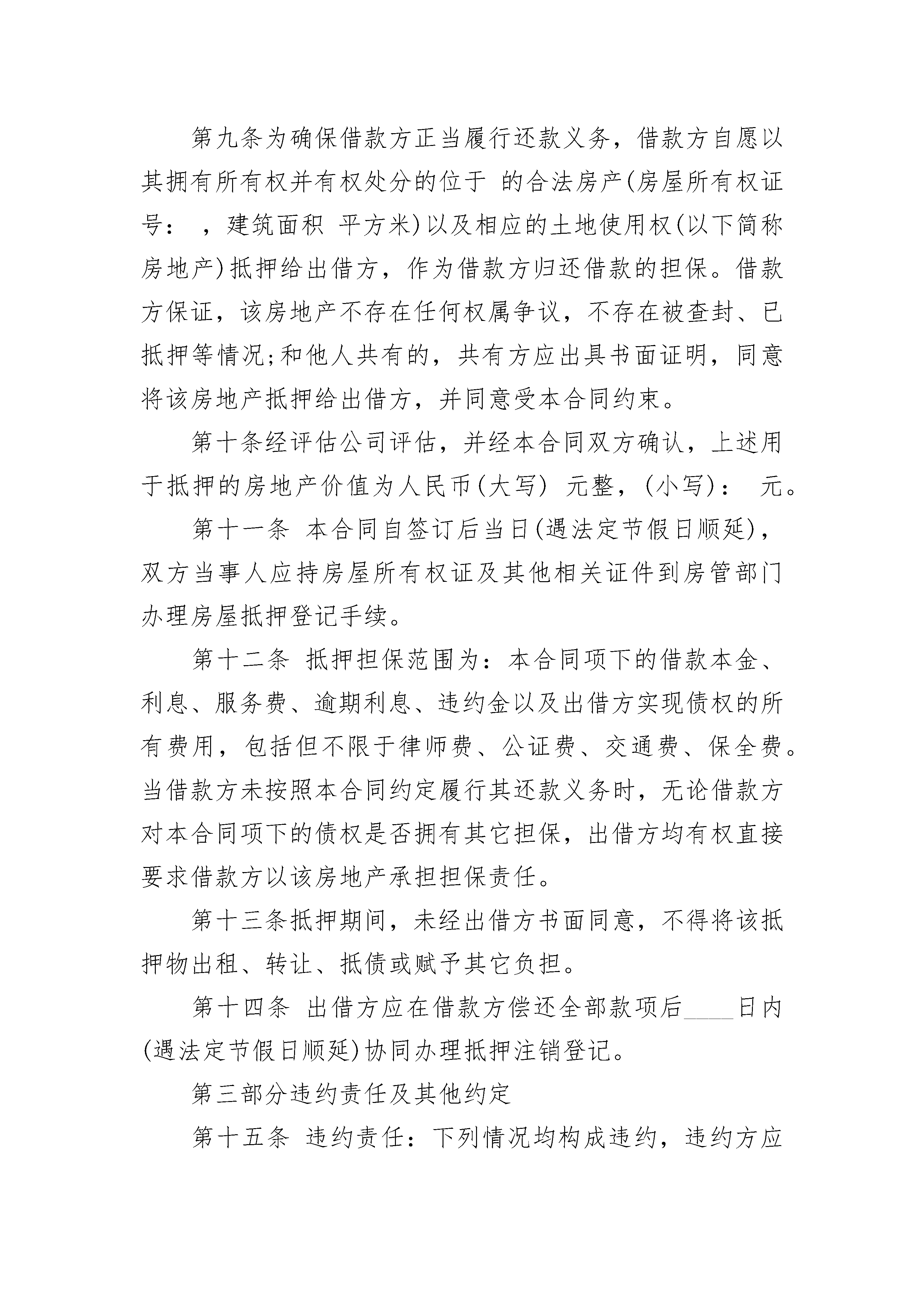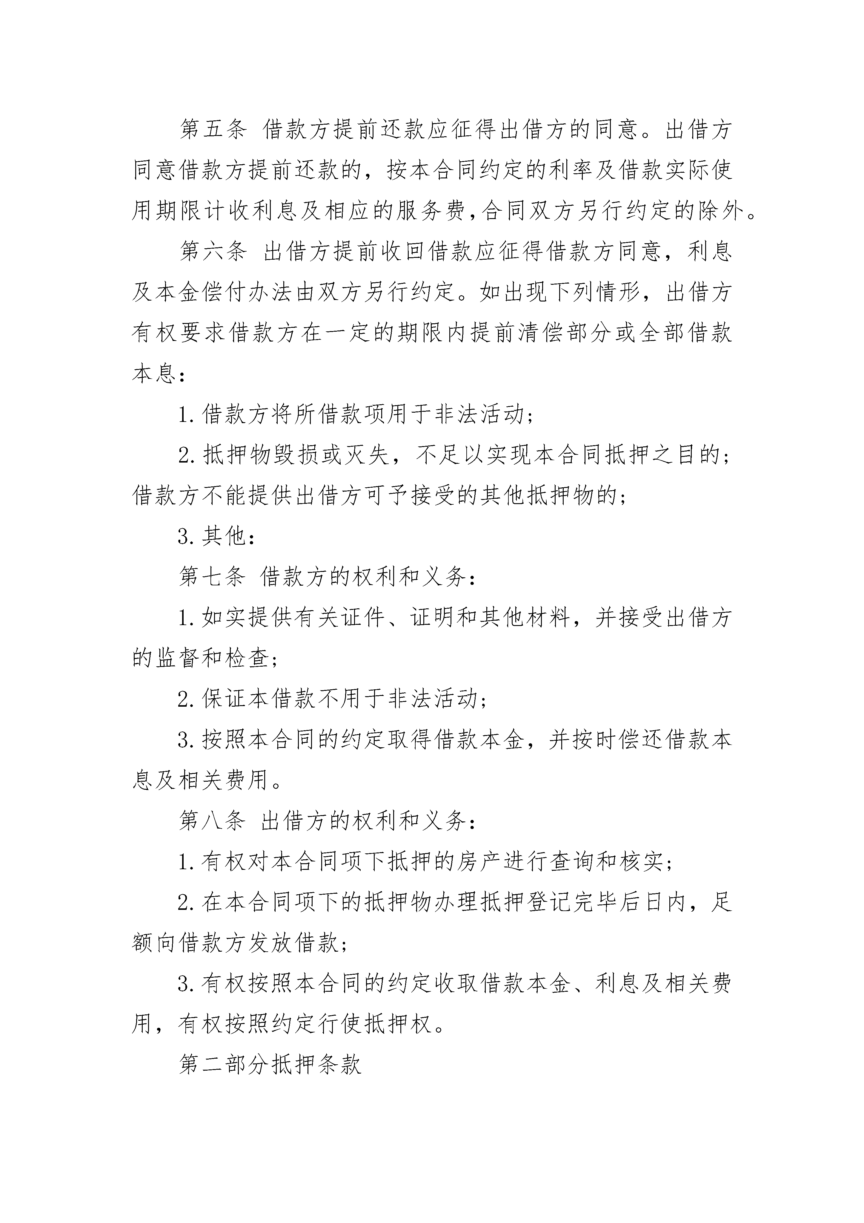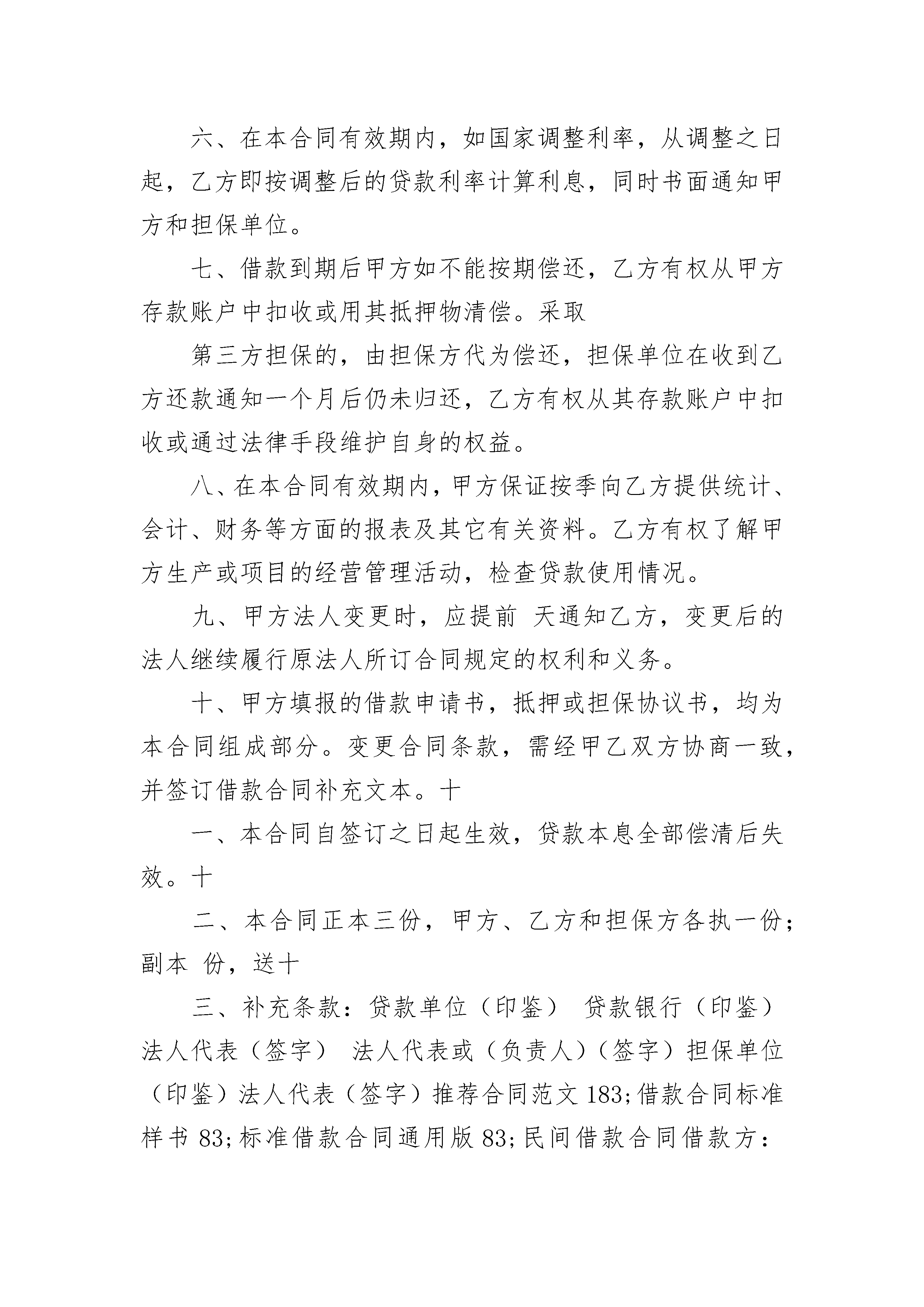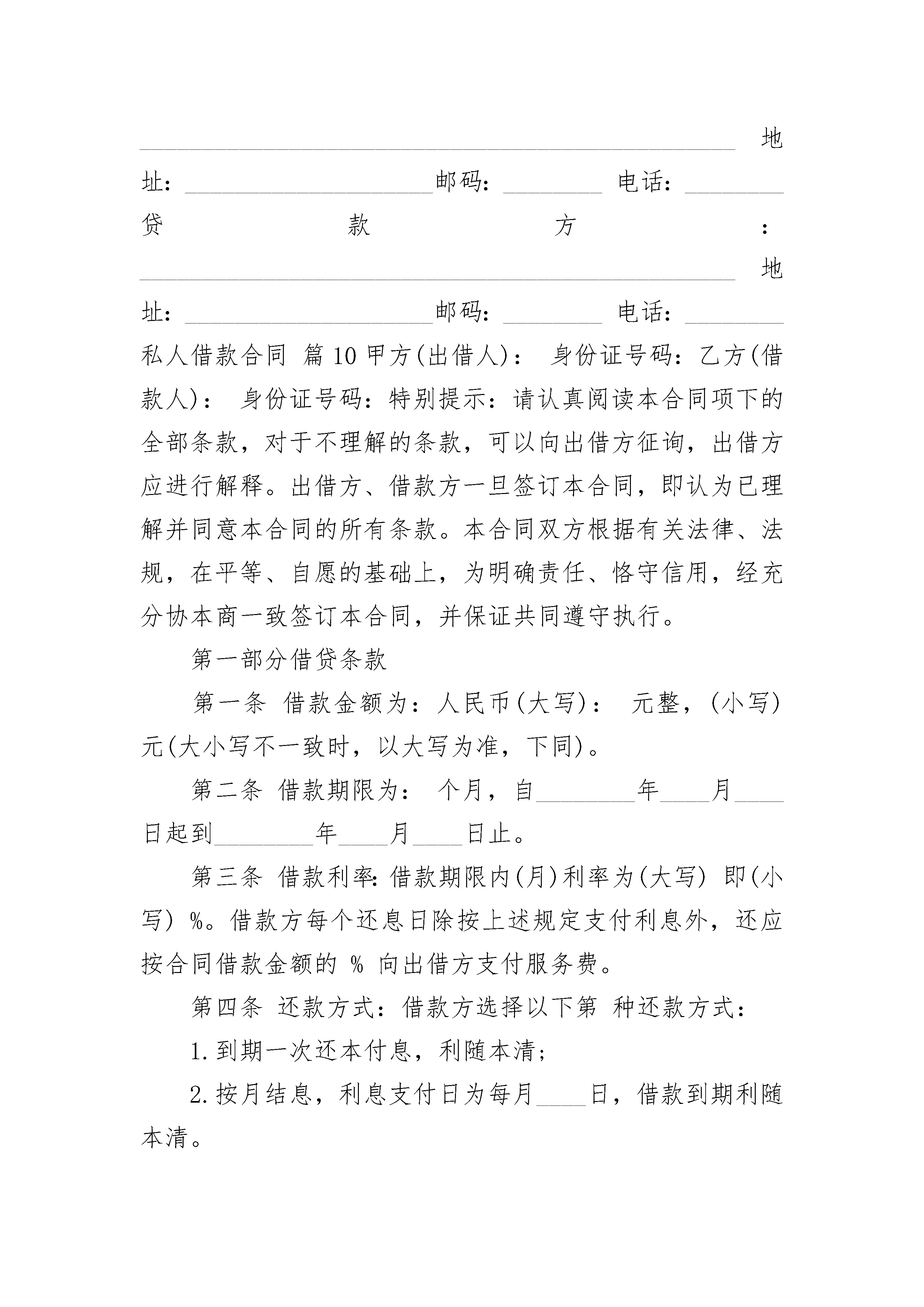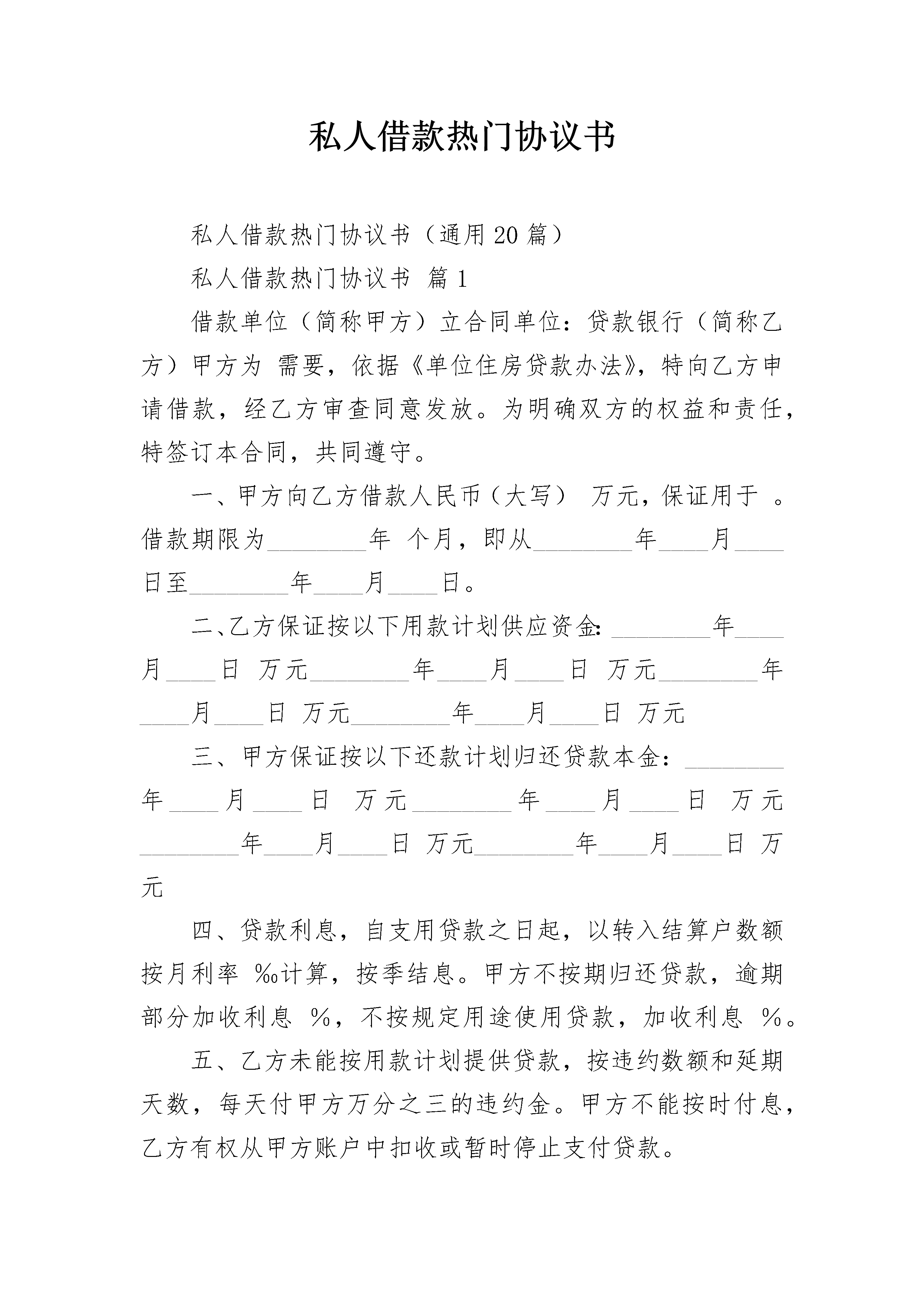 私人借款热门协议书私人借款热门协议书(通用20篇)私人借款热门协议书篇1借款单位(简称甲方)立合同单位:贷款银行(简称乙方)甲方为需要,依据《单位住房贷款办法》,特向乙方申请借款,经乙方审查同意发放。为明确双方的权益和责任,特签订本合同,共同遵守。一、甲方向乙方借款人民币(大写)万元,保证用于。借款期限为________年个月,即从________年____月____日至________年____月____日。二、乙方保证按以下用款计划供应资金:________年____月____日万元________年____月____日万元________年____月____日万元________年____月____日万元三、甲方保证按以下还款计划归还贷款本金:________年____月____日万元________年____月____日万元________年____月____日万元________年____月____日万元四、贷款利息,自支用贷款之日起,以转入结算户数额按月利率‰计算,按季结息。甲方不按期归还贷款,逾期部分加收利息%,不按规定用途使用贷款,加收利息%。五、乙方未能按用款计划提供贷款,按违约数额和延期天数,每天付甲方万分之三的违约金。甲方不能按时付息,乙方有权从甲方账户中扣收或暂时停止支付贷款。六、在本合同有效期内,如国家调整利率,从调整之日起,乙方即按调整后的贷款利率计算利息,同时书面通知甲方和担保单位。七、借款到期后甲方如不能按期偿还,乙方有权从甲方存款账户中扣收或用其抵押物清偿。采取第三方担保的,由担保方代为偿还,担保单位在收到乙方还款通知一个月后仍未归还,乙方有权从其存款账户中扣收或通过法律手段维护自身的权益。八、在本合同有效期内,甲方保证按季向乙方提供统计、会计、财务等方面的报表及其它有关资料。乙方有权了解甲方生产或项目的经营管理活动,检查贷款使用情况。九、甲方法人变更时,应提前天通知乙方,变更后的法人继续履行原法人所订合同规定的权利和义务。十、甲方填报的借款申请书,抵押或担保协议书,均为本合同组成部分。变更合同条款,需经甲乙双方协商一致,并签订借款合同补充文本。十一、本合同自签订之日起生效,贷款本息全部偿清后失效。十二、本合同正本三份,甲方、乙方和担保方各执一份;副本份,送十三、补充条款:贷款单位(印鉴)贷款银行(印鉴)法人代表(签字)法人代表或(负责人)(签字)担保单位(印鉴)法人代表(签字)推荐合同范文183;借款合同标准样书83;标准借款合同通用版83;民间借款合同借款方:________________________________________________地址:____________________邮码:________电话:________贷款方:________________________________________________地址:____________________邮码:________电话:________私人借款合同篇10甲方(出借人):身份证号码:乙方(借款人):身份证号码:特别提示:请认真阅读本合同项下的全部条款,对于不理解的条款,可以向出借方征询,出借方应进行解释。出借方、借款方一旦签订本合同,即认为已理解并同意本合同的所有条款。本合同双方根据有关法律、法规,在平等、自愿的基础上,为明确责任、恪守信用,经充分协本商一致签订本合同,并保证共同遵守执行。第一部分借贷条款第一条借款金额为:人民币(大写):元整,(小写)元(大小写不一致时,以大写为准,下同)。第二条借款期限为:个月,自________年____月____日起到________年____月____日止。第三条借款利率:借款期限内(月)利率为(大写)即(小写)%。借款方每个还息日除按上述规定支付利息外,还应按合同借款金额的%向出借方支付服务费。第四条还款方式:借款方选择以下第种还款方式:1.到期一次还本付息,利随本清;2.按月结息,利息支付日为每月____日,借款到期利随本清。第五条借款方提前还款应征得出借方的同意。出借方同意借款方提前还款的,按本合同约定的利率及借款实际使用期限计收利息及相应的服务费,合同双方另行约定的除外。第六条出借方提前收回借款应征得借款方同意,利息及本金偿付办法由双方另行约定。如出现下列情形,出借方有权要求借款方在一定的期限内提前清偿部分或全部借款本息:1.借款方将所借款项用于非法活动;2.抵押物毁损或灭失,不足以实现本合同抵押之目的;借款方不能提供出借方可予接受的其他抵押物的;3.其他:第七条借款方的权利和义务:1.如实提供有关证件、证明和其他材料,并接受出借方的监督和检查;2.保证本借款不用于非法活动;3.按照本合同的约定取得借款本金,并按时偿还借款本息及相关费用。第八