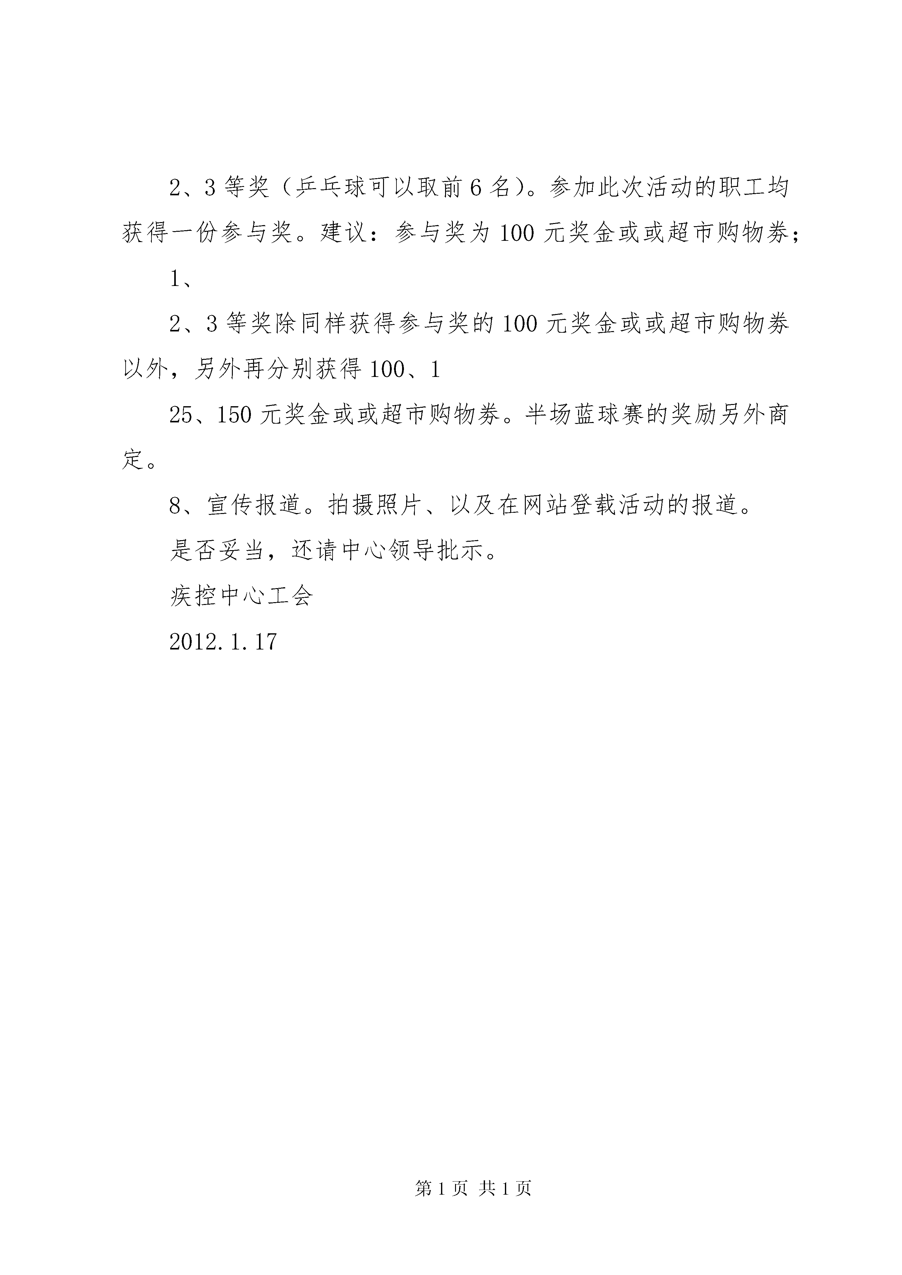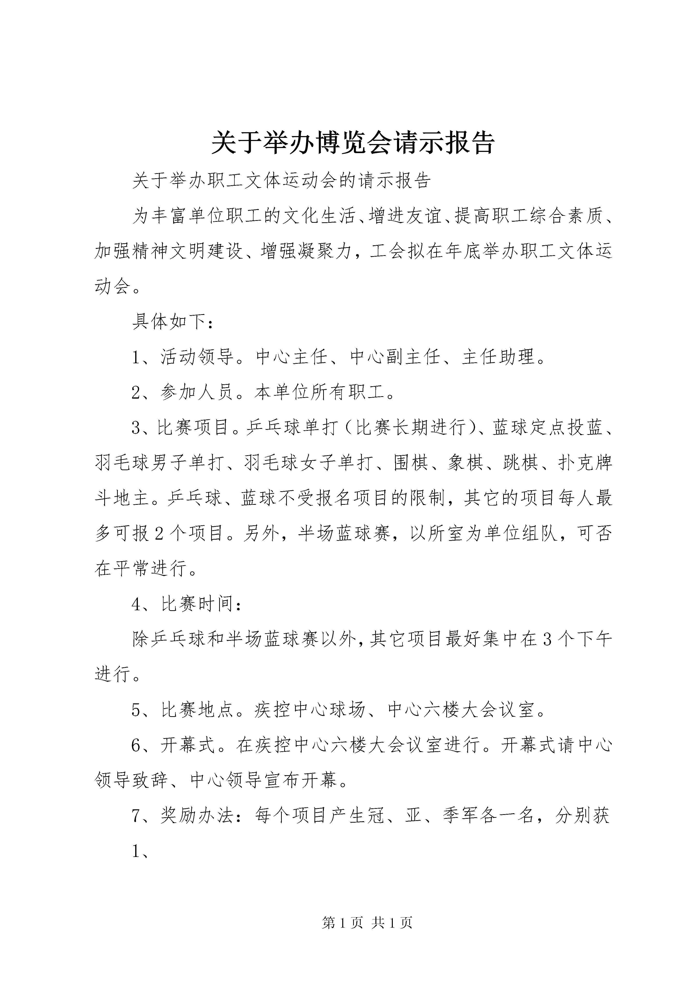 关于举办博览会请示报告关于举办职工文体运动会的请示报告为丰富单位职工的文化生活、增进友谊、提高职工综合素质、加强精神文明建设、增强凝聚力,工会拟在年底举办职工文体运动会。具体如下:1、活动领导。中心主任、中心副主任、主任助理。2、参加人员。本单位所有职工。3、比赛项目。乒乓球单打(比赛长期进行)、蓝球定点投蓝、羽毛球男子单打、羽毛球女子单打、围棋、象棋、跳棋、扑克牌斗地主。乒乓球、蓝球不受报名项目的限制,其它的项目每人最多可报2个项目。另外,半场蓝球赛,以所室为单位组队,可否在平常进行。4、比赛时间:除乒乓球和半场蓝球赛以外,其它项目最好集中在3个下午进行。5、比赛地点。疾控中心球场、中心六楼大会议室。6、开幕式。在疾控中心六楼大会议室进行。开幕式请中心领导致辞、中心领导宣布开幕。7、奖励办法:每个项目产生冠、亚、季军各一名,分别获1、2、3等奖(乒乓球可以取前6名)。参加此次活动的职工均获得一份参与奖。建议:参与奖为100元奖金或或超市购物劵;1、2、3等奖除同样获得参与奖的100元奖金或或超市购物劵以外,另外再分别获得100、125、150元奖金或或超市购物劵。半场蓝球赛的奖励另外商定。8、宣传报道。拍摄照片、以及在网站登载活动的报道。是否妥当,还请中心领导批示。疾控中心工会2012.1.17