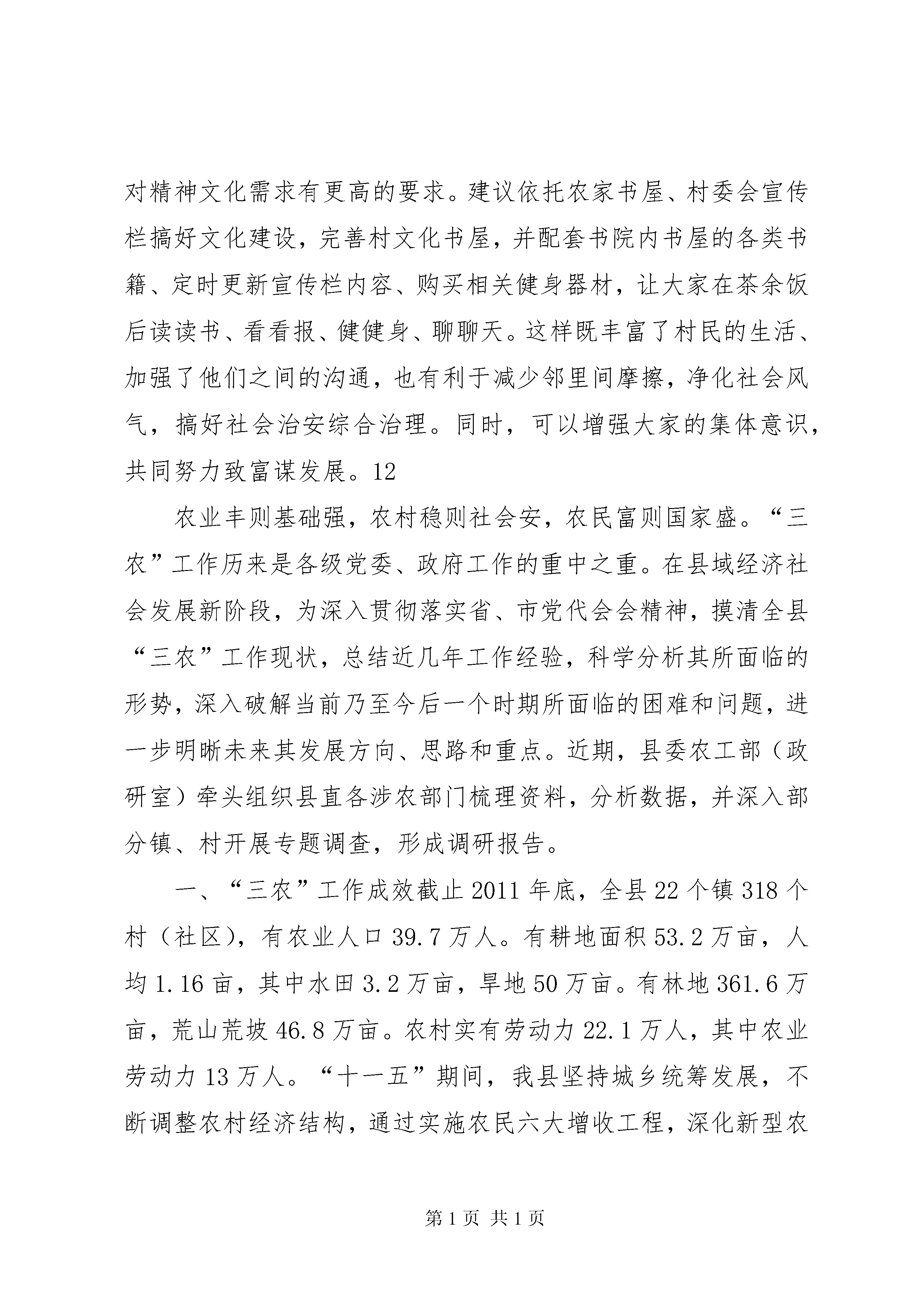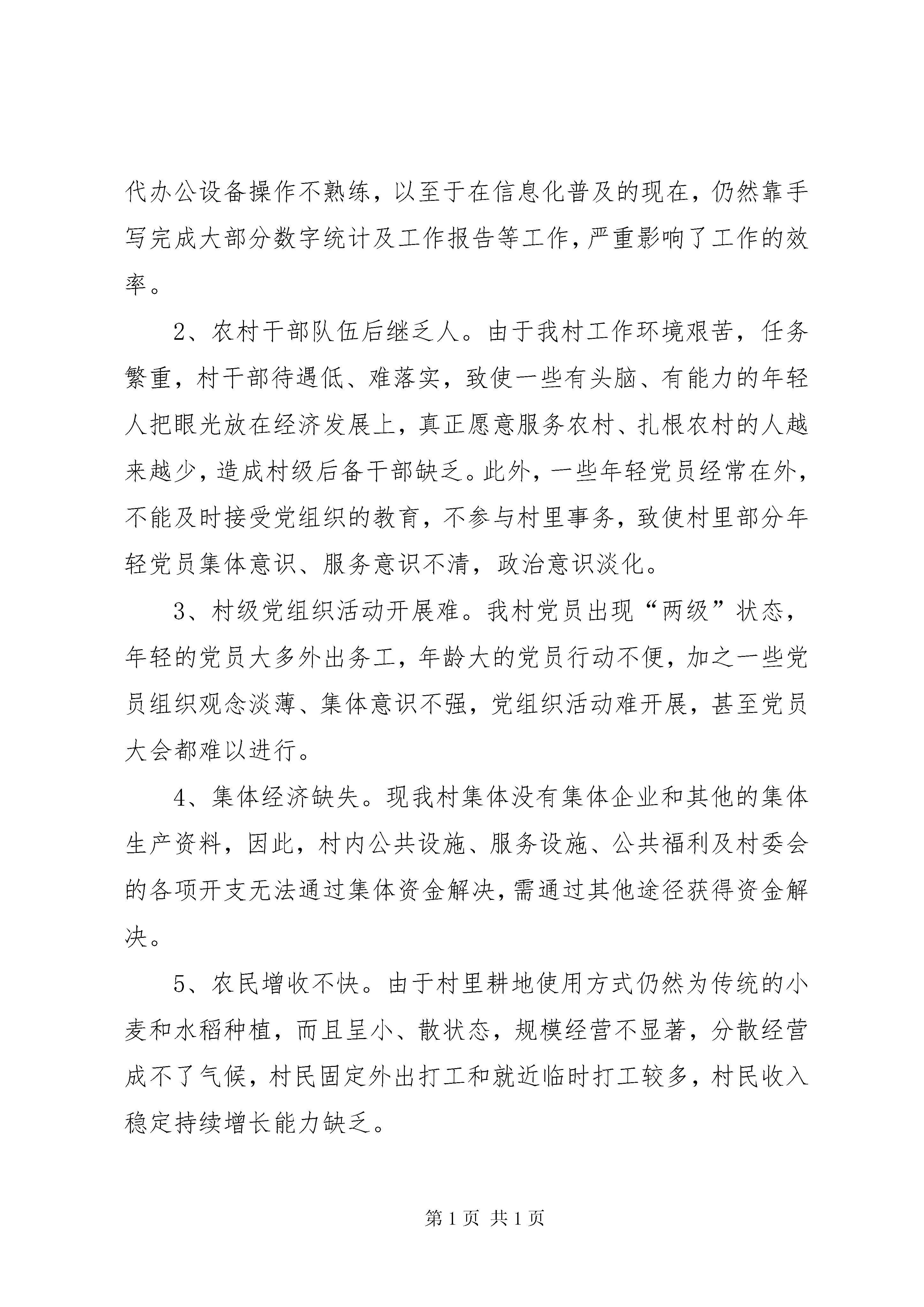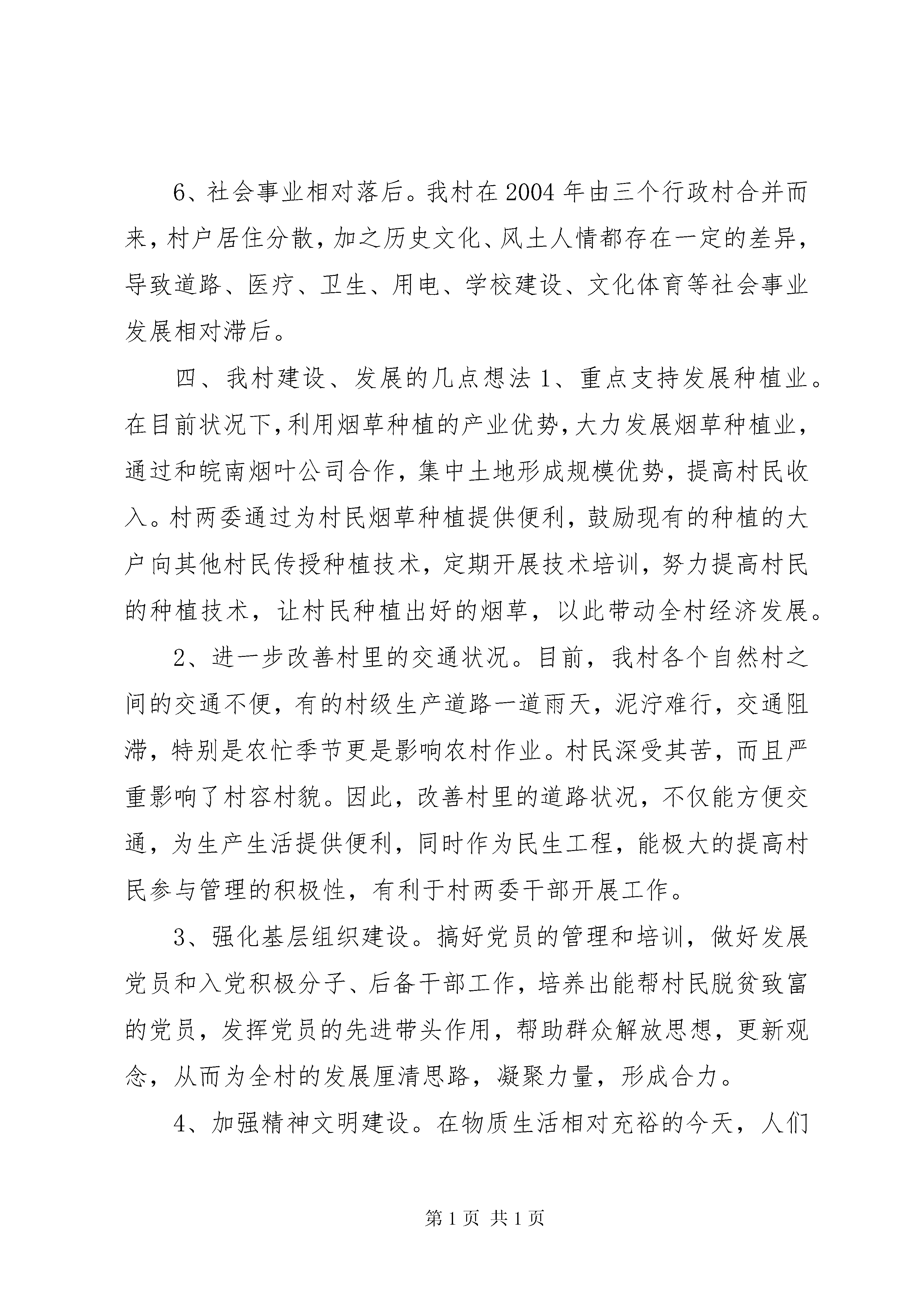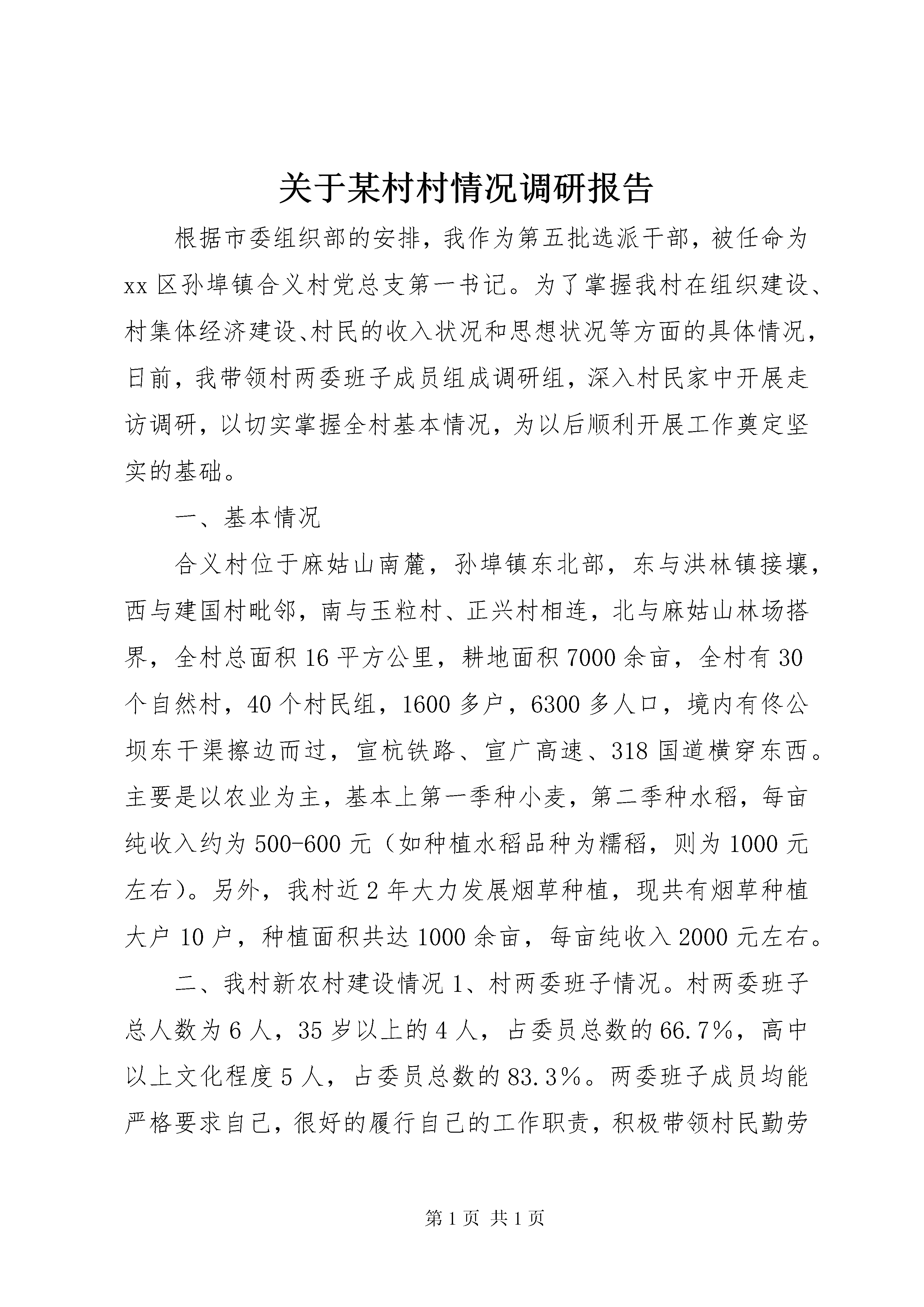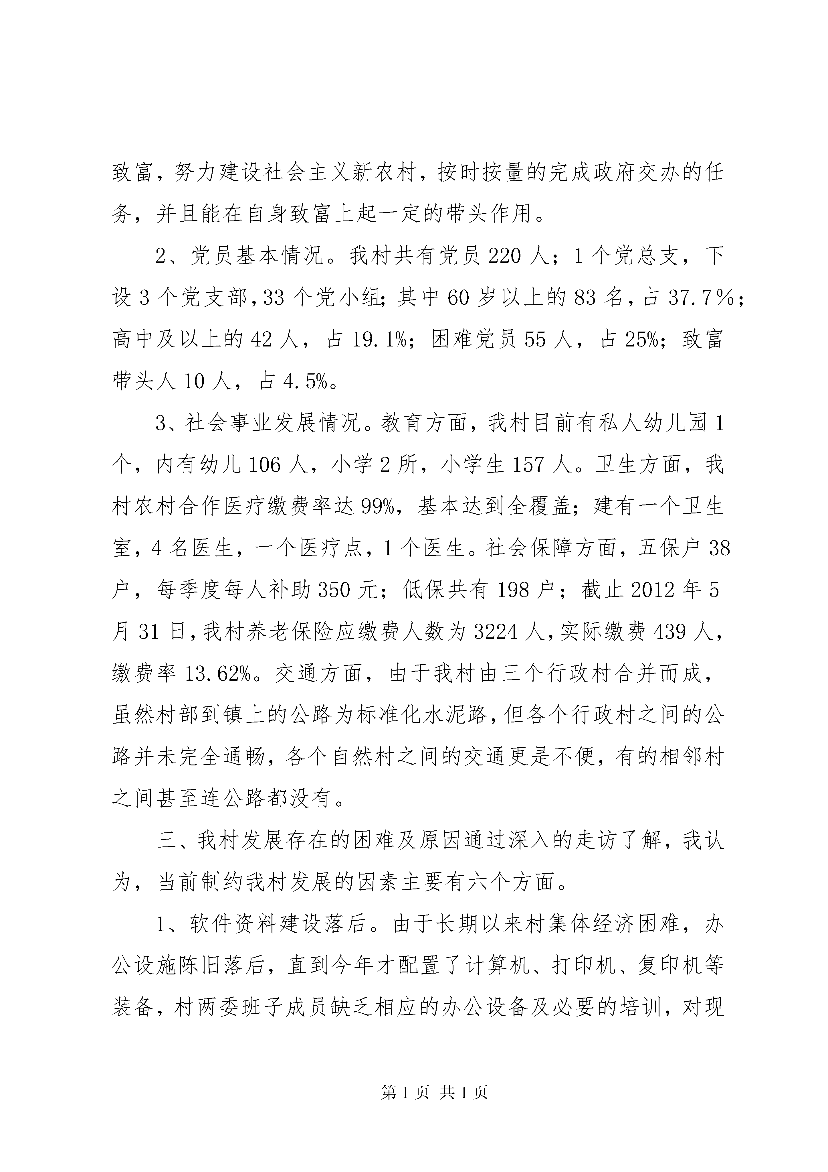 关于某村村情况调研报告根据市委组织部的安排,我作为第五批选派干部,被任命为xx区孙埠镇合义村党总支第一书记。为了掌握我村在组织建设、村集体经济建设、村民的收入状况和思想状况等方面的具体情况,日前,我带领村两委班子成员组成调研组,深入村民家中开展走访调研,以切实掌握全村基本情况,为以后顺利开展工作奠定坚实的基础。一、基本情况合义村位于麻姑山南麓,孙埠镇东北部,东与洪林镇接壤,西与建国村毗邻,南与玉粒村、正兴村相连,北与麻姑山林场搭界,全村总面积16平方公里,耕地面积7000余亩,全村有30个自然村,40个村民组,1600多户,6300多人口,境内有佟公坝东干渠擦边而过,宣杭铁路、宣广高速、318国道横穿东西。主要是以农业为主,基本上第一季种小麦,第二季种水稻,每亩纯收入约为500-600元(如种植水稻品种为糯稻,则为1000元左右)。另外,我村近2年大力发展烟草种植,现共有烟草种植大户10户,种植面积共达1000余亩,每亩纯收入2000元左右。二、我村新农村建设情况1、村两委班子情况。村两委班子总人数为6人,35岁以上的4人,占委员总数的66.7%,高中以上文化程度5人,占委员总数的83.3%。两委班子成员均能严格要求自己,很好的履行自己的工作职责,积极带领村民勤劳致富,努力建设社会主义新农村,按时按量的完成政府交办的任务,并且能在自身致富上起一定的带头作用。2、党员基本情况。我村共有党员220人;1个党总支,下设3个党支部,33个党小组;其中60岁以上的83名,占37.7%;高中及以上的42人,占19.1%;困难党员55人,占25%;致富带头人10人,占4.5%。3、社会事业发展情况。教育方面,我村目前有私人幼儿园1个,内有幼儿106人,小学2所,小学生157人。卫生方面,我村农村合作医疗缴费率达99%,基本达到全覆盖;建有一个卫生室,4名医生,一个医疗点,1个医生。社会保障方面,五保户38户,每季度每人补助350元;低保共有198户;截止2012年5月31日,我村养老保险应缴费人数为3224人,实际缴费439人,缴费率13.62%。交通方面,由于我村由三个行政村合并而成,虽然村部到镇上的公路为标准化水泥路,但各个行政村之间的公路并未完全通畅,各个自然村之间的交通更是不便,有的相邻村之间甚至连公路都没有。三、我村发展存在的困难及原因通过深入的走访了解,我认为,当前制约我村发展的因素主要有六个方面。1、软件资料建设落后。由于长期以来村集体经济困难,办公设施陈旧落后,直到今年才配置了计算机、打印机、复印机等装备,村两委班子成员缺乏相应的办公设备及必要的培训,对现代办公设备操作不熟练,以至于在信息化普及的现在,仍然靠手写完成大部分数字统计及工作报告等工作,严重影响了工作的效率。2、农村干部队伍后继乏人。由于我村工作环境艰苦,任务繁重,村干部待遇低、难落实,致使一些有头脑、有能力的年轻人把眼光放在经济发展上,真正愿意服务农村、扎根农村的人越来越少,造成村级后备干部缺乏。此外,一些年轻党员经常在外,不能及时接受党组织的教育,不参与村里事务,致使村里部分年轻党员集体意识、服务意识不清,政治意识淡化。3、村级党组织活动开展难。我村党员出现“两级”状态,年轻的党员大多外出务工,年龄大的党员行动不便,加之一些党员组织观念淡薄、集体意识不强,党组织活动难开展,甚至党员大会都难以进行。4、集体经济缺失。现我村集体没有集体企业和其他的集体生产资料,因此,村内公共设施、服务设施、公共福利及村委会的各项开支无法通过集体资金解决,需通过其他途径获得资金解决。5、农民增收不快。由于村里耕地使用方式仍然为传统的小麦和水稻种植,而且呈小、散状态,规模经营不显著,分散经营成不了气候,村民固定外出打工和就近临时打工较多,村民收入稳定持续增长能力缺乏。6、社会事业相对落后。我村在2004年由三个行政村合并而来,村户居住分散,加之历史文化、风土人情都存在一定的差异,导致道路、医疗、卫生、用电、学校建设、文化体育等社会事业发展相对滞后。四、我村建设、发展的几点想法1、重点支持发展种植业。在目前状况下,利用烟草种植的产业优势,大力发展烟草种植业,通过和皖南烟叶公司合作,集中土地形成规模优势,提高村民收入。村两委通过为村民烟草种植提供便利,鼓励现有的种植的大户向其他村民传授种植技术,定期开展技术培训,努力提高村民的种植技术,让村民种植出好的烟草,以此带动全村经济发展。2、进一步改善村里的交通状况。目前,我村各个自然村之间的交通不便,有的村级生产道路一道雨天,泥泞难行,交通阻滞,特别是农忙季节更是影响农村作业。村民深受其苦,而且严重影响了村容村貌。因此,改善村里的道路状况,不仅能方便交通,为生产生活提供便利,同时作为民生工程,能极大的提高村民参与管理的