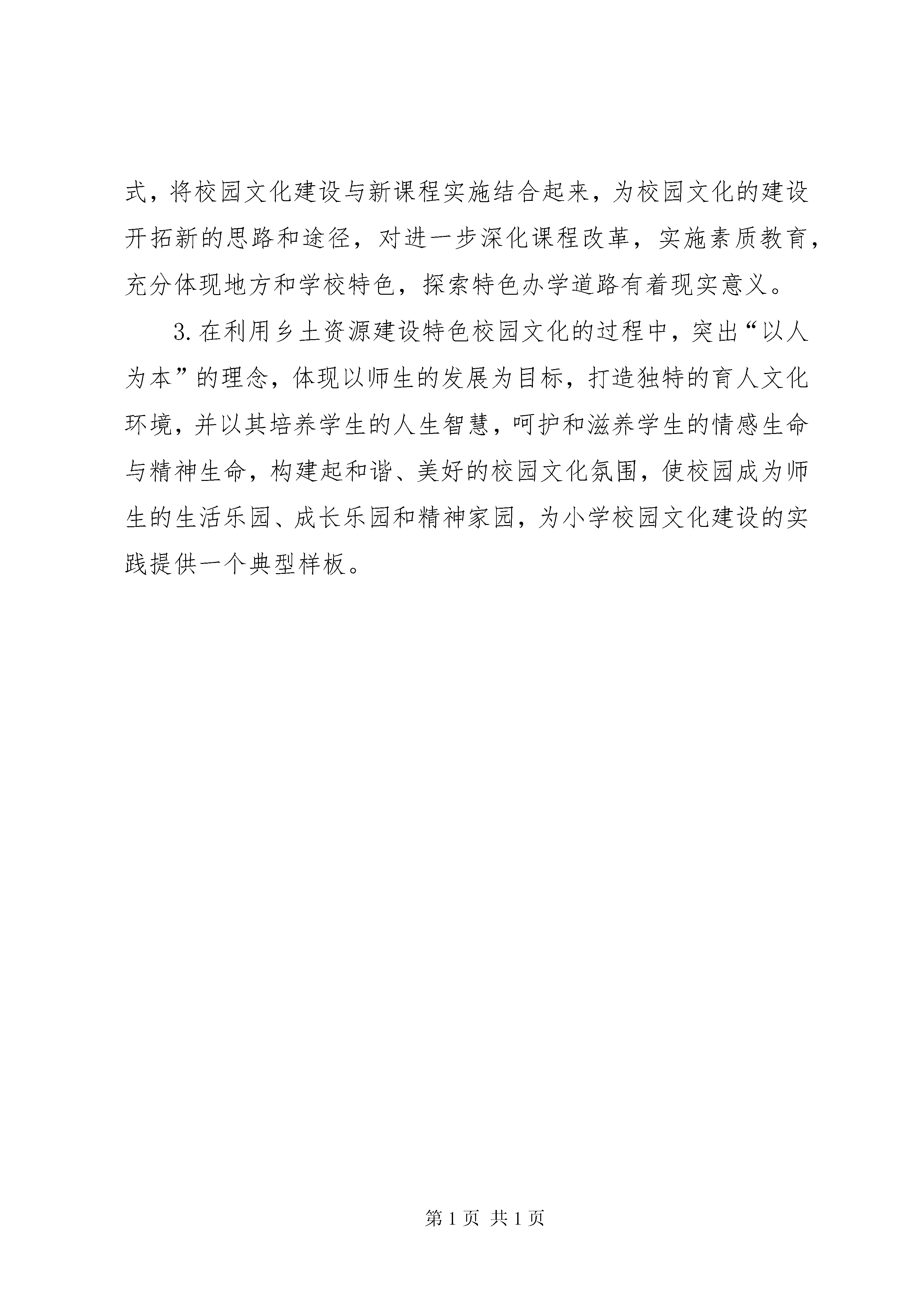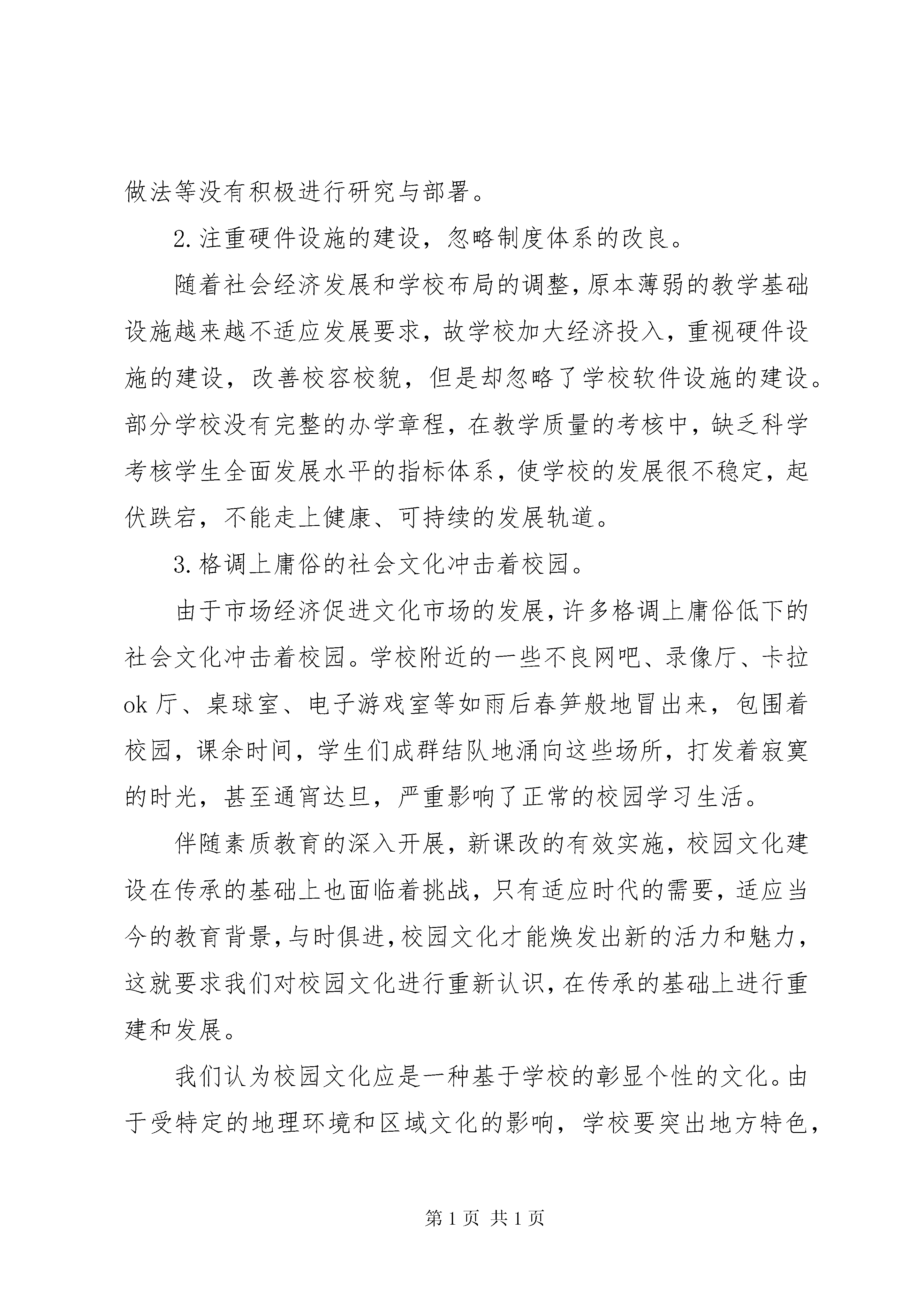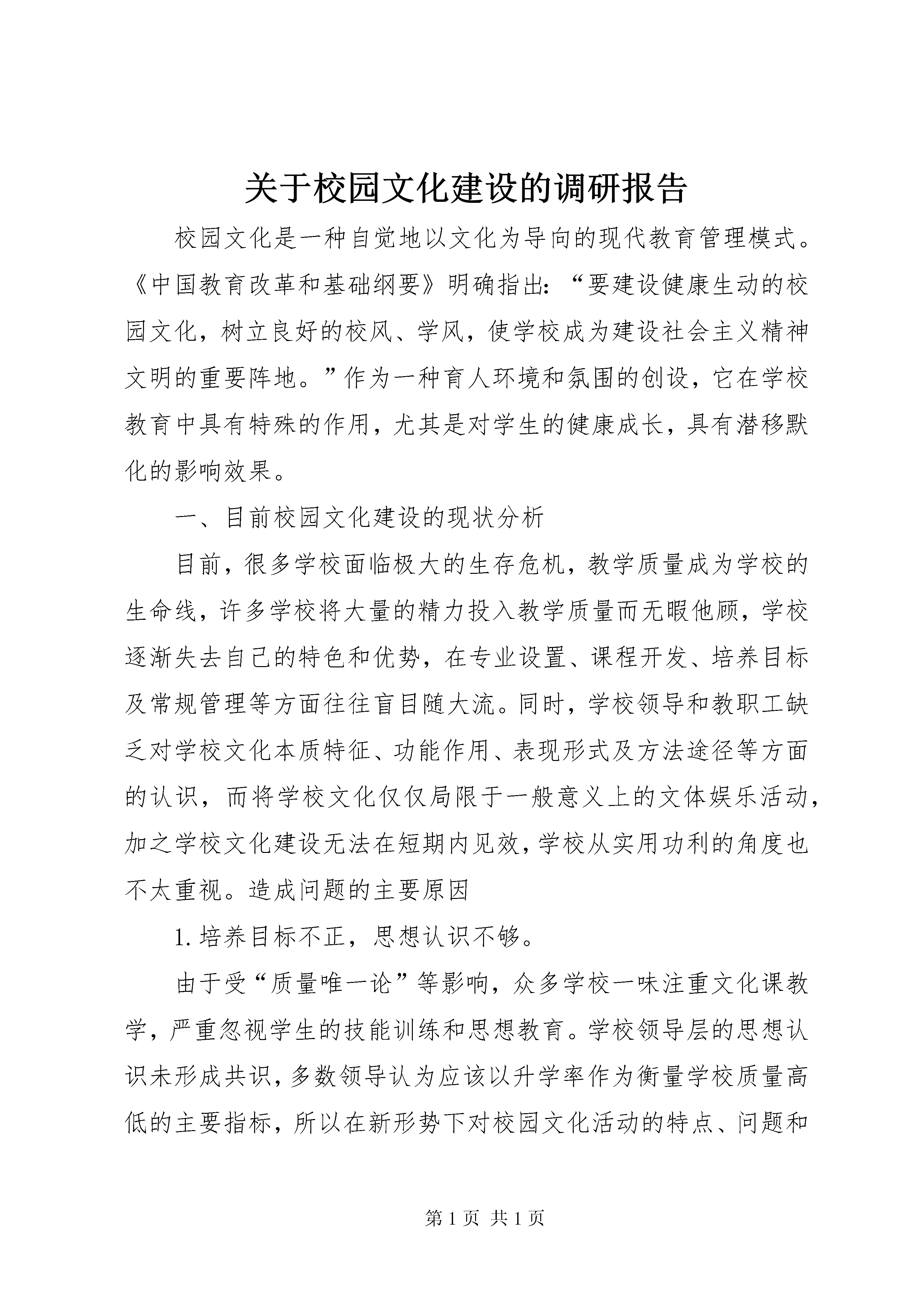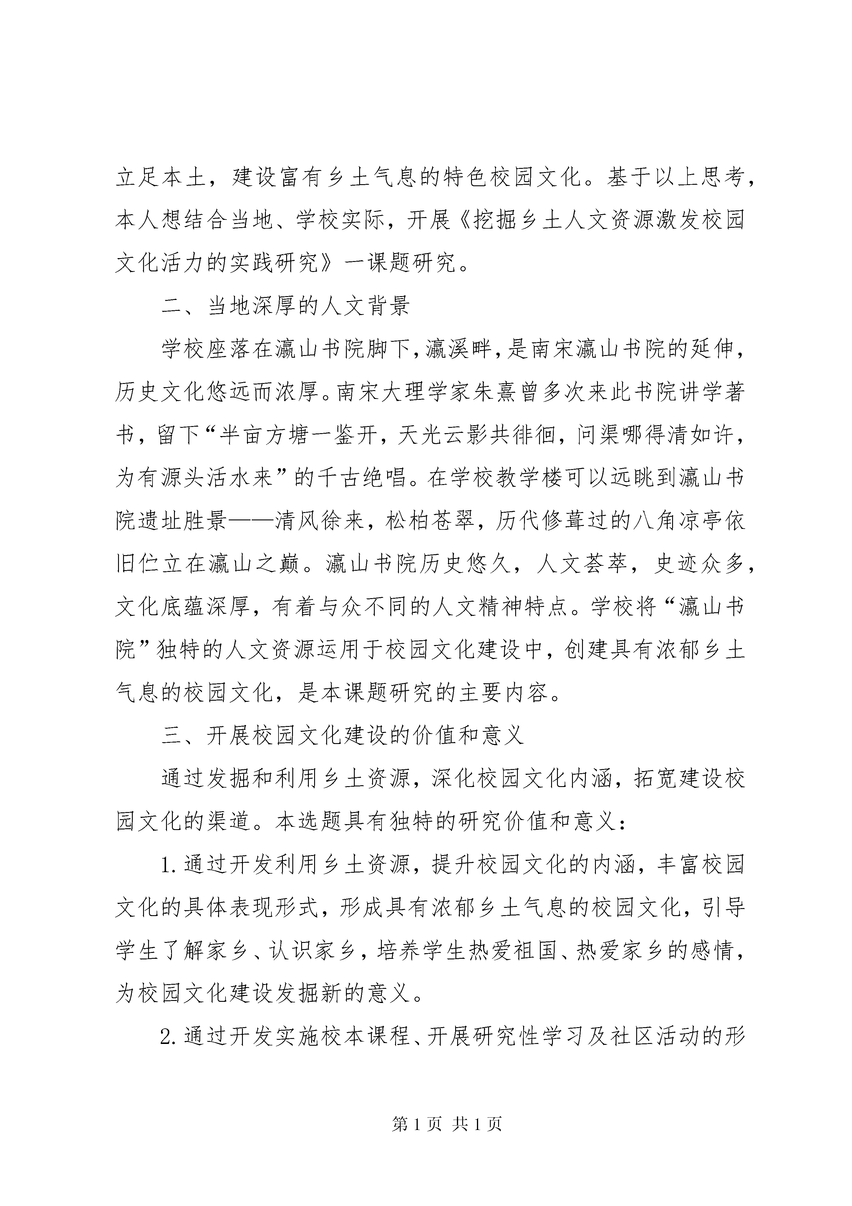关于校园文化建设的调研报告校园文化是一种自觉地以文化为导向的现代教育管理模式。《中国教育改革和基础纲要》明确指出:“要建设健康生动的校园文化,树立良好的校风、学风,使学校成为建设社会主义精神文明的重要阵地。”作为一种育人环境和氛围的创设,它在学校教育中具有特殊的作用,尤其是对学生的健康成长,具有潜移默化的影响效果。一、目前校园文化建设的现状分析目前,很多学校面临极大的生存危机,教学质量成为学校的生命线,许多学校将大量的精力投入教学质量而无暇他顾,学校逐渐失去自己的特色和优势,在专业设置、课程开发、培养目标及常规管理等方面往往盲目随大流。同时,学校领导和教职工缺乏对学校文化本质特征、功能作用、表现形式及方法途径等方面的认识,而将学校文化仅仅局限于一般意义上的文体娱乐活动,加之学校文化建设无法在短期内见效,学校从实用功利的角度也不太重视。造成问题的主要原因1.培养目标不正,思想认识不够。由于受“质量唯一论”等影响,众多学校一味注重文化课教学,严重忽视学生的技能训练和思想教育。学校领导层的思想认识未形成共识,多数领导认为应该以升学率作为衡量学校质量高低的主要指标,所以在新形势下对校园文化活动的特点、问题和做法等没有积极进行研究与部署。2.注重硬件设施的建设,忽略制度体系的改良。随着社会经济发展和学校布局的调整,原本薄弱的教学基础设施越来越不适应发展要求,故学校加大经济投入,重视硬件设施的建设,改善校容校貌,但是却忽略了学校软件设施的建设。部分学校没有完整的办学章程,在教学质量的考核中,缺乏科学考核学生全面发展水平的指标体系,使学校的发展很不稳定,起伏跌宕,不能走上健康、可持续的发展轨道。3.格调上庸俗的社会文化冲击着校园。由于市场经济促进文化市场的发展,许多格调上庸俗低下的社会文化冲击着校园。学校附近的一些不良网吧、录像厅、卡拉ok厅、桌球室、电子游戏室等如雨后春笋般地冒出来,包围着校园,课余时间,学生们成群结队地涌向这些场所,打发着寂寞的时光,甚至通宵达旦,严重影响了正常的校园学习生活。伴随素质教育的深入开展,新课改的有效实施,校园文化建设在传承的基础上也面临着挑战,只有适应时代的需要,适应当今的教育背景,与时俱进,校园文化才能焕发出新的活力和魅力,这就要求我们对校园文化进行重新认识,在传承的基础上进行重建和发展。我们认为校园文化应是一种基于学校的彰显个性的文化。由于受特定的地理环境和区域文化的影响,学校要突出地方特色,立足本土,建设富有乡土气息的特色校园文化。基于以上思考,本人想结合当地、学校实际,开展《挖掘乡土人文资源激发校园文化活力的实践研究》一课题研究。二、当地深厚的人文背景学校座落在瀛山书院脚下,瀛溪畔,是南宋瀛山书院的延伸,历史文化悠远而浓厚。南宋大理学家朱熹曾多次来此书院讲学著书,留下“半亩方塘一鉴开,天光云影共徘徊,问渠哪得清如许,为有源头活水来”的千古绝唱。在学校教学楼可以远眺到瀛山书院遗址胜景——清风徐来,松柏苍翠,历代修葺过的八角凉亭依旧伫立在瀛山之巅。瀛山书院历史悠久,人文荟萃,史迹众多,文化底蕴深厚,有着与众不同的人文精神特点。学校将“瀛山书院”独特的人文资源运用于校园文化建设中,创建具有浓郁乡土气息的校园文化,是本课题研究的主要内容。三、开展校园文化建设的价值和意义通过发掘和利用乡土资源,深化校园文化内涵,拓宽建设校园文化的渠道。本选题具有独特的研究价值和意义:1.通过开发利用乡土资源,提升校园文化的内涵,丰富校园文化的具体表现形式,形成具有浓郁乡土气息的校园文化,引导学生了解家乡、认识家乡,培养学生热爱祖国、热爱家乡的感情,为校园文化建设发掘新的意义。2.通过开发实施校本课程、开展研究性学习及社区活动的形式,将校园文化建设与新课程实施结合起来,为校园文化的建设开拓新的思路和途径,对进一步深化课程改革,实施素质教育,充分体现地方和学校特色,探索特色办学道路有着现实意义。3.在利用乡土资源建设特色校园文化的过程中,突出“以人为本”的理念,体现以师生的发展为目标,打造独特的育人文化环境,并以其培养学生的人生智慧,呵护和滋养学生的情感生命与精神生命,构建起和谐、美好的校园文化氛围,使校园成为师生的生活乐园、成长乐园和精神家园,为小学校园文化建设的实践提供一个典型样板。