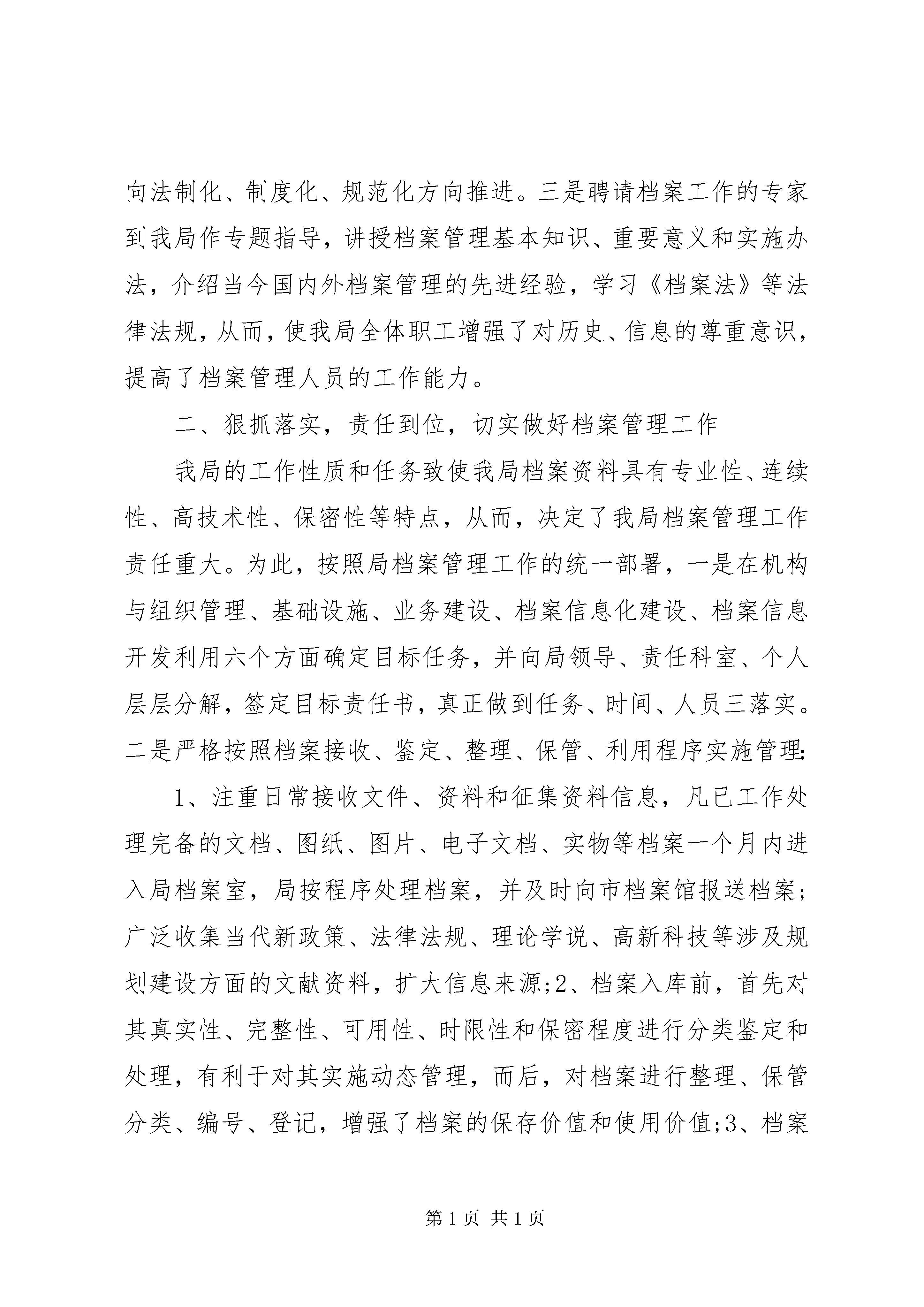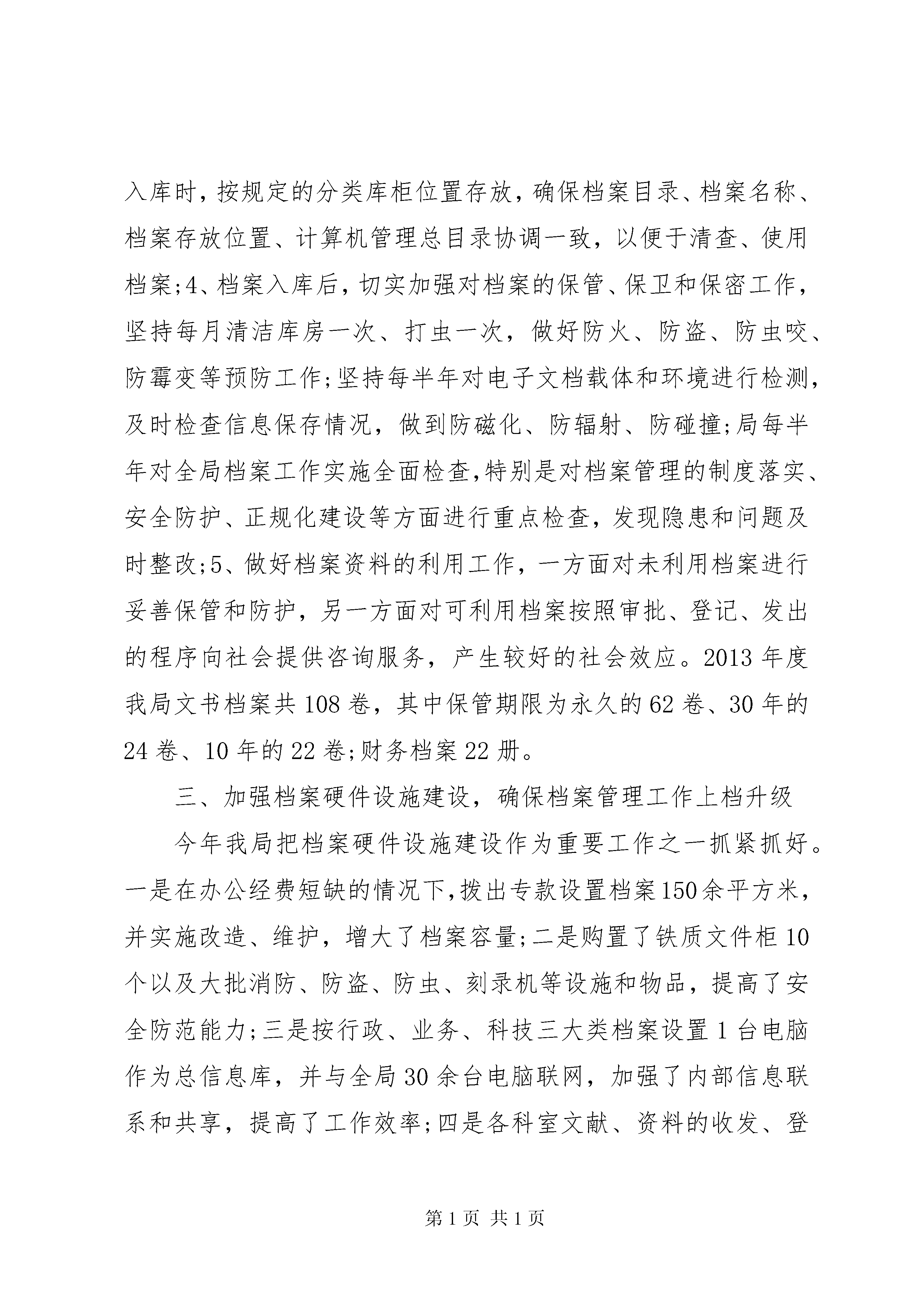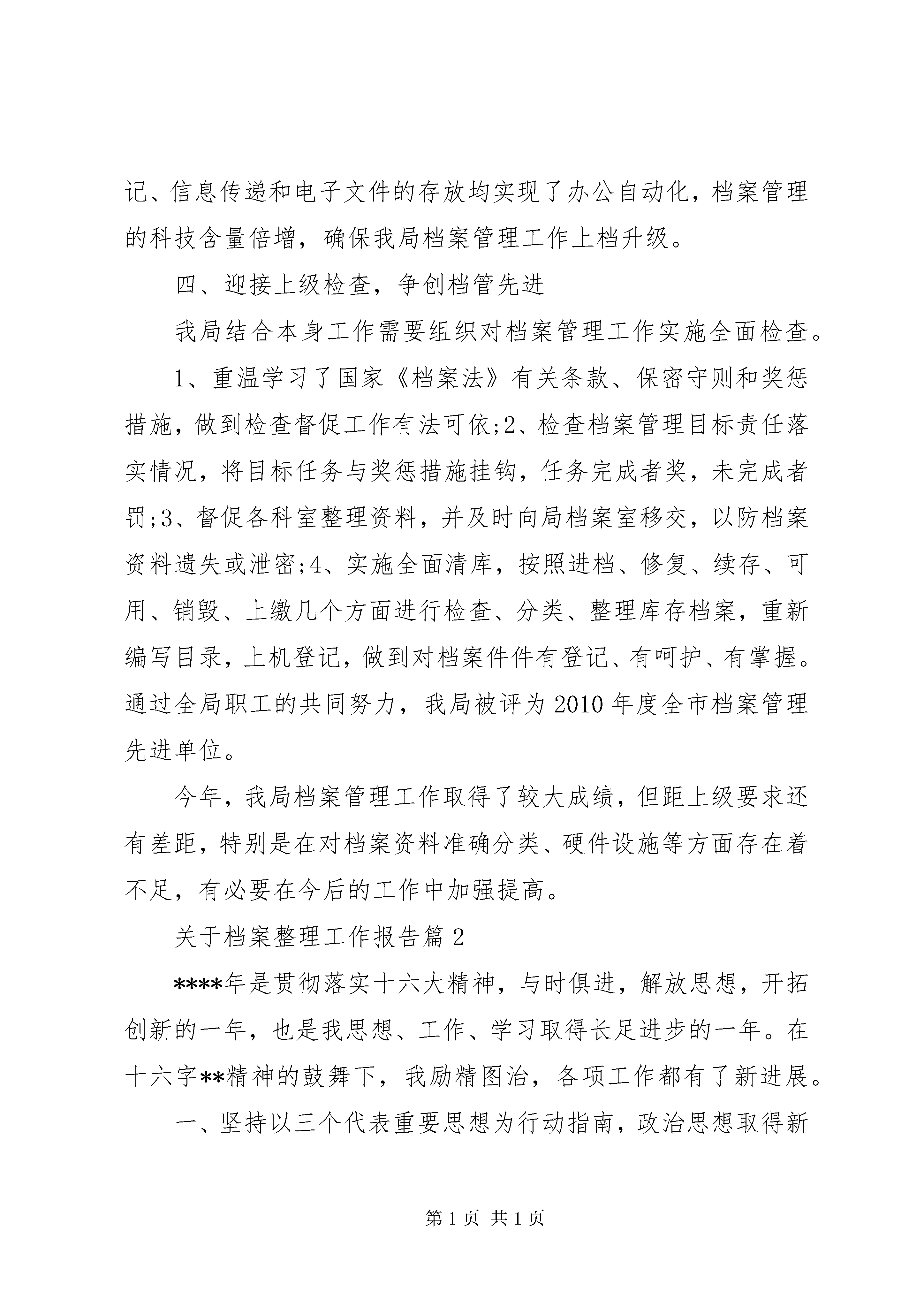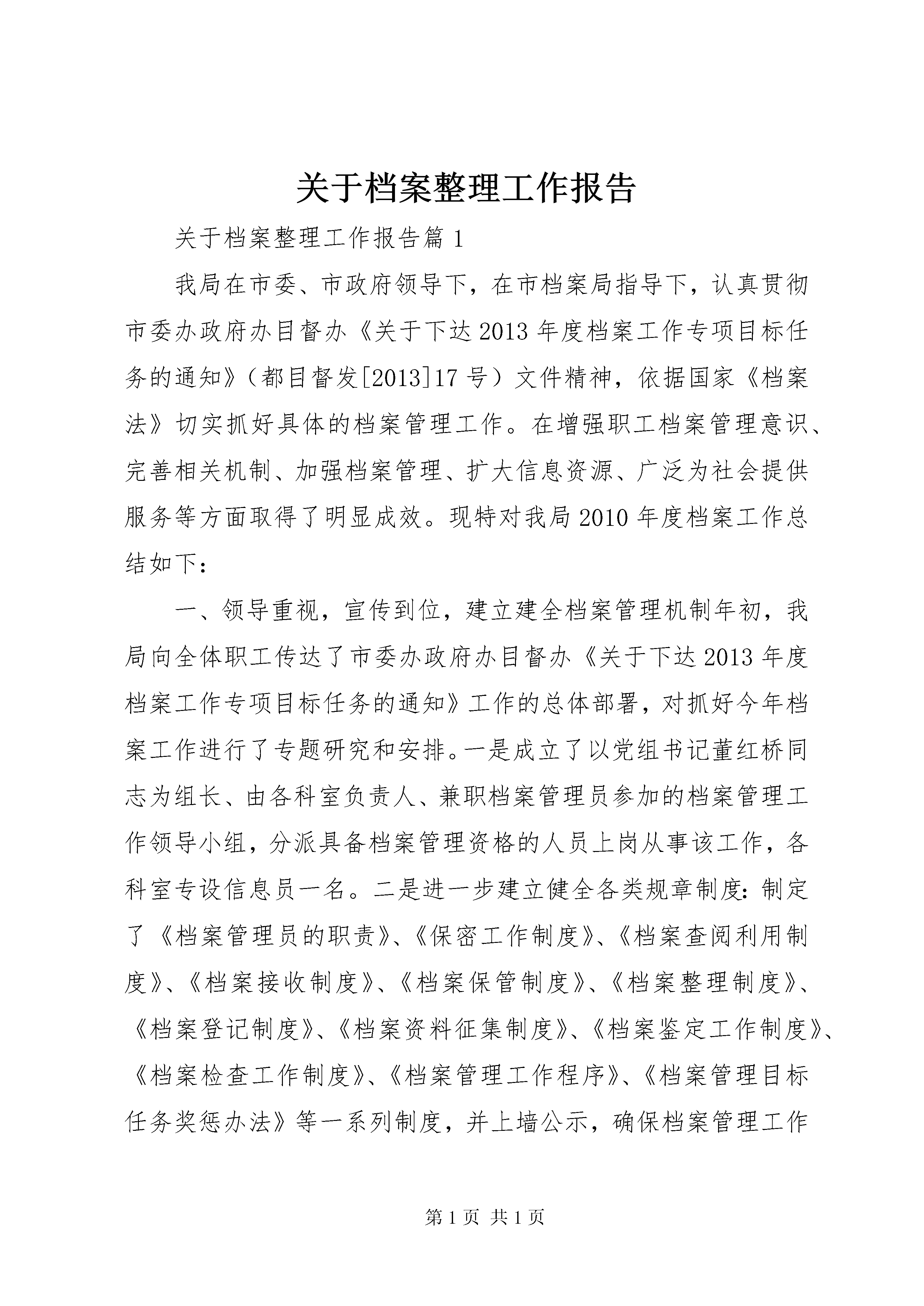 关于档案整理工作报告关于档案整理工作报告篇1我局在市委、市政府领导下,在市档案局指导下,认真贯彻市委办政府办目督办《关于下达2013年度档案工作专项目标任务的通知》(都目督发[2013]17号)文件精神,依据国家《档案法》切实抓好具体的档案管理工作。在增强职工档案管理意识、完善相关机制、加强档案管理、扩大信息资源、广泛为社会提供服务等方面取得了明显成效。现特对我局2010年度档案工作总结如下:一、领导重视,宣传到位,建立建全档案管理机制年初,我局向全体职工传达了市委办政府办目督办《关于下达2013年度档案工作专项目标任务的通知》工作的总体部署,对抓好今年档案工作进行了专题研究和安排。一是成立了以党组书记董红桥同志为组长、由各科室负责人、兼职档案管理员参加的档案管理工作领导小组,分派具备档案管理资格的人员上岗从事该工作,各科室专设信息员一名。二是进一步建立健全各类规章制度:制定了《档案管理员的职责》、《保密工作制度》、《档案查阅利用制度》、《档案接收制度》、《档案保管制度》、《档案整理制度》、《档案登记制度》、《档案资料征集制度》、《档案鉴定工作制度》、《档案检查工作制度》、《档案管理工作程序》、《档案管理目标任务奖惩办法》等一系列制度,并上墙公示,确保档案管理工作向法制化、制度化、规范化方向推进。三是聘请档案工作的专家到我局作专题指导,讲授档案管理基本知识、重要意义和实施办法,介绍当今国内外档案管理的先进经验,学习《档案法》等法律法规,从而,使我局全体职工增强了对历史、信息的尊重意识,提高了档案管理人员的工作能力。二、狠抓落实,责任到位,切实做好档案管理工作我局的工作性质和任务致使我局档案资料具有专业性、连续性、高技术性、保密性等特点,从而,决定了我局档案管理工作责任重大。为此,按照局档案管理工作的统一部署,一是在机构与组织管理、基础设施、业务建设、档案信息化建设、档案信息开发利用六个方面确定目标任务,并向局领导、责任科室、个人层层分解,签定目标责任书,真正做到任务、时间、人员三落实。二是严格按照档案接收、鉴定、整理、保管、利用程序实施管理:1、注重日常接收文件、资料和征集资料信息,凡已工作处理完备的文档、图纸、图片、电子文档、实物等档案一个月内进入局档案室,局按程序处理档案,并及时向市档案馆报送档案;广泛收集当代新政策、法律法规、理论学说、高新科技等涉及规划建设方面的文献资料,扩大信息来源;2、档案入库前,首先对其真实性、完整性、可用性、时限性和保密程度进行分类鉴定和处理,有利于对其实施动态管理,而后,对档案进行整理、保管分类、编号、登记,增强了档案的保存价值和使用价值;3、档案入库时,按规定的分类库柜位置存放,确保档案目录、档案名称、档案存放位置、计算机管理总目录协调一致,以便于清查、使用档案;4、档案入库后,切实加强对档案的保管、保卫和保密工作,坚持每月清洁库房一次、打虫一次,做好防火、防盗、防虫咬、防霉变等预防工作;坚持每半年对电子文档载体和环境进行检测,及时检查信息保存情况,做到防磁化、防辐射、防碰撞;局每半年对全局档案工作实施全面检查,特别是对档案管理的制度落实、安全防护、正规化建设等方面进行重点检查,发现隐患和问题及时整改;5、做好档案资料的利用工作,一方面对未利用档案进行妥善保管和防护,另一方面对可利用档案按照审批、登记、发出的程序向社会提供咨询服务,产生较好的社会效应。2013年度我局文书档案共108卷,其中保管期限为永久的62卷、30年的24卷、10年的22卷;财务档案22册。三、加强档案硬件设施建设,确保档案管理工作上档升级今年我局把档案硬件设施建设作为重要工作之一抓紧抓好。一是在办公经费短缺的情况下,拨出专款设置档案150余平方米,并实施改造、维护,增大了档案容量;二是购置了铁质文件柜10个以及大批消防、防盗、防虫、刻录机等设施和物品,提高了安全防范能力;三是按行政、业务、科技三大类档案设置1台电脑作为总信息库,并与全局30余台电脑联网,加强了内部信息联系和共享,提高了工作效率;四是各科室文献、资料的收发、登记、信息传递和电子文件的存放均实现了办公自动化,档案管理的科技含量倍增,确保我局档案管理工作上档升级。四、迎接上级检查,争创档管先进我局结合本身工作需要组织对档案管理工作实施全面检查。1、重温学习了国家《档案法》有关条款、保密守则和奖惩措施,做到检查督促工作有法可依;2、检查档案管理目标责任落实情况,将目标任务与奖惩措施挂钩,任务完成者奖,未完成者罚;3、督促各科室整理资料,并及时向局档案室移交,以防档案资料遗失或泄密;4、实施全面清库,按照进档、修复、续存、可用、销毁、上缴几个方面进行检查、分类、整理库存档案,重新编写目录,上机登记,做到对档案件件有登记、有呵护、有掌握。