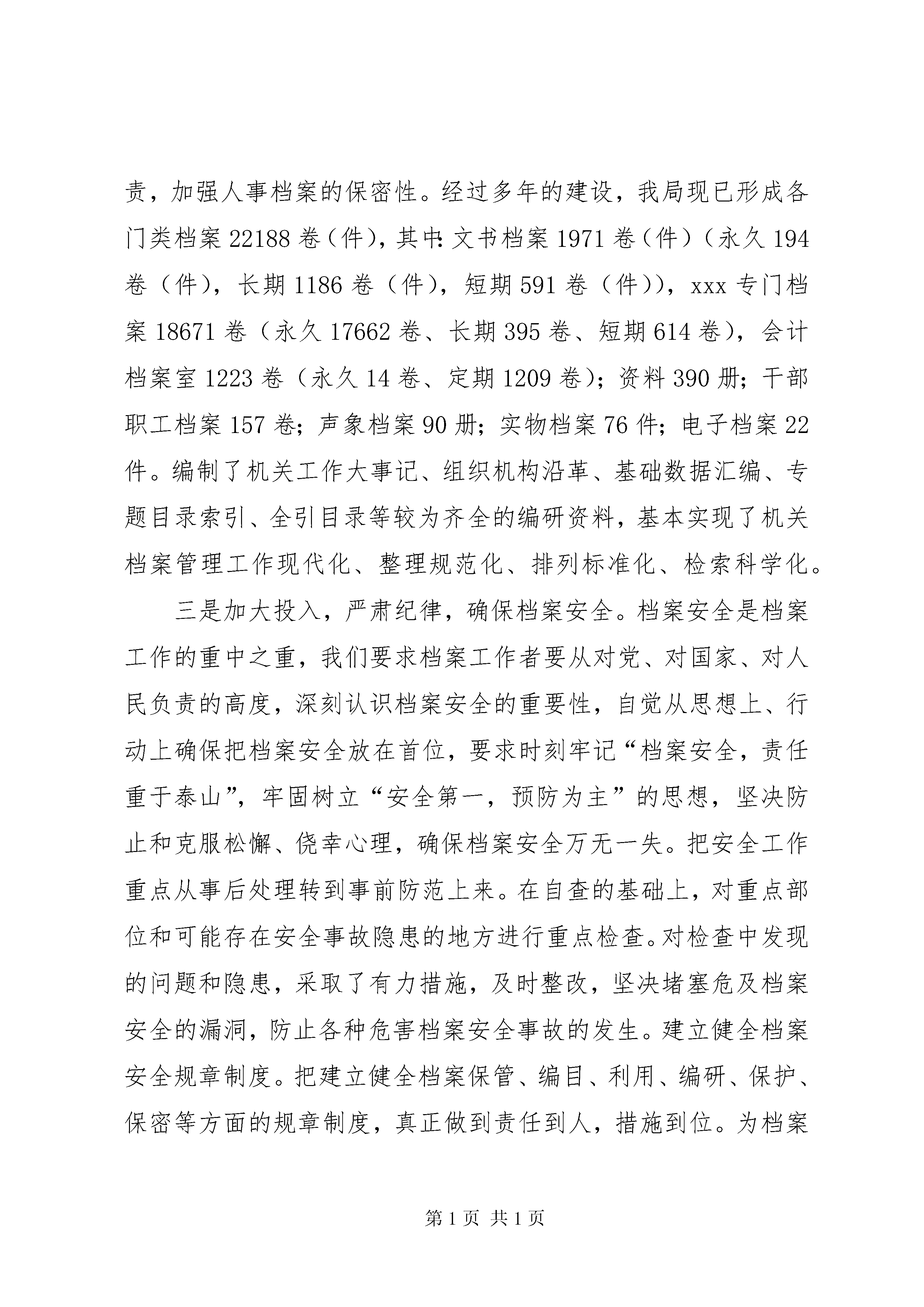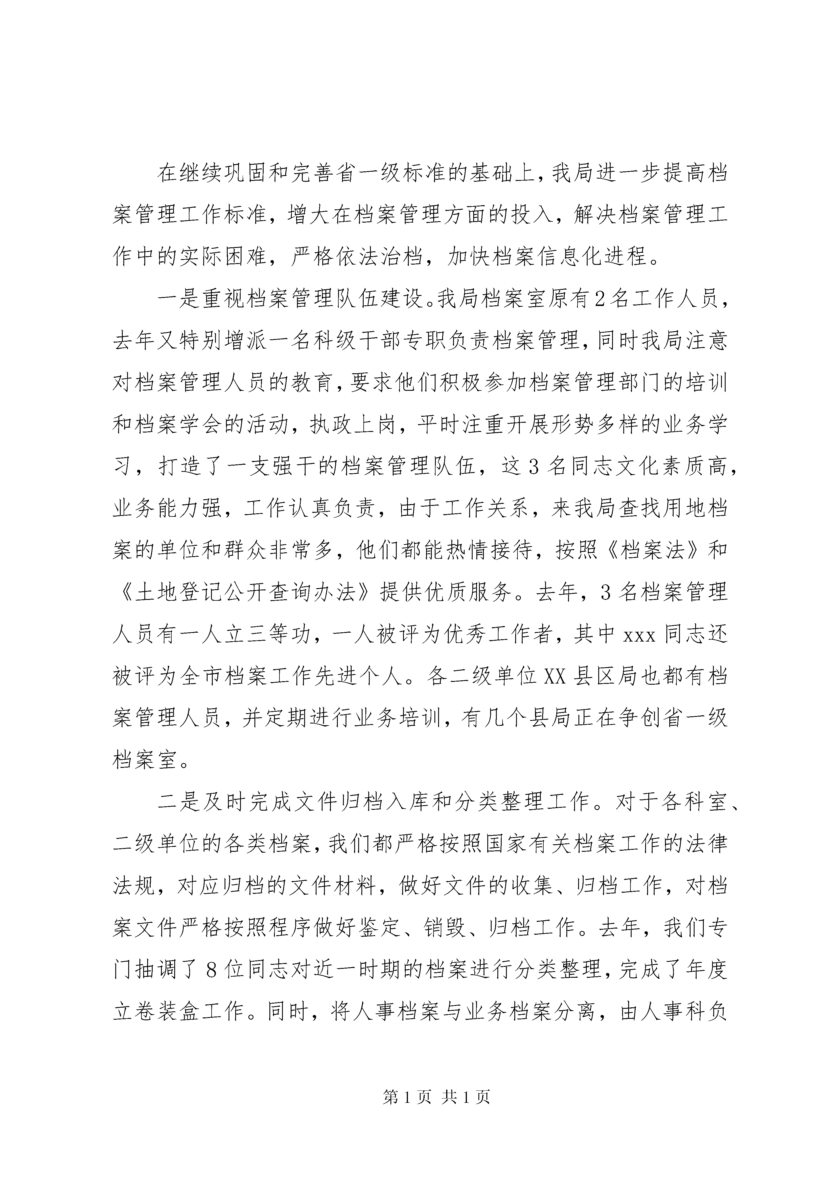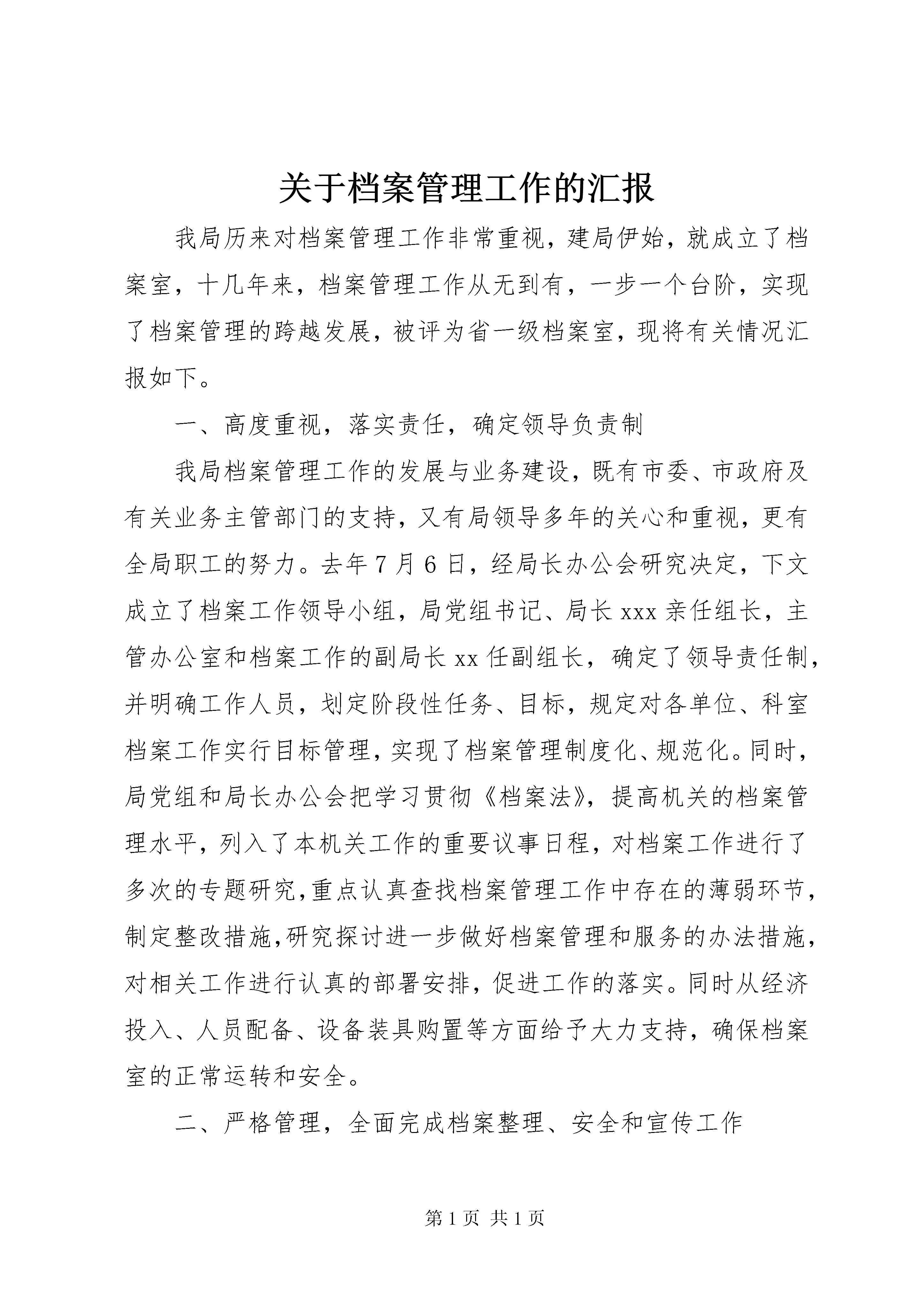 关于档案管理工作的汇报我局历来对档案管理工作非常重视,建局伊始,就成立了档案室,十几年来,档案管理工作从无到有,一步一个台阶,实现了档案管理的跨越发展,被评为省一级档案室,现将有关情况汇报如下。一、高度重视,落实责任,确定领导负责制我局档案管理工作的发展与业务建设,既有市委、市政府及有关业务主管部门的支持,又有局领导多年的关心和重视,更有全局职工的努力。去年7月6日,经局长办公会研究决定,下文成立了档案工作领导小组,局党组书记、局长xxx亲任组长,主管办公室和档案工作的副局长xx任副组长,确定了领导责任制,并明确工作人员,划定阶段性任务、目标,规定对各单位、科室档案工作实行目标管理,实现了档案管理制度化、规范化。同时,局党组和局长办公会把学习贯彻《档案法》,提高机关的档案管理水平,列入了本机关工作的重要议事日程,对档案工作进行了多次的专题研究,重点认真查找档案管理工作中存在的薄弱环节,制定整改措施,研究探讨进一步做好档案管理和服务的办法措施,对相关工作进行认真的部署安排,促进工作的落实。同时从经济投入、人员配备、设备装具购置等方面给予大力支持,确保档案室的正常运转和安全。二、严格管理,全面完成档案整理、安全和宣传工作在继续巩固和完善省一级标准的基础上,我局进一步提高档案管理工作标准,增大在档案管理方面的投入,解决档案管理工作中的实际困难,严格依法治档,加快档案信息化进程。一是重视档案管理队伍建设。我局档案室原有2名工作人员,去年又特别增派一名科级干部专职负责档案管理,同时我局注意对档案管理人员的教育,要求他们积极参加档案管理部门的培训和档案学会的活动,执政上岗,平时注重开展形势多样的业务学习,打造了一支强干的档案管理队伍,这3名同志文化素质高,业务能力强,工作认真负责,由于工作关系,来我局查找用地档案的单位和群众非常多,他们都能热情接待,按照《档案法》和《土地登记公开查询办法》提供优质服务。去年,3名档案管理人员有一人立三等功,一人被评为优秀工作者,其中xxx同志还被评为全市档案工作先进个人。各二级单位XX县区局也都有档案管理人员,并定期进行业务培训,有几个县局正在争创省一级档案室。二是及时完成文件归档入库和分类整理工作。对于各科室、二级单位的各类档案,我们都严格按照国家有关档案工作的法律法规,对应归档的文件材料,做好文件的收集、归档工作,对档案文件严格按照程序做好鉴定、销毁、归档工作。去年,我们专门抽调了8位同志对近一时期的档案进行分类整理,完成了年度立卷装盒工作。同时,将人事档案与业务档案分离,由人事科负责,加强人事档案的保密性。经过多年的建设,我局现已形成各门类档案22188卷(件),其中:文书档案1971卷(件)(永久194卷(件),长期1186卷(件),短期591卷(件)),xxx专门档案18671卷(永久17662卷、长期395卷、短期614卷),会计档案室1223卷(永久14卷、定期1209卷);资料390册;干部职工档案157卷;声象档案90册;实物档案76件;电子档案22件。编制了机关工作大事记、组织机构沿革、基础数据汇编、专题目录索引、全引目录等较为齐全的编研资料,基本实现了机关档案管理工作现代化、整理规范化、排列标准化、检索科学化。三是加大投入,严肃纪律,确保档案安全。档案安全是档案工作的重中之重,我们要求档案工作者要从对党、对国家、对人民负责的高度,深刻认识档案安全的重要性,自觉从思想上、行动上确保把档案安全放在首位,要求时刻牢记“档案安全,责任重于泰山”,牢固树立“安全第一,预防为主”的思想,坚决防止和克服松懈、侥幸心理,确保档案安全万无一失。把安全工作重点从事后处理转到事前防范上来。在自查的基础上,对重点部位和可能存在安全事故隐患的地方进行重点检查。对检查中发现的问题和隐患,采取了有力措施,及时整改,坚决堵塞危及档案安全的漏洞,防止各种危害档案安全事故的发生。建立健全档案安全规章制度。把建立健全档案保管、编目、利用、编研、保护、保密等方面的规章制度,真正做到责任到人,措施到位。为档案时安装了防盗门,并出资购买了一批灭火器、防虫剂、吸尘器、温度计、空调等设备,达到档案库房“八防”标准的要求,并安排专款进行了一次彻底的杀虫,目前未发现霉变、虫蛀现象,确保了档案的安全。增强档案利用安全意识,正确处理好档案安全保管和方便利用的关系,既保证档案不丢失、不损坏,又保证了档案信息不失密、不泄密。四是加强档案宣传统计工作。档案工作是一项基础性工作,许多人对档案工作比较陌生,不够了解,不够重视,为此,我们在全局干部职工大会上多次强调对档案的管理、使用和爱护,并组织全局干部职工结合“四五普法”学习了《档案法》、《档案法实施办法》和《XX省档案管理条例》,取得了较好的效果,全局档案管理法律意识明