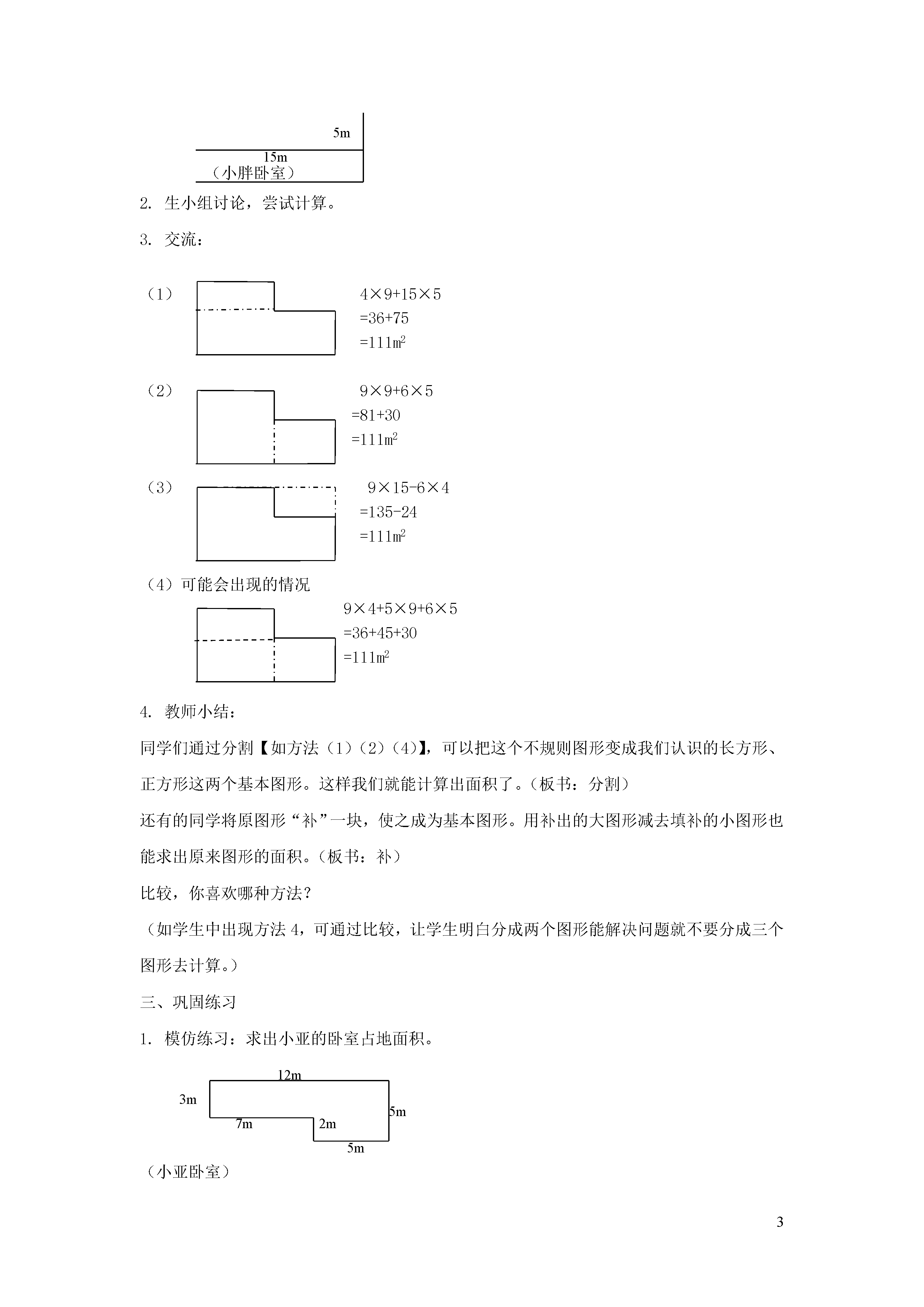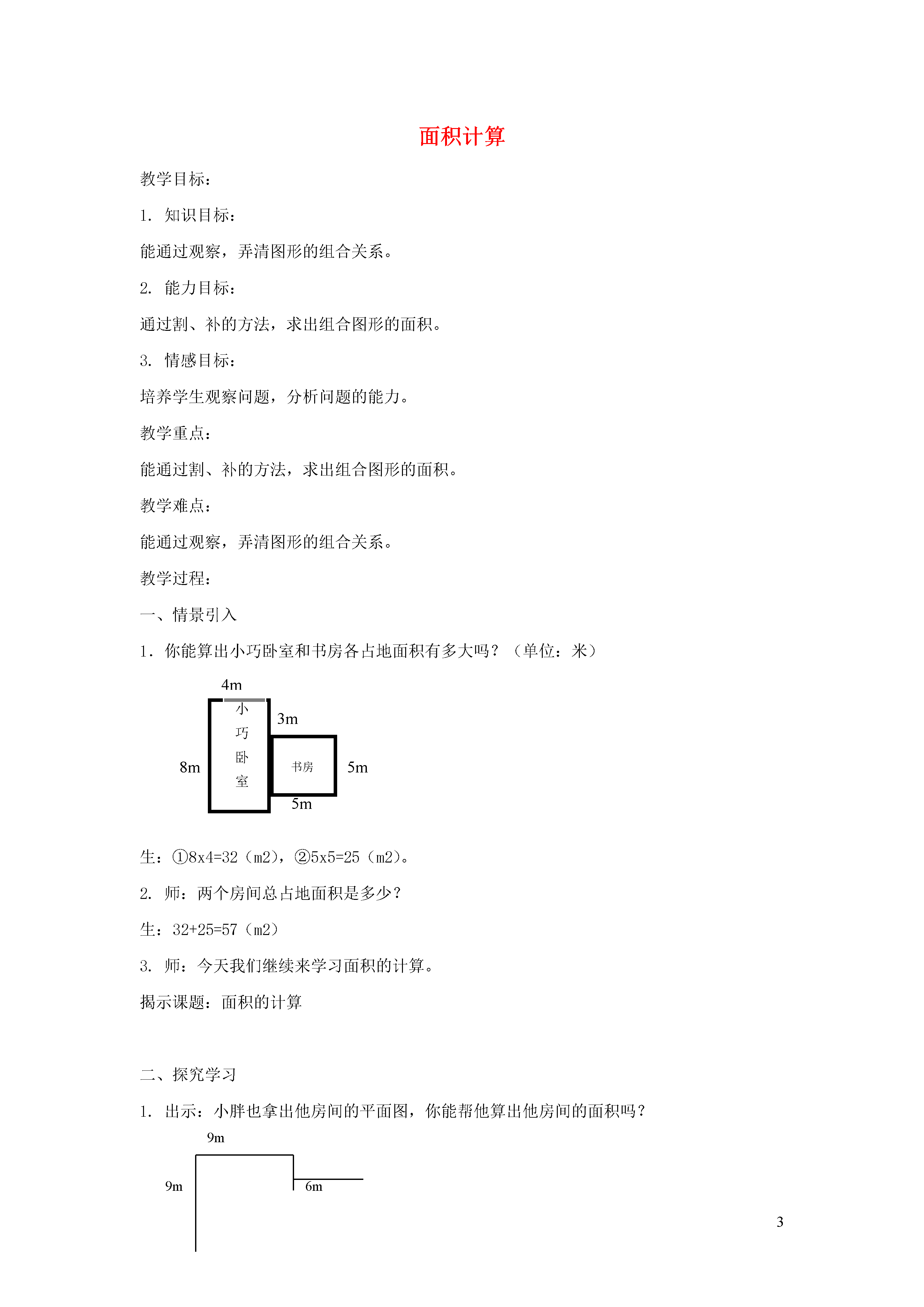 3面积计算教学目标:1.知识目标:能通过观察,弄清图形的组合关系。2.能力目标:通过割、补的方法,求出组合图形的面积。3.情感目标:培养学生观察问题,分析问题的能力。教学重点:能通过割、补的方法,求出组合图形的面积。教学难点:能通过观察,弄清图形的组合关系。教学过程:一、情景引入4m1.你能算出小巧卧室和书房各占地面积有多大吗?(单位:米)小巧卧室书房5m8m5m3m4m生:①8x4=32(m2),②5x5=25(m2)。2.师:两个房间总占地面积是多少?生:32+25=57(m2)3.师:今天我们继续来学习面积的计算。揭示课题:面积的计算二、探究学习9m1.出示:小胖也拿出他房间的平面图,你能帮他算出他房间的面积吗?6m9m5m15m(小胖卧室)2.生小组讨论,尝试计算。3.交流:(1)4×9+15×5=36+75=111m2(2)9×9+6×5=81+30=111m2(3)9×15-6×4=135-24=111m2(4)可能会出现的情况9×4+5×9+6×5=36+45+30=111m24.教师小结:同学们通过分割【如方法(1)(2)(4)】,可以把这个不规则图形变成我们认识的长方形、正方形这两个基本图形。这样我们就能计算出面积了。(板书:分割)还有的同学将原图形“补”一块,使之成为基本图形。用补出的大图形减去填补的小图形也能求出原来图形的面积。(板书:补)比较,你喜欢哪种方法?(如学生中出现方法4,可通过比较,让学生明白分成两个图形能解决问题就不要分成三个图形去计算。)三、巩固练习1.模仿练习:求出小亚的卧室占地面积。3m2m7m5m5m12m(小亚卧室)问:三个人谁的卧室最大?谁的最小?3m2m2.书p6:儿童游乐场有多大?(如图)3m5m5m用“分割”方法计算8m用“补”的方法计算3dm3dm3m2m3.拓展:3dm5dm5m5m7m7m5dm5dm7m5dm13m学生先独立做,再交流。