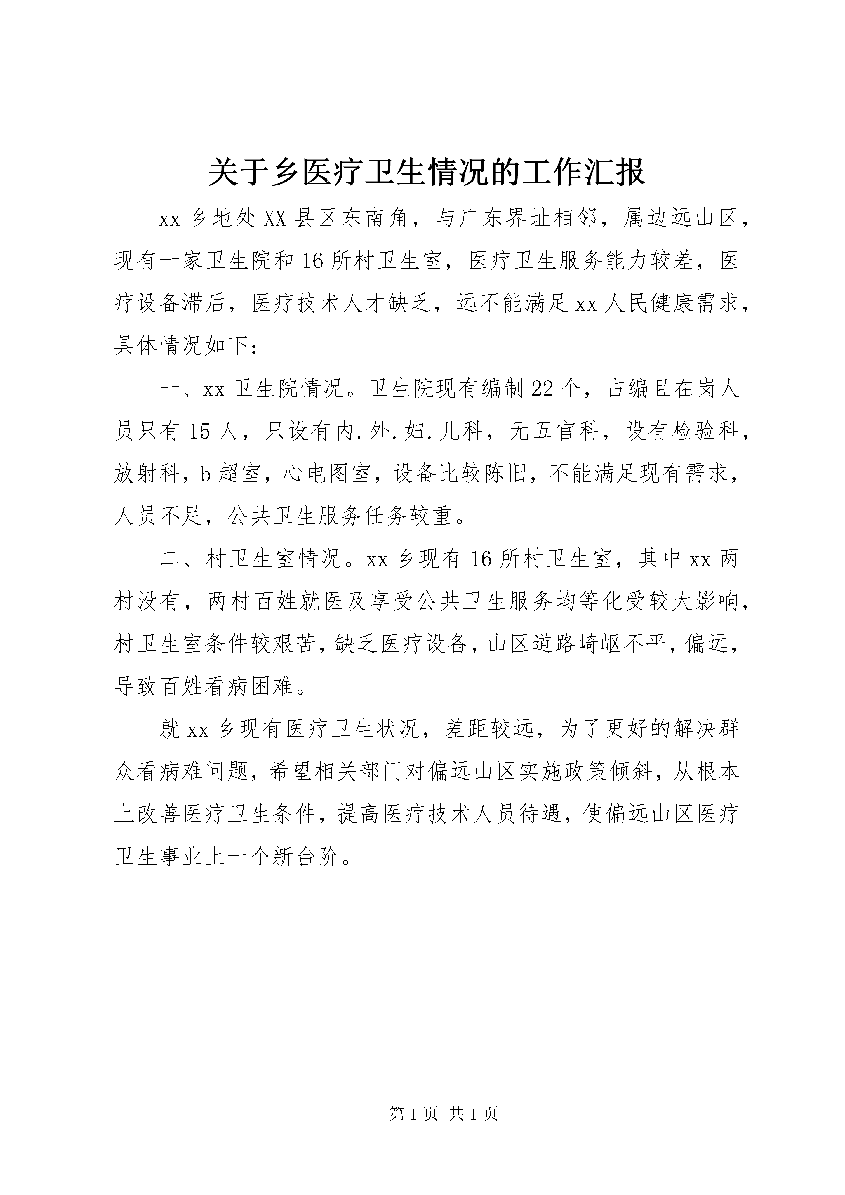关于乡医疗卫生情况的工作汇报xx乡地处XX县区东南角,与广东界址相邻,属边远山区,现有一家卫生院和16所村卫生室,医疗卫生服务能力较差,医疗设备滞后,医疗技术人才缺乏,远不能满足xx人民健康需求,具体情况如下:一、xx卫生院情况。卫生院现有编制22个,占编且在岗人员只有15人,只设有内.外.妇.儿科,无五官科,设有检验科,放射科,b超室,心电图室,设备比较陈旧,不能满足现有需求,人员不足,公共卫生服务任务较重。二、村卫生室情况。xx乡现有16所村卫生室,其中xx两村没有,两村百姓就医及享受公共卫生服务均等化受较大影响,村卫生室条件较艰苦,缺乏医疗设备,山区道路崎岖不平,偏远,导致百姓看病困难。就xx乡现有医疗卫生状况,差距较远,为了更好的解决群众看病难问题,希望相关部门对偏远山区实施政策倾斜,从根本上改善医疗卫生条件,提高医疗技术人员待遇,使偏远山区医疗卫生事业上一个新台阶。