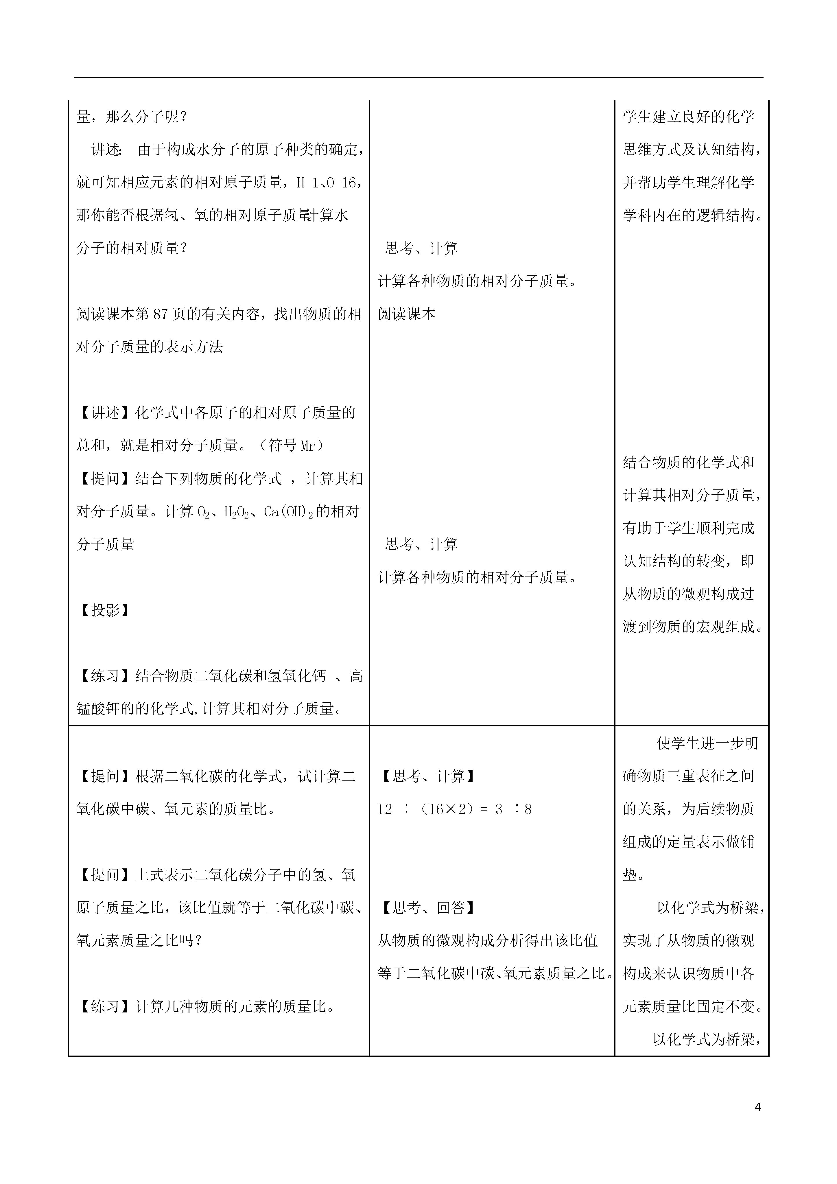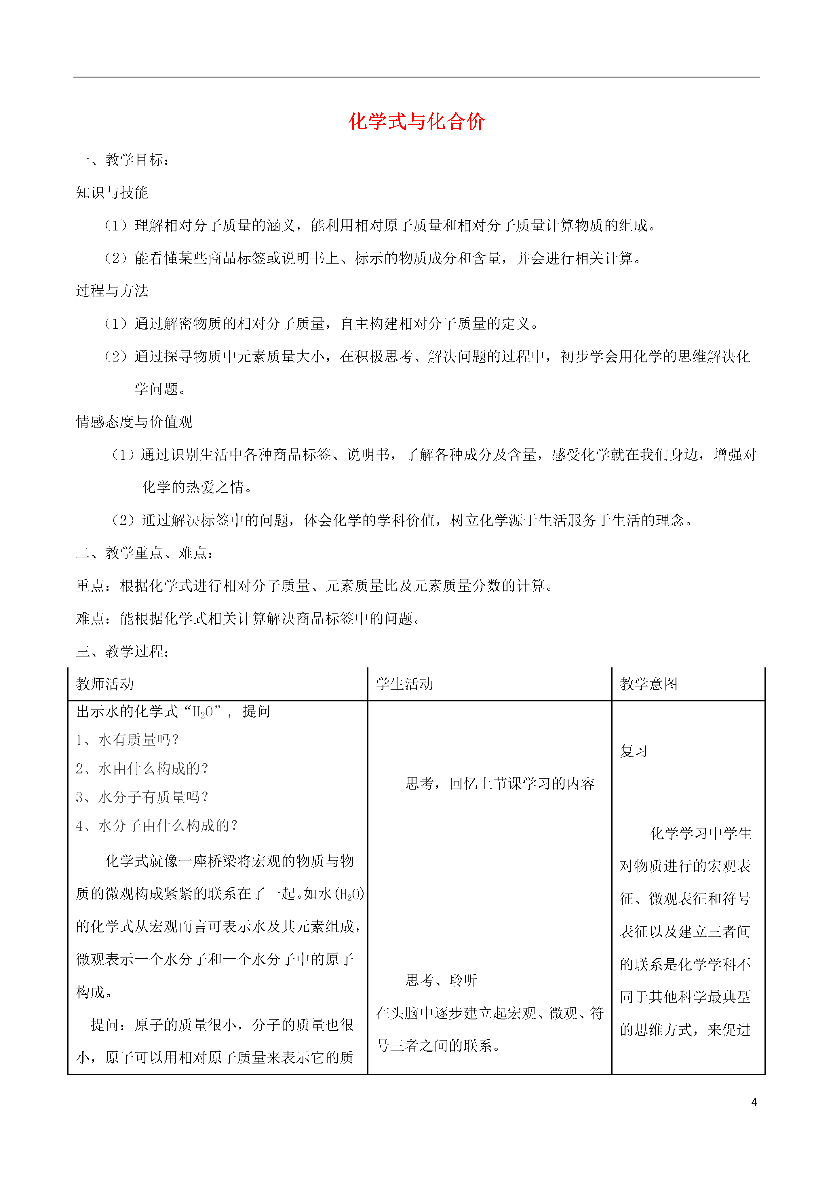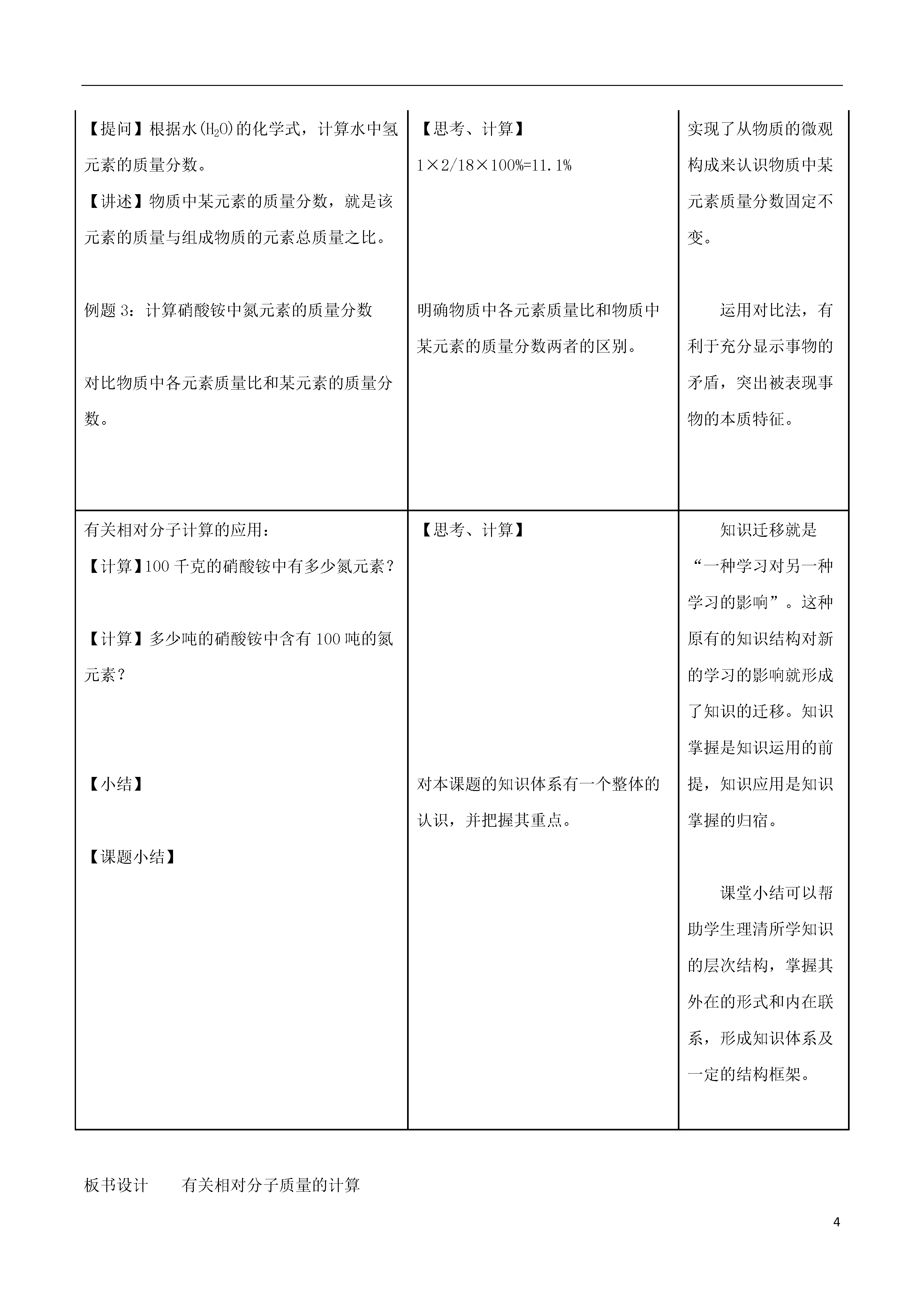4化学式与化合价一、教学目标:知识与技能(1)理解相对分子质量的涵义,能利用相对原子质量和相对分子质量计算物质的组成。(2)能看懂某些商品标签或说明书上、标示的物质成分和含量,并会进行相关计算。过程与方法(1)通过解密物质的相对分子质量,自主构建相对分子质量的定义。(2)通过探寻物质中元素质量大小,在积极思考、解决问题的过程中,初步学会用化学的思维解决化学问题。情感态度与价值观(1)通过识别生活中各种商品标签、说明书,了解各种成分及含量,感受化学就在我们身边,增强对化学的热爱之情。(2)通过解决标签中的问题,体会化学的学科价值,树立化学源于生活服务于生活的理念。二、教学重点、难点:重点:根据化学式进行相对分子质量、元素质量比及元素质量分数的计算。难点:能根据化学式相关计算解决商品标签中的问题。三、教学过程:教师活动学生活动教学意图出示水的化学式“H2O”,提问1、水有质量吗?2、水由什么构成的?3、水分子有质量吗?4、水分子由什么构成的?化学式就像一座桥梁将宏观的物质与物质的微观构成紧紧的联系在了一起。如水(H2O)的化学式从宏观而言可表示水及其元素组成,微观表示一个水分子和一个水分子中的原子构成。提问:原子的质量很小,分子的质量也很小,原子可以用相对原子质量来表示它的质量,那么分子呢?讲述:由于构成水分子的原子种类的确定,就可知相应元素的相对原子质量,H-1、O-16,那你能否根据氢、氧的相对原子质量计算水分子的相对质量?阅读课本的有关内容,找出物质的相对分子质量的表示方法【讲述】化学式中各原子的相对原子质量的总和,就是相对分子质量。(符号Mr)【提问】结合下列物质的化学式,计算其相对分子质量。计算O2、H2O2、Ca(OH)2的相对分子质量【投影】【练习】结合物质二氧化碳和氢氧化钙、高锰酸钾的的化学式,计算其相对分子质量。思考,回忆上节课学习的内容思考、聆听在头脑中逐步建立起宏观、微观、符号三者之间的联系。思考、计算计算各种物质的相对分子质量。阅读课本思考、计算计算各种物质的相对分子质量。复习化学学习中学生对物质进行的宏观表征、微观表征和符号表征以及建立三者间的联系是化学学科不同于其他科学最典型的思维方式,来促进学生建立良好的化学思维方式及认知结构,并帮助学生理解化学学科内在的逻辑结构。结合物质的化学式和计算其相对分子质量,有助于学生顺利完成认知结构的转变,即从物质的微观构成过渡到物质的宏观组成。【提问】根据二氧化碳的化学式,试计算二氧化碳中碳、氧元素的质量比。【提问】上式表示二氧化碳分子中的氢、氧原子质量之比,该比值就等于二氧化碳中碳、氧元素质量之比吗?【练习】计算几种物质的元素的质量比。【提问】根据水(H2O)的化学式,计算水中氢元素的质量分数。【讲述】物质中某元素的质量分数,就是该元素的质量与组成物质的元素总质量之比。例题3:计算硝酸铵中氮元素的质量分数对比物质中各元素质量比和某元素的质量分数。【思考、计算】12︰(16×2)=3︰8【思考、回答】从物质的微观构成分析得出该比值等于二氧化碳中碳、氧元素质量之比。【思考、计算】1×2/18×100%=11.1%明确物质中各元素质量比和物质中某元素的质量分数两者的区别。使学生进一步明确物质三重表征之间的关系,为后续物质组成的定量表示做铺垫。以化学式为桥梁,实现了从物质的微观构成来认识物质中各元素质量比固定不变。以化学式为桥梁,实现了从物质的微观构成来认识物质中某元素质量分数固定不变。运用对比法,有利于充分显示事物的矛盾,突出被表现事物的本质特征。有关相对分子计算的应用:【计算】100千克的硝酸铵中有多少氮元素?【计算】多少吨的硝酸铵中含有100吨的氮元素?【小结】【课题小结】【思考、计算】对本课题的知识体系有一个整体的认识,并把握其重点。知识迁移就是“一种学习对另一种学习的影响”。这种原有的知识结构对新的学习的影响就形成了知识的迁移。知识掌握是知识运用的前提,知识应用是知识掌握的归宿。课堂小结可以帮助学生理清所学知识的层次结构,掌握其外在的形式和内在联系,形成知识体系及一定的结构框架。板书设计有关相对分子质量的计算计算相对分子质量:计算元素的质量比:计算元素的质量分数:计算物质中元素的质量: