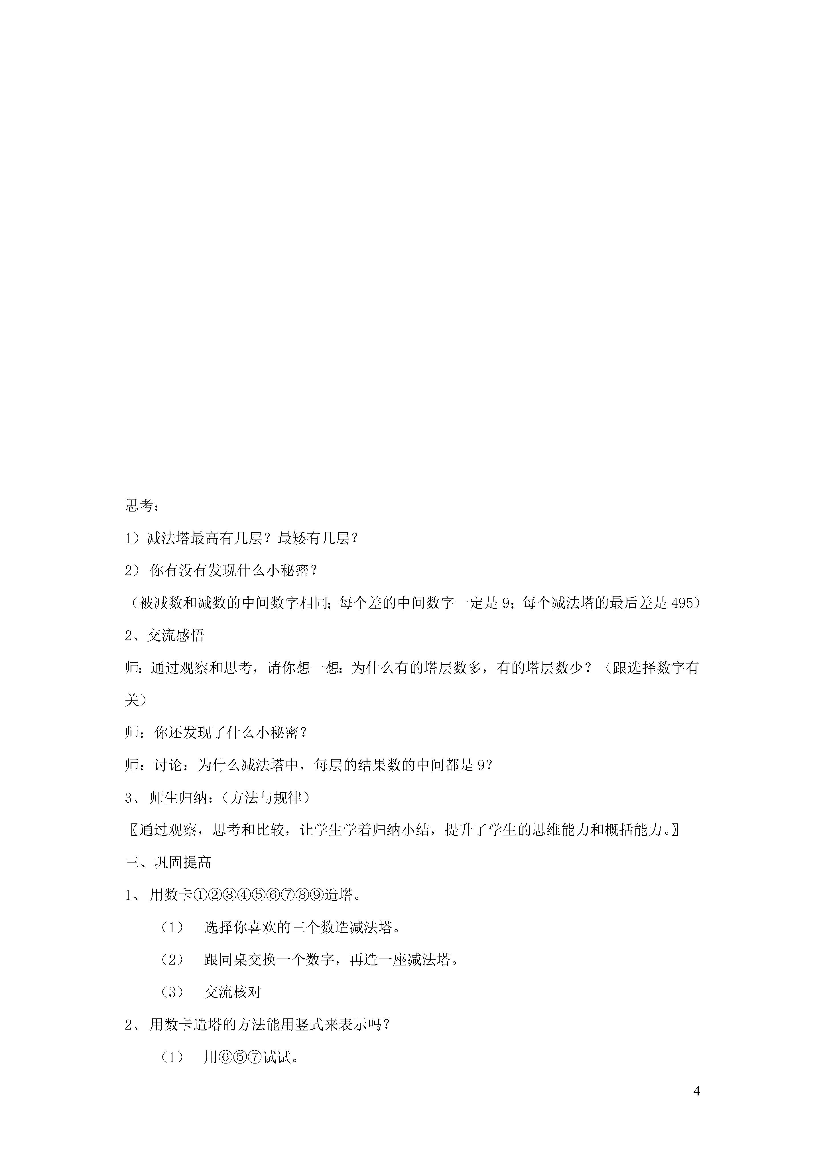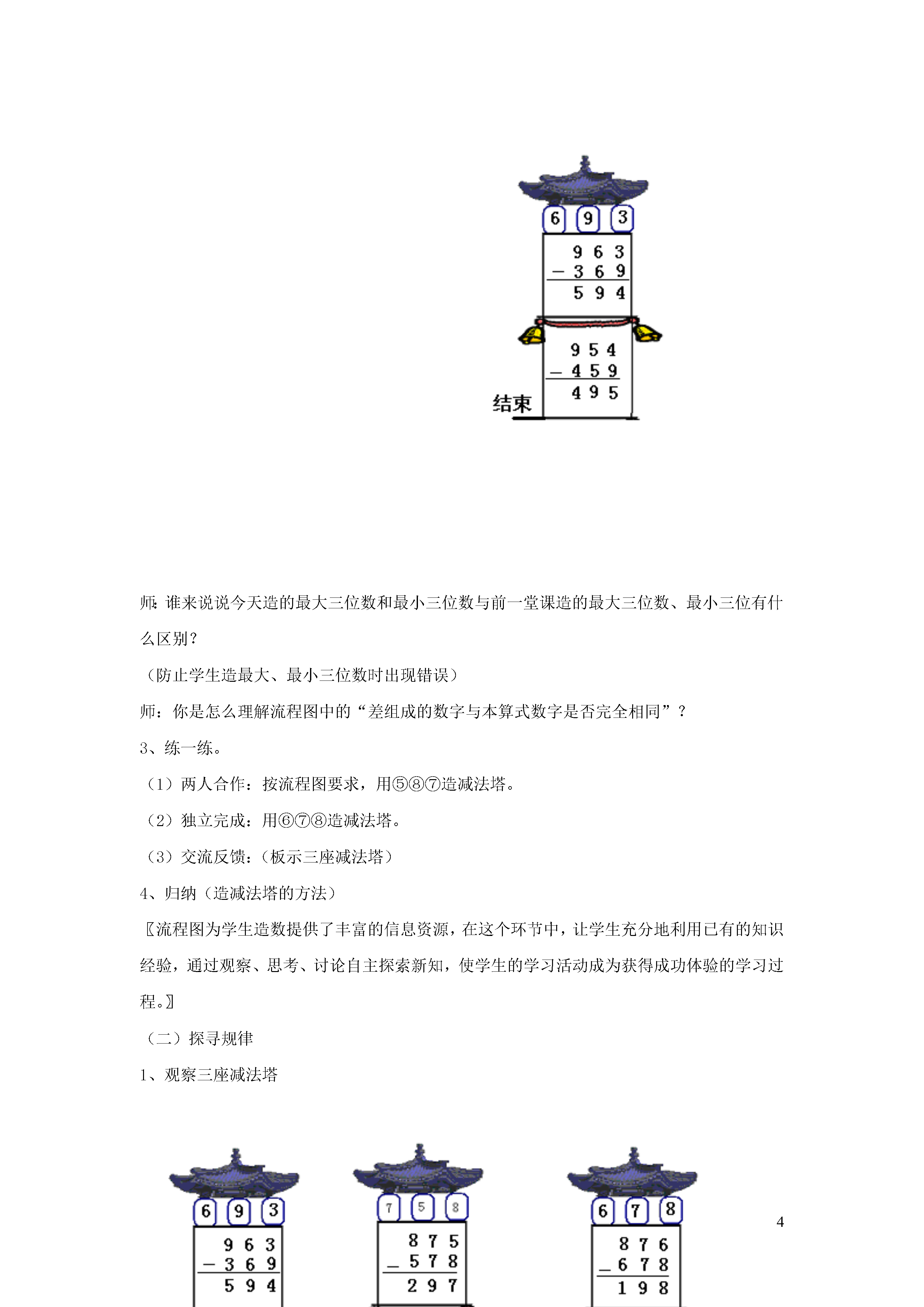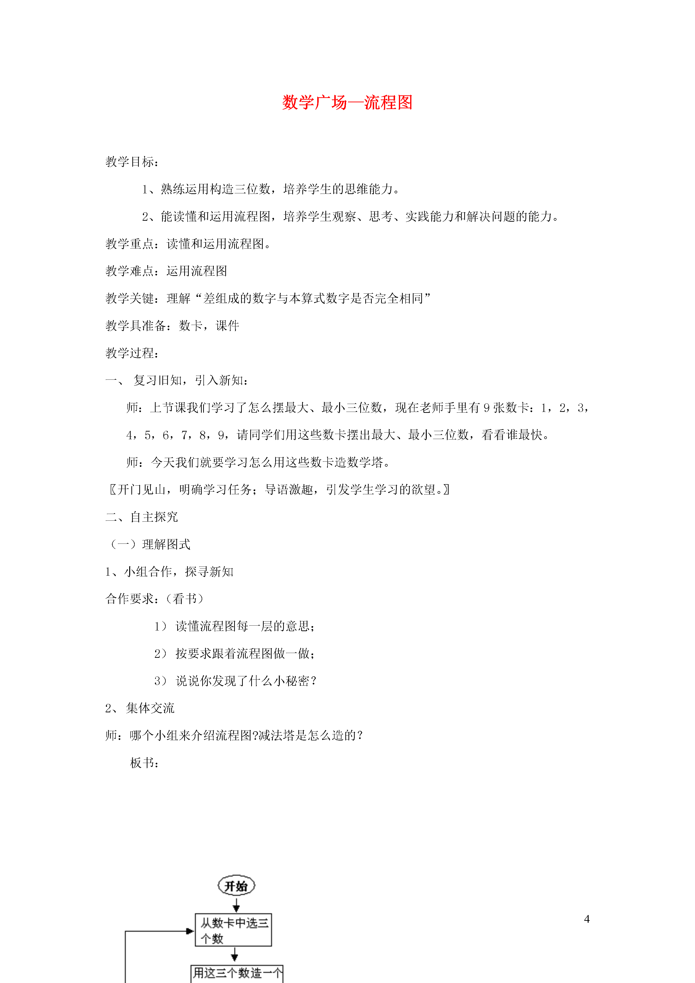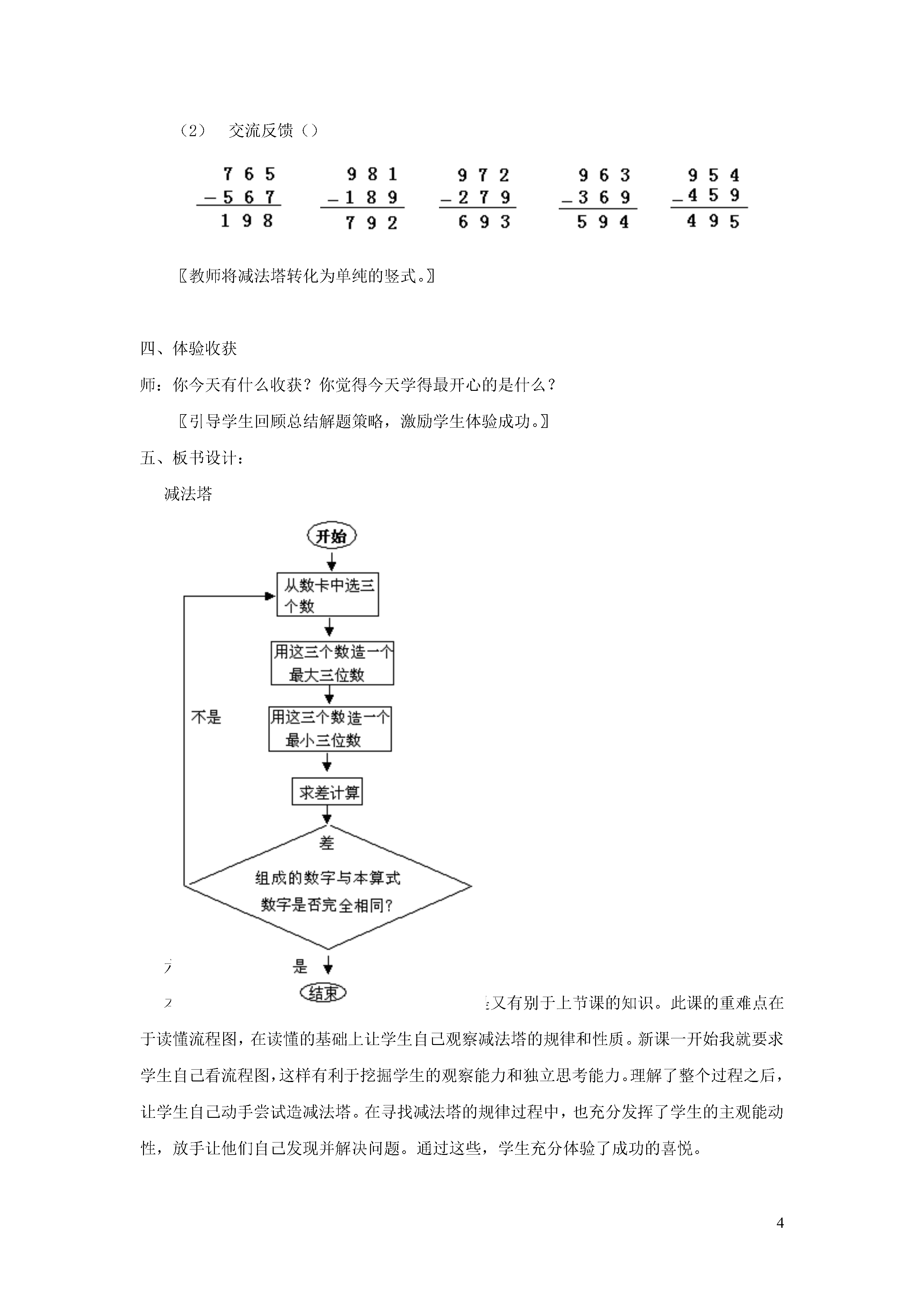 4数学广场—流程图教学目标:1、熟练运用构造三位数,培养学生的思维能力。2、能读懂和运用流程图,培养学生观察、思考、实践能力和解决问题的能力。教学重点:读懂和运用流程图。教学难点:运用流程图教学关键:理解“差组成的数字与本算式数字是否完全相同”教学具准备:数卡,课件教学过程:复习旧知,引入新知:师:上节课我们学习了怎么摆最大、最小三位数,现在老师手里有9张数卡:1,2,3,4,5,6,7,8,9,请同学们用这些数卡摆出最大、最小三位数,看看谁最快。师:今天我们就要学习怎么用这些数卡造数学塔。〖开门见山,明确学习任务;导语激趣,引发学生学习的欲望。〗二、自主探究(一)理解图式1、小组合作,探寻新知合作要求:(看书)读懂流程图每一层的意思;按要求跟着流程图做一做;说说你发现了什么小秘密?集体交流师:哪个小组来介绍流程图?减法塔是怎么造的?板书:师:谁来说说今天造的最大三位数和最小三位数与前一堂课造的最大三位数、最小三位有什么区别?(防止学生造最大、最小三位数时出现错误)师:你是怎么理解流程图中的“差组成的数字与本算式数字是否完全相同”?3、练一练。(1)两人合作:按流程图要求,用⑤⑧⑦造减法塔。(2)独立完成:用⑥⑦⑧造减法塔。(3)交流反馈:(板示三座减法塔)4、归纳(造减法塔的方法)〖流程图为学生造数提供了丰富的信息资源,在这个环节中,让学生充分地利用已有的知识经验,通过观察、思考、讨论自主探索新知,使学生的学习活动成为获得成功体验的学习过程。〗(二)探寻规律1、观察三座减法塔思考:1)减法塔最高有几层?最矮有几层?你有没有发现什么小秘密?(被减数和减数的中间数字相同;每个差的中间数字一定是9;每个减法塔的最后差是495)2、交流感悟师:通过观察和思考,请你想一想:为什么有的塔层数多,有的塔层数少?(跟选择数字有关)师:你还发现了什么小秘密?师:讨论:为什么减法塔中,每层的结果数的中间都是9?师生归纳:(方法与规律)〖通过观察,思考和比较,让学生学着归纳小结,提升了学生的思维能力和概括能力。〗三、巩固提高用数卡①②③④⑤⑥⑦⑧⑨造塔。选择你喜欢的三个数造减法塔。跟同桌交换一个数字,再造一座减法塔。交流核对用数卡造塔的方法能用竖式来表示吗?用⑥⑤⑦试试。交流反馈()〖教师将减法塔转化为单纯的竖式。〗四、体验收获师:你今天有什么收获?你觉得今天学得最开心的是什么?〖引导学生回顾总结解题策略,激励学生体验成功。〗五、板书设计:减法塔六、设计说明:本节课是基于上节课基础上展开的新课,但是又有别于上节课的知识。此课的重难点在于读懂流程图,在读懂的基础上让学生自己观察减法塔的规律和性质。新课一开始我就要求学生自己看流程图,这样有利于挖掘学生的观察能力和独立思考能力。理解了整个过程之后,让学生自己动手尝试造减法塔。在寻找减法塔的规律过程中,也充分发挥了学生的主观能动性,放手让他们自己发现并解决问题。通过这些,学生充分体验了成功的喜悦。
