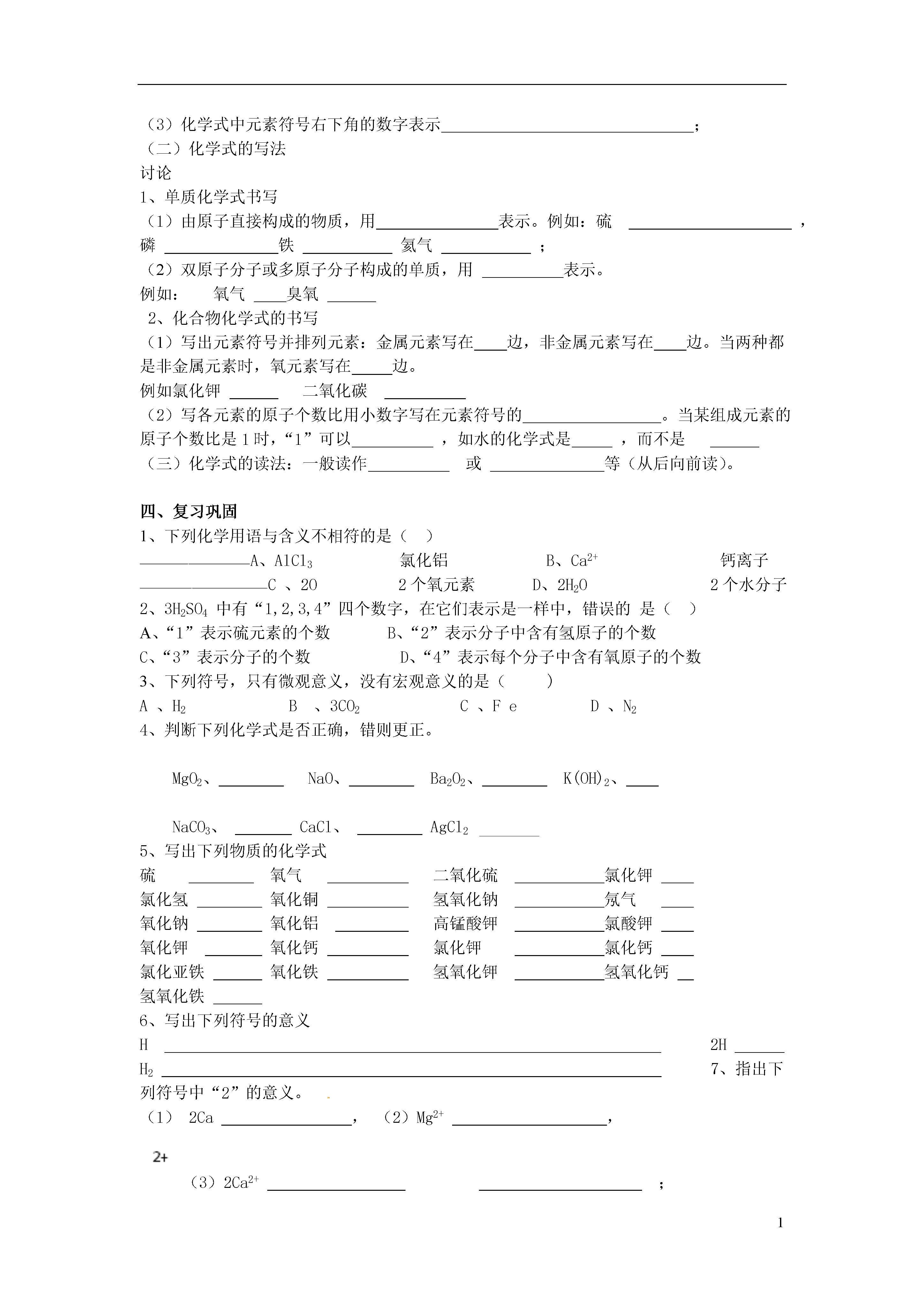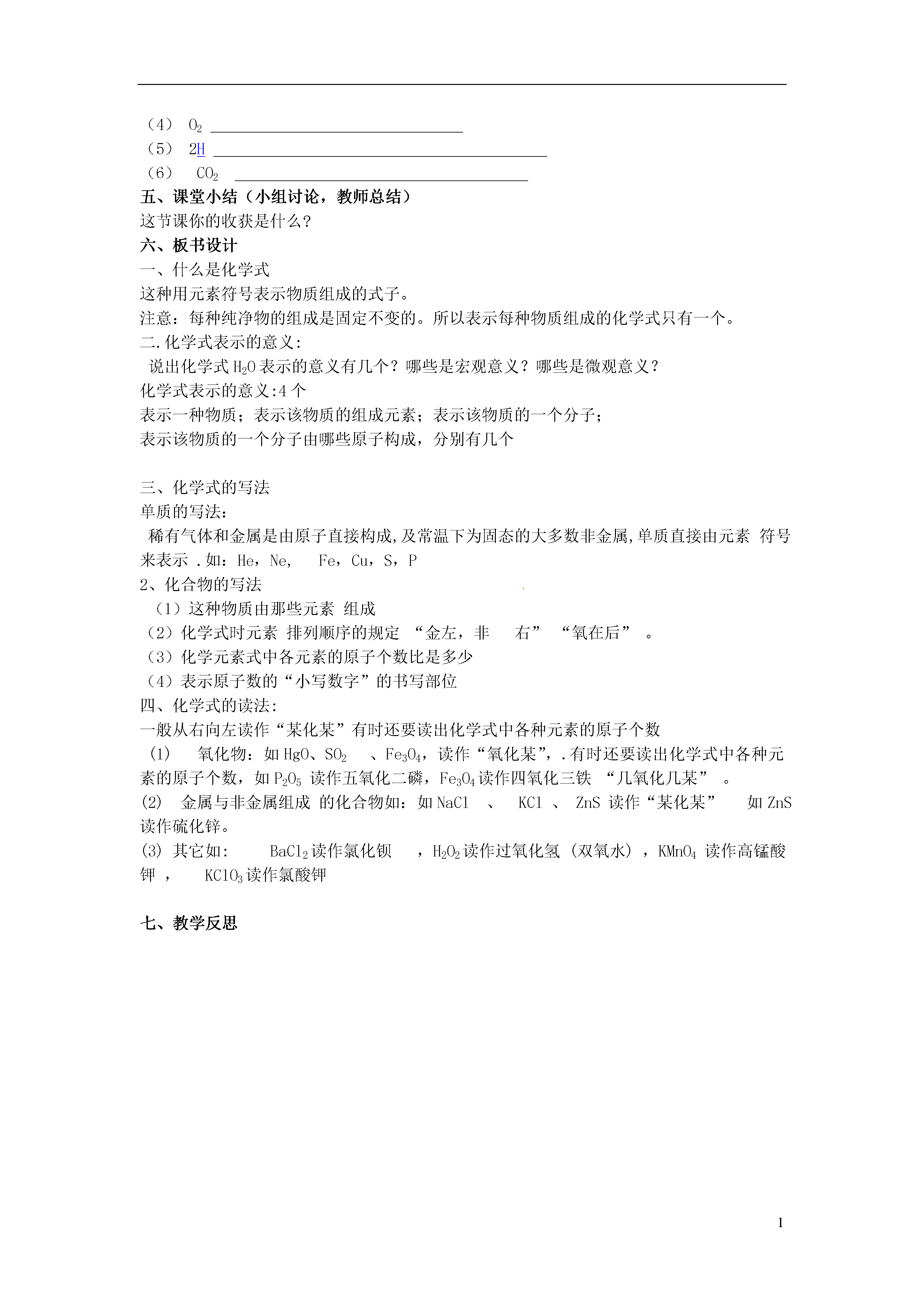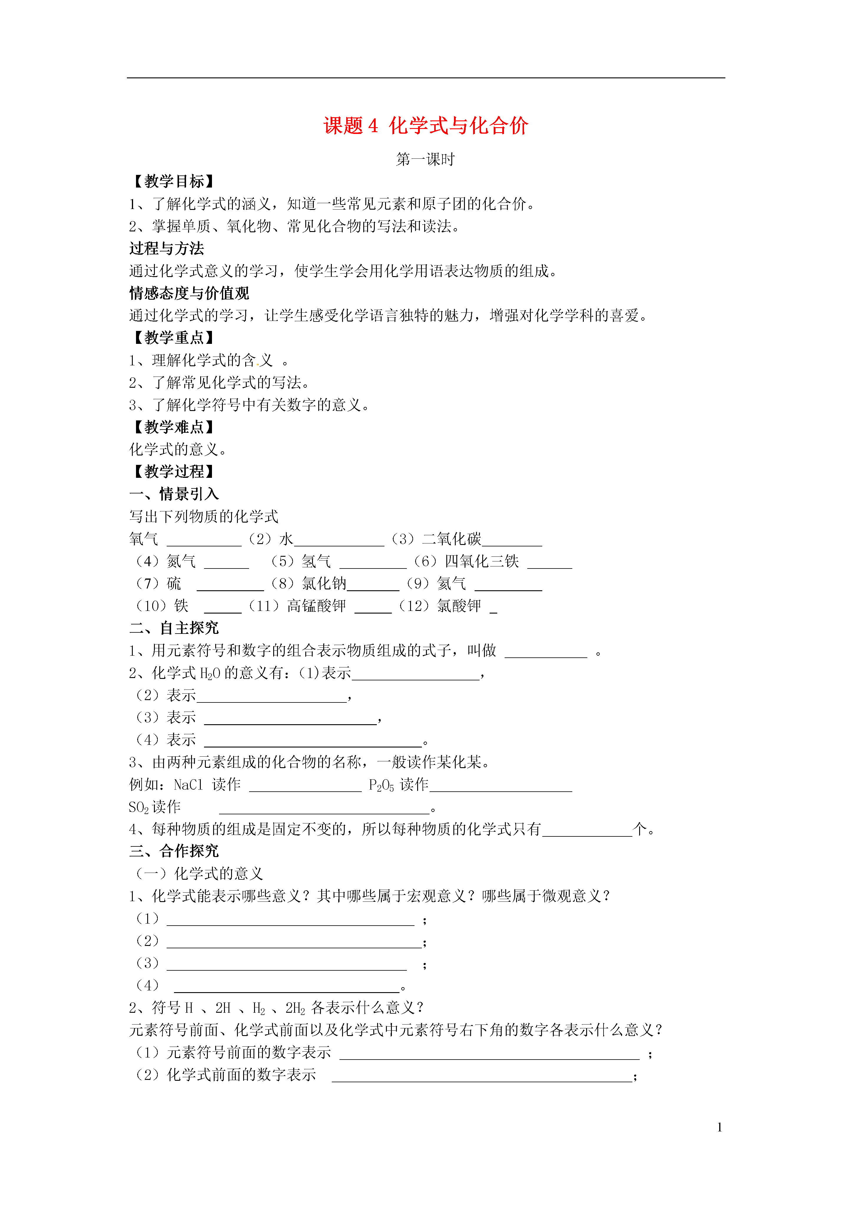 1课题4化学式与化合价第一课时【教学目标】了解化学式的涵义,知道一些常见元素和原子团的化合价。2、掌握单质、氧化物、常见化合物的写法和读法。过程与方法通过化学式意义的学习,使学生学会用化学用语表达物质的组成。情感态度与价值观通过化学式的学习,让学生感受化学语言独特的魅力,增强对化学学科的喜爱。【教学重点】1、理解化学式的含义。2、了解常见化学式的写法。3、了解化学符号中有关数字的意义。【教学难点】化学式的意义。【教学过程】一、情景引入写出下列物质的化学式氧气(2)水(3)二氧化碳氮气(5)氢气(6)四氧化三铁硫(8)氯化钠(9)氦气(10)铁(11)高锰酸钾(12)氯酸钾自主探究1、用元素符号和数字的组合表示物质组成的式子,叫做。2、化学式H2O的意义有:(1)表示,(2)表示,(3)表示,(4)表示。3、由两种元素组成的化合物的名称,一般读作某化某。例如:NaCl读作P2O5读作SO2读作。4、每种物质的组成是固定不变的,所以每种物质的化学式只有个。三、合作探究(一)化学式的意义1、化学式能表示哪些意义?其中哪些属于宏观意义?哪些属于微观意义?(1);(2);(3);(4)。2、符号H、2H、H2、2H2各表示什么意义?元素符号前面、化学式前面以及化学式中元素符号右下角的数字各表示什么意义?(1)元素符号前面的数字表示;(2)化学式前面的数字表示;(3)化学式中元素符号右下角的数字表示;(二)化学式的写法讨论1、单质化学式书写(1)由原子直接构成的物质,用表示。例如:硫,磷铁氦气;双原子分子或多原子分子构成的单质,用表示。例如:氧气臭氧2、化合物化学式的书写写出元素符号并排列元素:金属元素写在边,非金属元素写在边。当两种都是非金属元素时,氧元素写在边。例如氯化钾二氧化碳(2)写各元素的原子个数比用小数字写在元素符号的。当某组成元素的原子个数比是1时,“1”可以,如水的化学式是,而不是(三)化学式的读法:一般读作或等(从后向前读)。复习巩固下列化学用语与含义不相符的是()A、AlCl3氯化铝B、Ca2+钙离子C、2O2个氧元素D、2H2O2个水分子2、3H2SO4中有“1,2,3,4”四个数字,在它们表示是一样中,错误的是()“1”表示硫元素的个数B、“2”表示分子中含有氢原子的个数C、“3”表示分子的个数D、“4”表示每个分子中含有氧原子的个数下列符号,只有微观意义,没有宏观意义的是()A、H2B、3CO2C、FeD、N24、判断下列化学式是否正确,错则更正。MgO2、NaO、Ba2O2、K(OH)2、NaCO3、CaCl、AgCl25、写出下列物质的化学式硫氧气二氧化硫氯化钾氯化氢氧化铜氢氧化钠氖气氧化钠氧化铝高锰酸钾氯酸钾氧化钾氧化钙氯化钾氯化钙氯化亚铁氧化铁氢氧化钾氢氧化钙氢氧化铁6、写出下列符号的意义H2HH27、指出下列符号中“2”的意义。(1)2Ca,(2)Mg2+,(3)2Ca2+;(4)O2(5)2H(6)CO2五、课堂小结(小组讨论,教师总结)这节课你的收获是什么?六、板书设计一、什么是化学式这种用元素符号表示物质组成的式子。注意:每种纯净物的组成是固定不变的。所以表示每种物质组成的化学式只有一个。二.化学式表示的意义:说出化学式H2O表示的意义有几个?哪些是宏观意义?哪些是微观意义?化学式表示的意义:4个表示一种物质;表示该物质的组成元素;表示该物质的一个分子;表示该物质的一个分子由哪些原子构成,分别有几个三、化学式的写法单质的写法:稀有气体和金属是由原子直接构成,及常温下为固态的大多数非金属,单质直接由元素符号来表示.如:He,Ne,Fe,Cu,S,P2、化合物的写法(1)这种物质由那些元素组成(2)化学式时元素排列顺序的规定“金左,非右”“氧在后”。(3)化学元素式中各元素的原子个数比是多少(4)表示原子数的“小写数字”的书写部位四、化学式的读法:一般从右向左读作“某化某”有时还要读出化学式中各种元素的原子个数(1)氧化物:如HgO、SO2、Fe3O4,读作“氧化某”,.有时还要读出化学式中各种元素的原子个数,如P2O5读作五氧化二磷,Fe3O4读作四氧化三铁“几氧化几某”。(2)金属与非金属组成的化合物如:如NaCl、KCl、ZnS读作“某化某”如ZnS读作硫化锌。(3)其它如:BaCl2读作氯化钡,H2O2读作过氧化氢(双氧水),KMnO4读作高锰酸钾,KClO3读作氯酸钾七、教学反思