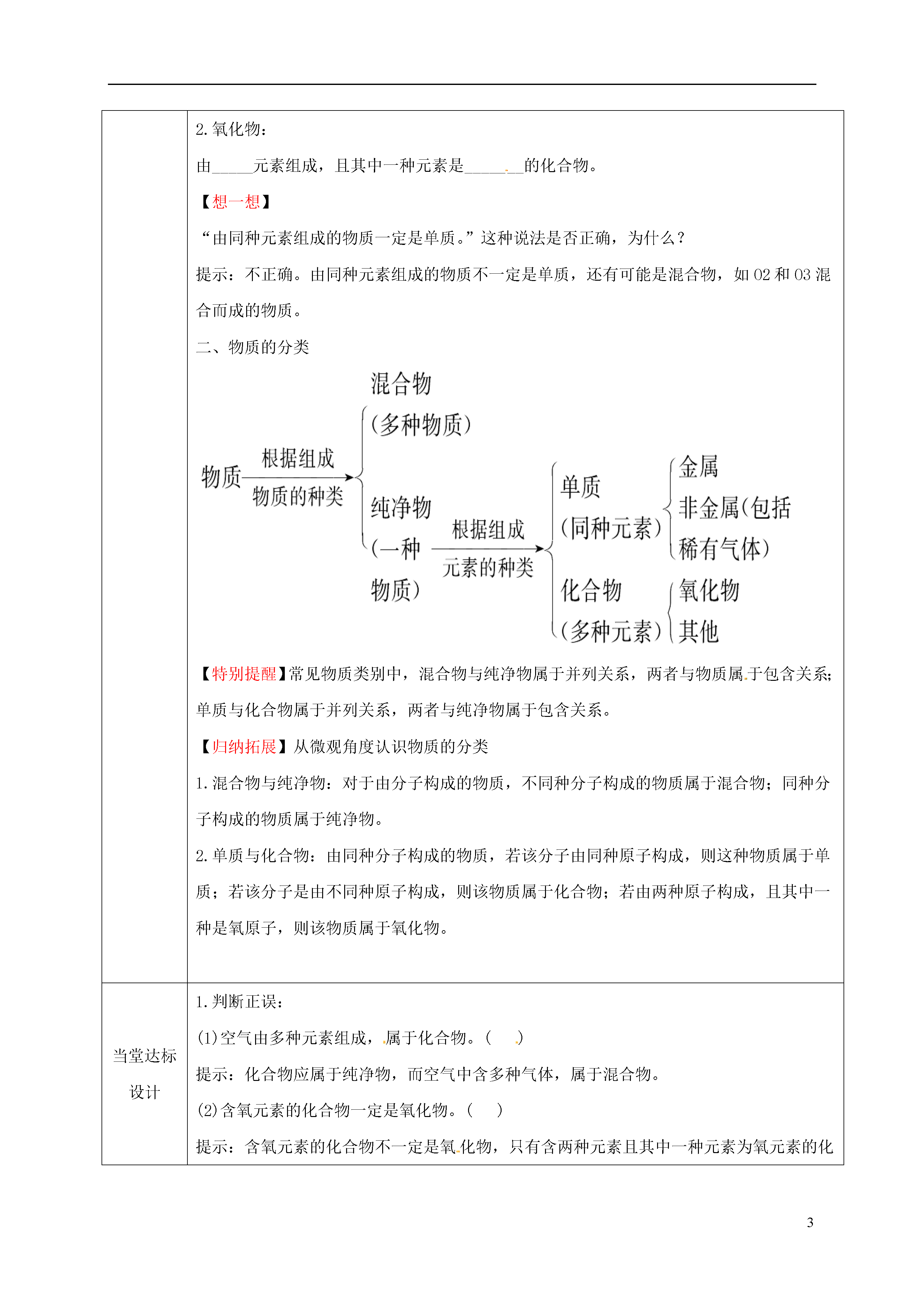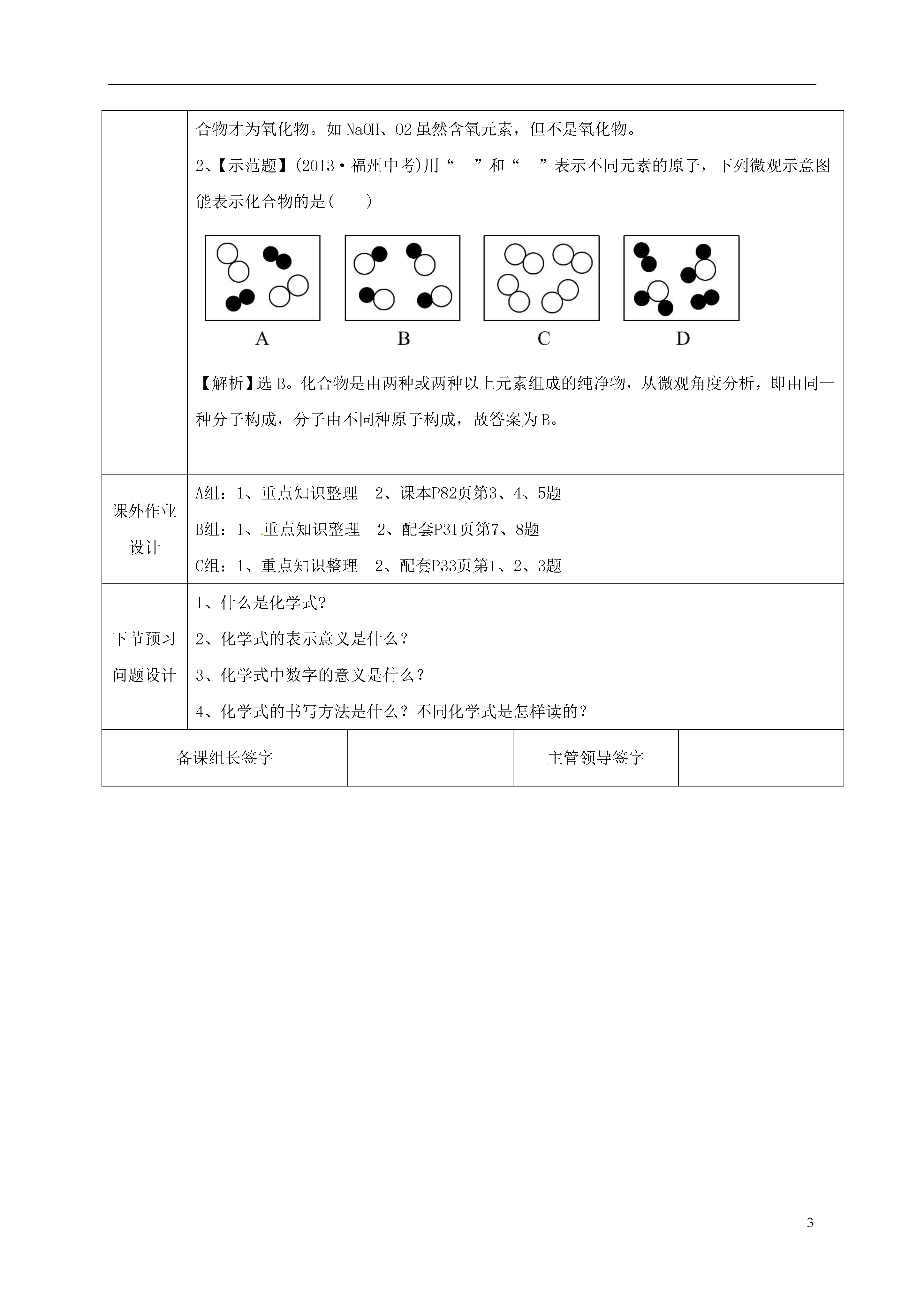 3水的组成本课题课时数1总课时数25教学目标1.知识与能力:知道并区分单质、化合物、氧化物2、过程与方法:充分利用讨论,培养学生观察,分析,归纳实验现象的能力和习惯。3、情感态度价值观:了解人类认识物质世界的过程和方法,培养学生科学探究的精神。教学重难点重点能区分常见的单质、化合物以及氧化物难点对单质、化合物概念的理解问题设计1、试写出学过的一些化学反应的文字表达式中每种物质的化学式。2、什么是单质?什么是化合物?单质和化合物的相同点是什么?不同点又是什么?3、物质的分类4、化合物和氧化物有哪些区别和联系?本节预习检测1、单质、化合物的概念,2、能区分常见的物质中哪些属于单质,哪些属于化合物。3、什么是单质?什么是化合物?单质和化合物的相同点是什么?不同点又是什么?教学过程设计【复习回顾】【新课探究】出示学习目标1、知道单质、化合物的概念,2、能区分常见的物质中哪些属于单质,哪些属于化合物。3、什么是单质?什么是化合物?单质和化合物的相同点是什么?不同点又是什么?4、什么是氧化物?5、化合物和氧化物有哪些区别和联系?二、自学阅读课本81页的内容,尝试完成以下问题:一、化合物、单质和氧化物1.单质与化合物:化合物:组成中含有___________的_______。单质:由_________组成的_______。2.氧化物:由_____元素组成,且其中一种元素是_______的化合物。【想一想】“由同种元素组成的物质一定是单质。”这种说法是否正确,为什么?提示:不正确。由同种元素组成的物质不一定是单质,还有可能是混合物,如O2和O3混合而成的物质。二、物质的分类【特别提醒】常见物质类别中,混合物与纯净物属于并列关系,两者与物质属于包含关系;单质与化合物属于并列关系,两者与纯净物属于包含关系。【归纳拓展】从微观角度认识物质的分类1.混合物与纯净物:对于由分子构成的物质,不同种分子构成的物质属于混合物;同种分子构成的物质属于纯净物。2.单质与化合物:由同种分子构成的物质,若该分子由同种原子构成,则这种物质属于单质;若该分子是由不同种原子构成,则该物质属于化合物;若由两种原子构成,且其中一种是氧原子,则该物质属于氧化物。当堂达标设计1.判断正误:(1)空气由多种元素组成,属于化合物。()提示:化合物应属于纯净物,而空气中含多种气体,属于混合物。(2)含氧元素的化合物一定是氧化物。()提示:含氧元素的化合物不一定是氧化物,只有含两种元素且其中一种元素为氧元素的化合物才为氧化物。如NaOH、O2虽然含氧元素,但不是氧化物。2、【示范题】(2013·福州中考)用“”和“”表示不同元素的原子,下列微观示意图能表示化合物的是()【解析】选B。化合物是由两种或两种以上元素组成的纯净物,从微观角度分析,即由同一种分子构成,分子由不同种原子构成,故答案为B。课外作业设计A组:1、重点知识整理2、课本P82页第3、4、5题B组:1、重点知识整理2、配套P31页第7、8题C组:1、重点知识整理2、配套P33页第1、2、3题下节预习问题设计1、什么是化学式?2、化学式的表示意义是什么?3、化学式中数字的意义是什么?4、化学式的书写方法是什么?不同化学式是怎样读的?备课组长签字主管领导签字