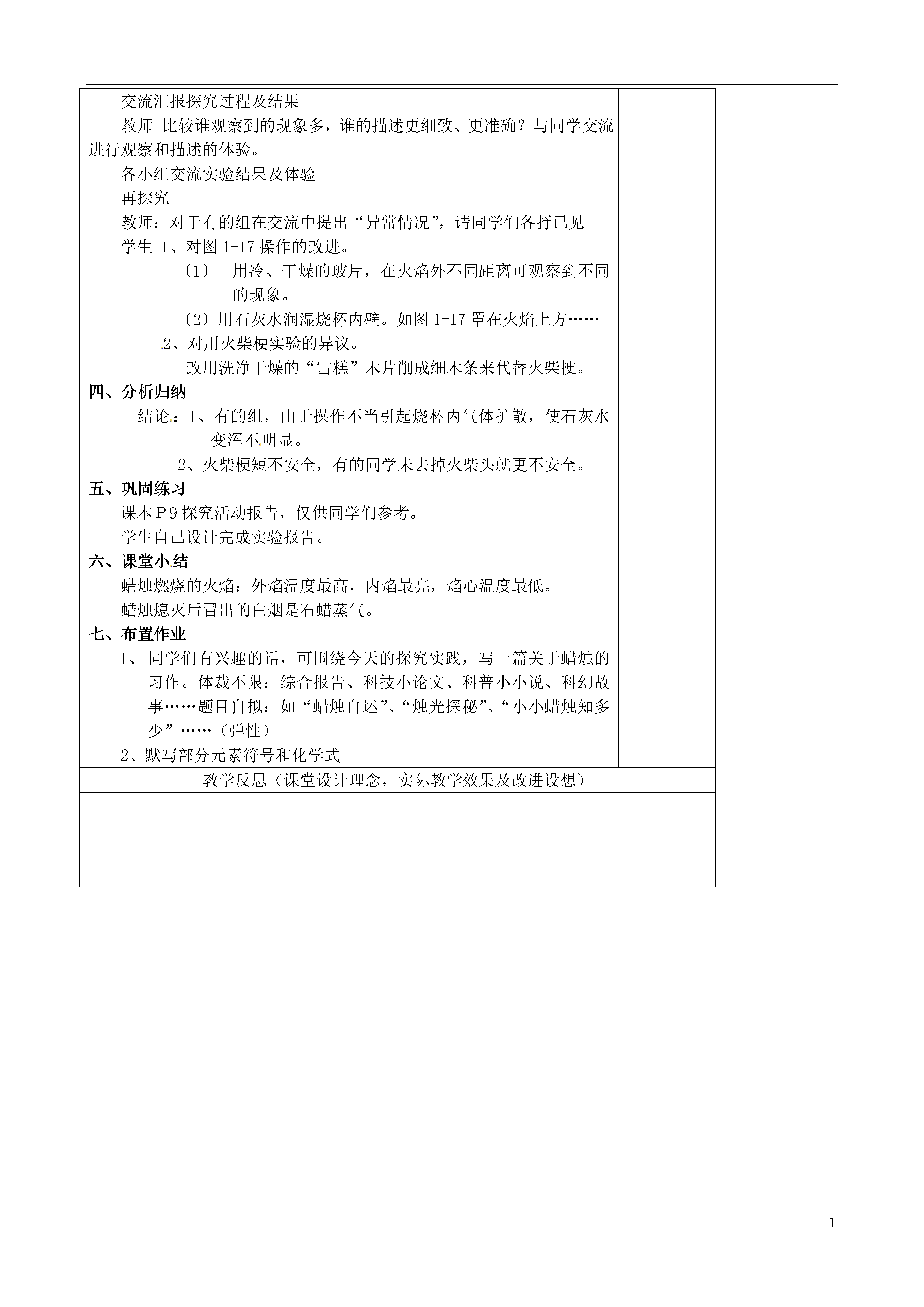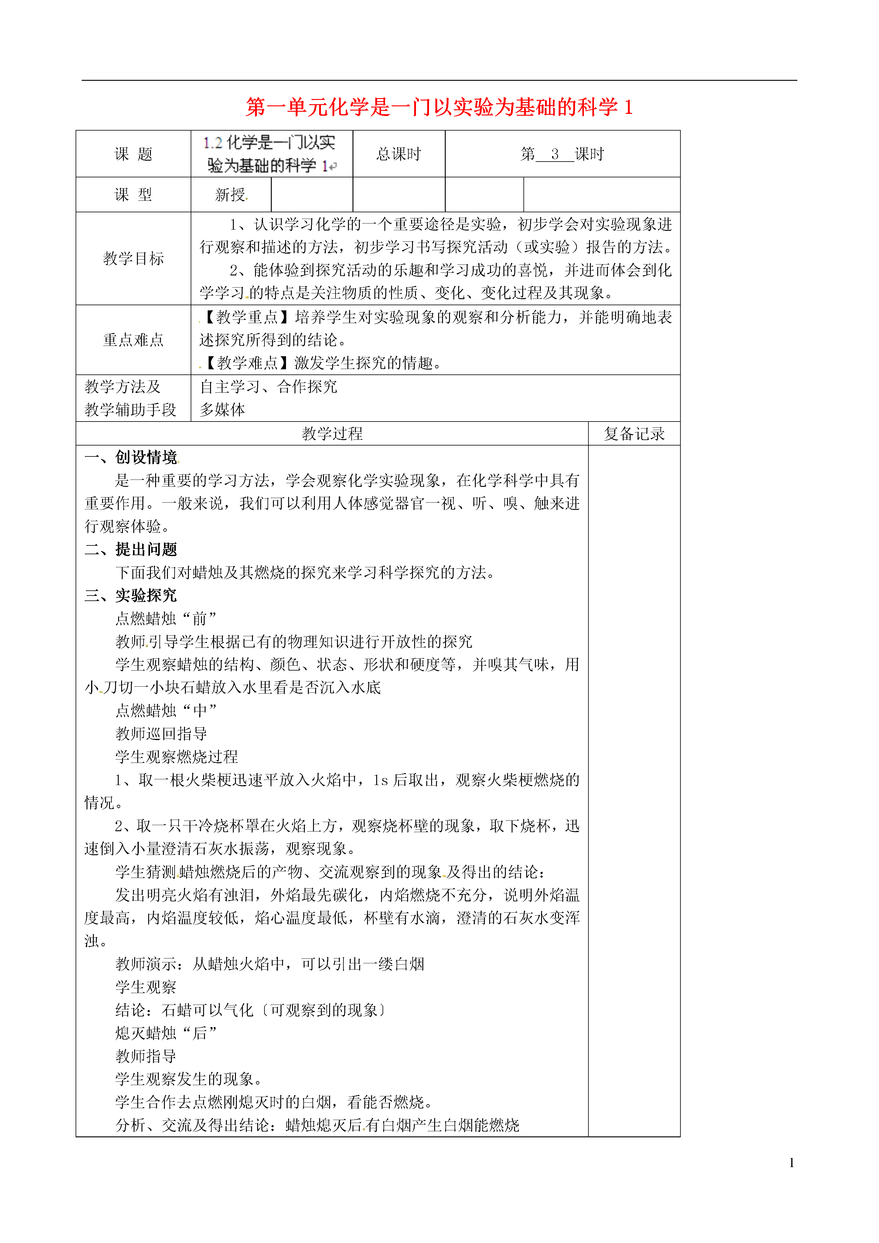 1第一单元化学是一门以实验为基础的科学1课题总课时第3课时课型新授教学目标1、认识学习化学的一个重要途径是实验,初步学会对实验现象进行观察和描述的方法,初步学习书写探究活动(或实验)报告的方法。2、能体验到探究活动的乐趣和学习成功的喜悦,并进而体会到化学学习的特点是关注物质的性质、变化、变化过程及其现象。重点难点【教学重点】培养学生对实验现象的观察和分析能力,并能明确地表述探究所得到的结论。【教学难点】激发学生探究的情趣。教学方法及教学辅助手段自主学习、合作探究多媒体教学过程复备记录一、创设情境是一种重要的学习方法,学会观察化学实验现象,在化学科学中具有重要作用。一般来说,我们可以利用人体感觉器官一视、听、嗅、触来进行观察体验。二、提出问题下面我们对蜡烛及其燃烧的探究来学习科学探究的方法。三、实验探究点燃蜡烛“前”教师引导学生根据已有的物理知识进行开放性的探究学生观察蜡烛的结构、颜色、状态、形状和硬度等,并嗅其气味,用小刀切一小块石蜡放入水里看是否沉入水底点燃蜡烛“中”教师巡回指导学生观察燃烧过程1、取一根火柴梗迅速平放入火焰中,1s后取出,观察火柴梗燃烧的情况。2、取一只干冷烧杯罩在火焰上方,观察烧杯壁的现象,取下烧杯,迅速倒入小量澄清石灰水振荡,观察现象。学生猜测蜡烛燃烧后的产物、交流观察到的现象及得出的结论:发出明亮火焰有浊泪,外焰最先碳化,内焰燃烧不充分,说明外焰温度最高,内焰温度较低,焰心温度最低,杯壁有水滴,澄清的石灰水变浑浊。教师演示:从蜡烛火焰中,可以引出一缕白烟学生观察结论:石蜡可以气化〔可观察到的现象〕熄灭蜡烛“后”教师指导学生观察发生的现象。学生合作去点燃刚熄灭时的白烟,看能否燃烧。分析、交流及得出结论:蜡烛熄灭后有白烟产生白烟能燃烧交流汇报探究过程及结果教师比较谁观察到的现象多,谁的描述更细致、更准确?与同学交流进行观察和描述的体验。各小组交流实验结果及体验再探究教师:对于有的组在交流中提出“异常情况”,请同学们各抒已见学生1、对图1-17操作的改进。用冷、干燥的玻片,在火焰外不同距离可观察到不同的现象。〔2〕用石灰水润湿烧杯内壁。如图1-17罩在火焰上方……2、对用火柴梗实验的异议。改用洗净干燥的“雪糕”木片削成细木条来代替火柴梗。四、分析归纳结论:1、有的组,由于操作不当引起烧杯内气体扩散,使石灰水变浑不明显。2、火柴梗短不安全,有的同学未去掉火柴头就更不安全。五、巩固练习课本P9探究活动报告,仅供同学们参考。学生自己设计完成实验报告。六、课堂小结蜡烛燃烧的火焰:外焰温度最高,内焰最亮,焰心温度最低。蜡烛熄灭后冒出的白烟是石蜡蒸气。七、布置作业同学们有兴趣的话,可围绕今天的探究实践,写一篇关于蜡烛的习作。体裁不限:综合报告、科技小论文、科普小小说、科幻故事……题目自拟:如“蜡烛自述”、“烛光探秘”、“小小蜡烛知多少”……(弹性)2、默写部分元素符号和化学式教学反思(课堂设计理念,实际教学效果及改进设想)