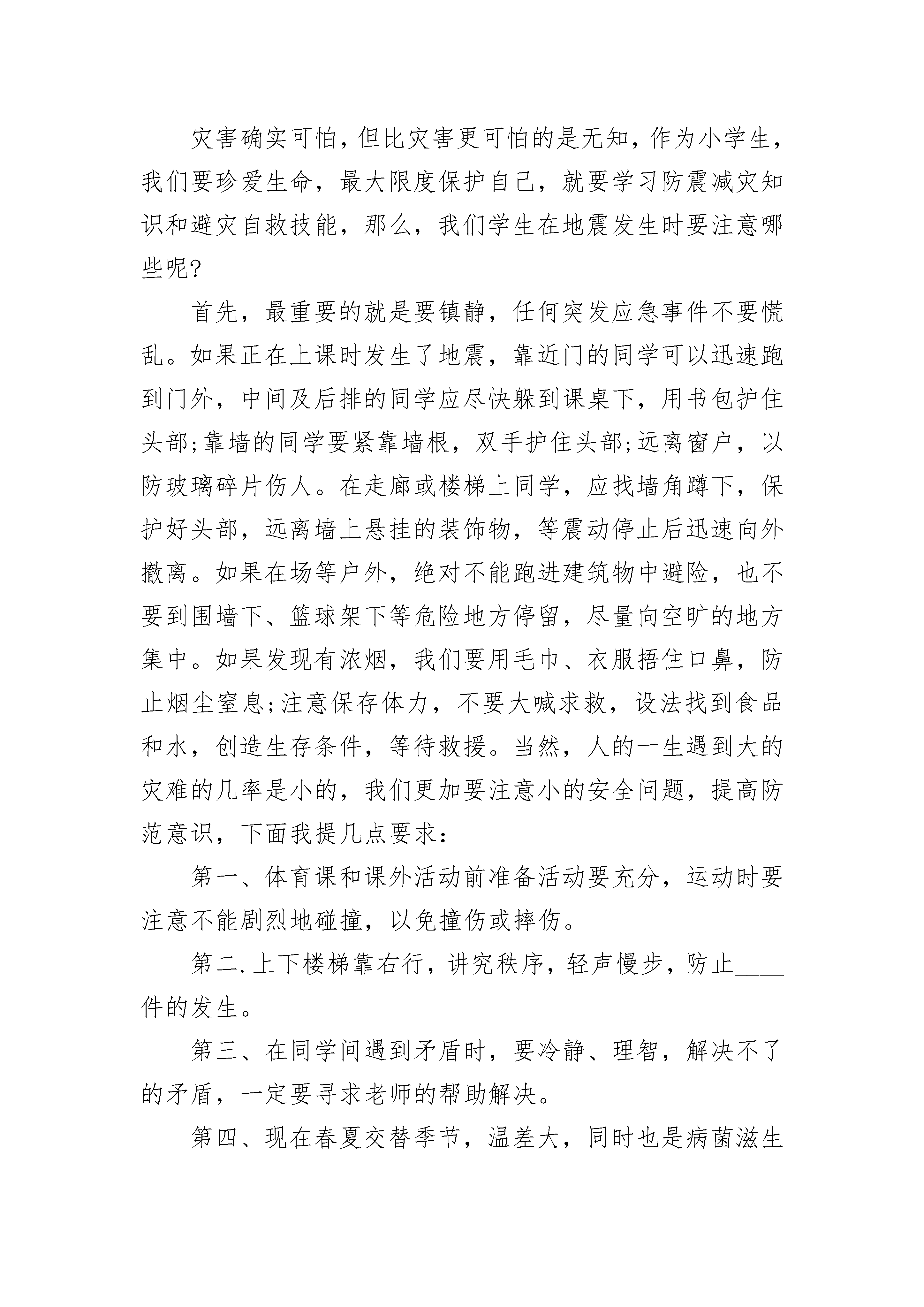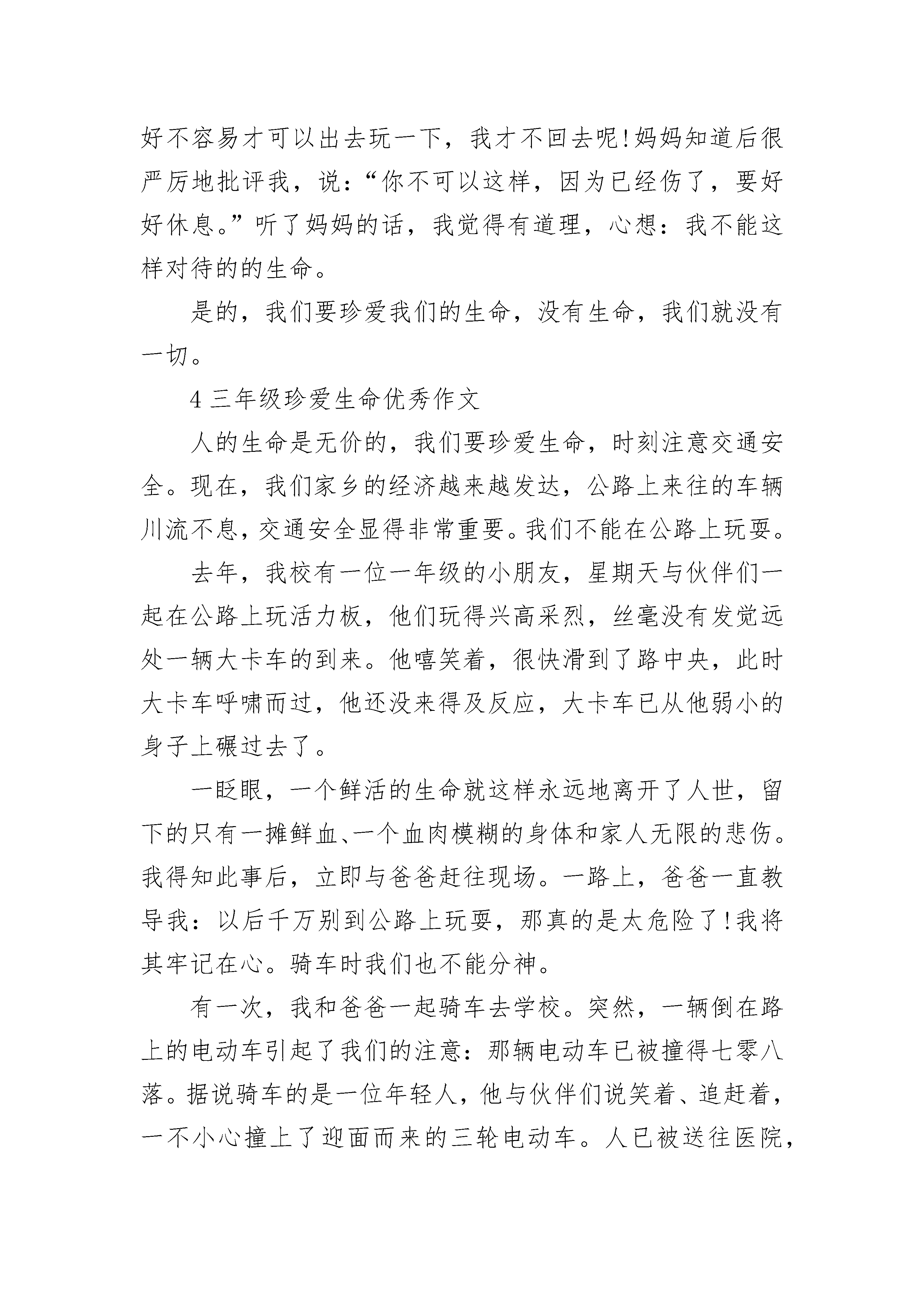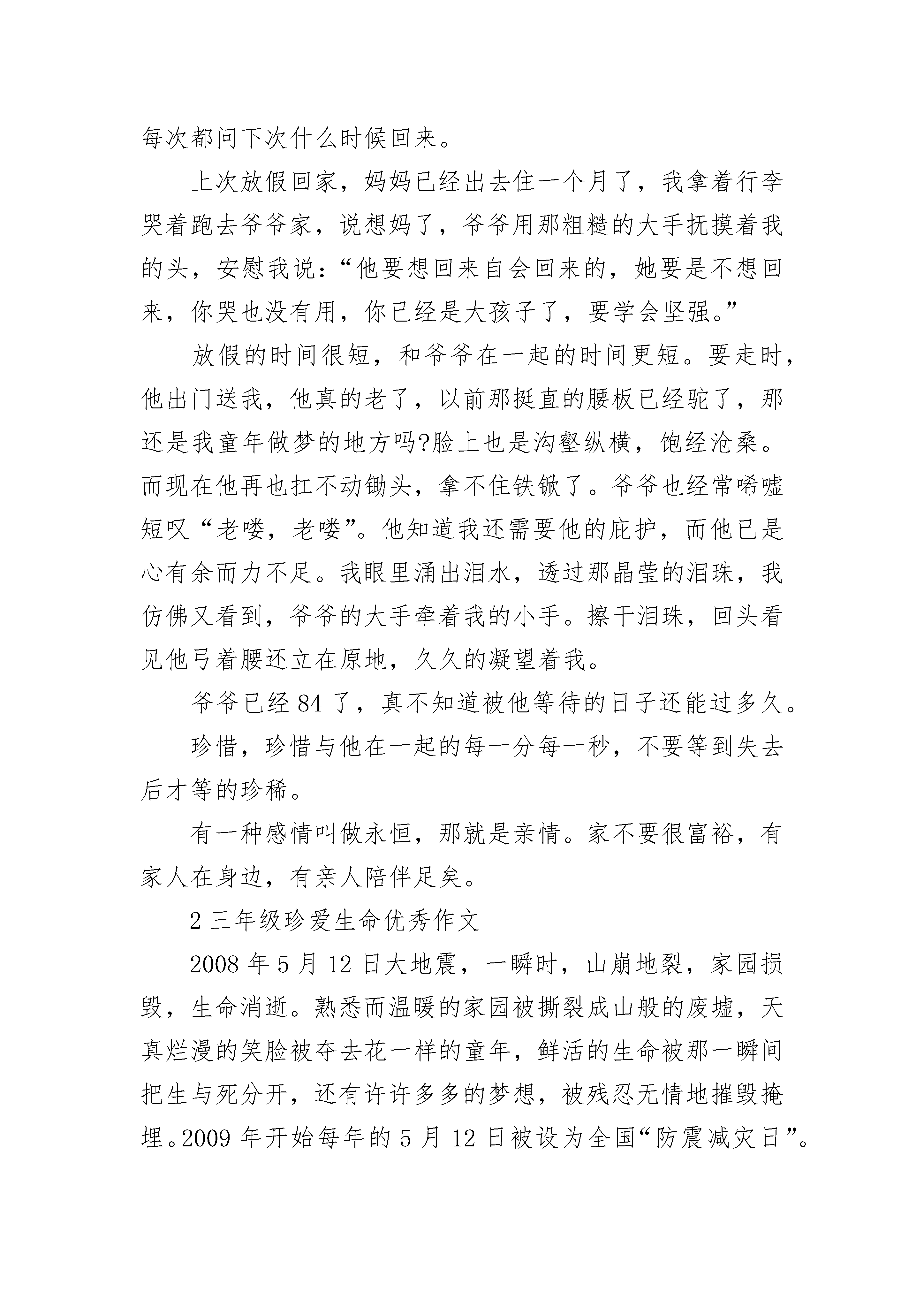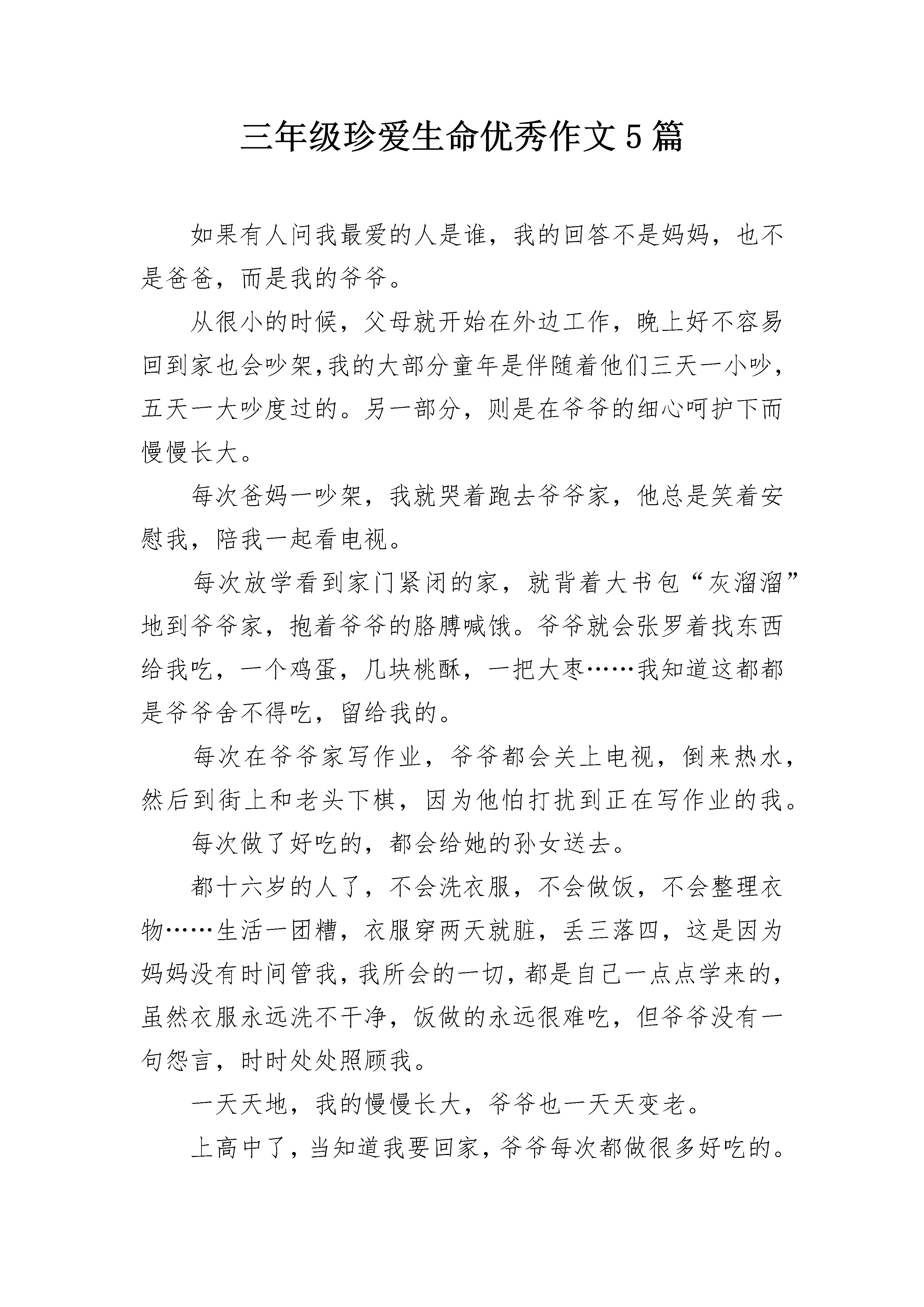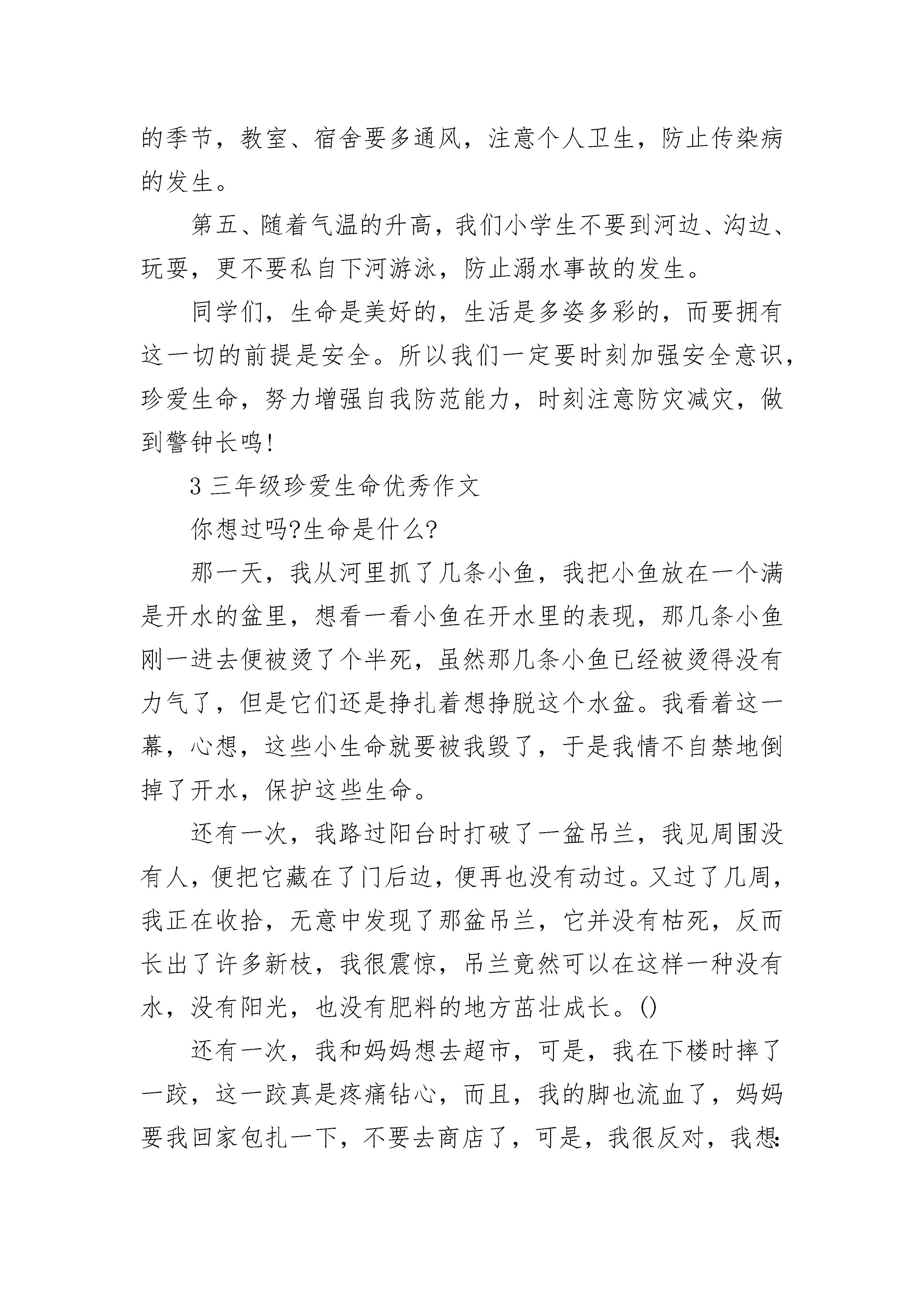 三年级珍爱生命优秀作文5篇如果有人问我最爱的人是谁,我的回答不是妈妈,也不是爸爸,而是我的爷爷。从很小的时候,父母就开始在外边工作,晚上好不容易回到家也会吵架,我的大部分童年是伴随着他们三天一小吵,五天一大吵度过的。另一部分,则是在爷爷的细心呵护下而慢慢长大。每次爸妈一吵架,我就哭着跑去爷爷家,他总是笑着安慰我,陪我一起看电视。每次放学看到家门紧闭的家,就背着大书包“灰溜溜”地到爷爷家,抱着爷爷的胳膊喊饿。爷爷就会张罗着找东西给我吃,一个鸡蛋,几块桃酥,一把大枣……我知道这都都是爷爷舍不得吃,留给我的。每次在爷爷家写作业,爷爷都会关上电视,倒来热水,然后到街上和老头下棋,因为他怕打扰到正在写作业的我。每次做了好吃的,都会给她的孙女送去。都十六岁的人了,不会洗衣服,不会做饭,不会整理衣物……生活一团糟,衣服穿两天就脏,丢三落四,这是因为妈妈没有时间管我,我所会的一切,都是自己一点点学来的,虽然衣服永远洗不干净,饭做的永远很难吃,但爷爷没有一句怨言,时时处处照顾我。一天天地,我的慢慢长大,爷爷也一天天变老。上高中了,当知道我要回家,爷爷每次都做很多好吃的。每次都问下次什么时候回来。上次放假回家,妈妈已经出去住一个月了,我拿着行李哭着跑去爷爷家,说想妈了,爷爷用那粗糙的大手抚摸着我的头,安慰我说:“他要想回来自会回来的,她要是不想回来,你哭也没有用,你已经是大孩子了,要学会坚强。”放假的时间很短,和爷爷在一起的时间更短。要走时,他出门送我,他真的老了,以前那挺直的腰板已经驼了,那还是我童年做梦的地方吗?脸上也是沟壑纵横,饱经沧桑。而现在他再也扛不动锄头,拿不住铁锨了。爷爷也经常唏嘘短叹“老喽,老喽”。他知道我还需要他的庇护,而他已是心有余而力不足。我眼里涌出泪水,透过那晶莹的泪珠,我仿佛又看到,爷爷的大手牵着我的小手。擦干泪珠,回头看见他弓着腰还立在原地,久久的凝望着我。爷爷已经84了,真不知道被他等待的日子还能过多久。珍惜,珍惜与他在一起的每一分每一秒,不要等到失去后才等的珍稀。有一种感情叫做永恒,那就是亲情。家不要很富裕,有家人在身边,有亲人陪伴足矣。2三年级珍爱生命优秀作文2008年5月12日大地震,一瞬时,山崩地裂,家园损毁,生命消逝。熟悉而温暖的家园被撕裂成山般的废墟,天真烂漫的笑脸被夺去花一样的童年,鲜活的生命被那一瞬间把生与死分开,还有许许多多的梦想,被残忍无情地摧毁掩埋。2009年开始每年的5月12日被设为全国“防震减灾日”。灾害确实可怕,但比灾害更可怕的是无知,作为小学生,我们要珍爱生命,最大限度保护自己,就要学习防震减灾知识和避灾自救技能,那么,我们学生在地震发生时要注意哪些呢?首先,最重要的就是要镇静,任何突发应急事件不要慌乱。如果正在上课时发生了地震,靠近门的同学可以迅速跑到门外,中间及后排的同学应尽快躲到课桌下,用书包护住头部;靠墙的同学要紧靠墙根,双手护住头部;远离窗户,以防玻璃碎片伤人。在走廊或楼梯上同学,应找墙角蹲下,保护好头部,远离墙上悬挂的装饰物,等震动停止后迅速向外撤离。如果在场等户外,绝对不能跑进建筑物中避险,也不要到围墙下、篮球架下等危险地方停留,尽量向空旷的地方集中。如果发现有浓烟,我们要用毛巾、衣服捂住口鼻,防止烟尘窒息;注意保存体力,不要大喊求救,设法找到食品和水,创造生存条件,等待救援。当然,人的一生遇到大的灾难的几率是小的,我们更加要注意小的安全问题,提高防范意识,下面我提几点要求:第一、体育课和课外活动前准备活动要充分,运动时要注意不能剧烈地碰撞,以免撞伤或摔伤。第二.上下楼梯靠右行,讲究秩序,轻声慢步,防止____件的发生。第三、在同学间遇到矛盾时,要冷静、理智,解决不了的矛盾,一定要寻求老师的帮助解决。第四、现在春夏交替季节,温差大,同时也是病菌滋生的季节,教室、宿舍要多通风,注意个人卫生,防止传染病的发生。第五、随着气温的升高,我们小学生不要到河边、沟边、玩耍,更不要私自下河游泳,防止溺水事故的发生。同学们,生命是美好的,生活是多姿多彩的,而要拥有这一切的前提是安全。所以我们一定要时刻加强安全意识,珍爱生命,努力增强自我防范能力,时刻注意防灾减灾,做到警钟长鸣!3三年级珍爱生命优秀作文你想过吗?生命是什么?那一天,我从河里抓了几条小鱼,我把小鱼放在一个满是开水的盆里,想看一看小鱼在开水里的表现,那几条小鱼刚一进去便被烫了个半死,虽然那几条小鱼已经被烫得没有力气了,但是它们还是挣扎着想挣脱这个水盆。我看着这一幕,心想,这些小生命就要被我毁了,于是我情不自禁地倒掉了开水,保护这些生命。还有一次,我路过阳台时打破了一盆吊兰,我见周围没有人,便把它藏在了门后边,便再也没有动过。又过了几周,我正在收拾,无意中发现了那盆吊兰,它并没有枯死,反而长出了许多新枝,我很震惊,吊兰竟然可以