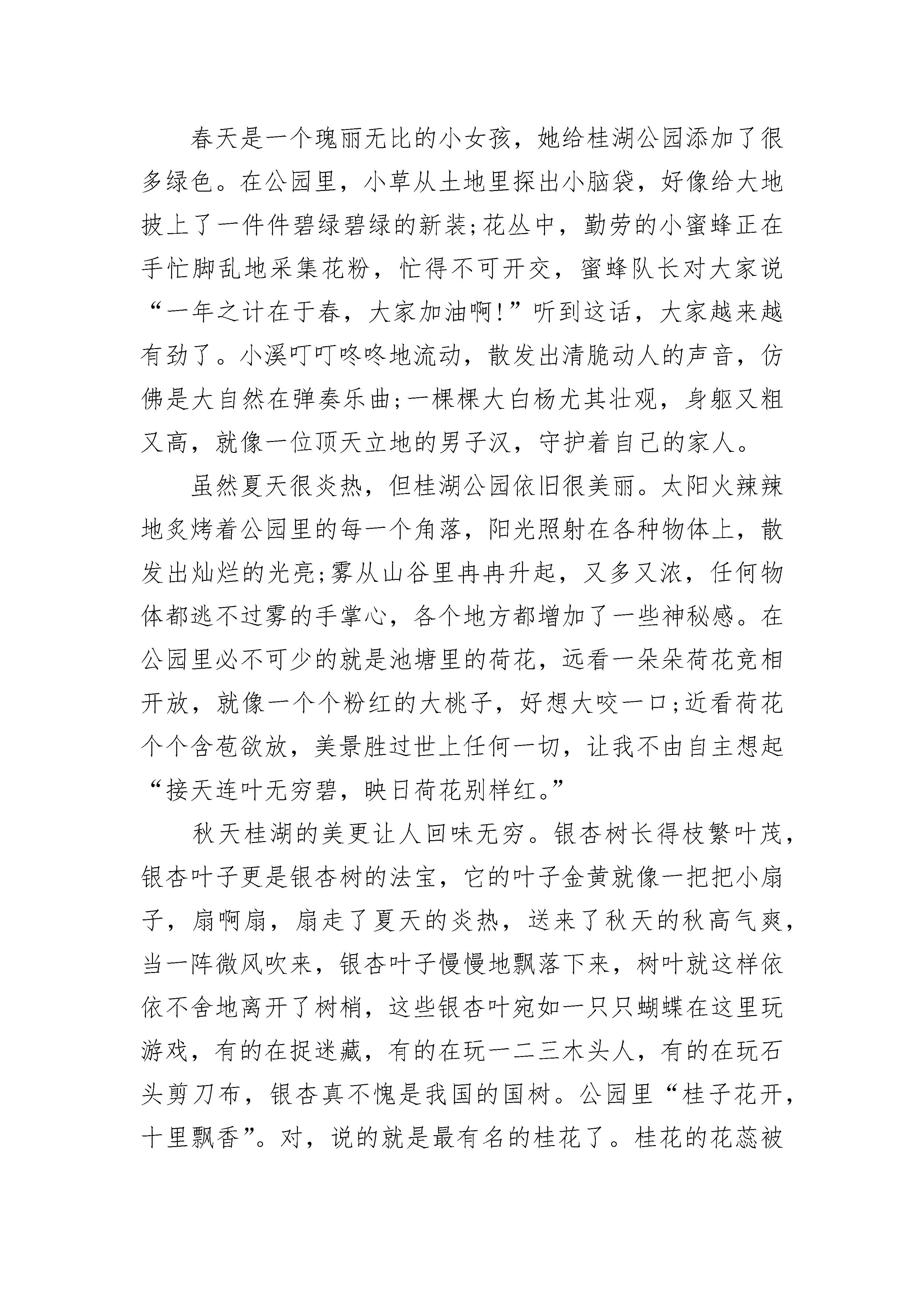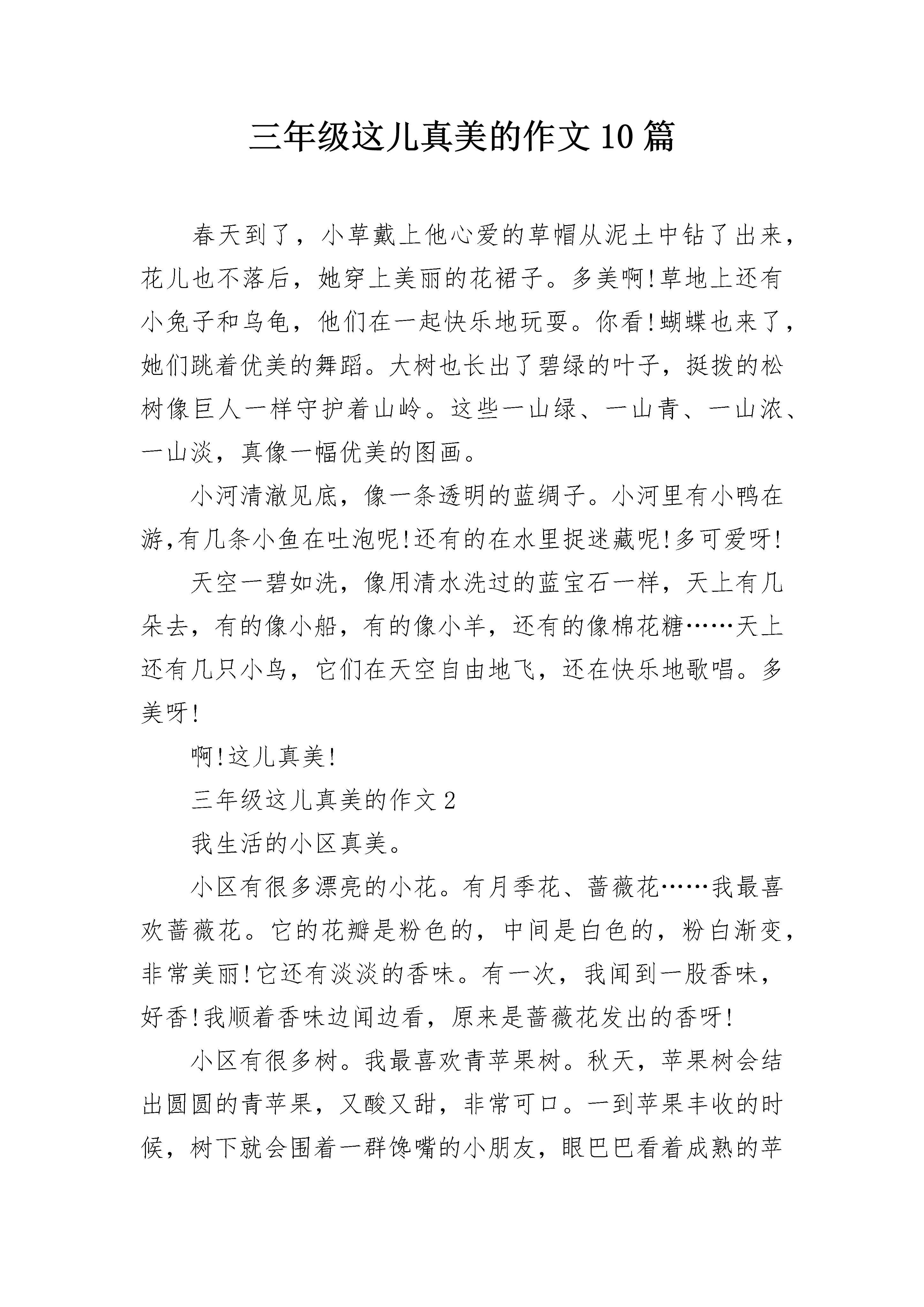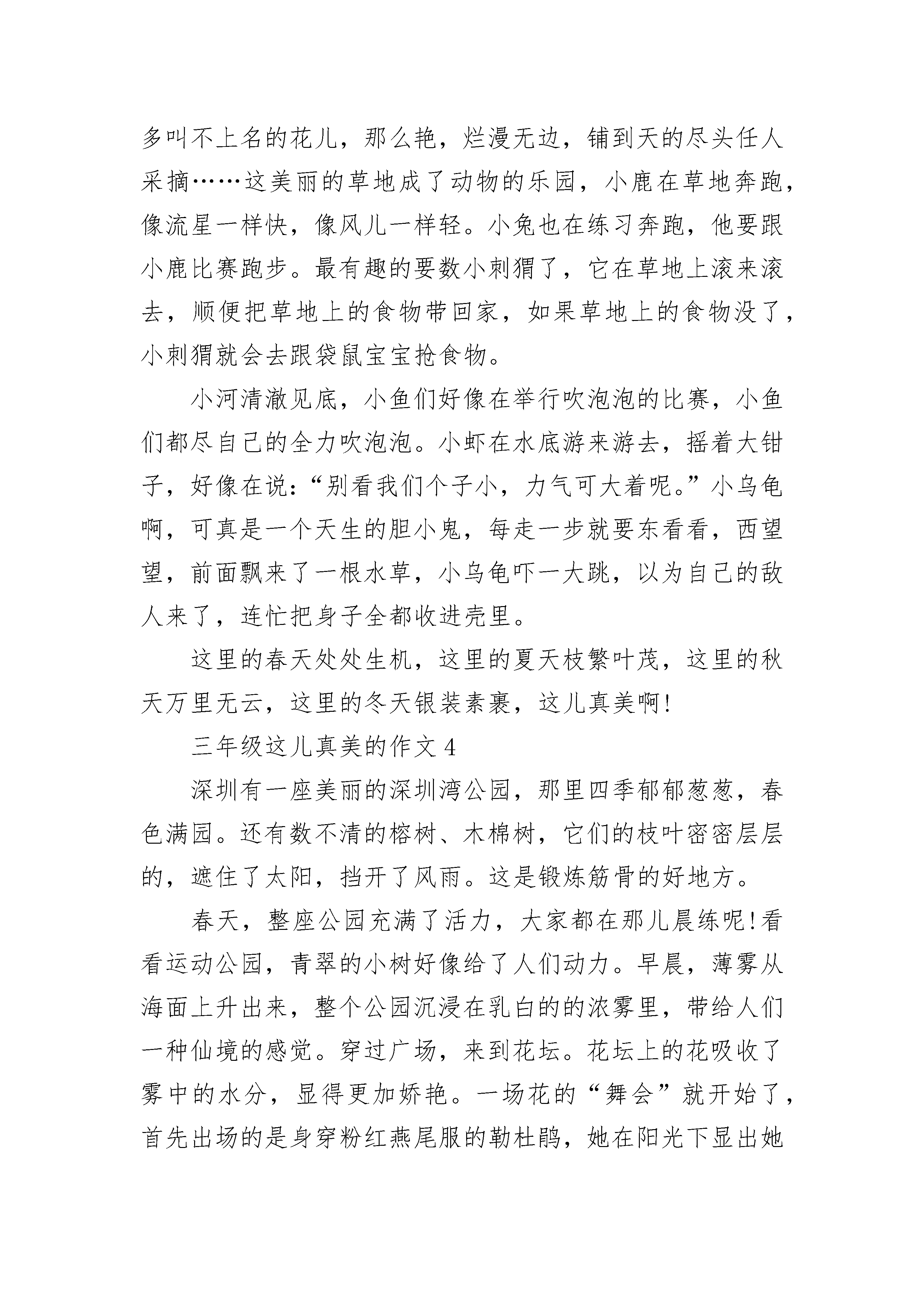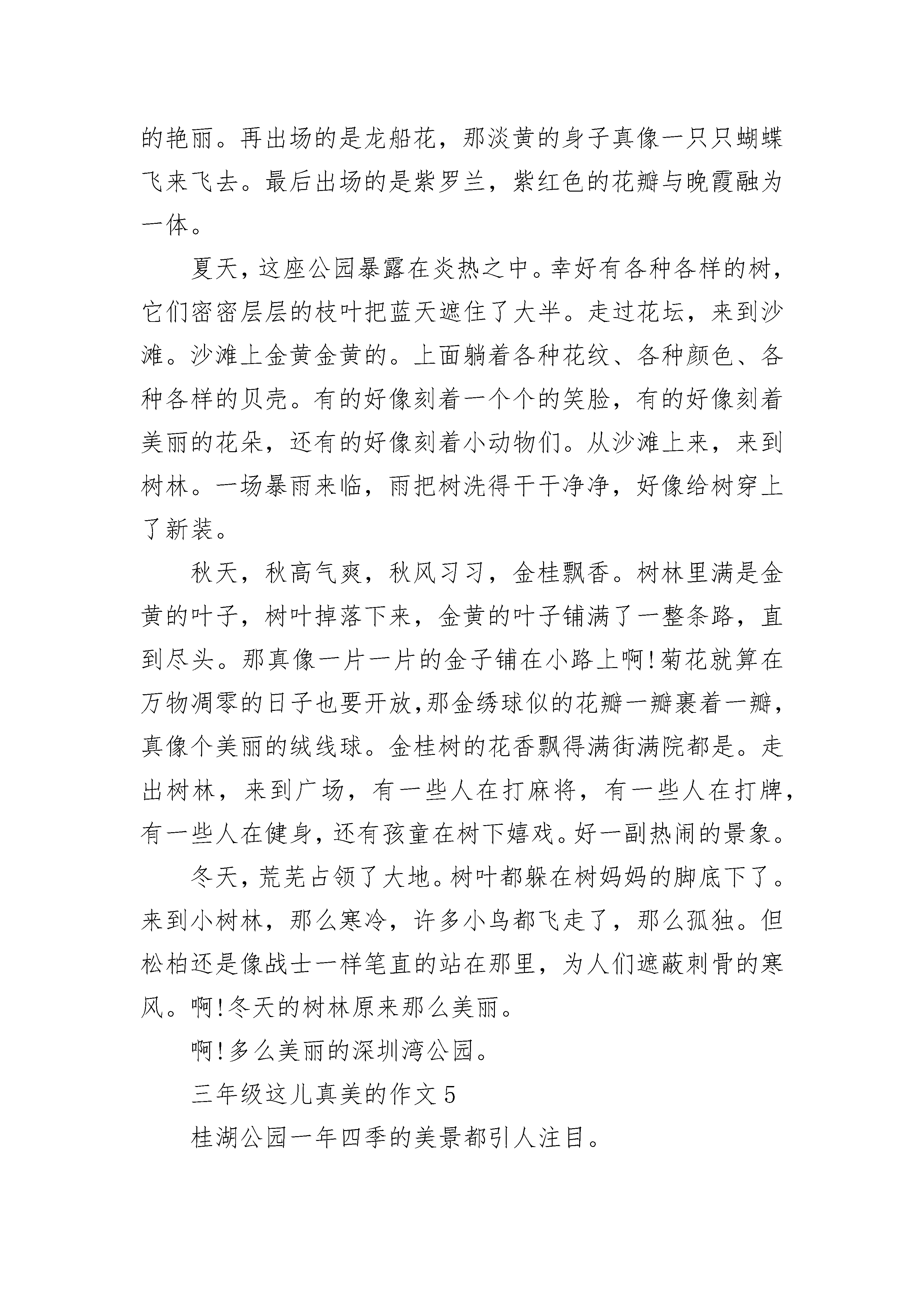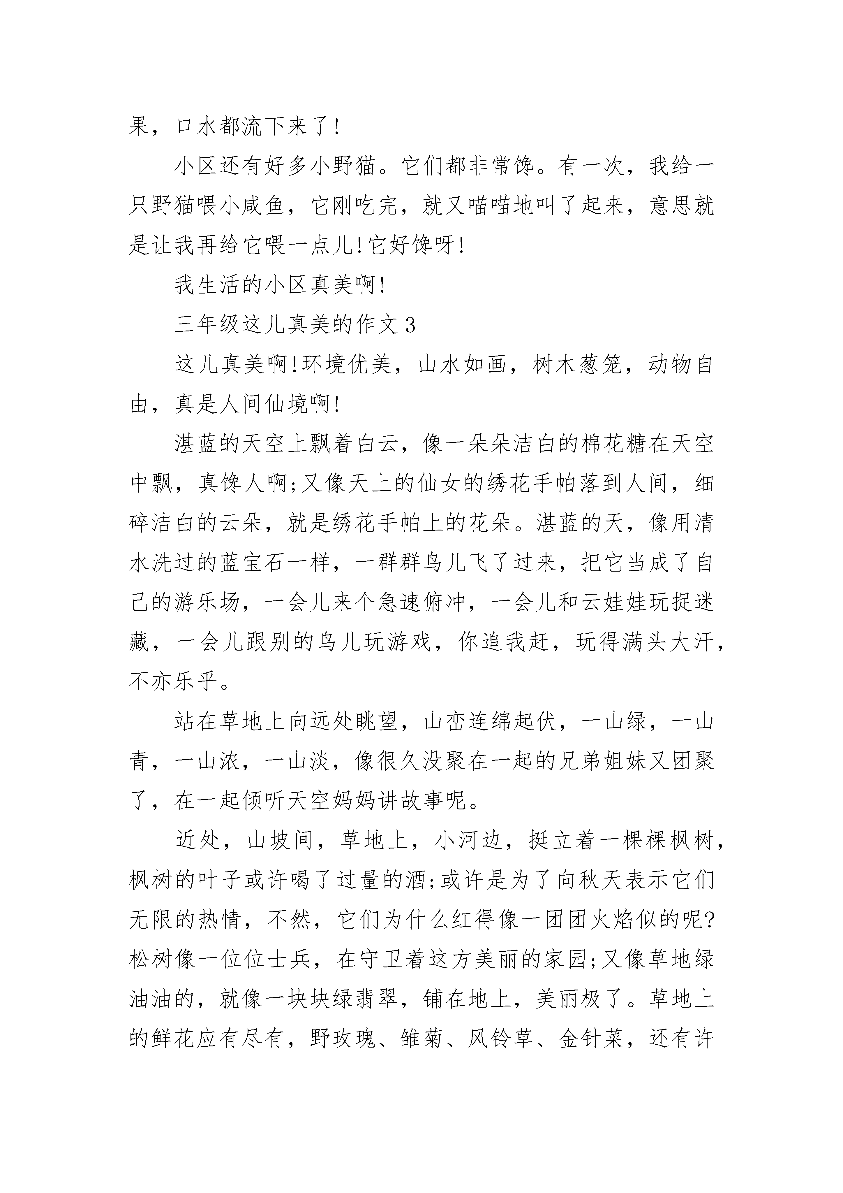 三年级这儿真美的作文10篇春天到了,小草戴上他心爱的草帽从泥土中钻了出来,花儿也不落后,她穿上美丽的花裙子。多美啊!草地上还有小兔子和乌龟,他们在一起快乐地玩耍。你看!蝴蝶也来了,她们跳着优美的舞蹈。大树也长出了碧绿的叶子,挺拨的松树像巨人一样守护着山岭。这些一山绿、一山青、一山浓、一山淡,真像一幅优美的图画。小河清澈见底,像一条透明的蓝绸子。小河里有小鸭在游,有几条小鱼在吐泡呢!还有的在水里捉迷藏呢!多可爱呀!天空一碧如洗,像用清水洗过的蓝宝石一样,天上有几朵去,有的像小船,有的像小羊,还有的像棉花糖……天上还有几只小鸟,它们在天空自由地飞,还在快乐地歌唱。多美呀!啊!这儿真美!三年级这儿真美的作文2我生活的小区真美。小区有很多漂亮的小花。有月季花、蔷薇花……我最喜欢蔷薇花。它的花瓣是粉色的,中间是白色的,粉白渐变,非常美丽!它还有淡淡的香味。有一次,我闻到一股香味,好香!我顺着香味边闻边看,原来是蔷薇花发出的香呀!小区有很多树。我最喜欢青苹果树。秋天,苹果树会结出圆圆的青苹果,又酸又甜,非常可口。一到苹果丰收的时候,树下就会围着一群馋嘴的小朋友,眼巴巴看着成熟的苹果,口水都流下来了!小区还有好多小野猫。它们都非常馋。有一次,我给一只野猫喂小咸鱼,它刚吃完,就又喵喵地叫了起来,意思就是让我再给它喂一点儿!它好馋呀!我生活的小区真美啊!三年级这儿真美的作文3这儿真美啊!环境优美,山水如画,树木葱笼,动物自由,真是人间仙境啊!湛蓝的天空上飘着白云,像一朵朵洁白的棉花糖在天空中飘,真馋人啊;又像天上的仙女的绣花手帕落到人间,细碎洁白的云朵,就是绣花手帕上的花朵。湛蓝的天,像用清水洗过的蓝宝石一样,一群群鸟儿飞了过来,把它当成了自己的游乐场,一会儿来个急速俯冲,一会儿和云娃娃玩捉迷藏,一会儿跟别的鸟儿玩游戏,你追我赶,玩得满头大汗,不亦乐乎。站在草地上向远处眺望,山峦连绵起伏,一山绿,一山青,一山浓,一山淡,像很久没聚在一起的兄弟姐妹又团聚了,在一起倾听天空妈妈讲故事呢。近处,山坡间,草地上,小河边,挺立着一棵棵枫树,枫树的叶子或许喝了过量的酒;或许是为了向秋天表示它们无限的热情,不然,它们为什么红得像一团团火焰似的呢?松树像一位位士兵,在守卫着这方美丽的家园;又像草地绿油油的,就像一块块绿翡翠,铺在地上,美丽极了。草地上的鲜花应有尽有,野玫瑰、雏菊、风铃草、金针菜,还有许多叫不上名的花儿,那么艳,烂漫无边,铺到天的尽头任人采摘……这美丽的草地成了动物的乐园,小鹿在草地奔跑,像流星一样快,像风儿一样轻。小兔也在练习奔跑,他要跟小鹿比赛跑步。最有趣的要数小刺猬了,它在草地上滚来滚去,顺便把草地上的食物带回家,如果草地上的食物没了,小刺猬就会去跟袋鼠宝宝抢食物。小河清澈见底,小鱼们好像在举行吹泡泡的比赛,小鱼们都尽自己的全力吹泡泡。小虾在水底游来游去,摇着大钳子,好像在说:“别看我们个子小,力气可大着呢。”小乌龟啊,可真是一个天生的胆小鬼,每走一步就要东看看,西望望,前面飘来了一根水草,小乌龟吓一大跳,以为自己的敌人来了,连忙把身子全都收进壳里。这里的春天处处生机,这里的夏天枝繁叶茂,这里的秋天万里无云,这里的冬天银装素裹,这儿真美啊!三年级这儿真美的作文4深圳有一座美丽的深圳湾公园,那里四季郁郁葱葱,春色满园。还有数不清的榕树、木棉树,它们的枝叶密密层层的,遮住了太阳,挡开了风雨。这是锻炼筋骨的好地方。春天,整座公园充满了活力,大家都在那儿晨练呢!看看运动公园,青翠的小树好像给了人们动力。早晨,薄雾从海面上升出来,整个公园沉浸在乳白的的浓雾里,带给人们一种仙境的感觉。穿过广场,来到花坛。花坛上的花吸收了雾中的水分,显得更加娇艳。一场花的“舞会”就开始了,首先出场的是身穿粉红燕尾服的勒杜鹃,她在阳光下显出她的艳丽。再出场的是龙船花,那淡黄的身子真像一只只蝴蝶飞来飞去。最后出场的是紫罗兰,紫红色的花瓣与晚霞融为一体。夏天,这座公园暴露在炎热之中。幸好有各种各样的树,它们密密层层的枝叶把蓝天遮住了大半。走过花坛,来到沙滩。沙滩上金黄金黄的。上面躺着各种花纹、各种颜色、各种各样的贝壳。有的好像刻着一个个的笑脸,有的好像刻着美丽的花朵,还有的好像刻着小动物们。从沙滩上来,来到树林。一场暴雨来临,雨把树洗得干干净净,好像给树穿上了新装。秋天,秋高气爽,秋风习习,金桂飘香。树林里满是金黄的叶子,树叶掉落下来,金黄的叶子铺满了一整条路,直到尽头。那真像一片一片的金子铺在小路上啊!菊花就算在万物凋零的日子也要开放,那金绣球似的花瓣一瓣裹着一瓣,真像个美丽的绒线球。金桂树的花香飘得满街满院都是。走出树林,来到广场,有一些人在打麻将,有一些人在打牌,有一些人在健身,还有孩童在树下嬉戏。好一副热闹的景象。冬天,荒芜占领了大地。树叶都躲在树妈妈的脚底下了。