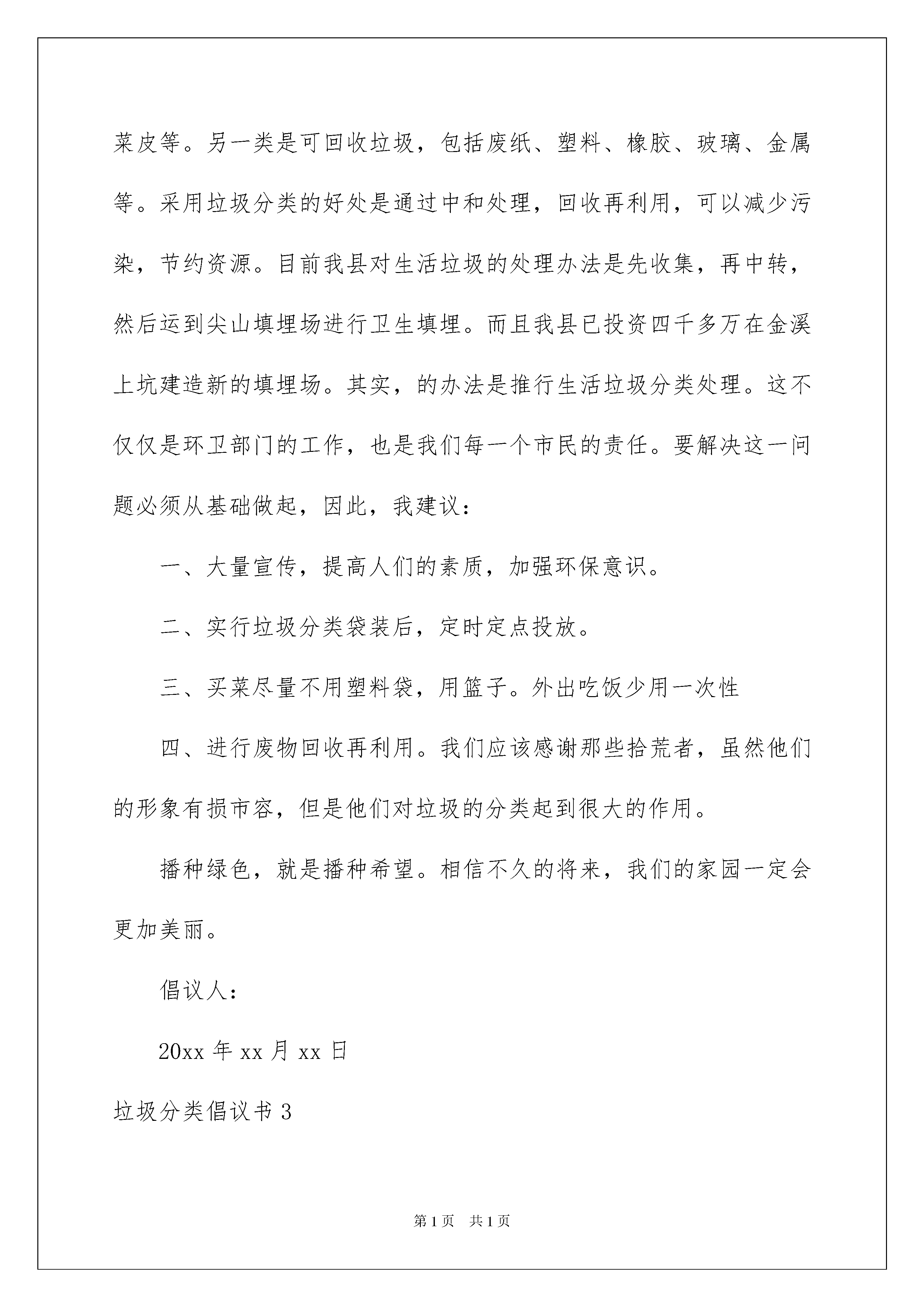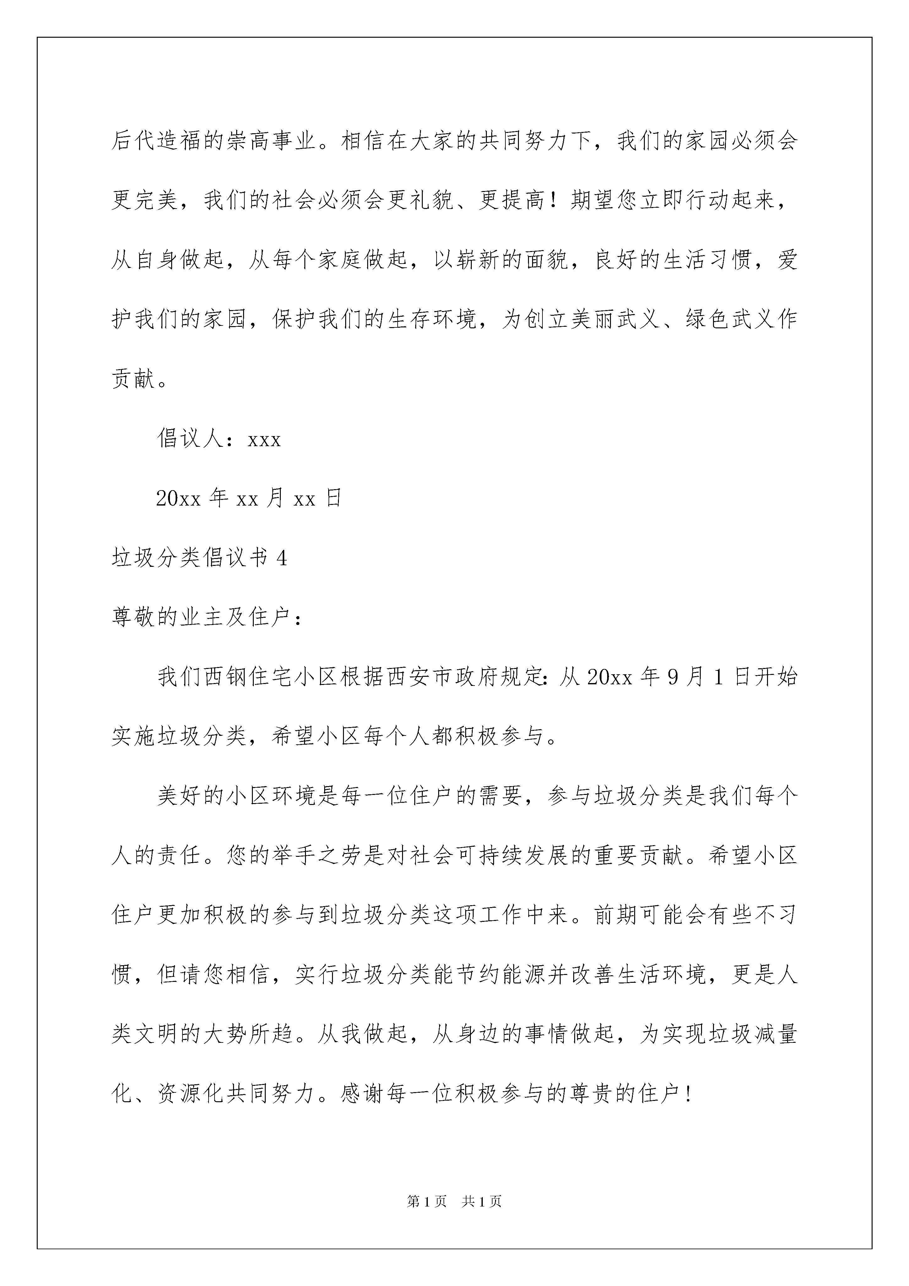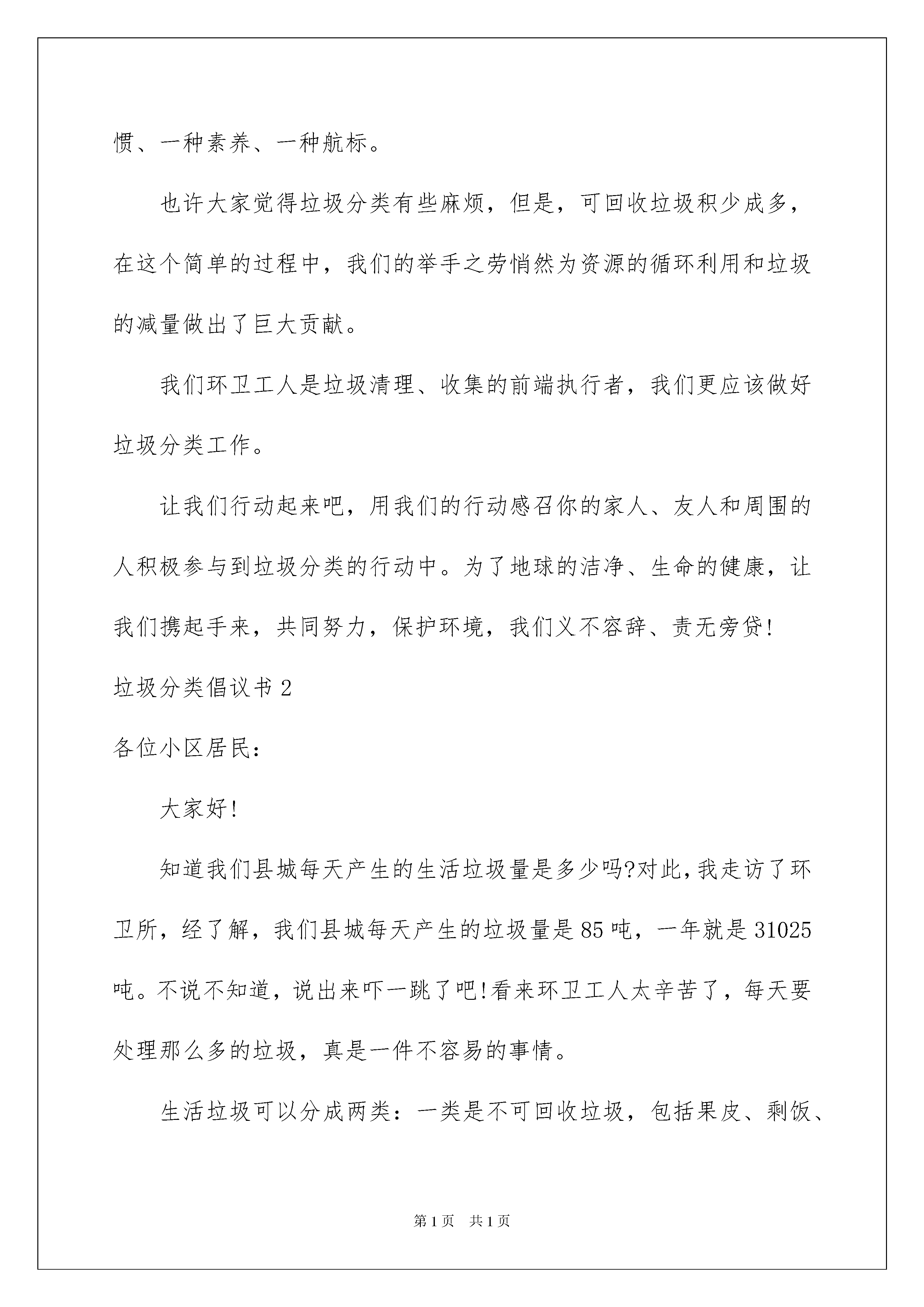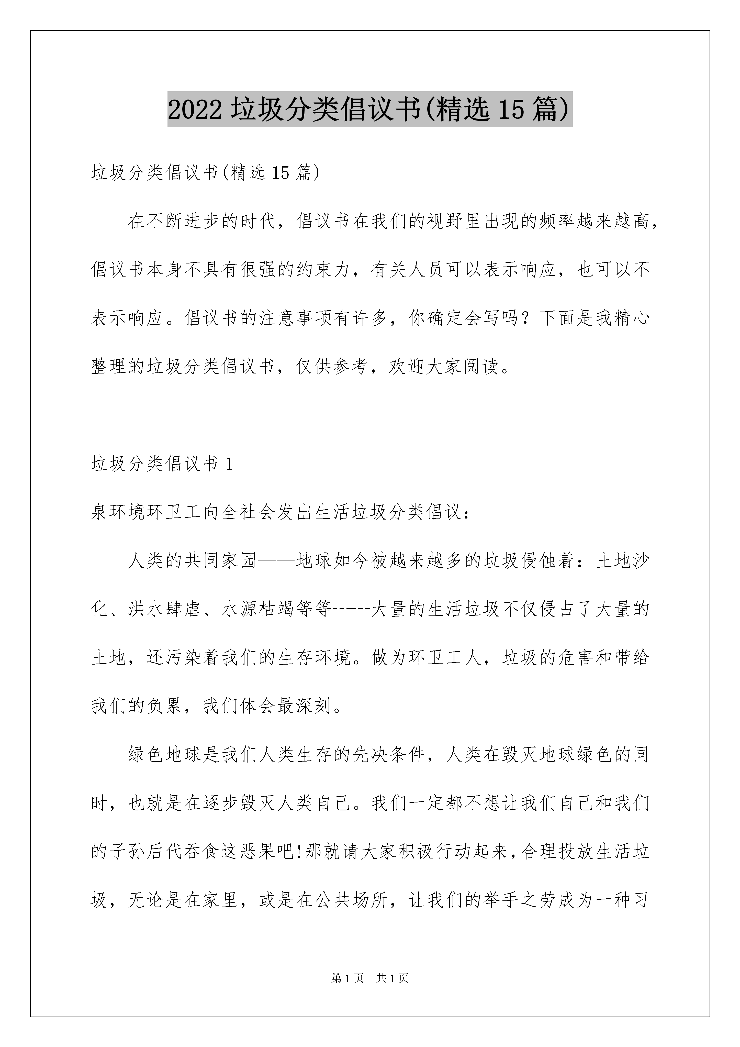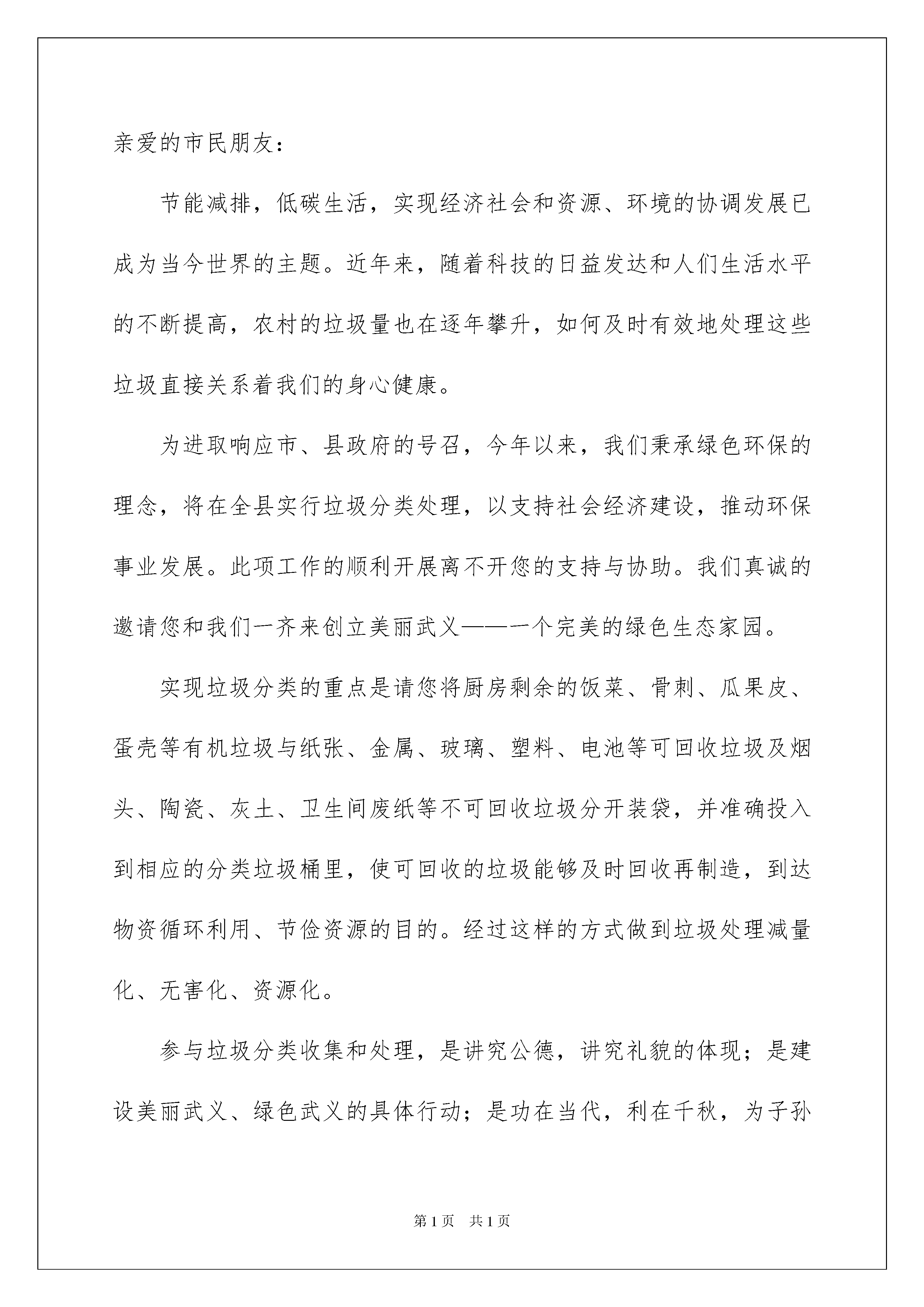 2022垃圾分类倡议书(精选15篇)垃圾分类倡议书(精选15篇)在不断进步的时代,倡议书在我们的视野里出现的频率越来越高,倡议书本身不具有很强的约束力,有关人员可以表示响应,也可以不表示响应。倡议书的注意事项有许多,你确定会写吗?下面是我精心整理的垃圾分类倡议书,仅供参考,欢迎大家阅读。垃圾分类倡议书1泉环境环卫工向全社会发出生活垃圾分类倡议:人类的共同家园——地球如今被越来越多的垃圾侵蚀着:土地沙化、洪水肆虐、水源枯竭等等┄┄大量的生活垃圾不仅侵占了大量的土地,还污染着我们的生存环境。做为环卫工人,垃圾的危害和带给我们的负累,我们体会最深刻。绿色地球是我们人类生存的先决条件,人类在毁灭地球绿色的同时,也就是在逐步毁灭人类自己。我们一定都不想让我们自己和我们的子孙后代吞食这恶果吧!那就请大家积极行动起来,合理投放生活垃圾,无论是在家里,或是在公共场所,让我们的举手之劳成为一种习惯、一种素养、一种航标。也许大家觉得垃圾分类有些麻烦,但是,可回收垃圾积少成多,在这个简单的过程中,我们的举手之劳悄然为资源的循环利用和垃圾的减量做出了巨大贡献。我们环卫工人是垃圾清理、收集的前端执行者,我们更应该做好垃圾分类工作。让我们行动起来吧,用我们的行动感召你的家人、友人和周围的人积极参与到垃圾分类的行动中。为了地球的洁净、生命的健康,让我们携起手来,共同努力,保护环境,我们义不容辞、责无旁贷!垃圾分类倡议书2各位小区居民:大家好!知道我们县城每天产生的生活垃圾量是多少吗?对此,我走访了环卫所,经了解,我们县城每天产生的垃圾量是85吨,一年就是31025吨。不说不知道,说出来吓一跳了吧!看来环卫工人太辛苦了,每天要处理那么多的垃圾,真是一件不容易的事情。生活垃圾可以分成两类:一类是不可回收垃圾,包括果皮、剩饭、菜皮等。另一类是可回收垃圾,包括废纸、塑料、橡胶、玻璃、金属等。采用垃圾分类的好处是通过中和处理,回收再利用,可以减少污染,节约资源。目前我县对生活垃圾的处理办法是先收集,再中转,然后运到尖山填埋场进行卫生填埋。而且我县已投资四千多万在金溪上坑建造新的填埋场。其实,的办法是推行生活垃圾分类处理。这不仅仅是环卫部门的工作,也是我们每一个市民的责任。要解决这一问题必须从基础做起,因此,我建议:一、大量宣传,提高人们的素质,加强环保意识。二、实行垃圾分类袋装后,定时定点投放。三、买菜尽量不用塑料袋,用篮子。外出吃饭少用一次性四、进行废物回收再利用。我们应该感谢那些拾荒者,虽然他们的形象有损市容,但是他们对垃圾的分类起到很大的作用。播种绿色,就是播种希望。相信不久的将来,我们的家园一定会更加美丽。倡议人:20xx年xx月xx日垃圾分类倡议书3亲爱的市民朋友:节能减排,低碳生活,实现经济社会和资源、环境的协调发展已成为当今世界的主题。近年来,随着科技的日益发达和人们生活水平的不断提高,农村的垃圾量也在逐年攀升,如何及时有效地处理这些垃圾直接关系着我们的身心健康。为进取响应市、县政府的号召,今年以来,我们秉承绿色环保的理念,将在全县实行垃圾分类处理,以支持社会经济建设,推动环保事业发展。此项工作的顺利开展离不开您的支持与协助。我们真诚的邀请您和我们一齐来创立美丽武义——一个完美的绿色生态家园。实现垃圾分类的重点是请您将厨房剩余的饭菜、骨刺、瓜果皮、蛋壳等有机垃圾与纸张、金属、玻璃、塑料、电池等可回收垃圾及烟头、陶瓷、灰土、卫生间废纸等不可回收垃圾分开装袋,并准确投入到相应的分类垃圾桶里,使可回收的垃圾能够及时回收再制造,到达物资循环利用、节俭资源的目的。经过这样的方式做到垃圾处理减量化、无害化、资源化。参与垃圾分类收集和处理,是讲究公德,讲究礼貌的体现;是建设美丽武义、绿色武义的具体行动;是功在当代,利在千秋,为子孙后代造福的崇高事业。相信在大家的共同努力下,我们的家园必须会更完美,我们的社会必须会更礼貌、更提高!期望您立即行动起来,从自身做起,从每个家庭做起,以崭新的面貌,良好的生活习惯,爱护我们的家园,保护我们的生存环境,为创立美丽武义、绿色武义作贡献。倡议人:xxx20xx年xx月xx日垃圾分类倡议书4尊敬的业主及住户:我们西钢住宅小区根据西安市政府规定:从20xx年9月1日开始实施垃圾分类,希望小区每个人都积极参与。美好的小区环境是每一位住户的需要,参与垃圾分类是我们每个人的责任。您的举手之劳是对社会可持续发展的重要贡献。希望小区住户更加积极的参与到垃圾分类这项工作中来。前期可能会有些不习惯,但请您相信,实行垃圾分类能节约能源并改善生活环境,更是人类文明的大势所趋。从我做起,从身边的事情做