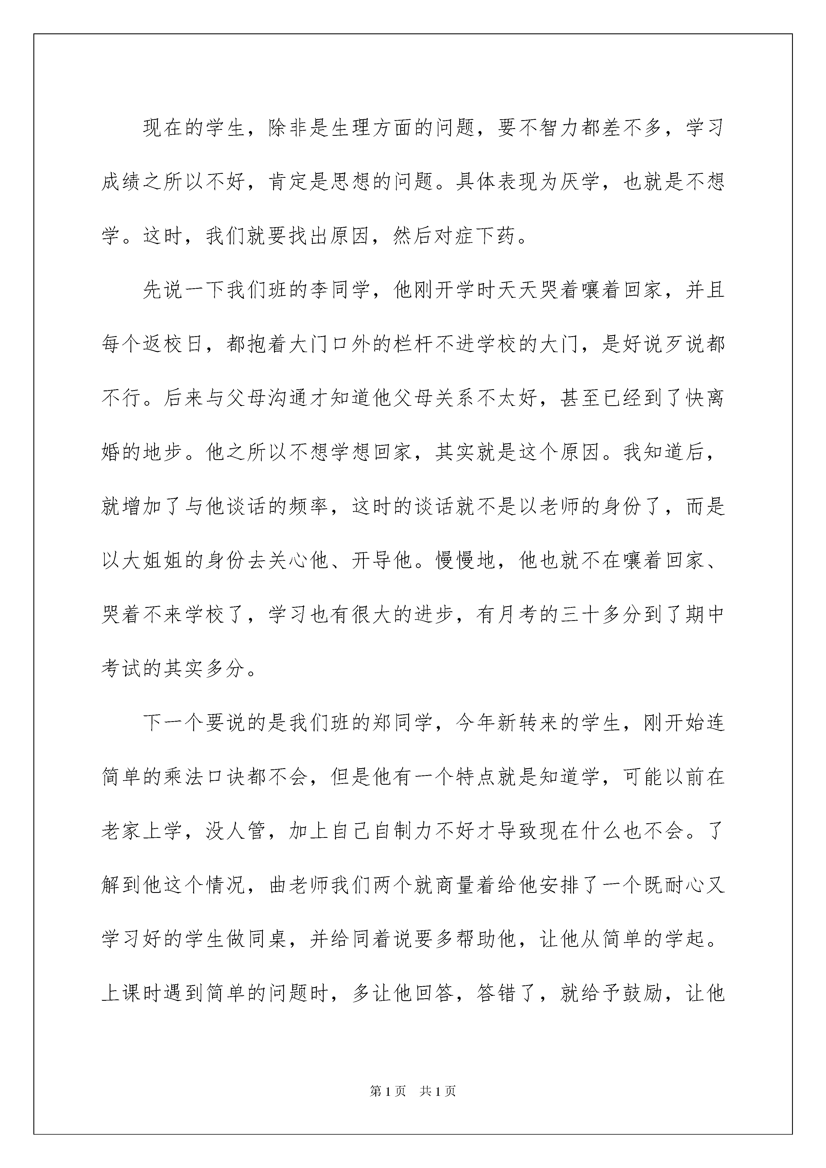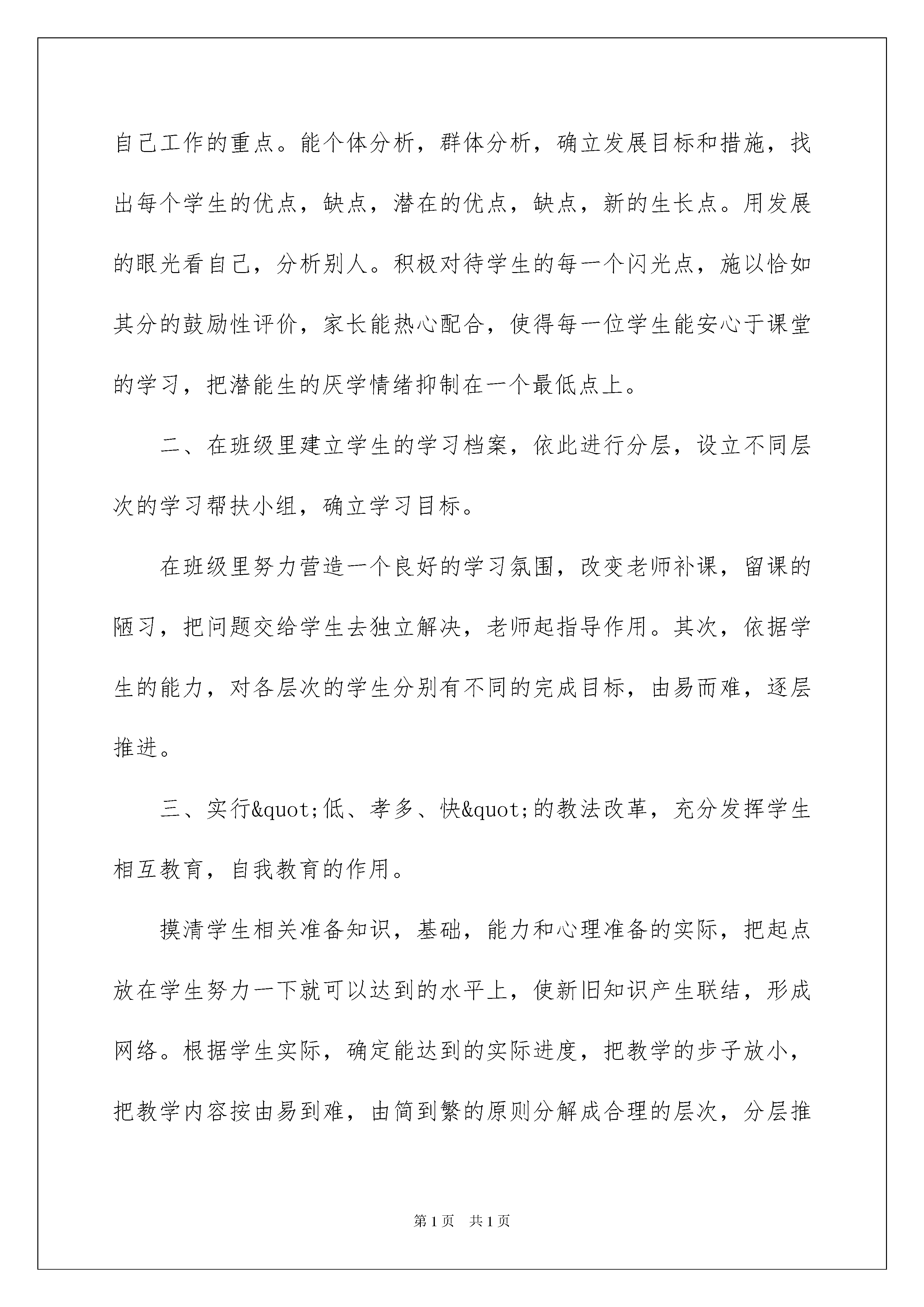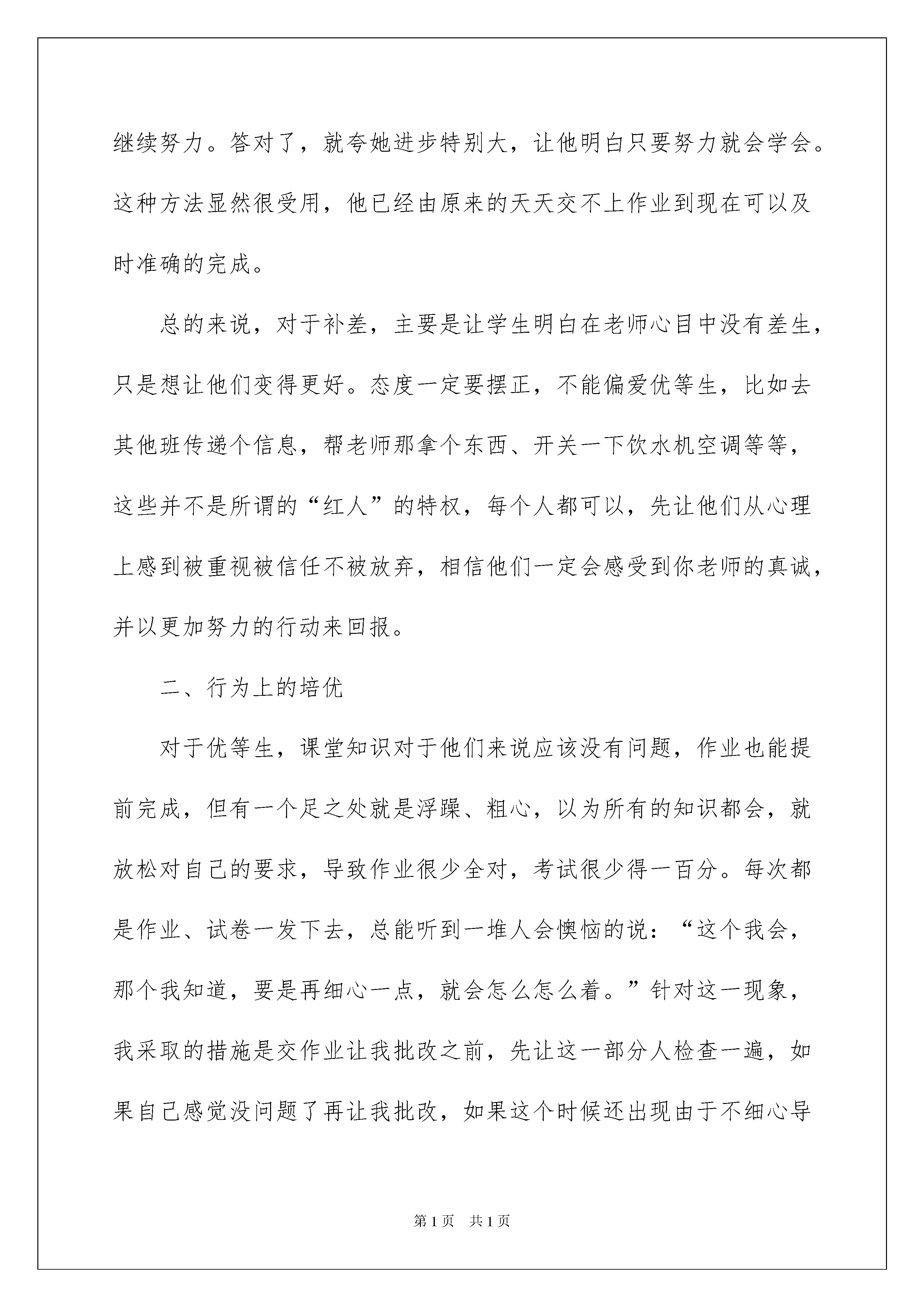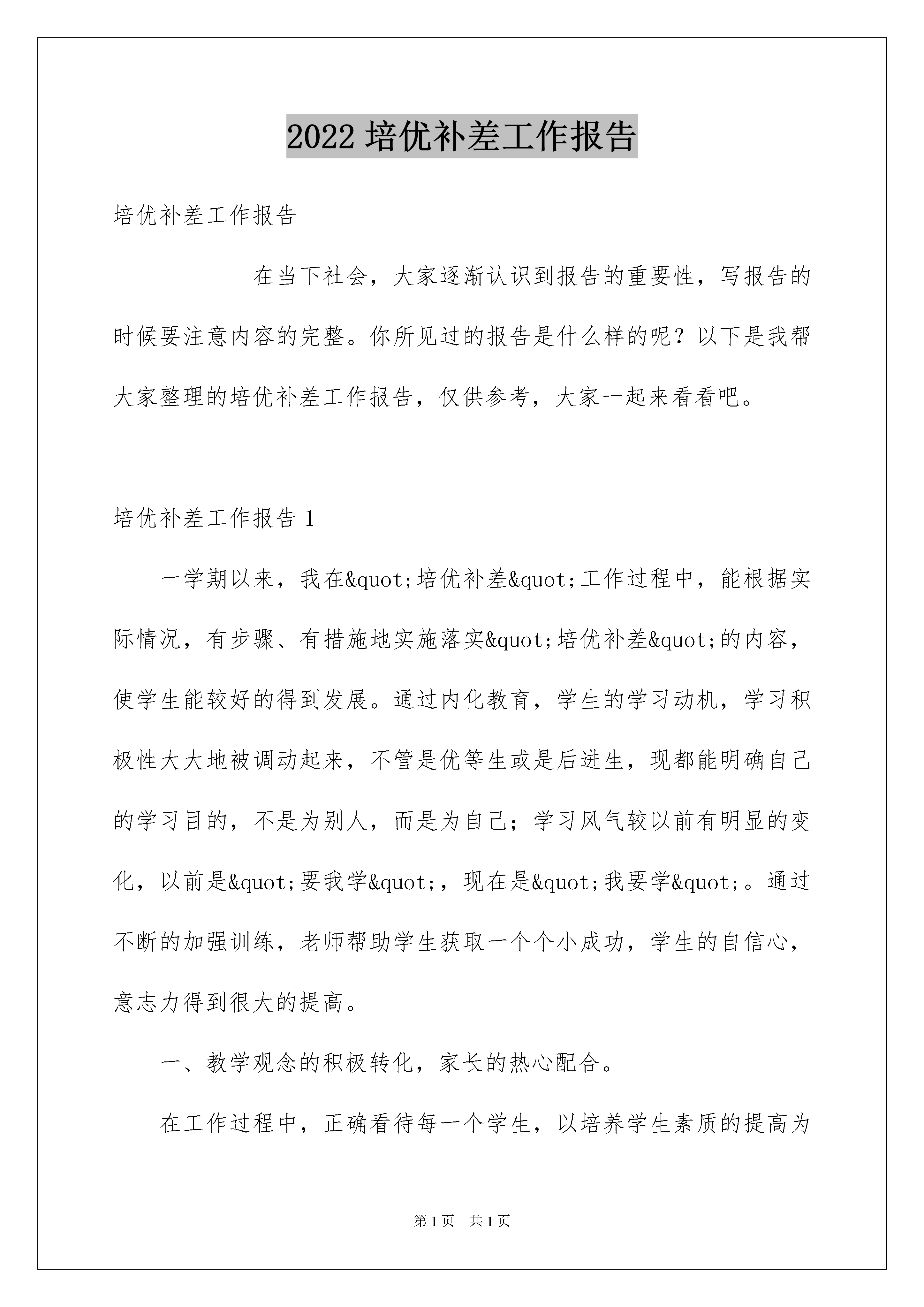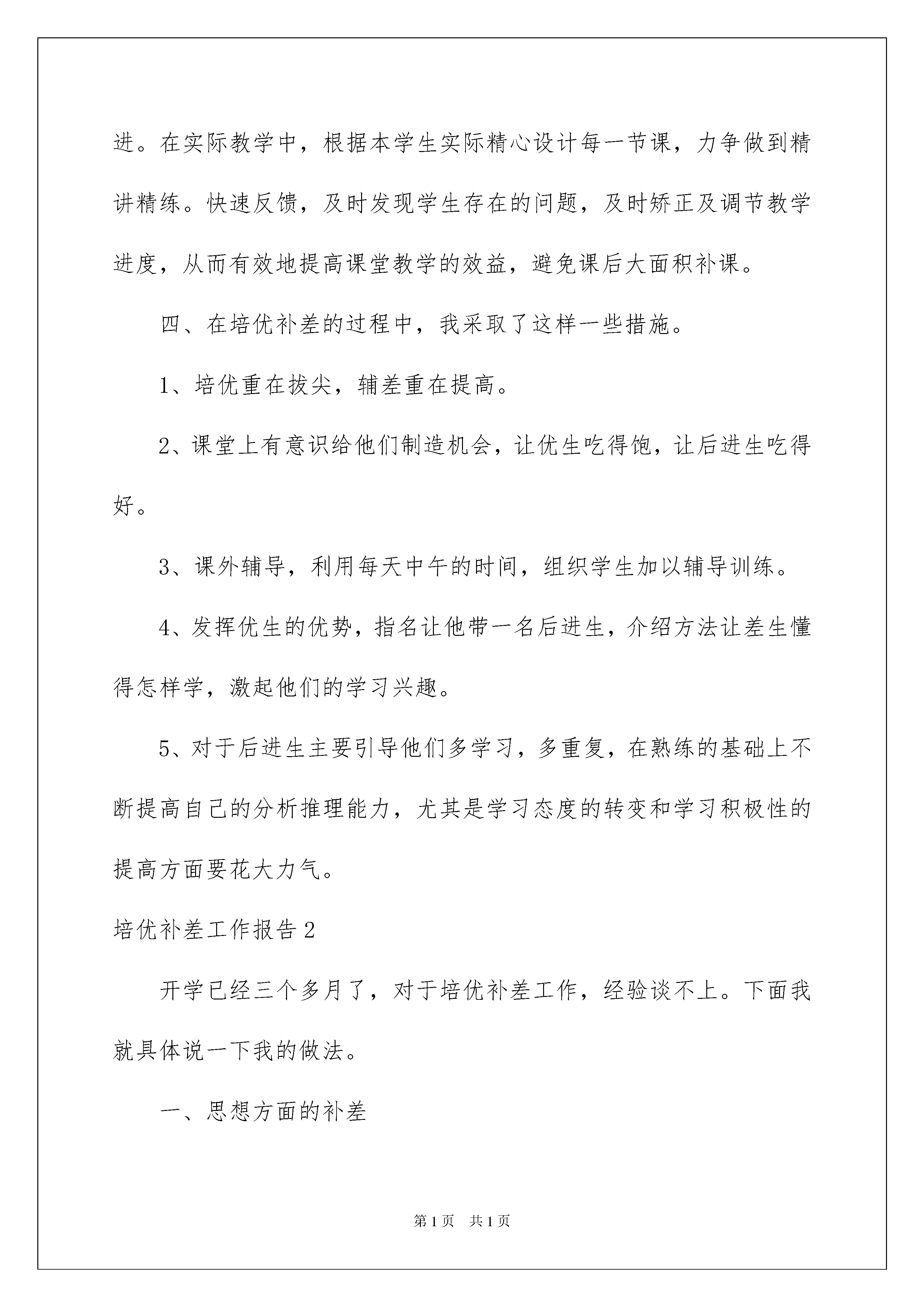 2022培优补差工作报告培优补差工作报告在当下社会,大家逐渐认识到报告的重要性,写报告的时候要注意内容的完整。你所见过的报告是什么样的呢?以下是我帮大家整理的培优补差工作报告,仅供参考,大家一起来看看吧。培优补差工作报告1一学期以来,我在"培优补差"工作过程中,能根据实际情况,有步骤、有措施地实施落实"培优补差"的内容,使学生能较好的得到发展。通过内化教育,学生的学习动机,学习积极性大大地被调动起来,不管是优等生或是后进生,现都能明确自己的学习目的,不是为别人,而是为自己;学习风气较以前有明显的变化,以前是"要我学",现在是"我要学"。通过不断的加强训练,老师帮助学生获取一个个小成功,学生的自信心,意志力得到很大的提高。一、教学观念的积极转化,家长的热心配合。在工作过程中,正确看待每一个学生,以培养学生素质的提高为自己工作的重点。能个体分析,群体分析,确立发展目标和措施,找出每个学生的优点,缺点,潜在的优点,缺点,新的生长点。用发展的眼光看自己,分析别人。积极对待学生的每一个闪光点,施以恰如其分的鼓励性评价,家长能热心配合,使得每一位学生能安心于课堂的学习,把潜能生的厌学情绪抑制在一个最低点上。二、在班级里建立学生的学习档案,依此进行分层,设立不同层次的学习帮扶小组,确立学习目标。在班级里努力营造一个良好的学习氛围,改变老师补课,留课的陋习,把问题交给学生去独立解决,老师起指导作用。其次,依据学生的能力,对各层次的学生分别有不同的完成目标,由易而难,逐层推进。三、实行"低、孝多、快"的教法改革,充分发挥学生相互教育,自我教育的作用。摸清学生相关准备知识,基础,能力和心理准备的实际,把起点放在学生努力一下就可以达到的水平上,使新旧知识产生联结,形成网络。根据学生实际,确定能达到的实际进度,把教学的步子放小,把教学内容按由易到难,由简到繁的原则分解成合理的层次,分层推进。在实际教学中,根据本学生实际精心设计每一节课,力争做到精讲精练。快速反馈,及时发现学生存在的问题,及时矫正及调节教学进度,从而有效地提高课堂教学的效益,避免课后大面积补课。四、在培优补差的过程中,我采取了这样一些措施。1、培优重在拔尖,辅差重在提高。2、课堂上有意识给他们制造机会,让优生吃得饱,让后进生吃得好。3、课外辅导,利用每天中午的时间,组织学生加以辅导训练。4、发挥优生的优势,指名让他带一名后进生,介绍方法让差生懂得怎样学,激起他们的学习兴趣。5、对于后进生主要引导他们多学习,多重复,在熟练的基础上不断提高自己的分析推理能力,尤其是学习态度的转变和学习积极性的提高方面要花大力气。培优补差工作报告2开学已经三个多月了,对于培优补差工作,经验谈不上。下面我就具体说一下我的做法。一、思想方面的补差现在的学生,除非是生理方面的问题,要不智力都差不多,学习成绩之所以不好,肯定是思想的问题。具体表现为厌学,也就是不想学。这时,我们就要找出原因,然后对症下药。先说一下我们班的李同学,他刚开学时天天哭着嚷着回家,并且每个返校日,都抱着大门口外的栏杆不进学校的大门,是好说歹说都不行。后来与父母沟通才知道他父母关系不太好,甚至已经到了快离婚的地步。他之所以不想学想回家,其实就是这个原因。我知道后,就增加了与他谈话的频率,这时的谈话就不是以老师的身份了,而是以大姐姐的身份去关心他、开导他。慢慢地,他也就不在嚷着回家、哭着不来学校了,学习也有很大的进步,有月考的三十多分到了期中考试的其实多分。下一个要说的是我们班的郑同学,今年新转来的学生,刚开始连简单的乘法口诀都不会,但是他有一个特点就是知道学,可能以前在老家上学,没人管,加上自己自制力不好才导致现在什么也不会。了解到他这个情况,曲老师我们两个就商量着给他安排了一个既耐心又学习好的学生做同桌,并给同着说要多帮助他,让他从简单的学起。上课时遇到简单的问题时,多让他回答,答错了,就给予鼓励,让他继续努力。答对了,就夸她进步特别大,让他明白只要努力就会学会。这种方法显然很受用,他已经由原来的天天交不上作业到现在可以及时准确的完成。总的来说,对于补差,主要是让学生明白在老师心目中没有差生,只是想让他们变得更好。态度一定要摆正,不能偏爱优等生,比如去其他班传递个信息,帮老师那拿个东西、开关一下饮水机空调等等,这些并不是所谓的“红人”的特权,每个人都可以,先让他们从心理上感到被重视被信任不被放弃,相信他们一定会感受到你老师的真诚,并以更加努力的行动来回报。二、行为上的培优对于优等生,课堂
