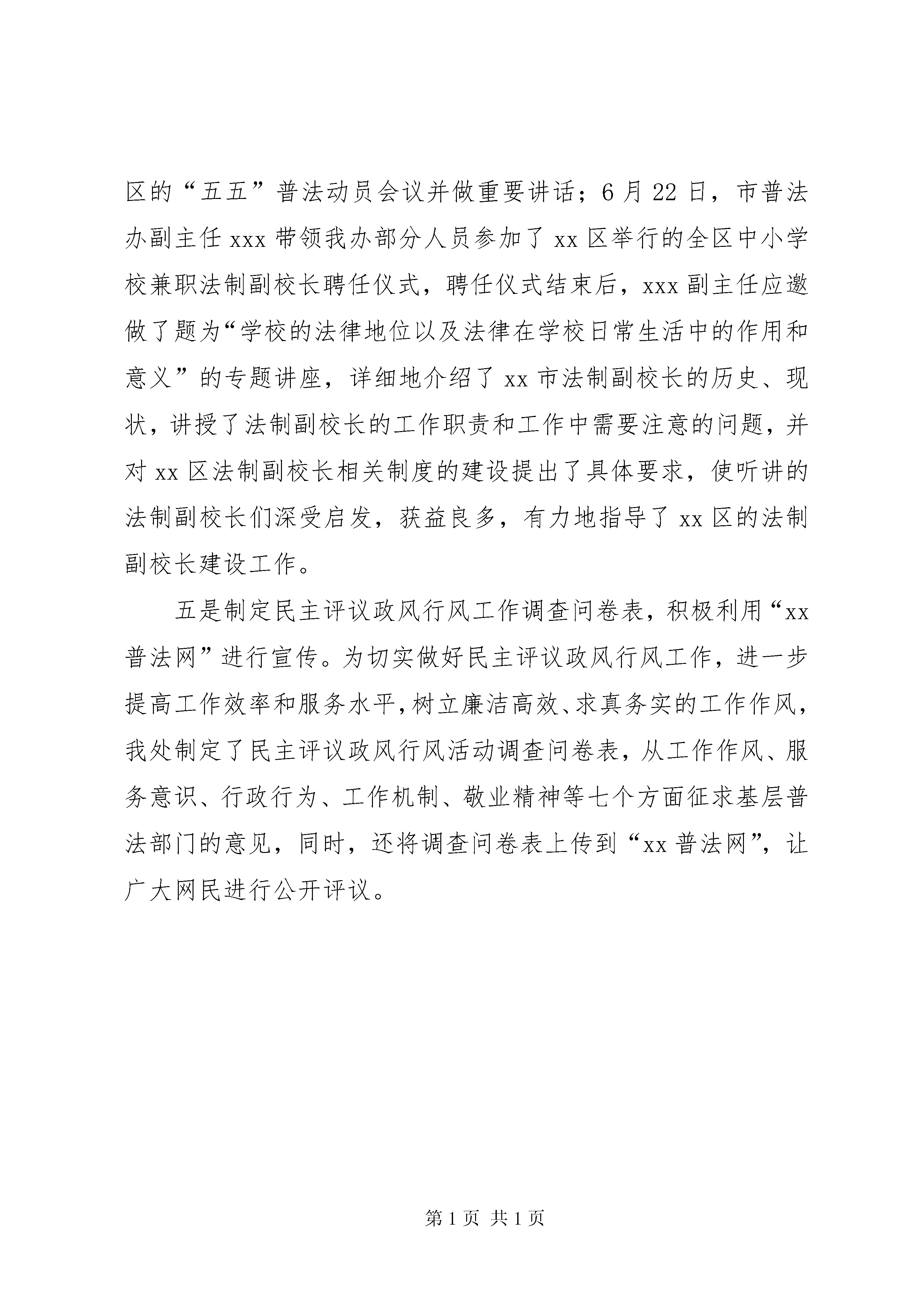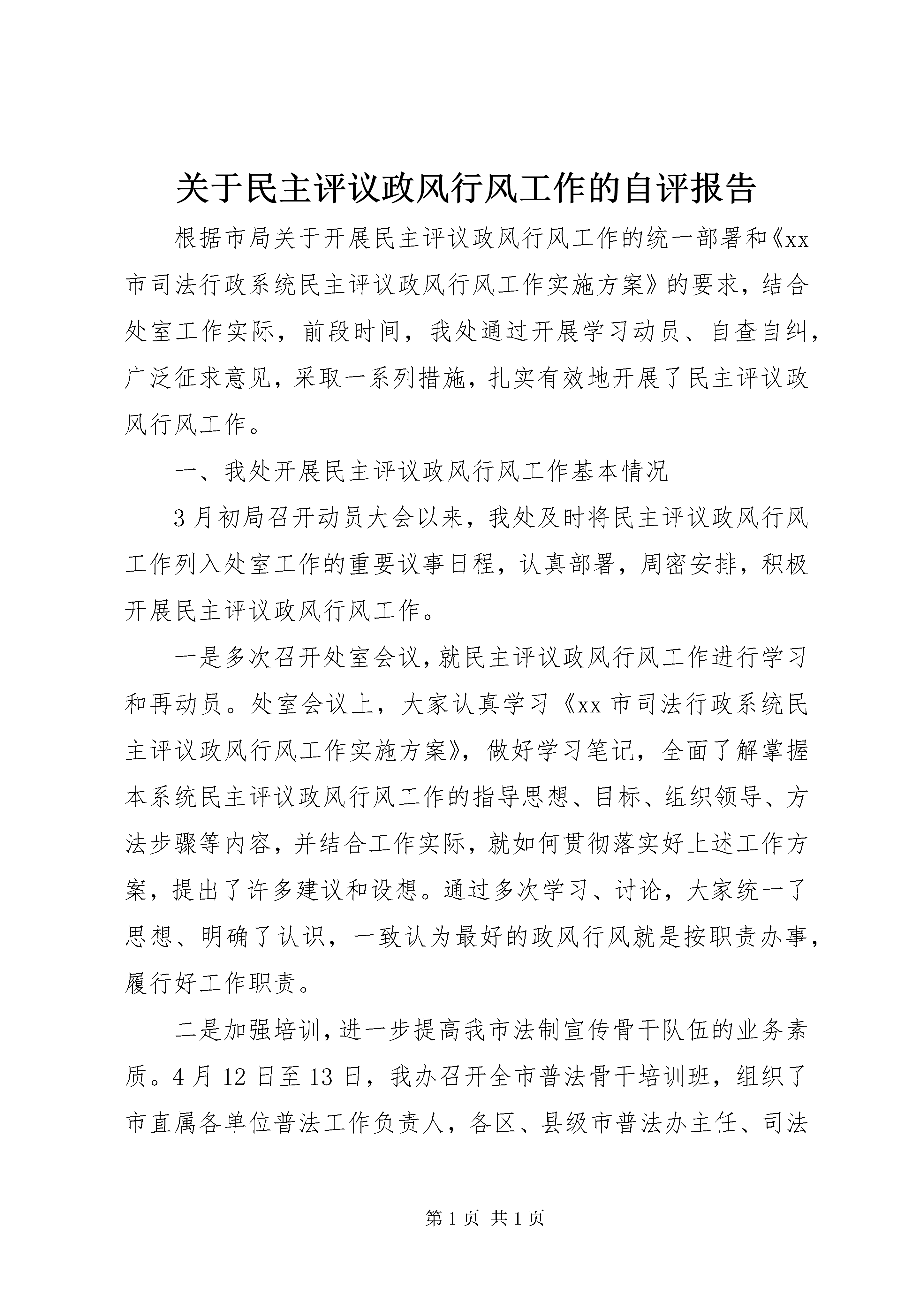 关于民主评议政风行风工作的自评报告根据市局关于开展民主评议政风行风工作的统一部署和《xx市司法行政系统民主评议政风行风工作实施方案》的要求,结合处室工作实际,前段时间,我处通过开展学习动员、自查自纠,广泛征求意见,采取一系列措施,扎实有效地开展了民主评议政风行风工作。一、我处开展民主评议政风行风工作基本情况3月初局召开动员大会以来,我处及时将民主评议政风行风工作列入处室工作的重要议事日程,认真部署,周密安排,积极开展民主评议政风行风工作。一是多次召开处室会议,就民主评议政风行风工作进行学习和再动员。处室会议上,大家认真学习《xx市司法行政系统民主评议政风行风工作实施方案》,做好学习笔记,全面了解掌握本系统民主评议政风行风工作的指导思想、目标、组织领导、方法步骤等内容,并结合工作实际,就如何贯彻落实好上述工作方案,提出了许多建议和设想。通过多次学习、讨论,大家统一了思想、明确了认识,一致认为最好的政风行风就是按职责办事,履行好工作职责。二是加强培训,进一步提高我市法制宣传骨干队伍的业务素质。4月12日至13日,我办召开全市普法骨干培训班,组织了市直属各单位普法工作负责人,各区、县级市普法办主任、司法局宣教科长、司法所所长等300多人进行了集中培训,认真学习今年在全市普及的重点法律法规,提高普法骨干队伍的法律素质和工作水平。三是召开省、市两级普法部门座谈会,接受省普法部门的监督,深入查摆问题。6月16日下午,我办邀请省普法办部分工作人员召开了两级普法部门政风行风民主评议工作座谈会。省司法厅副厅长、省普法办副主任xxx、市司法局党委书记、市普法领导小组副组长xxx、市司法局副局长、市普法办主任xxx等参加会议并进行了座谈。会上,大家围绕我市普法工作积极发言,查摆了我市普法工作存在的一些问题,如新时期领导干部学法用法工作需要进一步加强;各区(县级市)普法工作发展不平衡,缺乏一种相互竞争的良好氛围;市级普法部门要进一步发挥好指导、协调职责,充分调动起基层普法部门的工作积极性等。这些问题为我们下一阶段的落实整改指明了方向,奠定了基础。四是积极深入基层,加强对“五五”普法规划实施工作的指导。今年是我市贯彻实施全民法制宣传教育第五个五年规划的第一年,做好新时期普法各项工作的开展、启动,十分重要。今年上半年以来,我办领导、工作人员,先后多次到基层指导普法工作。5月10日,市司法局副局长、市普法办主任xxx同志参加了xx区的“五五”普法动员会议,对xx区的普法工作提出建议;5月19日,市司法局局长、市普法领导小组副组长xxx参加了xx区的“五五”普法动员会议并做重要讲话;6月22日,市普法办副主任xxx带领我办部分人员参加了xx区举行的全区中小学校兼职法制副校长聘任仪式,聘任仪式结束后,xxx副主任应邀做了题为“学校的法律地位以及法律在学校日常生活中的作用和意义”的专题讲座,详细地介绍了xx市法制副校长的历史、现状,讲授了法制副校长的工作职责和工作中需要注意的问题,并对xx区法制副校长相关制度的建设提出了具体要求,使听讲的法制副校长们深受启发,获益良多,有力地指导了xx区的法制副校长建设工作。五是制定民主评议政风行风工作调查问卷表,积极利用“xx普法网”进行宣传。为切实做好民主评议政风行风工作,进一步提高工作效率和服务水平,树立廉洁高效、求真务实的工作作风,我处制定了民主评议政风行风活动调查问卷表,从工作作风、服务意识、行政行为、工作机制、敬业精神等七个方面征求基层普法部门的意见,同时,还将调查问卷表上传到“xx普法网”,让广大网民进行公开评议。