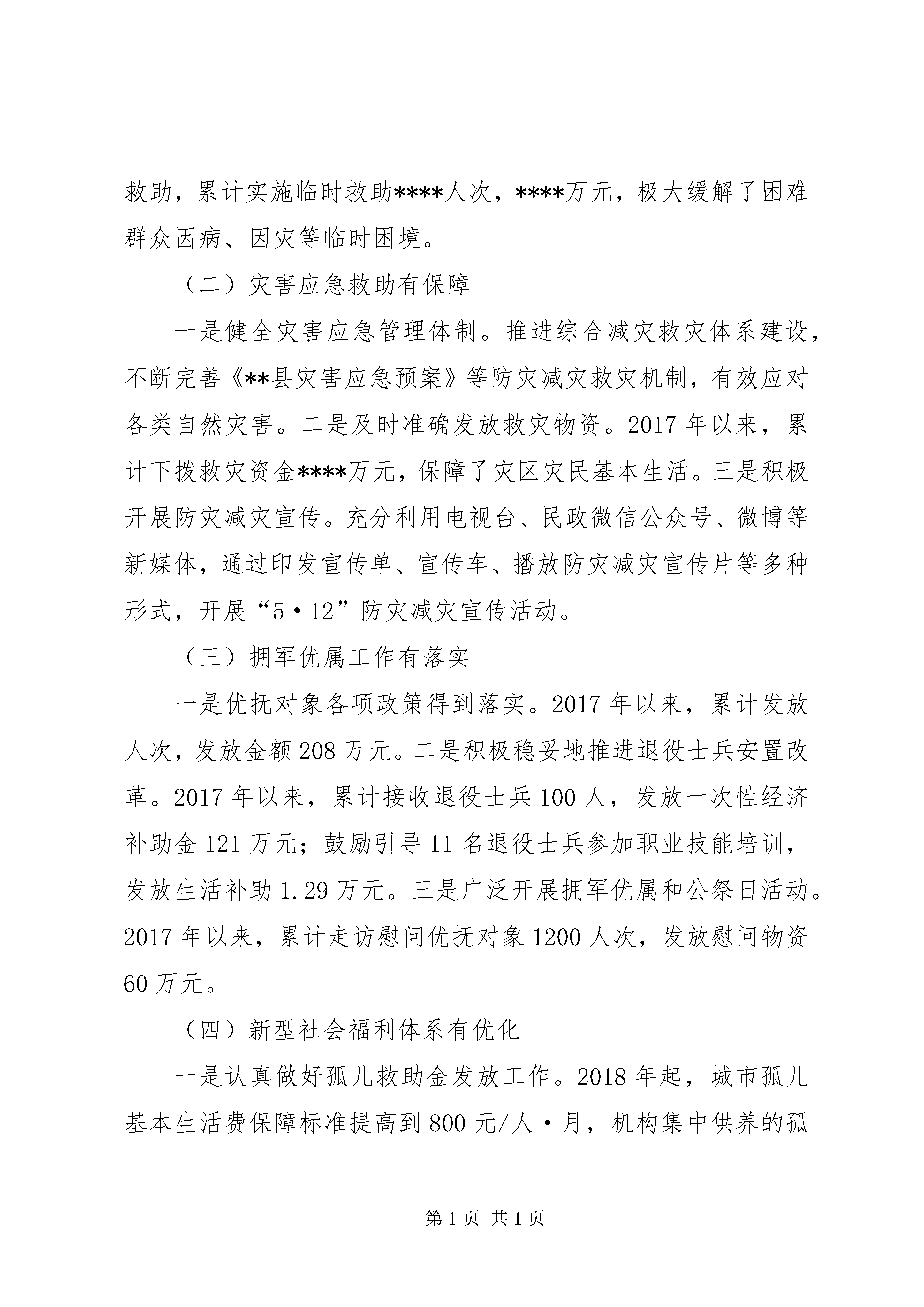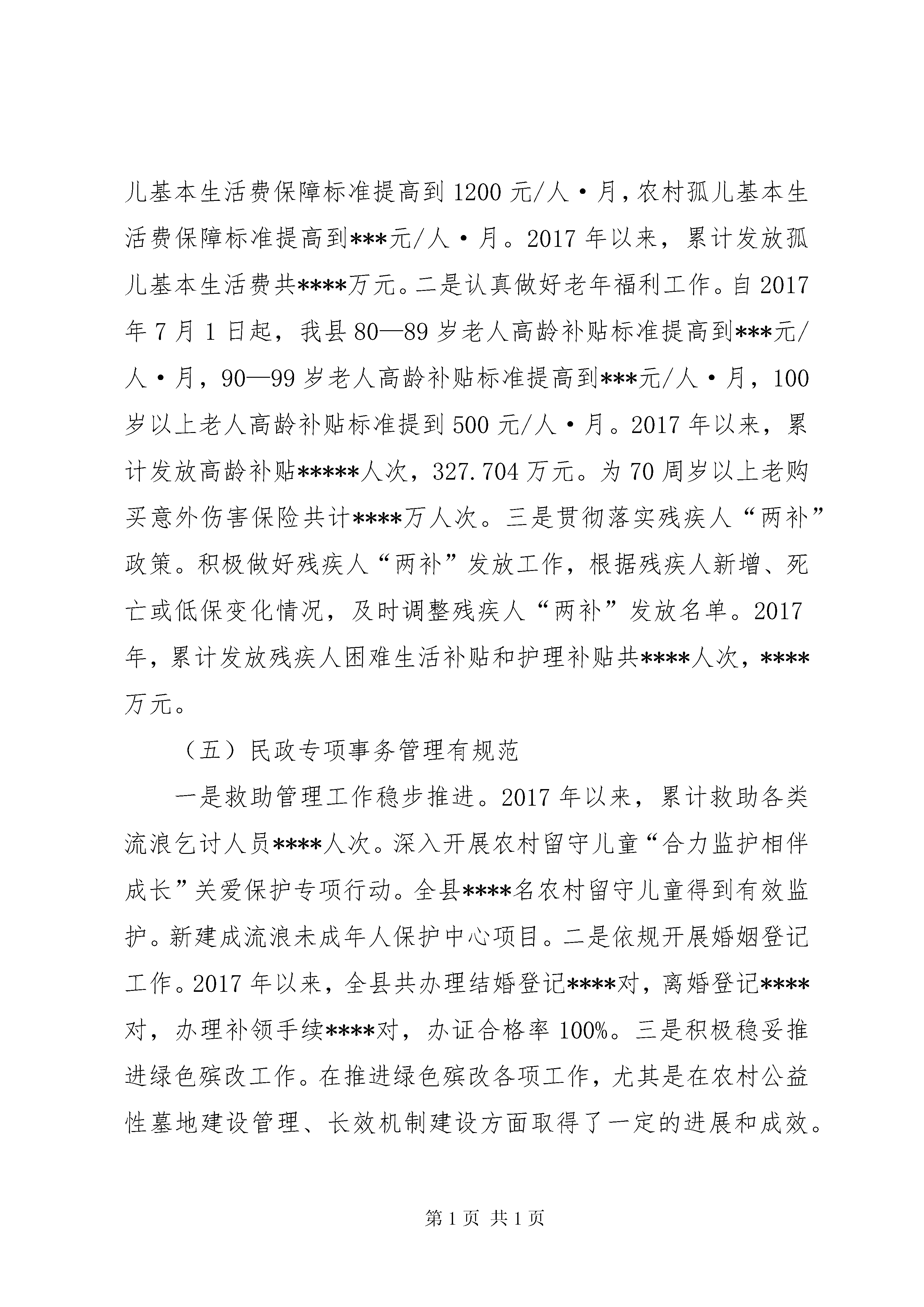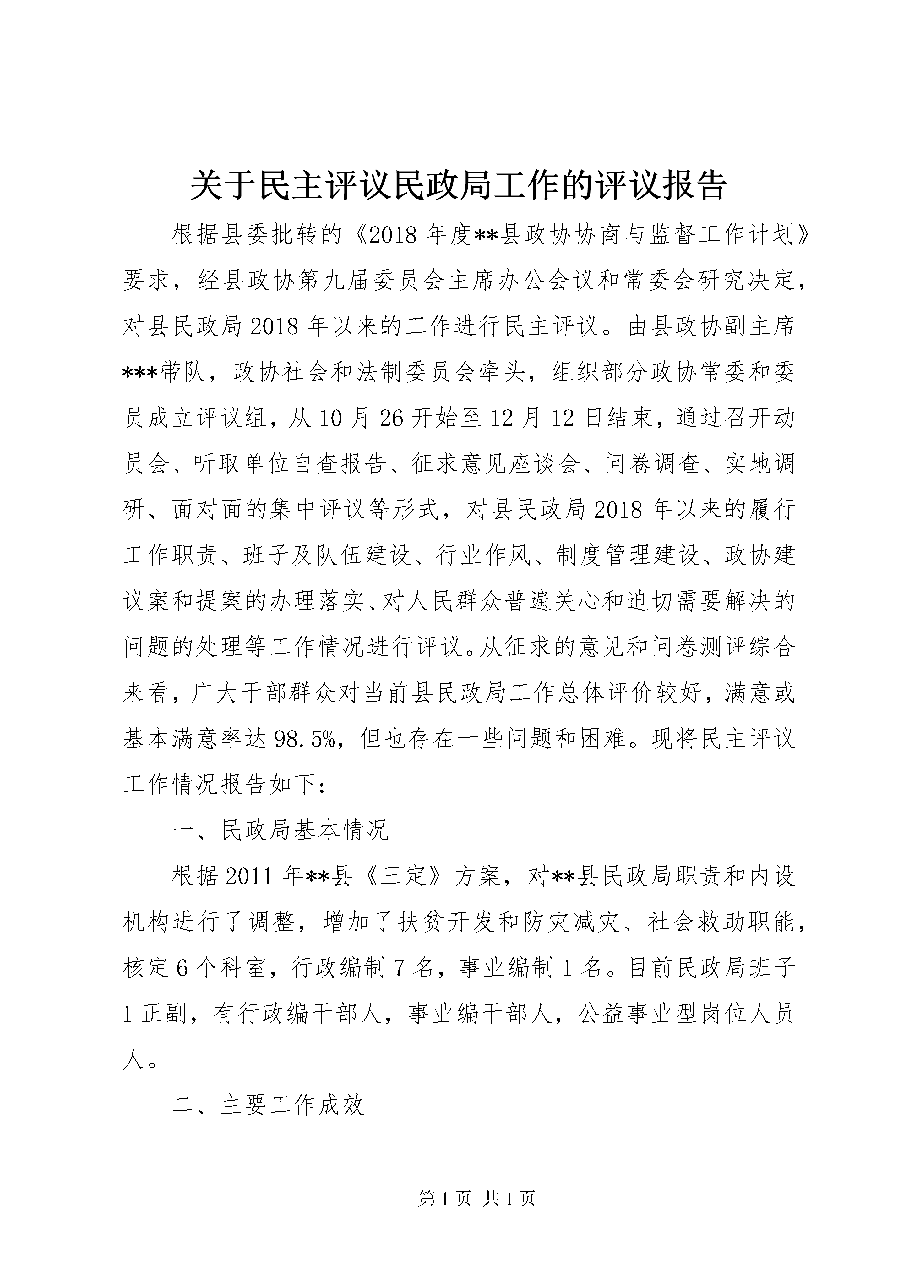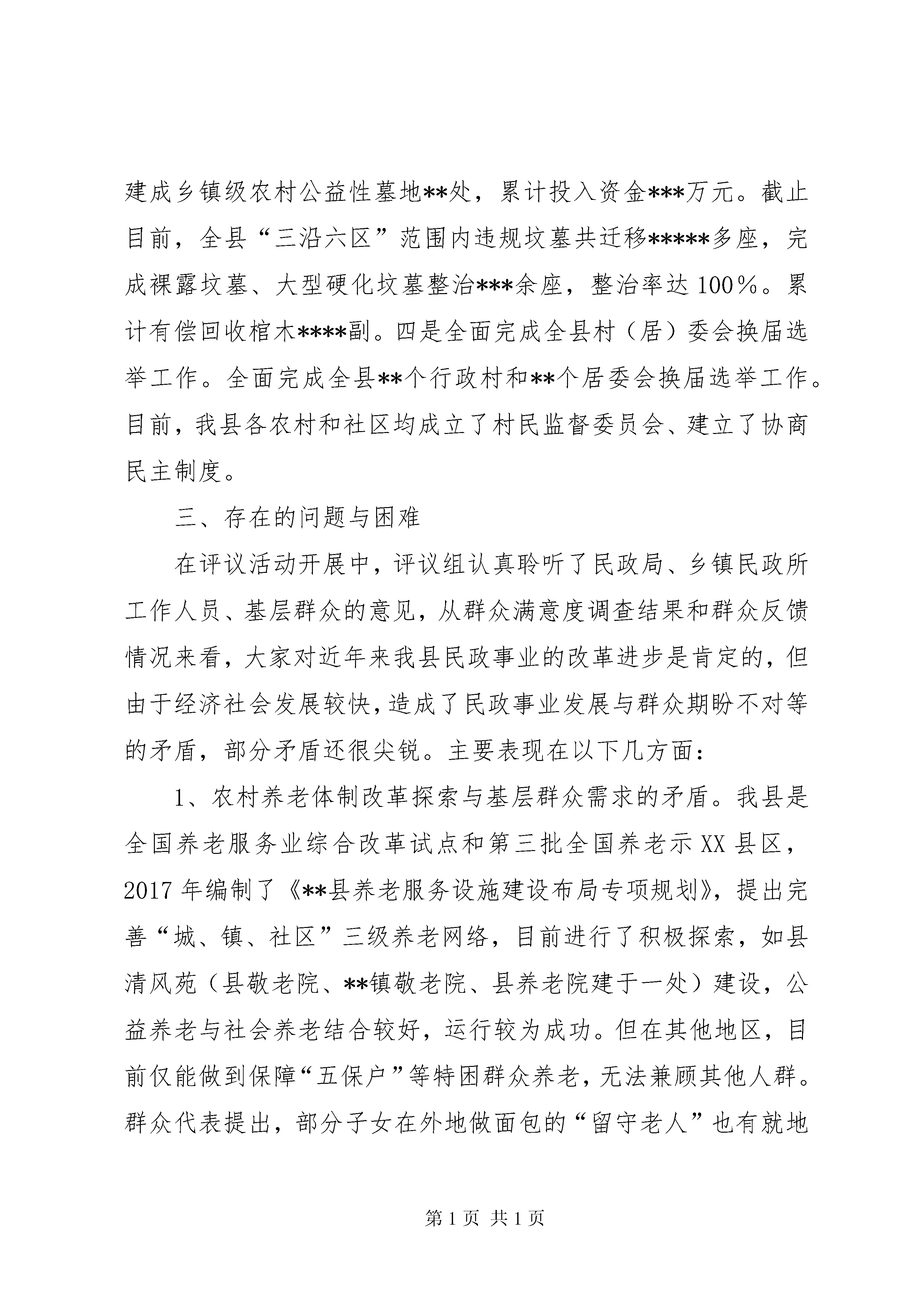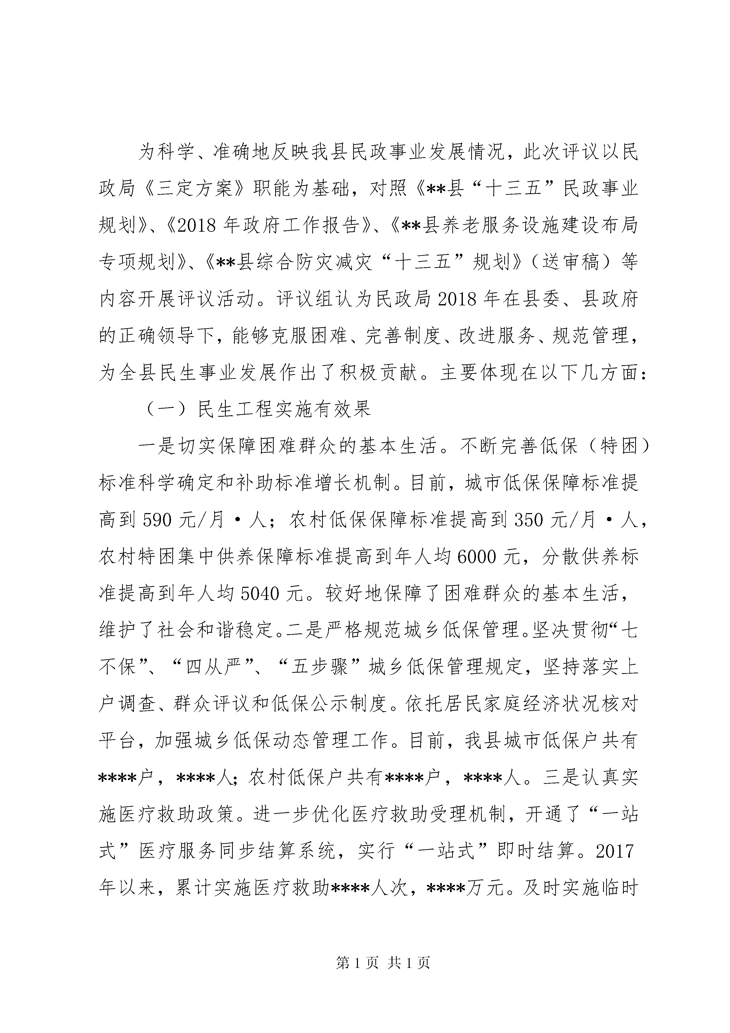 关于民主评议民政局工作的评议报告根据县委批转的《2018年度**县政协协商与监督工作计划》要求,经县政协第九届委员会主席办公会议和常委会研究决定,对县民政局2018年以来的工作进行民主评议。由县政协副主席***带队,政协社会和法制委员会牵头,组织部分政协常委和委员成立评议组,从10月26开始至12月12日结束,通过召开动员会、听取单位自查报告、征求意见座谈会、问卷调查、实地调研、面对面的集中评议等形式,对县民政局2018年以来的履行工作职责、班子及队伍建设、行业作风、制度管理建设、政协建议案和提案的办理落实、对人民群众普遍关心和迫切需要解决的问题的处理等工作情况进行评议。从征求的意见和问卷测评综合来看,广大干部群众对当前县民政局工作总体评价较好,满意或基本满意率达98.5%,但也存在一些问题和困难。现将民主评议工作情况报告如下:一、民政局基本情况根据2011年**县《三定》方案,对**县民政局职责和内设机构进行了调整,增加了扶贫开发和防灾减灾、社会救助职能,核定6个科室,行政编制7名,事业编制1名。目前民政局班子1正副,有行政编干部人,事业编干部人,公益事业型岗位人员人。二、主要工作成效为科学、准确地反映我县民政事业发展情况,此次评议以民政局《三定方案》职能为基础,对照《**县“十三五”民政事业规划》、《2018年政府工作报告》、《**县养老服务设施建设布局专项规划》、《**县综合防灾减灾“十三五”规划》(送审稿)等内容开展评议活动。评议组认为民政局2018年在县委、县政府的正确领导下,能够克服困难、完善制度、改进服务、规范管理,为全县民生事业发展作出了积极贡献。主要体现在以下几方面:(一)民生工程实施有效果一是切实保障困难群众的基本生活。不断完善低保(特困)标准科学确定和补助标准增长机制。目前,城市低保保障标准提高到590元/月·人;农村低保保障标准提高到350元/月·人,农村特困集中供养保障标准提高到年人均6000元,分散供养标准提高到年人均5040元。较好地保障了困难群众的基本生活,维护了社会和谐稳定。二是严格规范城乡低保管理。坚决贯彻“七不保”、“四从严”、“五步骤”城乡低保管理规定,坚持落实上户调查、群众评议和低保公示制度。依托居民家庭经济状况核对平台,加强城乡低保动态管理工作。目前,我县城市低保户共有****户,****人;农村低保户共有****户,****人。三是认真实施医疗救助政策。进一步优化医疗救助受理机制,开通了“一站式”医疗服务同步结算系统,实行“一站式”即时结算。2017年以来,累计实施医疗救助****人次,****万元。及时实施临时救助,累计实施临时救助****人次,****万元,极大缓解了困难群众因病、因灾等临时困境。(二)灾害应急救助有保障一是健全灾害应急管理体制。推进综合减灾救灾体系建设,不断完善《**县灾害应急预案》等防灾减灾救灾机制,有效应对各类自然灾害。二是及时准确发放救灾物资。2017年以来,累计下拨救灾资金****万元,保障了灾区灾民基本生活。三是积极开展防灾减灾宣传。充分利用电视台、民政微信公众号、微博等新媒体,通过印发宣传单、宣传车、播放防灾减灾宣传片等多种形式,开展“5·12”防灾减灾宣传活动。(三)拥军优属工作有落实一是优抚对象各项政策得到落实。2017年以来,累计发放人次,发放金额208万元。二是积极稳妥地推进退役士兵安置改革。2017年以来,累计接收退役士兵100人,发放一次性经济补助金121万元;鼓励引导11名退役士兵参加职业技能培训,发放生活补助1.29万元。三是广泛开展拥军优属和公祭日活动。2017年以来,累计走访慰问优抚对象1200人次,发放慰问物资60万元。(四)新型社会福利体系有优化一是认真做好孤儿救助金发放工作。2018年起,城市孤儿基本生活费保障标准提高到800元/人·月,机构集中供养的孤儿基本生活费保障标准提高到1200元/人·月,农村孤儿基本生活费保障标准提高到***元/人·月。2017年以来,累计发放孤儿基本生活费共****万元。二是认真做好老年福利工作。自2017年7月1日起,我县80—89岁老人高龄补贴标准提高到***元/人·月,90—99岁老人高龄补贴标准提高到***元/人·月,100岁以上老人高龄补贴标准提到500元/人·月。2017年以来,累计发放高龄补贴*****人次,327.704万元。为70周岁以上老购买意外伤害保险共计****万人次。三是贯彻落实残疾人“两补”政策。积极做好残疾人“两补”发放工作,根据残疾人新增、死亡或低保变化情况,及时调整残疾人“两补”发放名单。2017年,累计发放残疾人困难生活补贴和护理补贴共****人次,****万元。(五)民政专项事务管理有规范一是救助管理工作稳步推进。2017年以来,