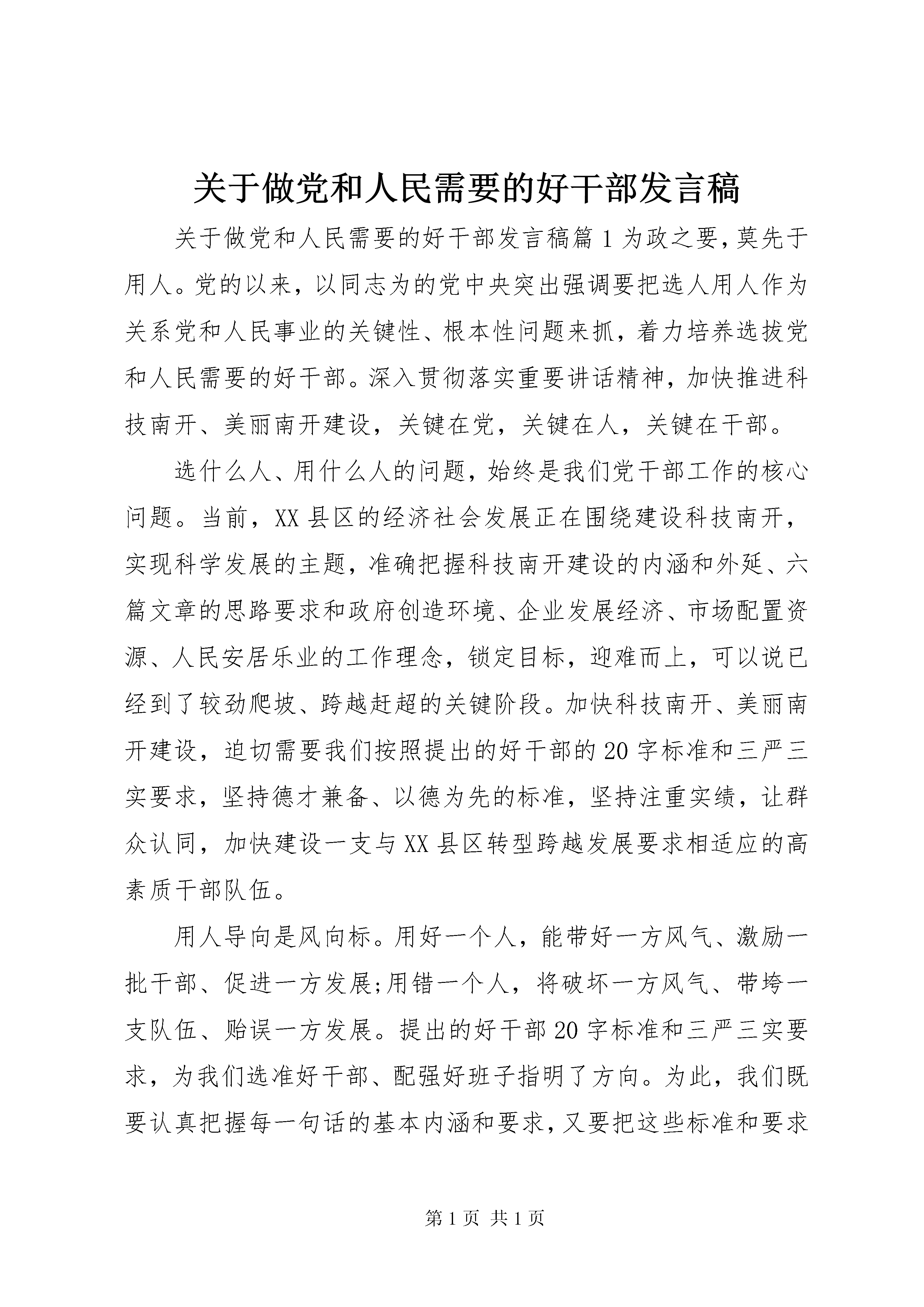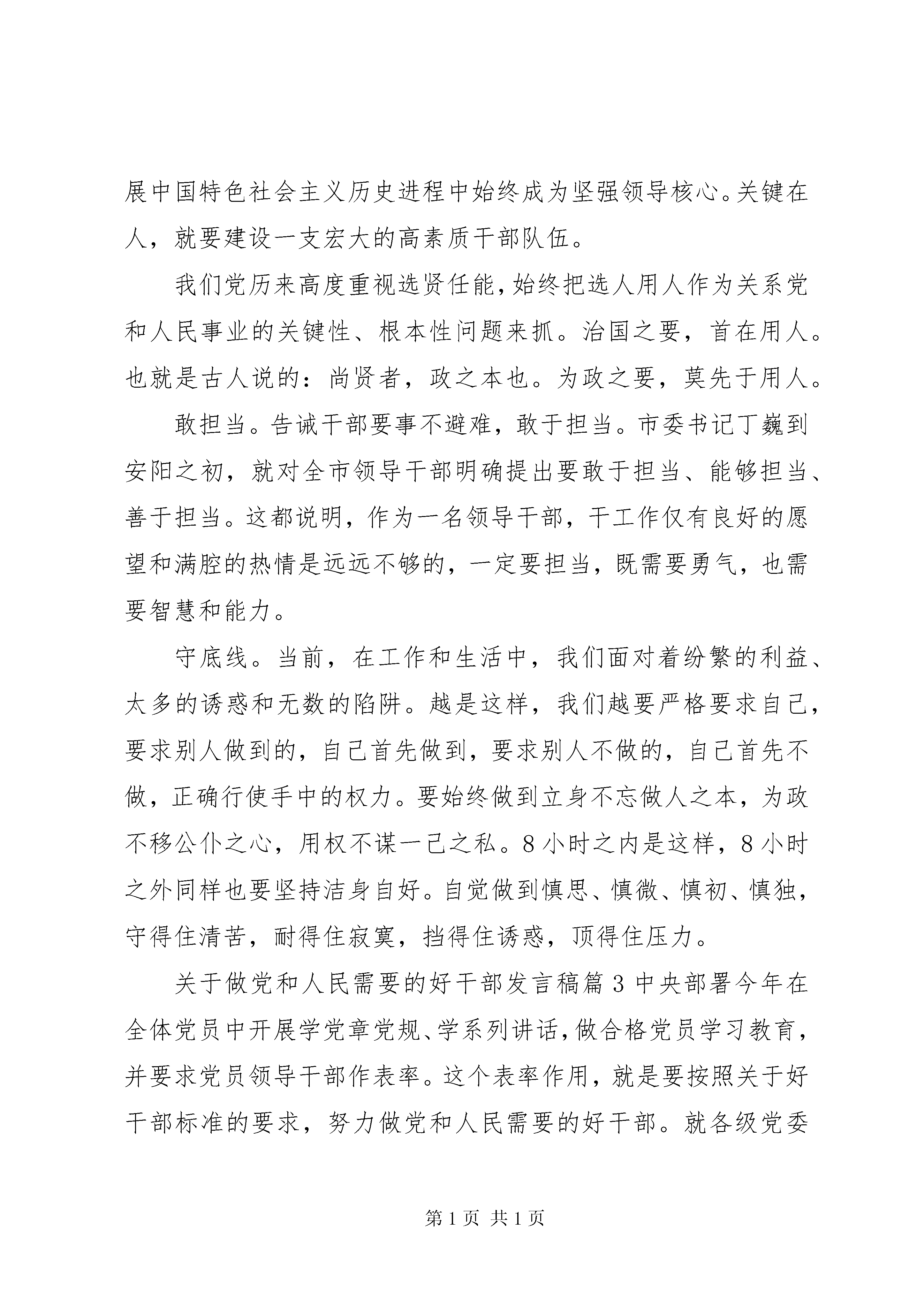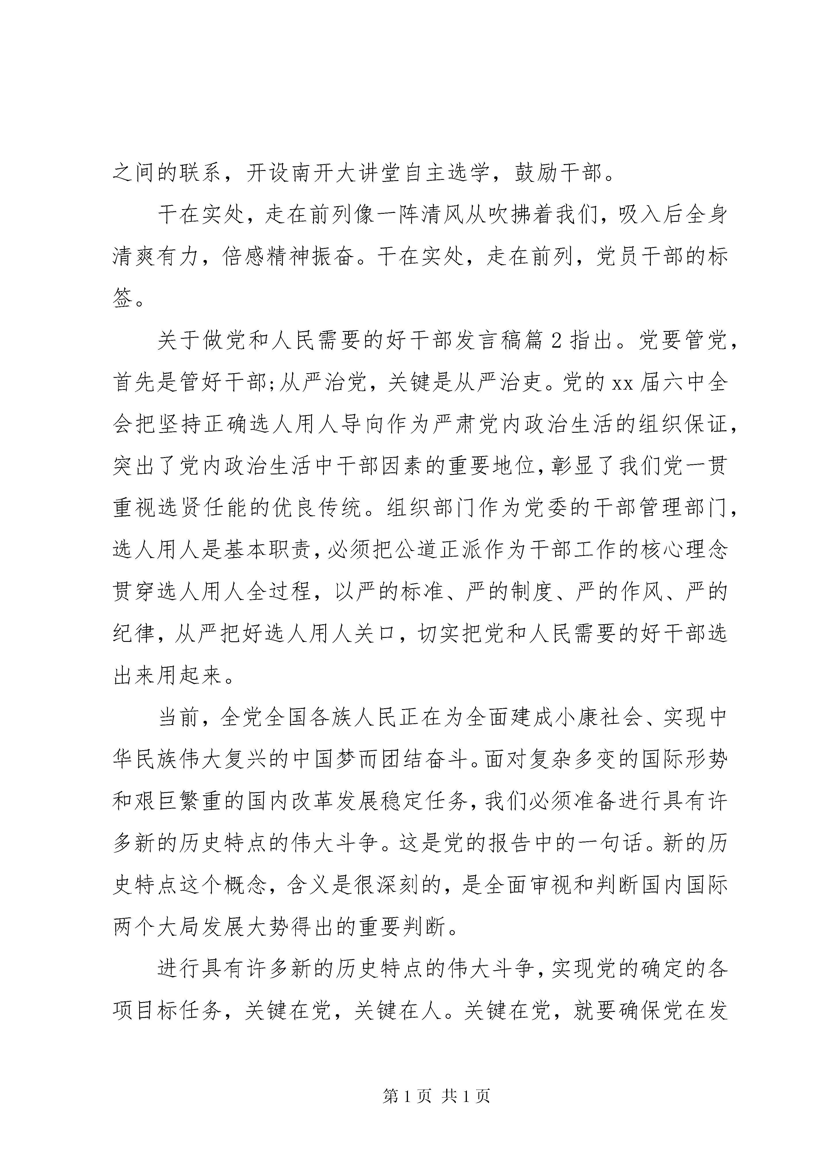 关于做党和人民需要的好干部发言稿关于做党和人民需要的好干部发言稿篇1为政之要,莫先于用人。党的以来,以同志为的党中央突出强调要把选人用人作为关系党和人民事业的关键性、根本性问题来抓,着力培养选拔党和人民需要的好干部。深入贯彻落实重要讲话精神,加快推进科技南开、美丽南开建设,关键在党,关键在人,关键在干部。选什么人、用什么人的问题,始终是我们党干部工作的核心问题。当前,XX县区的经济社会发展正在围绕建设科技南开,实现科学发展的主题,准确把握科技南开建设的内涵和外延、六篇文章的思路要求和政府创造环境、企业发展经济、市场配置资源、人民安居乐业的工作理念,锁定目标,迎难而上,可以说已经到了较劲爬坡、跨越赶超的关键阶段。加快科技南开、美丽南开建设,迫切需要我们按照提出的好干部的20字标准和三严三实要求,坚持德才兼备、以德为先的标准,坚持注重实绩,让群众认同,加快建设一支与XX县区转型跨越发展要求相适应的高素质干部队伍。用人导向是风向标。用好一个人,能带好一方风气、激励一批干部、促进一方发展;用错一个人,将破坏一方风气、带垮一支队伍、贻误一方发展。提出的好干部20字标准和三严三实要求,为我们选准好干部、配强好班子指明了方向。为此,我们既要认真把握每一句话的基本内涵和要求,又要把这些标准和要求作为一个整体去融会贯通、综合考量,充分运用到XX县区干部教育培养、管理监督、考核评价和选拔任用的全过程,牢固树立真抓实干、良好作风、注重基层的选人用人导向,真正把那些重品行、敢担当、能干事、守廉洁、口碑好的干部发现出、培养好、使用好,为科技南开、美丽南开建设提供更加坚强的组织保证。强调:好干部不会自然而然产生。成长为一个好干部,一靠自身努力,二靠组织培养。组织部门肩负着教育培养的重要职责,必须自觉履职尽责,在引导广大干部转变工作作风、锤炼政治定力、提高群众工作能力上有更加积极的作为。1.常补精神之钙。我们举办了党政一把手专题研修班、处级干部进修班、新任副职培训班、科级干部任职培训班等主体班次,认真抓好对党的xx届三中全会、四中全会和系列重要讲话精神的学习贯彻,把理想信念、党性修养、道德品质作为干部教育培训的重要内容和基础工程,引导党员干部以先辈、先进为镜,铸信仰之基,怀敬畏之心,强为民之责,不断增强道路自信、理论自信、制度自信,时刻保持政治上的清醒和坚定。2.常充能力之电。树立按需培训的理念,做到事业需要什么就培训什么,干部缺少什么就培训什么,不断增强领导班子和领导干部学以致用、推进改革的能力。特别是针对XX县区干部队伍专业化程度不够高,金融、经济、城市规划与建设、现代服务业等专业干部匮乏的问题,我们采取加强与驻区高校、科学院所之间的联系,开设南开大讲堂自主选学,鼓励干部。干在实处,走在前列像一阵清风从吹拂着我们,吸入后全身清爽有力,倍感精神振奋。干在实处,走在前列,党员干部的标签。关于做党和人民需要的好干部发言稿篇2指出。党要管党,首先是管好干部;从严治党,关键是从严治吏。党的xx届六中全会把坚持正确选人用人导向作为严肃党内政治生活的组织保证,突出了党内政治生活中干部因素的重要地位,彰显了我们党一贯重视选贤任能的优良传统。组织部门作为党委的干部管理部门,选人用人是基本职责,必须把公道正派作为干部工作的核心理念贯穿选人用人全过程,以严的标准、严的制度、严的作风、严的纪律,从严把好选人用人关口,切实把党和人民需要的好干部选出来用起来。当前,全党全国各族人民正在为全面建成小康社会、实现中华民族伟大复兴的中国梦而团结奋斗。面对复杂多变的国际形势和艰巨繁重的国内改革发展稳定任务,我们必须准备进行具有许多新的历史特点的伟大斗争。这是党的报告中的一句话。新的历史特点这个概念,含义是很深刻的,是全面审视和判断国内国际两个大局发展大势得出的重要判断。进行具有许多新的历史特点的伟大斗争,实现党的确定的各项目标任务,关键在党,关键在人。关键在党,就要确保党在发展中国特色社会主义历史进程中始终成为坚强领导核心。关键在人,就要建设一支宏大的高素质干部队伍。我们党历来高度重视选贤任能,始终把选人用人作为关系党和人民事业的关键性、根本性问题来抓。治国之要,首在用人。也就是古人说的:尚贤者,政之本也。为政之要,莫先于用人。敢担当。告诫干部要事不避难,敢于担当。市委书记丁巍到安阳之初,就对全市领导干部明确提出要敢于担当、能够担当、善于担当。这都说明,作为一名领导干部,干工作仅有良好的愿望和满腔的热情是远远不够的,一定要担当,既需要勇气,也需要智慧和能力。守底线。当前,在工作和生活中,我们面对着纷繁的利益、太多的诱惑和无数的陷阱。越是这样,我们越要严格要求自己,要求别人做到的,自己首先做到,要求别人不做的,自己首先不做,正确行使手中的权力。要始终做到立身不忘做