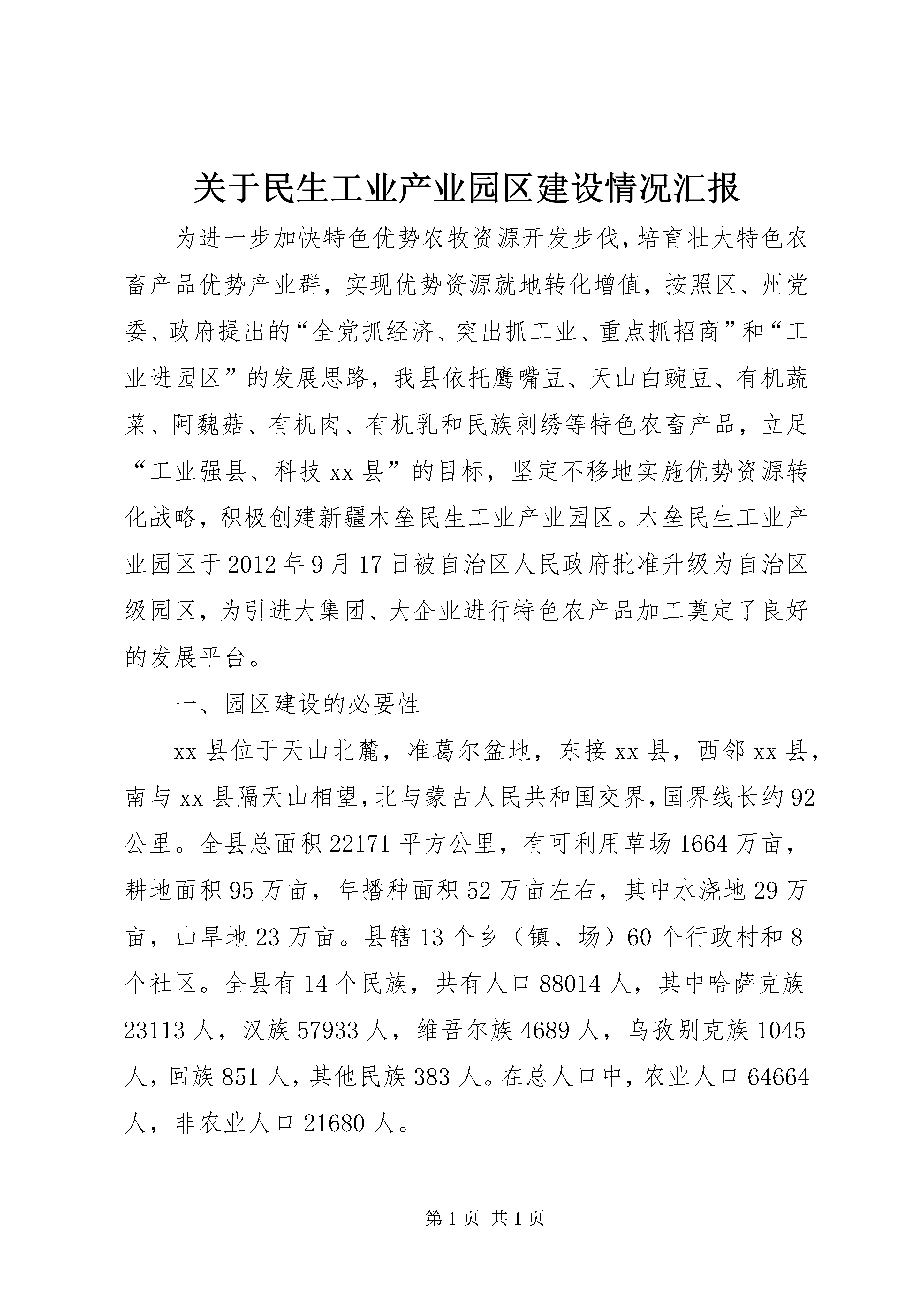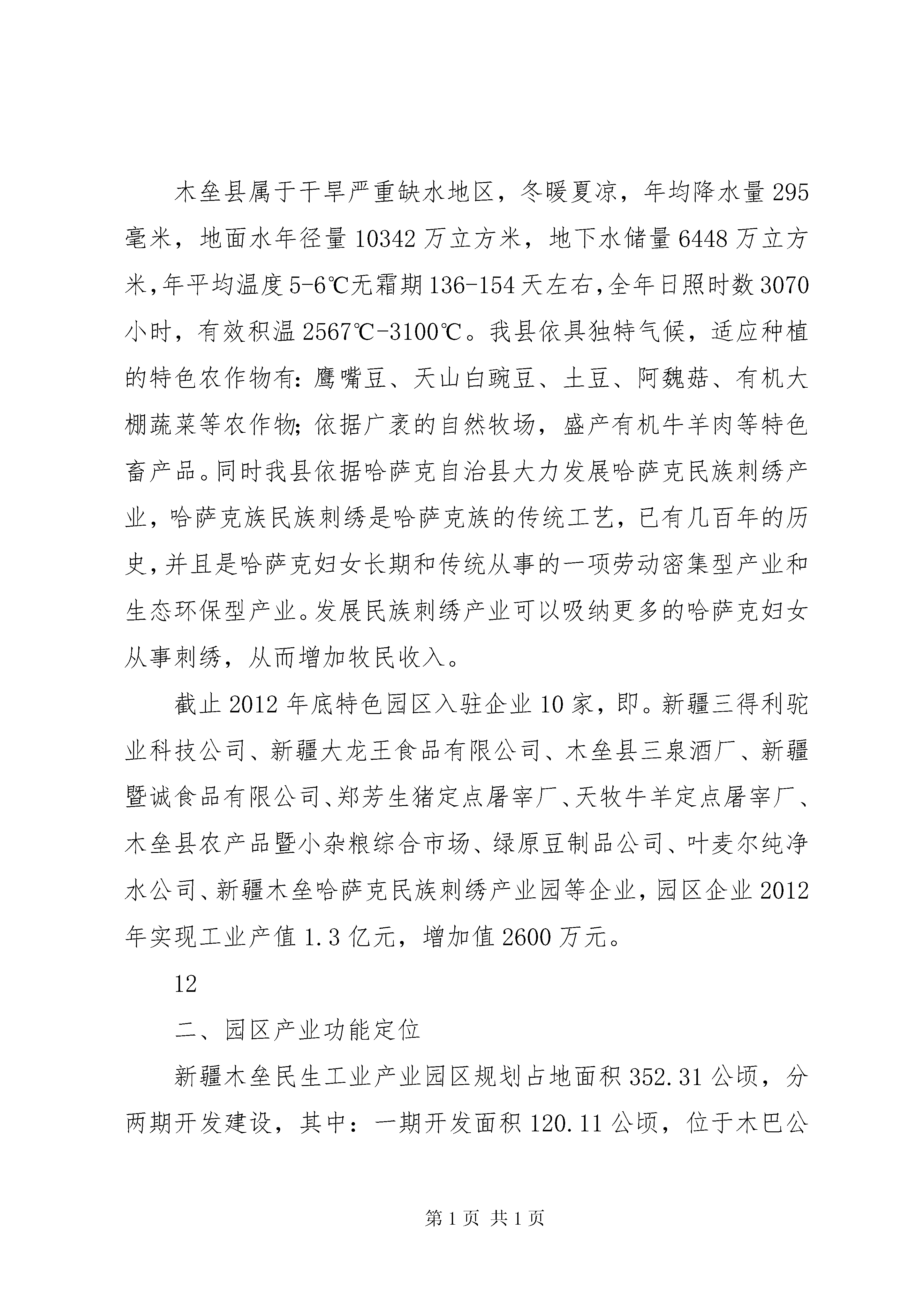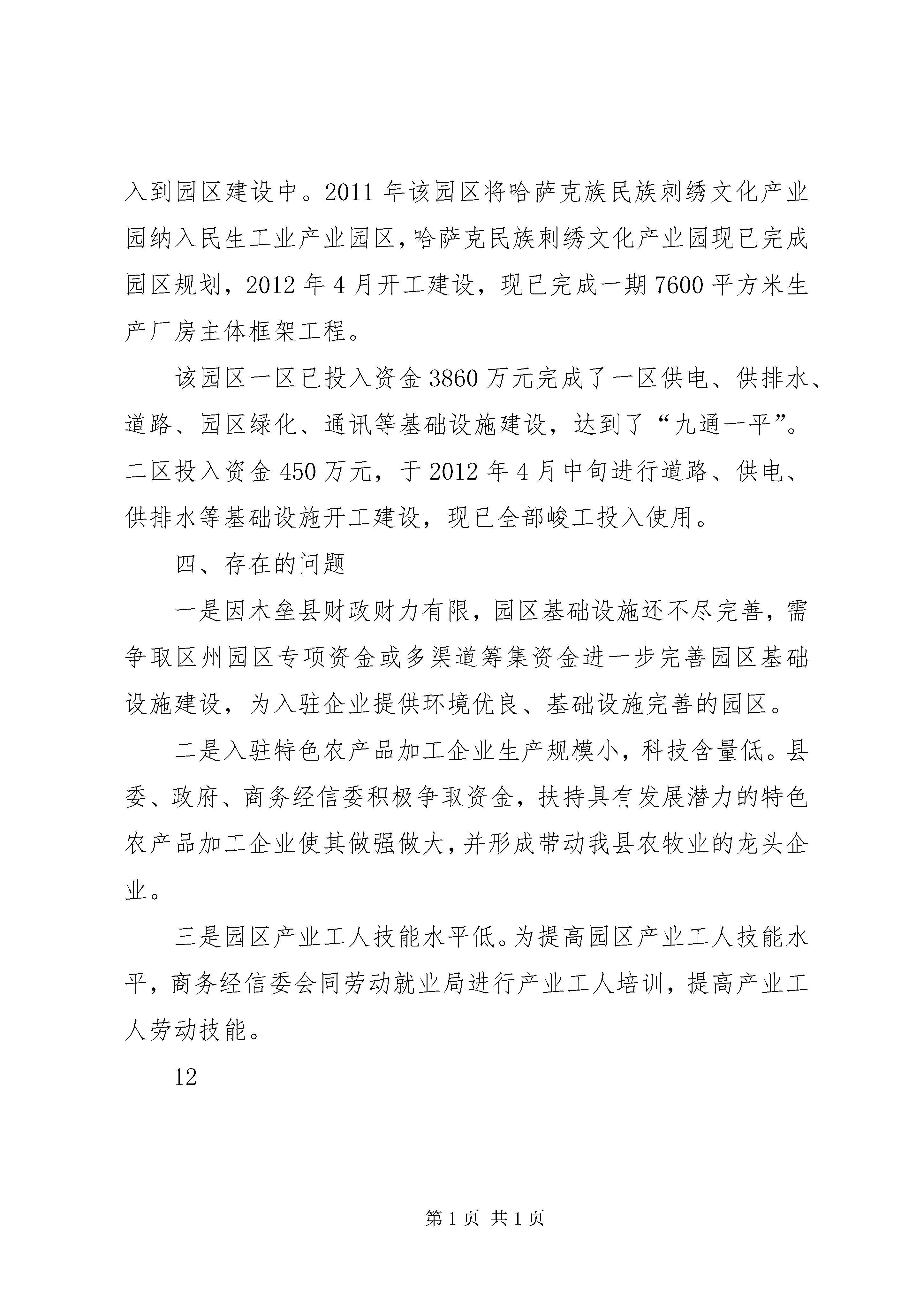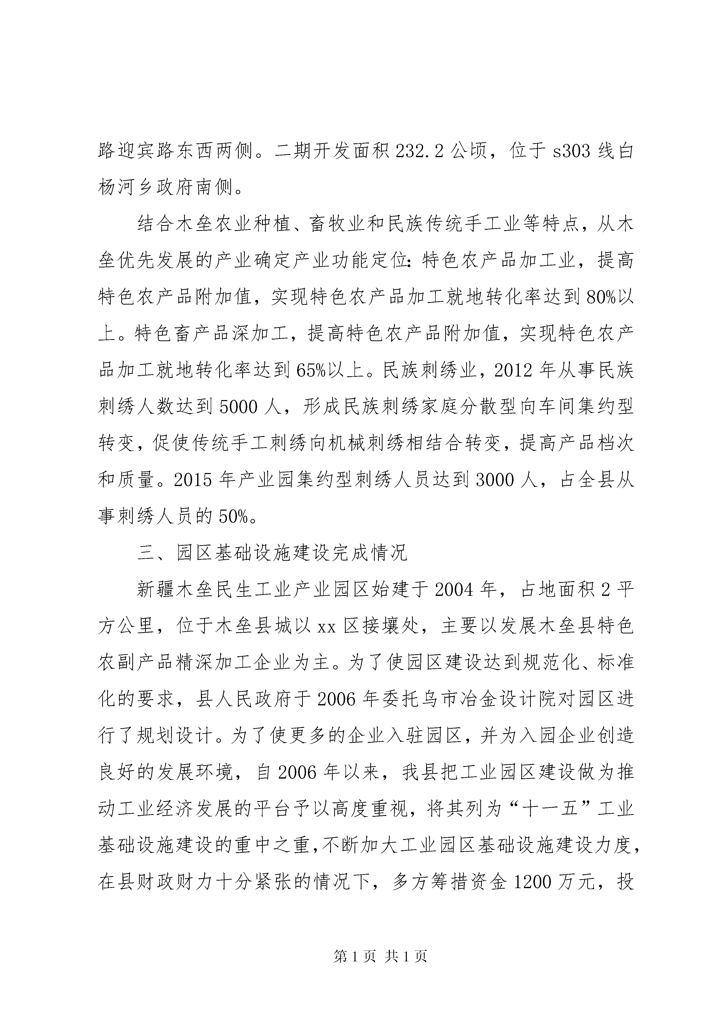 关于民生工业产业园区建设情况汇报为进一步加快特色优势农牧资源开发步伐,培育壮大特色农畜产品优势产业群,实现优势资源就地转化增值,按照区、州党委、政府提出的“全党抓经济、突出抓工业、重点抓招商”和“工业进园区”的发展思路,我县依托鹰嘴豆、天山白豌豆、有机蔬菜、阿魏菇、有机肉、有机乳和民族刺绣等特色农畜产品,立足“工业强县、科技xx县”的目标,坚定不移地实施优势资源转化战略,积极创建新疆木垒民生工业产业园区。木垒民生工业产业园区于2012年9月17日被自治区人民政府批准升级为自治区级园区,为引进大集团、大企业进行特色农产品加工奠定了良好的发展平台。一、园区建设的必要性xx县位于天山北麓,准葛尔盆地,东接xx县,西邻xx县,南与xx县隔天山相望,北与蒙古人民共和国交界,国界线长约92公里。全县总面积22171平方公里,有可利用草场1664万亩,耕地面积95万亩,年播种面积52万亩左右,其中水浇地29万亩,山旱地23万亩。县辖13个乡(镇、场)60个行政村和8个社区。全县有14个民族,共有人口88014人,其中哈萨克族23113人,汉族57933人,维吾尔族4689人,乌孜别克族1045人,回族851人,其他民族383人。在总人口中,农业人口64664人,非农业人口21680人。木垒县属于干旱严重缺水地区,冬暖夏凉,年均降水量295毫米,地面水年径量10342万立方米,地下水储量6448万立方米,年平均温度5-6℃无霜期136-154天左右,全年日照时数3070小时,有效积温2567℃-3100℃。我县依具独特气候,适应种植的特色农作物有:鹰嘴豆、天山白豌豆、土豆、阿魏菇、有机大棚蔬菜等农作物;依据广袤的自然牧场,盛产有机牛羊肉等特色畜产品。同时我县依据哈萨克自治县大力发展哈萨克民族刺绣产业,哈萨克族民族刺绣是哈萨克族的传统工艺,已有几百年的历史,并且是哈萨克妇女长期和传统从事的一项劳动密集型产业和生态环保型产业。发展民族刺绣产业可以吸纳更多的哈萨克妇女从事刺绣,从而增加牧民收入。截止2012年底特色园区入驻企业10家,即。新疆三得利驼业科技公司、新疆大龙王食品有限公司、木垒县三泉酒厂、新疆暨诚食品有限公司、郑芳生猪定点屠宰厂、天牧牛羊定点屠宰厂、木垒县农产品暨小杂粮综合市场、绿原豆制品公司、叶麦尔纯净水公司、新疆木垒哈萨克民族刺绣产业园等企业,园区企业2012年实现工业产值1.3亿元,增加值2600万元。12二、园区产业功能定位新疆木垒民生工业产业园区规划占地面积352.31公顷,分两期开发建设,其中:一期开发面积120.11公顷,位于木巴公路迎宾路东西两侧。二期开发面积232.2公顷,位于s303线白杨河乡政府南侧。结合木垒农业种植、畜牧业和民族传统手工业等特点,从木垒优先发展的产业确定产业功能定位:特色农产品加工业,提高特色农产品附加值,实现特色农产品加工就地转化率达到80%以上。特色畜产品深加工,提高特色农产品附加值,实现特色农产品加工就地转化率达到65%以上。民族刺绣业,2012年从事民族刺绣人数达到5000人,形成民族刺绣家庭分散型向车间集约型转变,促使传统手工刺绣向机械刺绣相结合转变,提高产品档次和质量。2015年产业园集约型刺绣人员达到3000人,占全县从事刺绣人员的50%。三、园区基础设施建设完成情况新疆木垒民生工业产业园区始建于2004年,占地面积2平方公里,位于木垒县城以xx区接壤处,主要以发展木垒县特色农副产品精深加工企业为主。为了使园区建设达到规范化、标准化的要求,县人民政府于2006年委托乌市冶金设计院对园区进行了规划设计。为了使更多的企业入驻园区,并为入园企业创造良好的发展环境,自2006年以来,我县把工业园区建设做为推动工业经济发展的平台予以高度重视,将其列为“十一五”工业基础设施建设的重中之重,不断加大工业园区基础设施建设力度,在县财政财力十分紧张的情况下,多方筹措资金1200万元,投入到园区建设中。2011年该园区将哈萨克族民族刺绣文化产业园纳入民生工业产业园区,哈萨克民族刺绣文化产业园现已完成园区规划,2012年4月开工建设,现已完成一期7600平方米生产厂房主体框架工程。该园区一区已投入资金3860万元完成了一区供电、供排水、道路、园区绿化、通讯等基础设施建设,达到了“九通一平”。二区投入资金450万元,于2012年4月中旬进行道路、供电、供排水等基础设施开工建设,现已全部峻工投入使用。四、存在的问题一是因木垒县财政财力有限,园区基础设施还不尽完善,需争取区州园区专项资金或多渠道筹集资金进一步完善园区基础设施建设,为入驻企业提供环境优良、基础设施完善的园区。二是入驻特色农产品加工企业生产规模小,科技含量低。县委、政府、商务经信委积极争取资金,扶持具有发展潜力的特色农产品