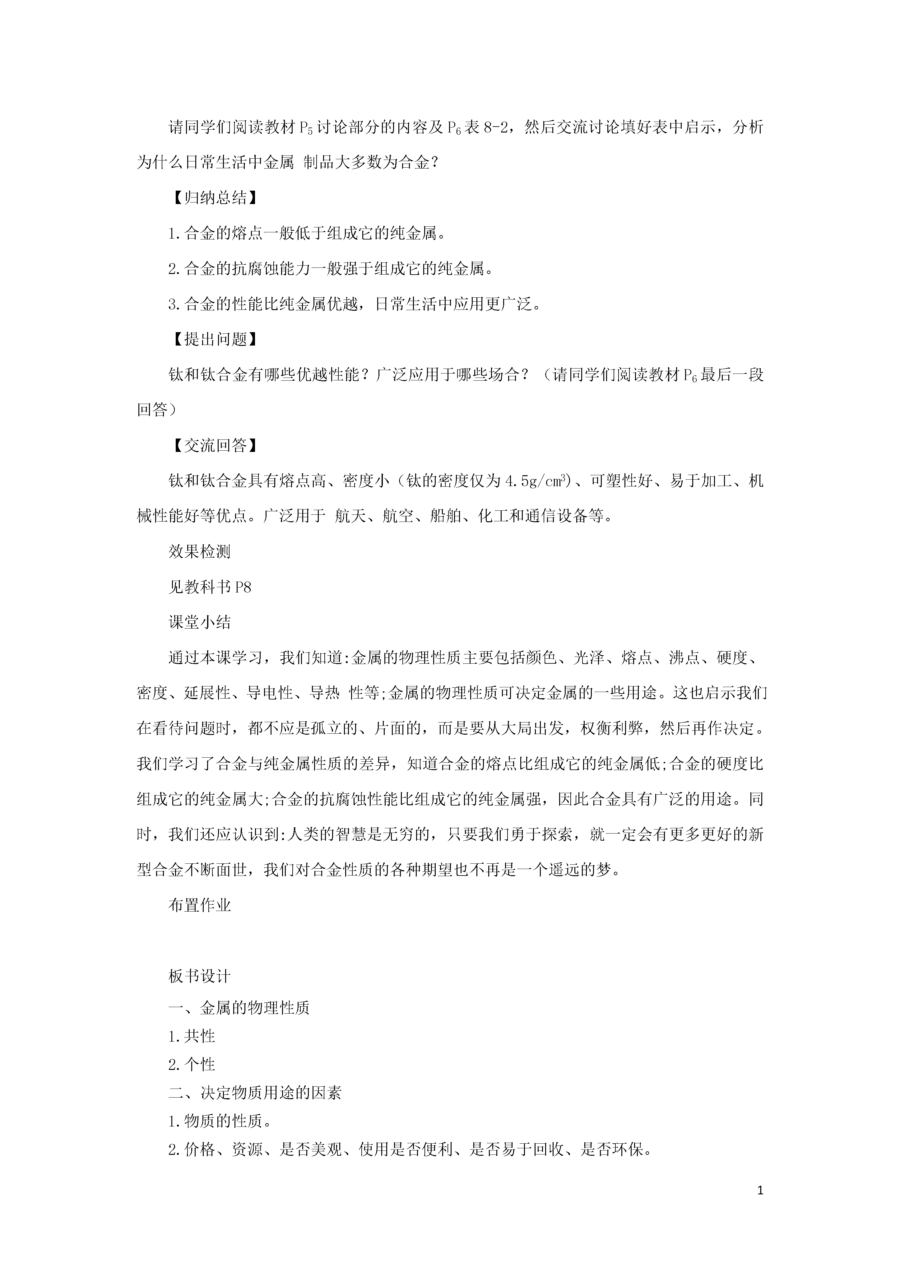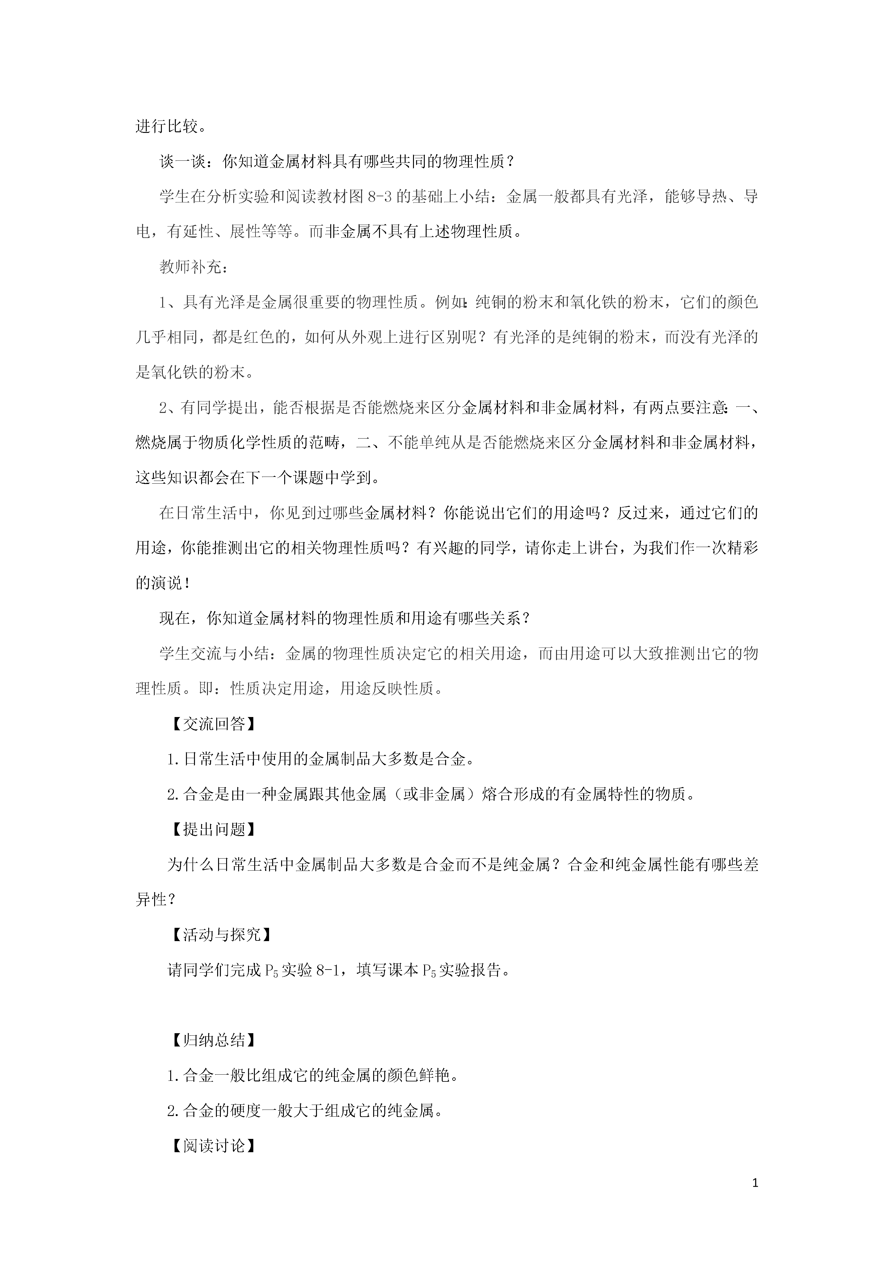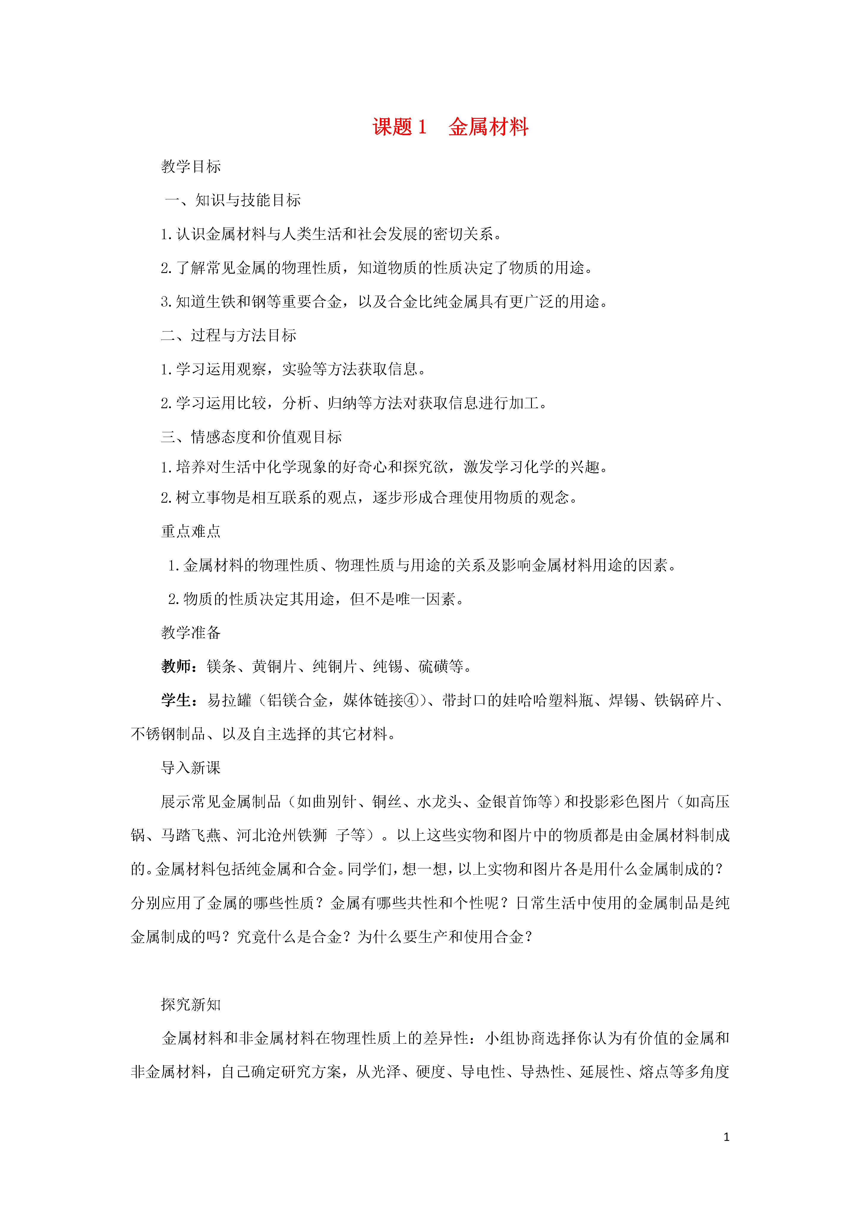1课题1金属材料教学目标知识与技能目标1.认识金属材料与人类生活和社会发展的密切关系。2.了解常见金属的物理性质,知道物质的性质决定了物质的用途。3.知道生铁和钢等重要合金,以及合金比纯金属具有更广泛的用途。二、过程与方法目标1.学习运用观察,实验等方法获取信息。2.学习运用比较,分析、归纳等方法对获取信息进行加工。三、情感态度和价值观目标1.培养对生活中化学现象的好奇心和探究欲,激发学习化学的兴趣。2.树立事物是相互联系的观点,逐步形成合理使用物质的观念。重点难点1.金属材料的物理性质、物理性质与用途的关系及影响金属材料用途的因素。2.物质的性质决定其用途,但不是唯一因素。教学准备教师:镁条、黄铜片、纯铜片、纯锡、硫磺等。学生:易拉罐(铝镁合金,媒体链接④)、带封口的娃哈哈塑料瓶、焊锡、铁锅碎片、不锈钢制品、以及自主选择的其它材料。导入新课展示常见金属制品(如曲别针、铜丝、水龙头、金银首饰等)和投影彩色图片(如高压锅、马踏飞燕、河北沧州铁狮子等)。以上这些实物和图片中的物质都是由金属材料制成的。金属材料包括纯金属和合金。同学们,想一想,以上实物和图片各是用什么金属制成的?分别应用了金属的哪些性质?金属有哪些共性和个性呢?日常生活中使用的金属制品是纯金属制成的吗?究竟什么是合金?为什么要生产和使用合金?探究新知金属材料和非金属材料在物理性质上的差异性:小组协商选择你认为有价值的金属和非金属材料,自己确定研究方案,从光泽、硬度、导电性、导热性、延展性、熔点等多角度进行比较。谈一谈:你知道金属材料具有哪些共同的物理性质?学生在分析实验和阅读教材图8-3的基础上小结:金属一般都具有光泽,能够导热、导电,有延性、展性等等。而非金属不具有上述物理性质。教师补充:1、具有光泽是金属很重要的物理性质。例如:纯铜的粉末和氧化铁的粉末,它们的颜色几乎相同,都是红色的,如何从外观上进行区别呢?有光泽的是纯铜的粉末,而没有光泽的是氧化铁的粉末。2、有同学提出,能否根据是否能燃烧来区分金属材料和非金属材料,有两点要注意:一、燃烧属于物质化学性质的范畴,二、不能单纯从是否能燃烧来区分金属材料和非金属材料,这些知识都会在下一个课题中学到。在日常生活中,你见到过哪些金属材料?你能说出它们的用途吗?反过来,通过它们的用途,你能推测出它的相关物理性质吗?有兴趣的同学,请你走上讲台,为我们作一次精彩的演说!现在,你知道金属材料的物理性质和用途有哪些关系?学生交流与小结:金属的物理性质决定它的相关用途,而由用途可以大致推测出它的物理性质。即:性质决定用途,用途反映性质。【交流回答】1.日常生活中使用的金属制品大多数是合金。2.合金是由一种金属跟其他金属(或非金属)熔合形成的有金属特性的物质。【提出问题】为什么日常生活中金属制品大多数是合金而不是纯金属?合金和纯金属性能有哪些差异性?【活动与探究】请同学们完成P5实验8-1,填写课本P5实验报告。【归纳总结】1.合金一般比组成它的纯金属的颜色鲜艳。2.合金的硬度一般大于组成它的纯金属。【阅读讨论】请同学们阅读教材P5讨论部分的内容及P6表8-2,然后交流讨论填好表中启示,分析为什么日常生活中金属制品大多数为合金?【归纳总结】1.合金的熔点一般低于组成它的纯金属。2.合金的抗腐蚀能力一般强于组成它的纯金属。3.合金的性能比纯金属优越,日常生活中应用更广泛。【提出问题】钛和钛合金有哪些优越性能?广泛应用于哪些场合?(请同学们阅读教材P6最后一段回答)【交流回答】钛和钛合金具有熔点高、密度小(钛的密度仅为4.5g/cm3)、可塑性好、易于加工、机械性能好等优点。广泛用于航天、航空、船舶、化工和通信设备等。效果检测见教科书P8课堂小结通过本课学习,我们知道:金属的物理性质主要包括颜色、光泽、熔点、沸点、硬度、密度、延展性、导电性、导热性等;金属的物理性质可决定金属的一些用途。这也启示我们在看待问题时,都不应是孤立的、片面的,而是要从大局出发,权衡利弊,然后再作决定。我们学习了合金与纯金属性质的差异,知道合金的熔点比组成它的纯金属低;合金的硬度比组成它的纯金属大;合金的抗腐蚀性能比组成它的纯金属强,因此合金具有广泛的用途。同时,我们还应认识到:人类的智慧是无穷的,只要我们勇于探索,就一定会有更多更好的新型合金不断面世,我们对合金性质的各种期望也不再是一个遥远的梦。布置作业板书设计一、金属的物理性质1.共性2.个性二、决定物质用途的因素1.物质的性质。2.价格、资源、是否美观、使用是否便利、是否易于回收、是否环保。三、合金1.定义2.与纯金属性质比较(1)合金比组成它的纯金属的颜
