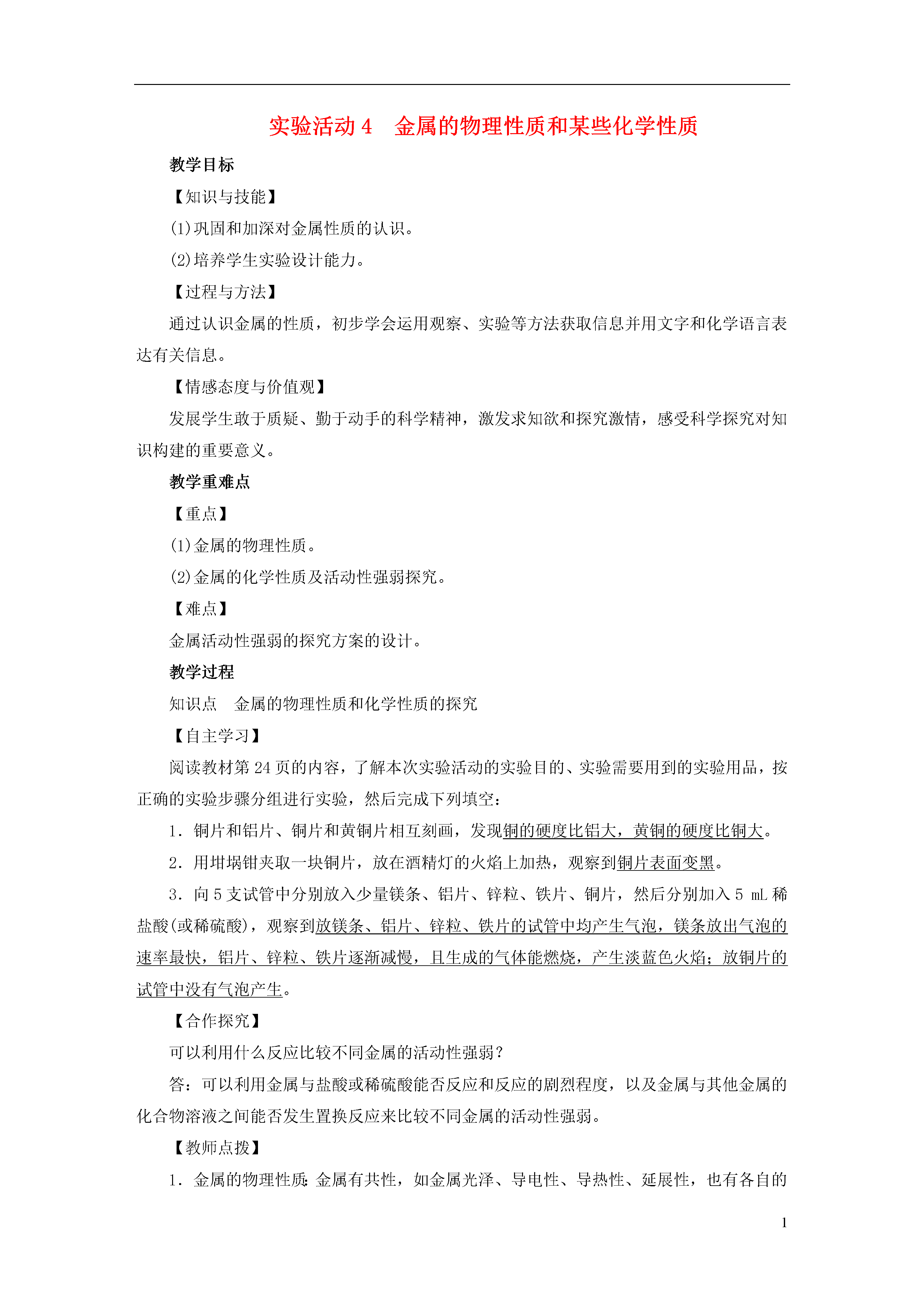 教案-全国-2018_2019届九年级化学下册 第8单元 金属和金属材料 实验活动4 金属的物理性质和某些化学性质教案 (新版)新人教版.doc