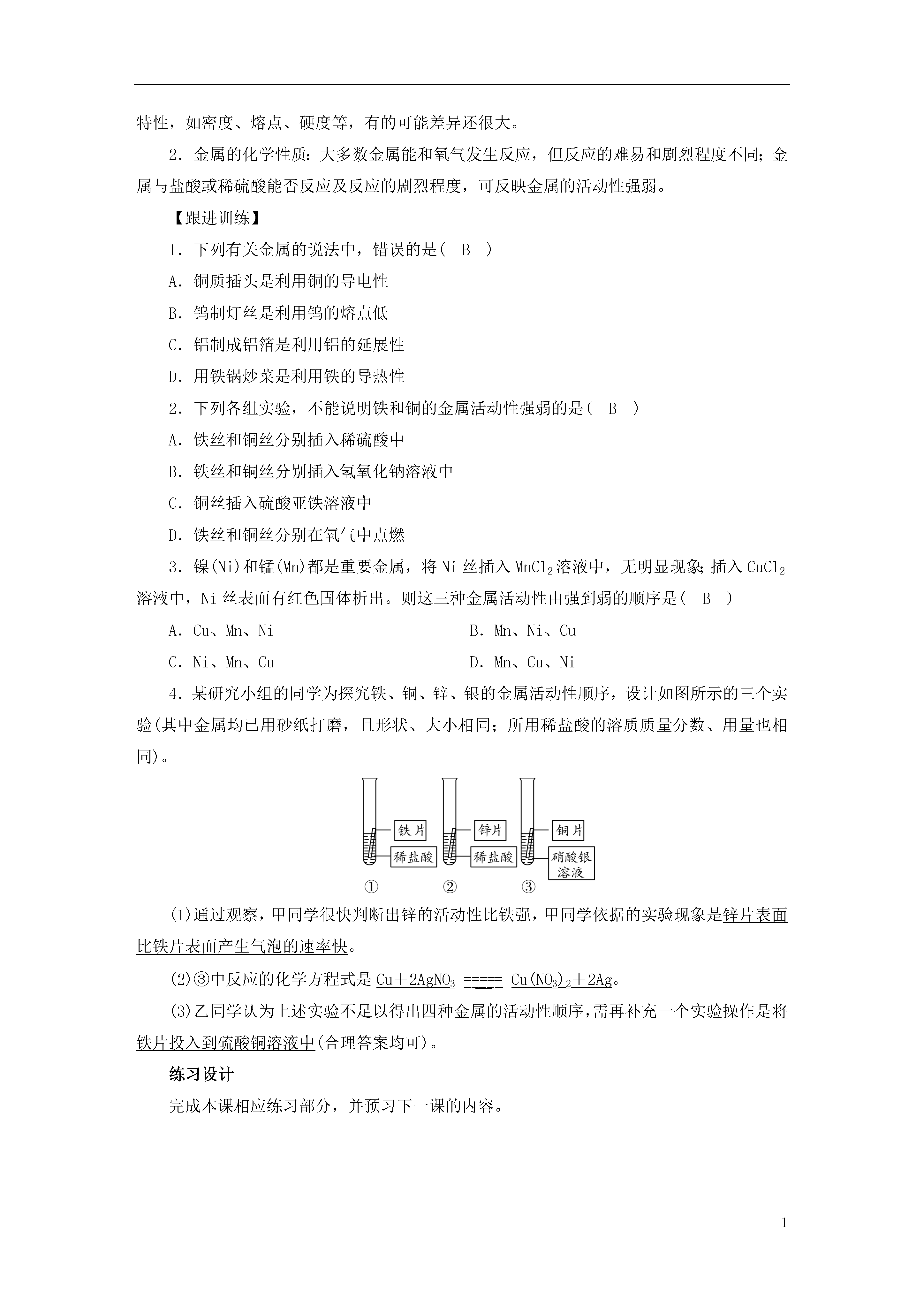 1实验活动4金属的物理性质和某些化学性质教学目标【知识与技能】(1)巩固和加深对金属性质的认识。(2)培养学生实验设计能力。【过程与方法】通过认识金属的性质,初步学会运用观察、实验等方法获取信息并用文字和化学语言表达有关信息。【情感态度与价值观】发展学生敢于质疑、勤于动手的科学精神,激发求知欲和探究激情,感受科学探究对知识构建的重要意义。教学重难点【重点】(1)金属的物理性质。(2)金属的化学性质及活动性强弱探究。【难点】金属活动性强弱的探究方案的设计。教学过程知识点金属的物理性质和化学性质的探究【自主学习】阅读教材的内容,了解本次实验活动的实验目的、实验需要用到的实验用品,按正确的实验步骤分组进行实验,然后完成下列填空:1.铜片和铝片、铜片和黄铜片相互刻画,发现铜的硬度比铝大,黄铜的硬度比铜大。2.用坩埚钳夹取一块铜片,放在酒精灯的火焰上加热,观察到铜片表面变黑。3.向5支试管中分别放入少量镁条、铝片、锌粒、铁片、铜片,然后分别加入5mL稀盐酸(或稀硫酸),观察到放镁条、铝片、锌粒、铁片的试管中均产生气泡,镁条放出气泡的速率最快,铝片、锌粒、铁片逐渐减慢,且生成的气体能燃烧,产生淡蓝色火焰;放铜片的试管中没有气泡产生。【合作探究】可以利用什么反应比较不同金属的活动性强弱?答:可以利用金属与盐酸或稀硫酸能否反应和反应的剧烈程度,以及金属与其他金属的化合物溶液之间能否发生置换反应来比较不同金属的活动性强弱。【教师点拨】1.金属的物理性质:金属有共性,如金属光泽、导电性、导热性、延展性,也有各自的特性,如密度、熔点、硬度等,有的可能差异还很大。2.金属的化学性质:大多数金属能和氧气发生反应,但反应的难易和剧烈程度不同;金属与盐酸或稀硫酸能否反应及反应的剧烈程度,可反映金属的活动性强弱。【跟进训练】1.下列有关金属的说法中,错误的是(B)A.铜质插头是利用铜的导电性B.钨制灯丝是利用钨的熔点低C.铝制成铝箔是利用铝的延展性D.用铁锅炒菜是利用铁的导热性2.下列各组实验,不能说明铁和铜的金属活动性强弱的是(B)A.铁丝和铜丝分别插入稀硫酸中B.铁丝和铜丝分别插入氢氧化钠溶液中C.铜丝插入硫酸亚铁溶液中D.铁丝和铜丝分别在氧气中点燃3.镍(Ni)和锰(Mn)都是重要金属,将Ni丝插入MnCl2溶液中,无明显现象;插入CuCl2溶液中,Ni丝表面有红色固体析出。则这三种金属活动性由强到弱的顺序是(B)A.Cu、Mn、NiB.Mn、Ni、CuC.Ni、Mn、CuD.Mn、Cu、Ni4.某研究小组的同学为探究铁、铜、锌、银的金属活动性顺序,设计如图所示的三个实验(其中金属均已用砂纸打磨,且形状、大小相同;所用稀盐酸的溶质质量分数、用量也相同)。(1)通过观察,甲同学很快判断出锌的活动性比铁强,甲同学依据的实验现象是锌片表面比铁片表面产生气泡的速率快。(2)③中反应的化学方程式是Cu+2AgNO3eq\o(=====,\s\up7())Cu(NO3)2+2Ag。(3)乙同学认为上述实验不足以得出四种金属的活动性顺序,需再补充一个实验操作是将铁片投入到硫酸铜溶液中(合理答案均可)。练习设计完成本课相应练习部分,并预习下一课的内容。