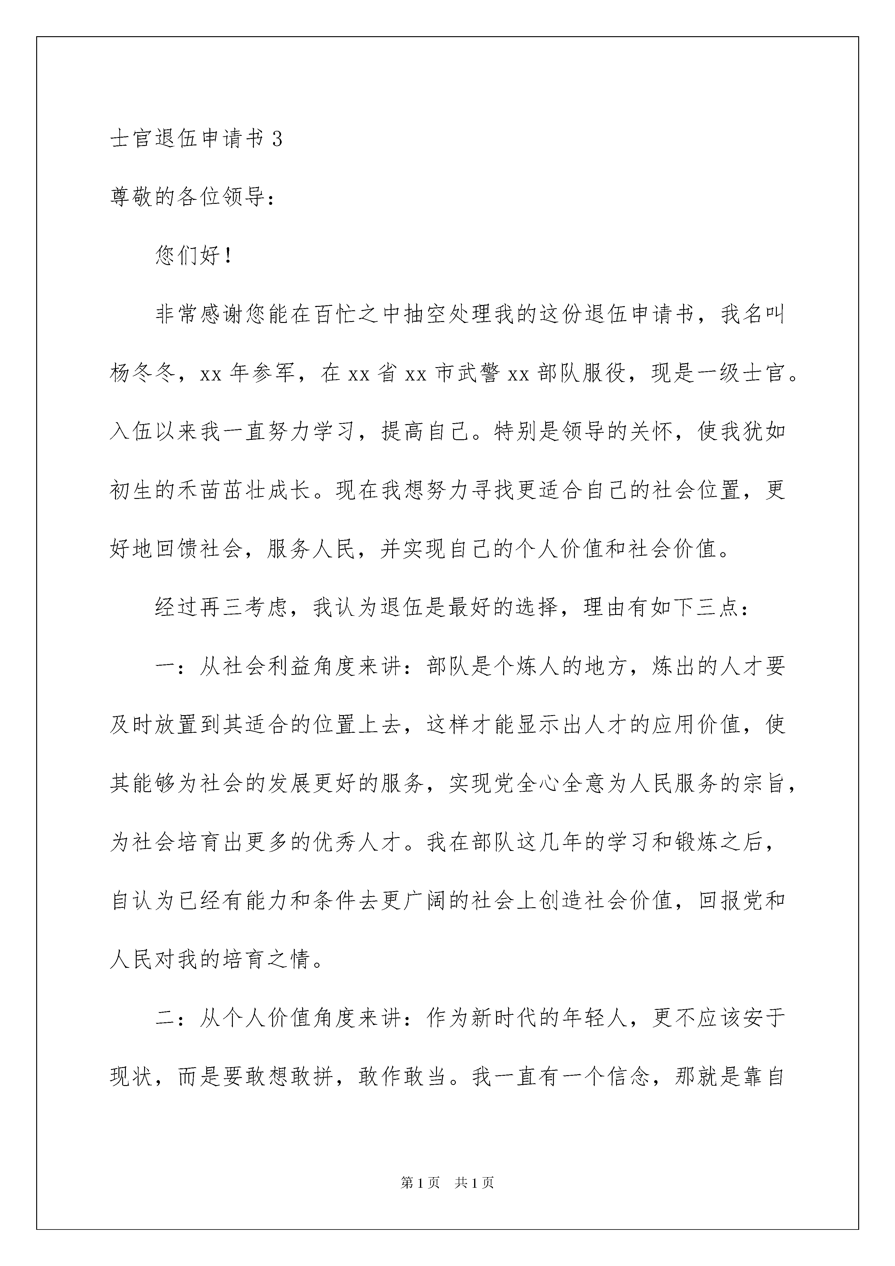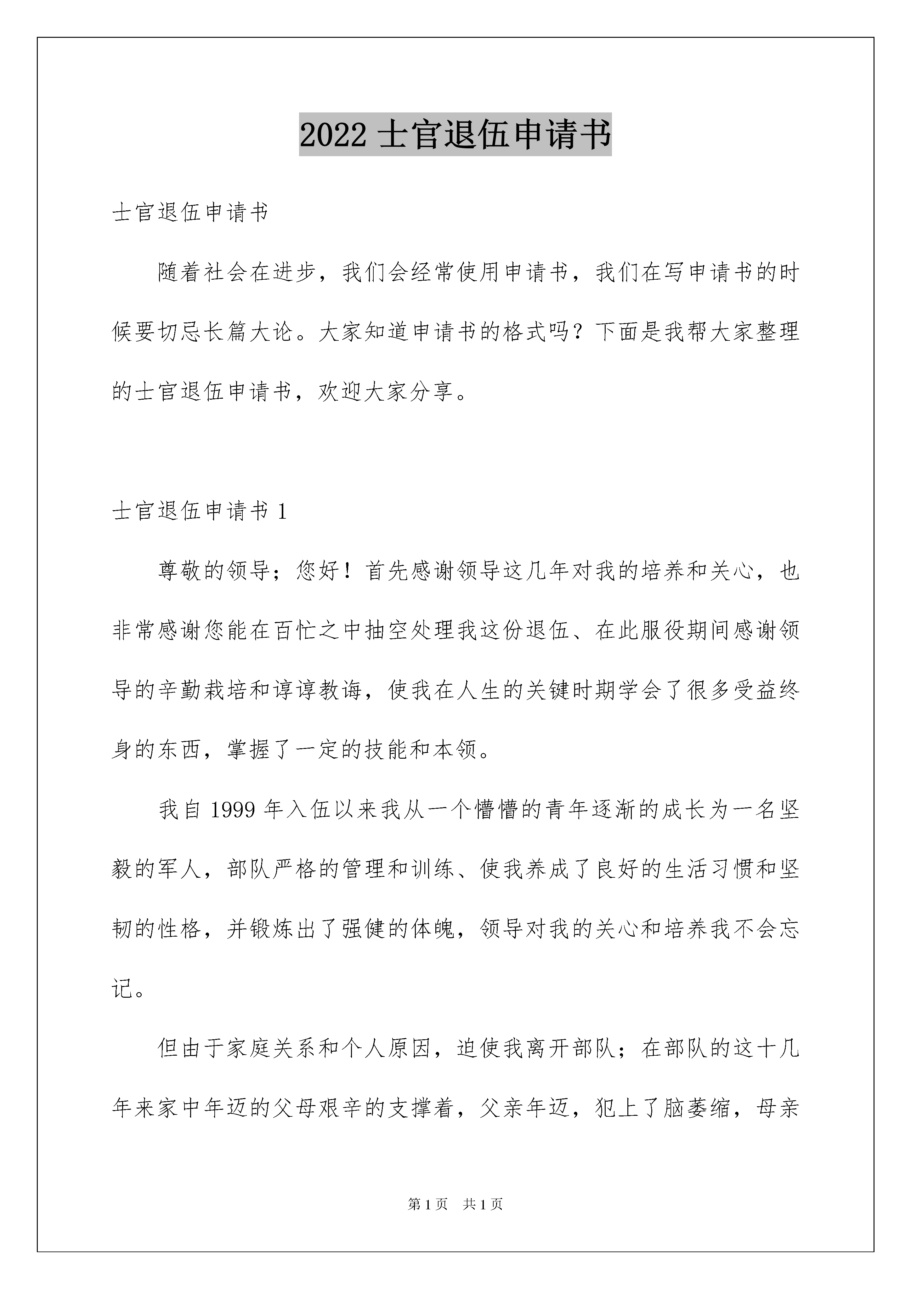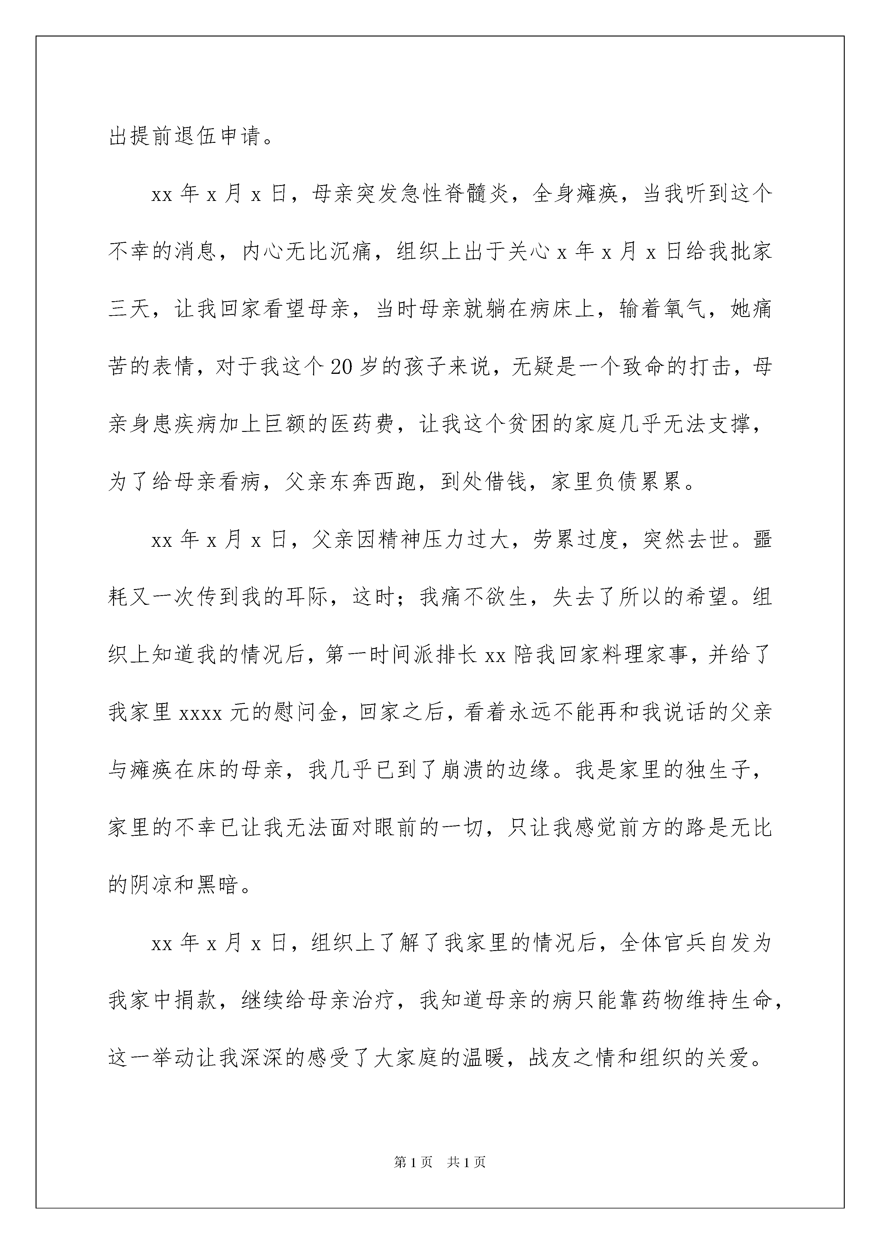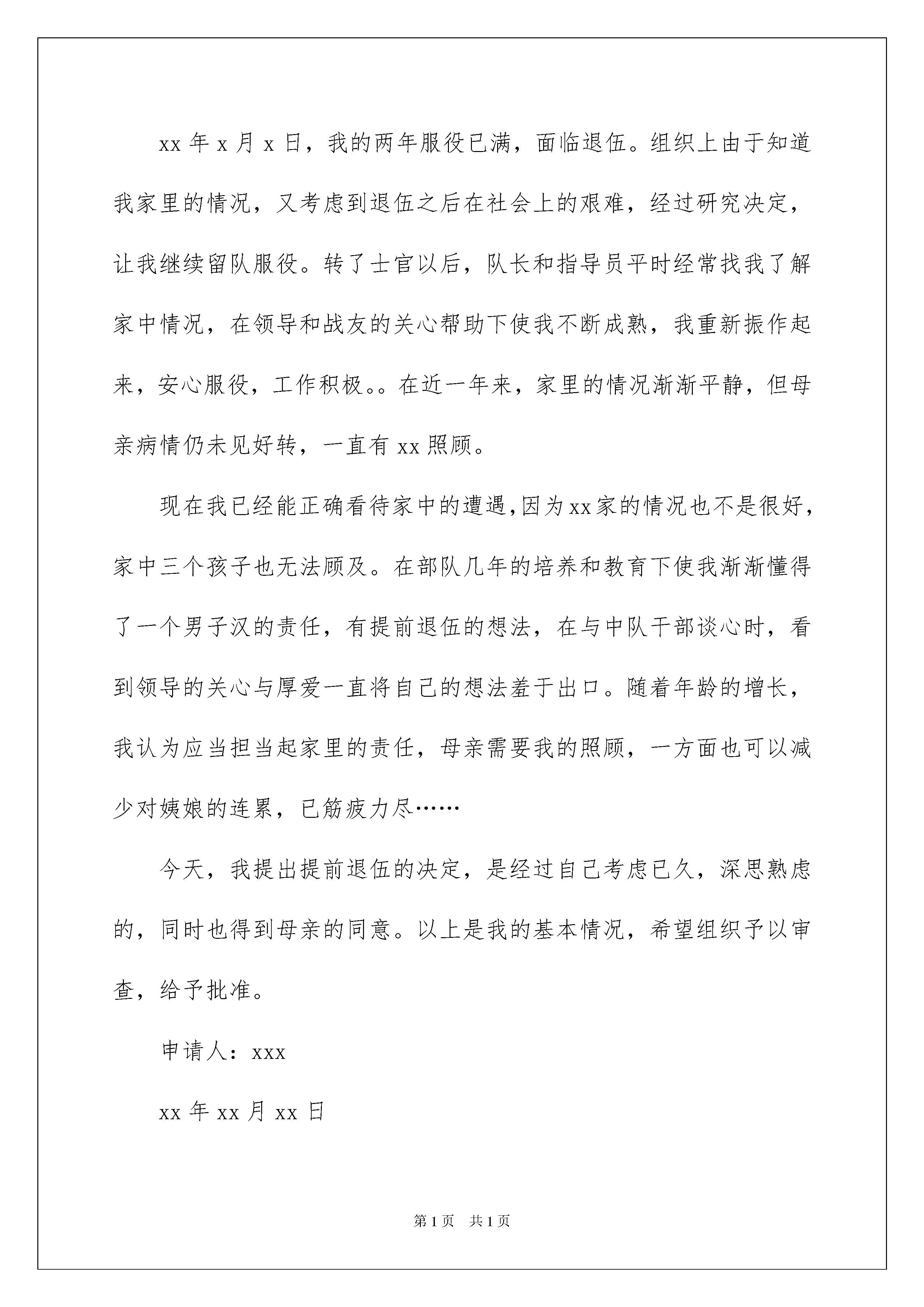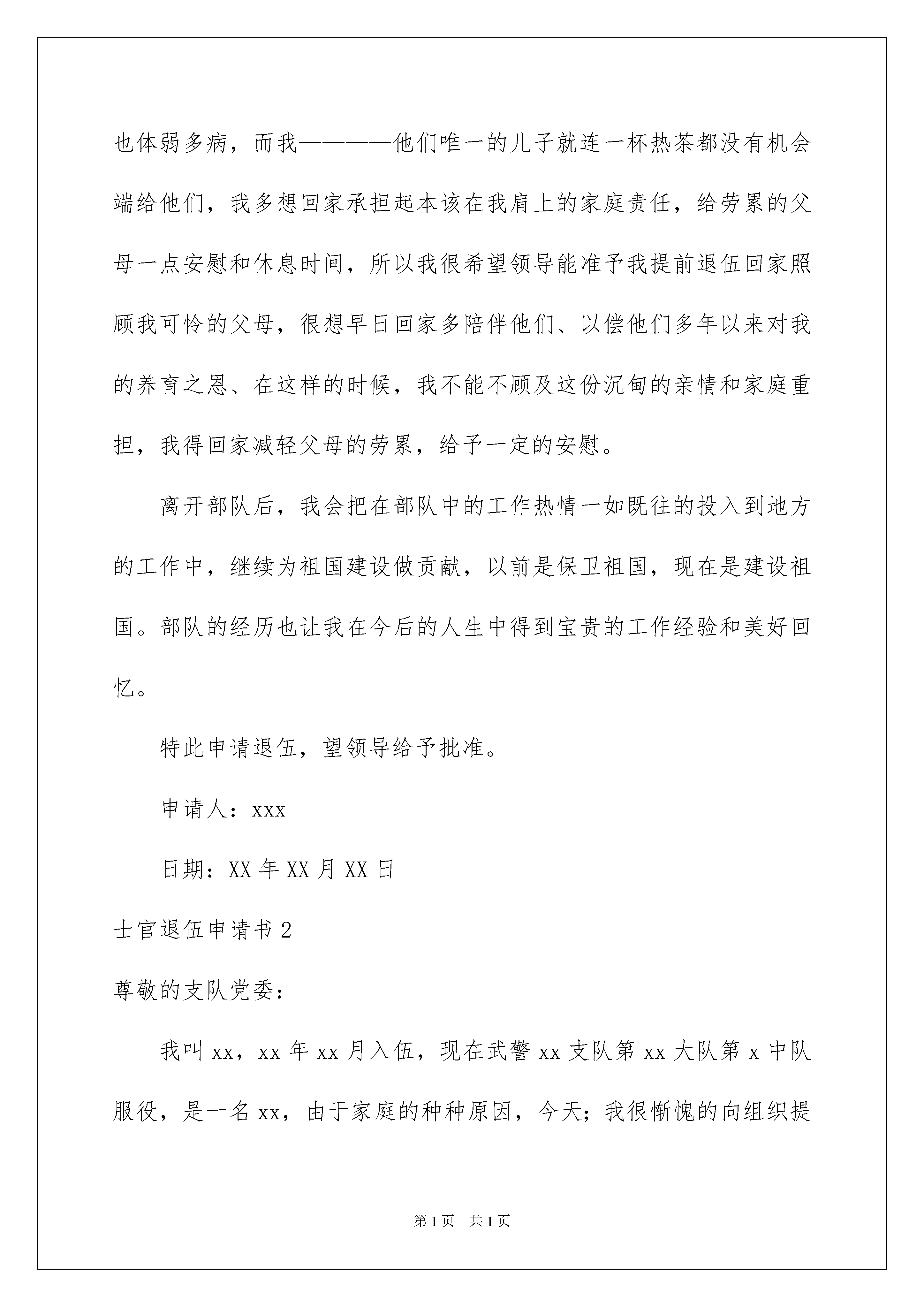 2022士官退伍申请书士官退伍申请书随着社会在进步,我们会经常使用申请书,我们在写申请书的时候要切忌长篇大论。大家知道申请书的格式吗?下面是我帮大家整理的士官退伍申请书,欢迎大家分享。士官退伍申请书1尊敬的领导;您好!首先感谢领导这几年对我的培养和关心,也非常感谢您能在百忙之中抽空处理我这份退伍、在此服役期间感谢领导的辛勤栽培和谆谆教诲,使我在人生的关键时期学会了很多受益终身的东西,掌握了一定的技能和本领。我自1999年入伍以来我从一个懵懵的青年逐渐的成长为一名坚毅的军人,部队严格的管理和训练、使我养成了良好的生活习惯和坚韧的性格,并锻炼出了强健的体魄,领导对我的关心和培养我不会忘记。但由于家庭关系和个人原因,迫使我离开部队;在部队的这十几年来家中年迈的父母艰辛的支撑着,父亲年迈,犯上了脑萎缩,母亲也体弱多病,而我————他们唯一的儿子就连一杯热茶都没有机会端给他们,我多想回家承担起本该在我肩上的家庭责任,给劳累的父母一点安慰和休息时间,所以我很希望领导能准予我提前退伍回家照顾我可怜的父母,很想早日回家多陪伴他们、以偿他们多年以来对我的养育之恩、在这样的时候,我不能不顾及这份沉甸的亲情和家庭重担,我得回家减轻父母的劳累,给予一定的安慰。离开部队后,我会把在部队中的工作热情一如既往的投入到地方的工作中,继续为祖国建设做贡献,以前是保卫祖国,现在是建设祖国。部队的经历也让我在今后的人生中得到宝贵的工作经验和美好回忆。特此申请退伍,望领导给予批准。申请人:xxx日期:XX年XX月XX日士官退伍申请书2尊敬的支队党委:我叫xx,xx年xx月入伍,现在武警xx支队第xx大队第x中队服役,是一名xx,由于家庭的种种原因,今天;我很惭愧的向组织提出提前退伍申请。xx年x月x日,母亲突发急性脊髓炎,全身瘫痪,当我听到这个不幸的消息,内心无比沉痛,组织上出于关心x年x月x日给我批家三天,让我回家看望母亲,当时母亲就躺在病床上,输着氧气,她痛苦的表情,对于我这个20岁的孩子来说,无疑是一个致命的打击,母亲身患疾病加上巨额的医药费,让我这个贫困的家庭几乎无法支撑,为了给母亲看病,父亲东奔西跑,到处借钱,家里负债累累。xx年x月x日,父亲因精神压力过大,劳累过度,突然去世。噩耗又一次传到我的耳际,这时;我痛不欲生,失去了所以的希望。组织上知道我的情况后,第一时间派排长xx陪我回家料理家事,并给了我家里xxxx元的慰问金,回家之后,看着永远不能再和我说话的父亲与瘫痪在床的母亲,我几乎已到了崩溃的边缘。我是家里的独生子,家里的不幸已让我无法面对眼前的一切,只让我感觉前方的路是无比的阴凉和黑暗。xx年x月x日,组织上了解了我家里的情况后,全体官兵自发为我家中捐款,继续给母亲治疗,我知道母亲的病只能靠药物维持生命,这一举动让我深深的感受了大家庭的温暖,战友之情和组织的关爱。xx年x月x日,我的两年服役已满,面临退伍。组织上由于知道我家里的情况,又考虑到退伍之后在社会上的艰难,经过研究决定,让我继续留队服役。转了士官以后,队长和指导员平时经常找我了解家中情况,在领导和战友的关心帮助下使我不断成熟,我重新振作起来,安心服役,工作积极。。在近一年来,家里的情况渐渐平静,但母亲病情仍未见好转,一直有xx照顾。现在我已经能正确看待家中的遭遇,因为xx家的情况也不是很好,家中三个孩子也无法顾及。在部队几年的培养和教育下使我渐渐懂得了一个男子汉的责任,有提前退伍的想法,在与中队干部谈心时,看到领导的关心与厚爱一直将自己的想法羞于出口。随着年龄的增长,我认为应当担当起家里的责任,母亲需要我的照顾,一方面也可以减少对姨娘的连累,已筋疲力尽……今天,我提出提前退伍的决定,是经过自己考虑已久,深思熟虑的,同时也得到母亲的同意。以上是我的基本情况,希望组织予以审查,给予批准。申请人:xxxxx年xx月xx日士官退伍申请书3尊敬的各位领导:您们好!非常感谢您能在百忙之中抽空处理我的这份退伍申请书,我名叫杨冬冬,xx年参军,在xx省xx市武警xx部队服役,现是一级士官。入伍以来我一直努力学习,提高自己。特别是领导的关怀,使我犹如初生的禾苗茁壮成长。现在我想努力寻找更适合自己的社会位置,更好地回馈社会,服务人民,并实现自己的个人价值和社会价值。经过再三考虑,我认为退伍是最好的选择,理由有如下三点:一:从社会利益角度来讲:部队是个炼人的地方,炼出的人才要及时放置到其适合的位置上去,这样才能显示出人才的应用价值,使其能够为社会的发展更好的服务,实现党全心全意为人民服务的宗旨,为社会培育出更多的优秀人才。我在部队这几年的学习和锻炼之后,自