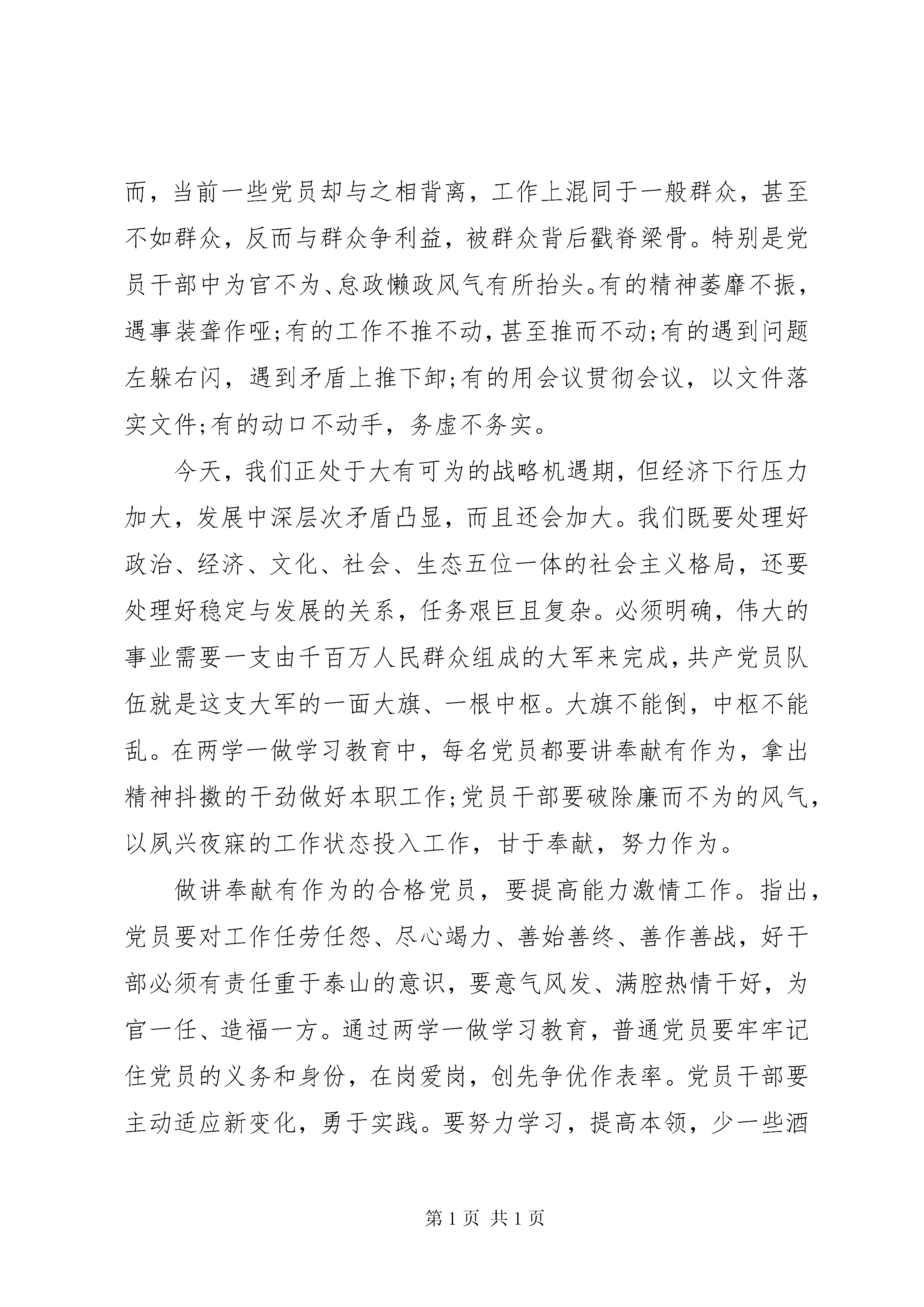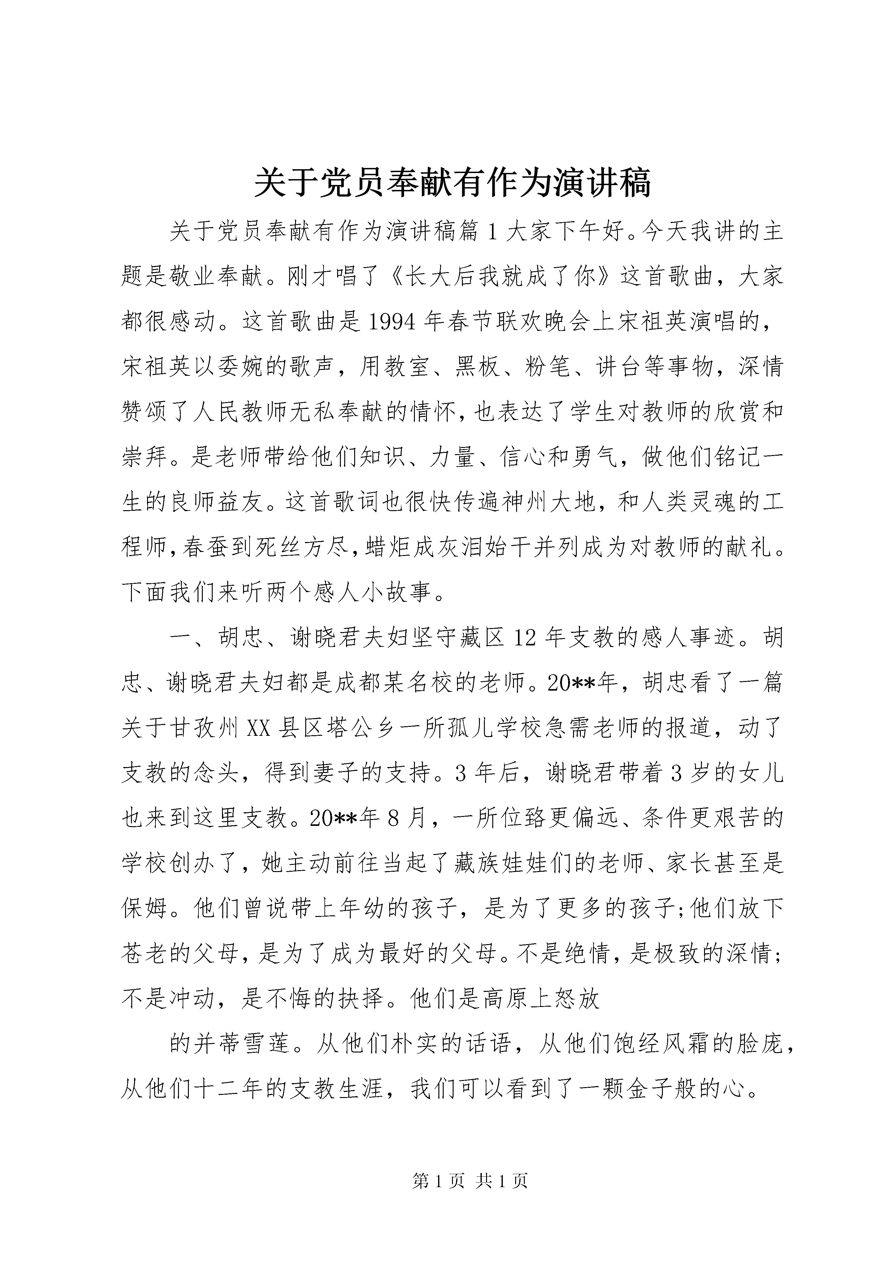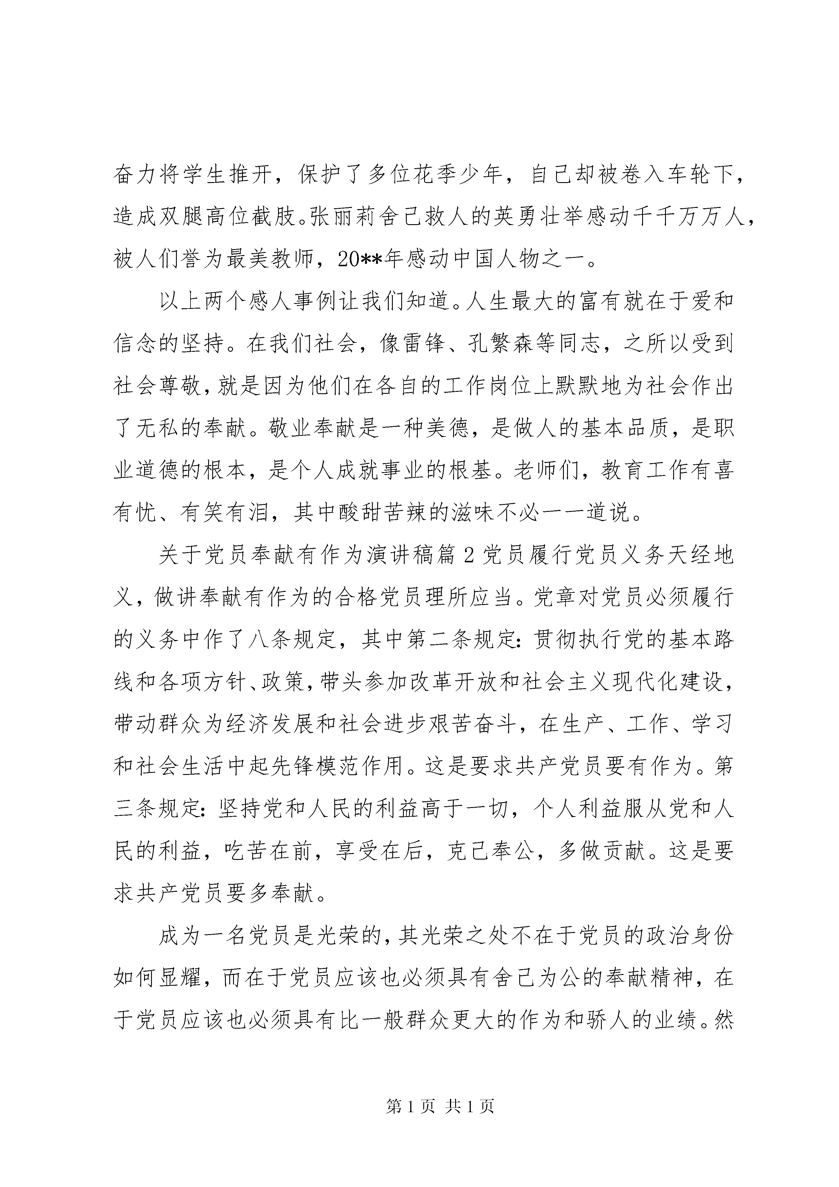 关于党员奉献有作为演讲稿关于党员奉献有作为演讲稿篇1大家下午好。今天我讲的主题是敬业奉献。刚才唱了《长大后我就成了你》这首歌曲,大家都很感动。这首歌曲是1994年春节联欢晚会上宋祖英演唱的,宋祖英以委婉的歌声,用教室、黑板、粉笔、讲台等事物,深情赞颂了人民教师无私奉献的情怀,也表达了学生对教师的欣赏和崇拜。是老师带给他们知识、力量、信心和勇气,做他们铭记一生的良师益友。这首歌词也很快传遍神州大地,和人类灵魂的工程师,春蚕到死丝方尽,蜡炬成灰泪始干并列成为对教师的献礼。下面我们来听两个感人小故事。一、胡忠、谢晓君夫妇坚守藏区12年支教的感人事迹。胡忠、谢晓君夫妇都是成都某名校的老师。20**年,胡忠看了一篇关于甘孜州XX县区塔公乡一所孤儿学校急需老师的报道,动了支教的念头,得到妻子的支持。3年后,谢晓君带着3岁的女儿也来到这里支教。20**年8月,一所位臵更偏远、条件更艰苦的学校创办了,她主动前往当起了藏族娃娃们的老师、家长甚至是保姆。他们曾说带上年幼的孩子,是为了更多的孩子;他们放下苍老的父母,是为了成为最好的父母。不是绝情,是极致的深情;不是冲动,是不悔的抉择。他们是高原上怒放的并蒂雪莲。从他们朴实的话语,从他们饱经风霜的脸庞,从他们十二年的支教生涯,我们可以看到了一颗金子般的心。二、张丽莉最美教师感人事迹,张丽莉女,汉族,1984年1月生,中共党员,XX省佳木斯市第十九中学语文教师。张丽莉出生在一个普通家庭,从小受父母的熏陶,养成了正直、坚韧、善良、乐观的良好品格。在家里,丈夫眼里,她是一个好妻子,温柔贤惠,持家有道。在双方父母眼里,她是一个好女儿、好儿媳,知书达理,懂事尽孝。在学校,作为80后的教师新秀,她在短短几年间,各种赛课、教学比赛都名列前茅,所带的班级名次评比遥遥领先。老师们下课了,时常能接到张丽莉递到手中的一杯热水。20**年5月8日,放学时分,张丽莉在路旁疏导学生。正当一群学生走出校门准备过马路时,一辆客车突然失控,撞向学生。千钧一发之际,张丽莉勇扑向前,将车前的学生用力推到一边,自己却被撞倒,车轮从她的大腿辗压过去。被轧伤后她有时清醒有时昏迷,在送往医院的途中,还对大家说:要先救学生。昏迷多天后,她醒来后第一句话是:那几个孩子没事吧。经过抢救,虽然脱离生命危险,但她的双腿没有保住,被迫高位截肢。她的亲人和医护人员都不敢想象她知道真相后会是怎样,但她很快接受事实,安慰父亲说:我很幸运,如果车轮从头上碾过,你们就看不到我了。我救了学生,也保住了命,今后一定会幸福的。在一辆失控客车冲向学生的生死攸关时刻,张丽莉挺身而出,奋力将学生推开,保护了多位花季少年,自己却被卷入车轮下,造成双腿高位截肢。张丽莉舍己救人的英勇壮举感动千千万万人,被人们誉为最美教师,20**年感动中国人物之一。以上两个感人事例让我们知道。人生最大的富有就在于爱和信念的坚持。在我们社会,像雷锋、孔繁森等同志,之所以受到社会尊敬,就是因为他们在各自的工作岗位上默默地为社会作出了无私的奉献。敬业奉献是一种美德,是做人的基本品质,是职业道德的根本,是个人成就事业的根基。老师们,教育工作有喜有忧、有笑有泪,其中酸甜苦辣的滋味不必一一道说。关于党员奉献有作为演讲稿篇2党员履行党员义务天经地义,做讲奉献有作为的合格党员理所应当。党章对党员必须履行的义务中作了八条规定,其中第二条规定:贯彻执行党的基本路线和各项方针、政策,带头参加改革开放和社会主义现代化建设,带动群众为经济发展和社会进步艰苦奋斗,在生产、工作、学习和社会生活中起先锋模范作用。这是要求共产党员要有作为。第三条规定:坚持党和人民的利益高于一切,个人利益服从党和人民的利益,吃苦在前,享受在后,克己奉公,多做贡献。这是要求共产党员要多奉献。成为一名党员是光荣的,其光荣之处不在于党员的政治身份如何显耀,而在于党员应该也必须具有舍己为公的奉献精神,在于党员应该也必须具有比一般群众更大的作为和骄人的业绩。然而,当前一些党员却与之相背离,工作上混同于一般群众,甚至不如群众,反而与群众争利益,被群众背后戳脊梁骨。特别是党员干部中为官不为、怠政懒政风气有所抬头。有的精神萎靡不振,遇事装聋作哑;有的工作不推不动,甚至推而不动;有的遇到问题左躲右闪,遇到矛盾上推下卸;有的用会议贯彻会议,以文件落实文件;有的动口不动手,务虚不务实。今天,我们正处于大有可为的战略机遇期,但经济下行压力加大,发展中深层次矛盾凸显,而且还会加大。我们既要处理好政治、经济、文化、社会、生态五位一体的社会主义格局,还要处理好稳定与发展的关系,任务艰巨且复杂。必须明确,伟大的事业需要一支由千百万人民群众组成的大军来完成,共产党员队伍就是这支大军的一面大旗、一根中枢。大旗不能倒,中枢不能乱。在两学一做学习教育中,每名党员都