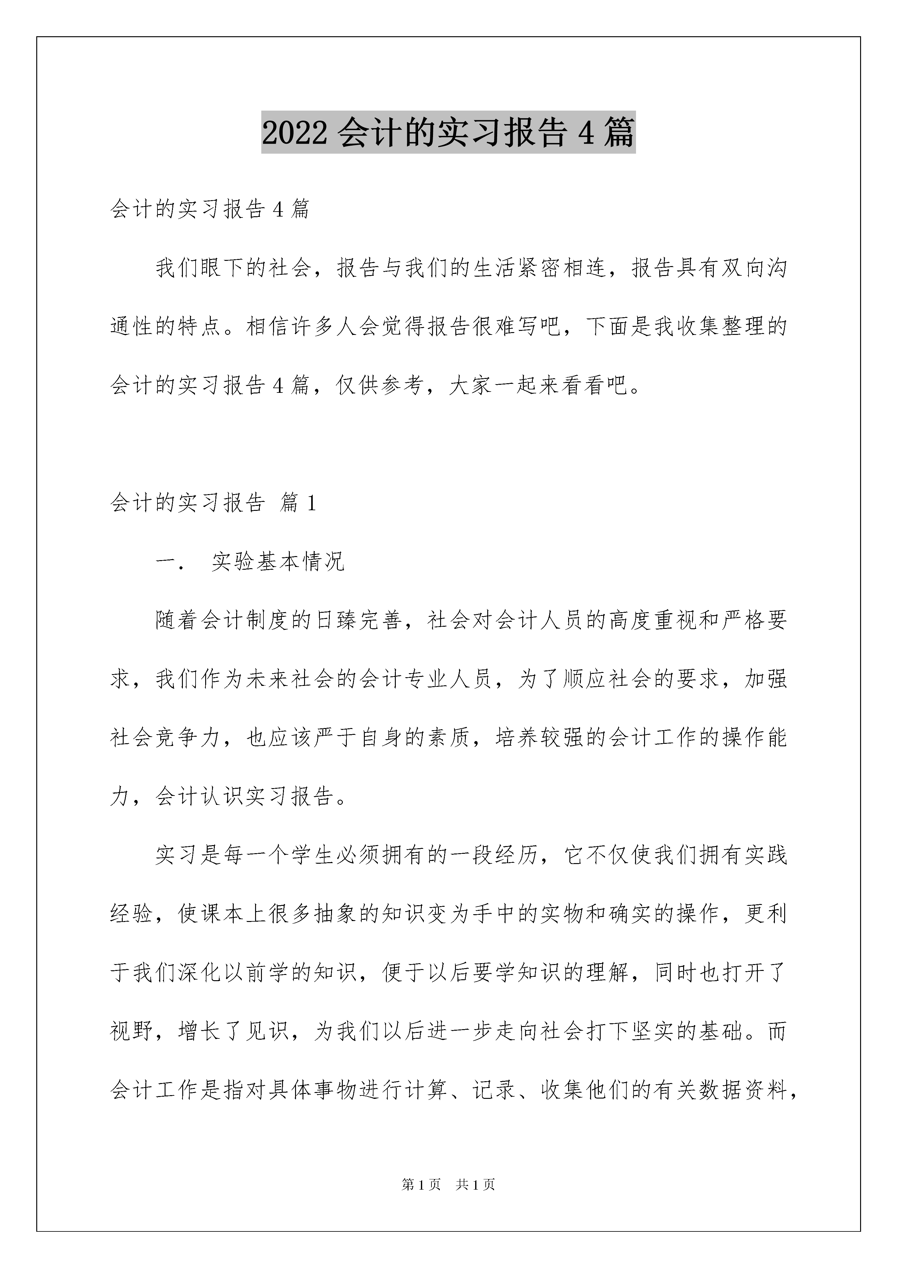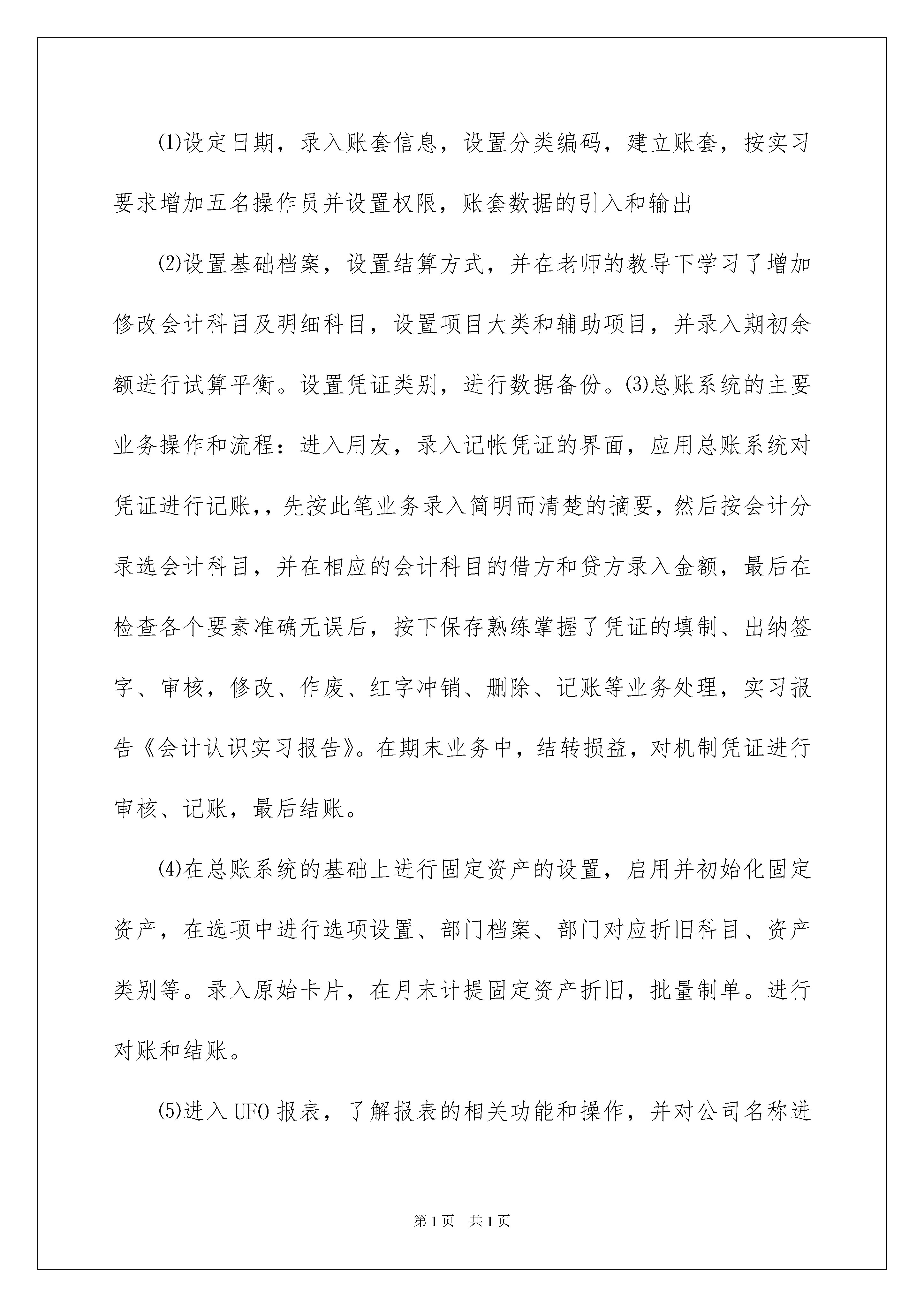 2022会计的实习报告4篇会计的实习报告4篇我们眼下的社会,报告与我们的生活紧密相连,报告具有双向沟通性的特点。相信许多人会觉得报告很难写吧,下面是我收集整理的会计的实习报告4篇,仅供参考,大家一起来看看吧。会计的实习报告篇1一.实验基本情况随着会计制度的日臻完善,社会对会计人员的高度重视和严格要求,我们作为未来社会的会计专业人员,为了顺应社会的要求,加强社会竞争力,也应该严于自身的素质,培养较强的会计工作的操作能力,会计认识实习报告。实习是每一个学生必须拥有的一段经历,它不仅使我们拥有实践经验,使课本上很多抽象的知识变为手中的实物和确实的操作,更利于我们深化以前学的知识,便于以后要学知识的理解,同时也打开了视野,增长了见识,为我们以后进一步走向社会打下坚实的基础。而会计工作是指对具体事物进行计算、记录、收集他们的有关数据资料,通过加工处理转换为用户决策有用的财务信息。学习好会计工作不仅要学好书本里的各种会计知识,而且也要认真积极的参与各种会计实习的机会,让理论和实践有机务实的结合在一起,只有这样才能成为一名高质量的会计专业人才。为此,根据学校的学习计划安排,在大三年级开学初期,到学校模拟实验室和机房进行了为期俩个星期的会计认识实习。打珠算,点钞,做手工帐,操作软件做电子帐,从生疏到熟练,这特殊的俩周时间在忙碌中匆匆过去了,留给我的都是丰富的经验和深深的体会。二.实习过程及内容1.珠算先了解了珠算的历史,认识了珠算的基本结构,后来,分几天时间,分别学习了珠算的加减乘除算法,辅助大量的练习和老师的经验介绍,终于能够基本熟练准确的运用珠算。2.点钞学习了点钞时的姿势,步骤,基本手法及要求,着重学习了手持式单指单张点钞法。最后学习了纸钞的捆绑方法。3.手工帐⑴学习了会计的书写方法,要求,并进行了大量练习。⑵学习了支票,材料入库单,进账单,发票,产成品入库单,出库单等原始凭证的填制和审核。⑶根据了老师的指导,建立了明细账和总账,初步了解了各个会计科目的填制方法,并结转了上年余额。⑷认识了收款,付款,转账凭证的结构和填写方法,并对书中1日至15日的经济业务进行填制凭证,审核,登明细账,结出余额,汇总后登总分类账,并根据凭证、明细账进行账证核对,账账核对。⑸依据汇1业务完成的步骤,完成了16日至30日的业务汇总。⑹根据书中31日每次的业务,填制凭证,并填完一次凭证记一次明细账,结出余额,再进行下一笔业务的凭证填制,直至所有业务都填完明细账,结出余额后,账证核对无误后,汇总填制总分类账。⑺对总账和明细账进行本月结余,并进行试算平衡。⑻根据总账,明细账和凭证,填制利润表和资产负债表。⑼最后进行了凭证的订本。4.初级会计电算技能⑴设定日期,录入账套信息,设置分类编码,建立账套,按实习要求增加五名操作员并设置权限,账套数据的引入和输出⑵设置基础档案,设置结算方式,并在老师的教导下学习了增加修改会计科目及明细科目,设置项目大类和辅助项目,并录入期初余额进行试算平衡。设置凭证类别,进行数据备份。⑶总账系统的主要业务操作和流程:进入用友,录入记帐凭证的界面,应用总账系统对凭证进行记账,,先按此笔业务录入简明而清楚的摘要,然后按会计分录选会计科目,并在相应的会计科目的借方和贷方录入金额,最后在检查各个要素准确无误后,按下保存熟练掌握了凭证的填制、出纳签字、审核,修改、作废、红字冲销、删除、记账等业务处理,实习报告《会计认识实习报告》。在期末业务中,结转损益,对机制凭证进行审核、记账,最后结账。⑷在总账系统的基础上进行固定资产的设置,启用并初始化固定资产,在选项中进行选项设置、部门档案、部门对应折旧科目、资产类别等。录入原始卡片,在月末计提固定资产折旧,批量制单。进行对账和结账。⑸进入UFO报表,了解报表的相关功能和操作,并对公司名称进行设改定,自动生成模板。⑹最后将帐套输出后,保存,与资产负债表一同上交给老师。三.收获经过这些天的实习,使我对会计工作有了进一步的认识,熟悉会计工作的流程,不仅培养了我的实际动手能力,增加了实际的操作经验,缩短了抽象的课本知识与实际工作的距离,对实际的财务工作的有了一个新的开始;同时也让我认识到了传统手工会计和会计电算化的有共同之处和不同之处,集于一点,就是由于电算化会计数据处理方式的改变,引起了传统手工会计各个方面的变化,这一变化将使得系统功能更为加强,系统结构更为合理,系统管理更为完善。在取得实效的同时,我也在实习过程中发现了自身的一些不足。总结了以下几点:专业方面,首先,作为一个会计人员应该具备扎实的专业知识和良好的专业思维能力,这是会计工作岗位对会计人员最基本的