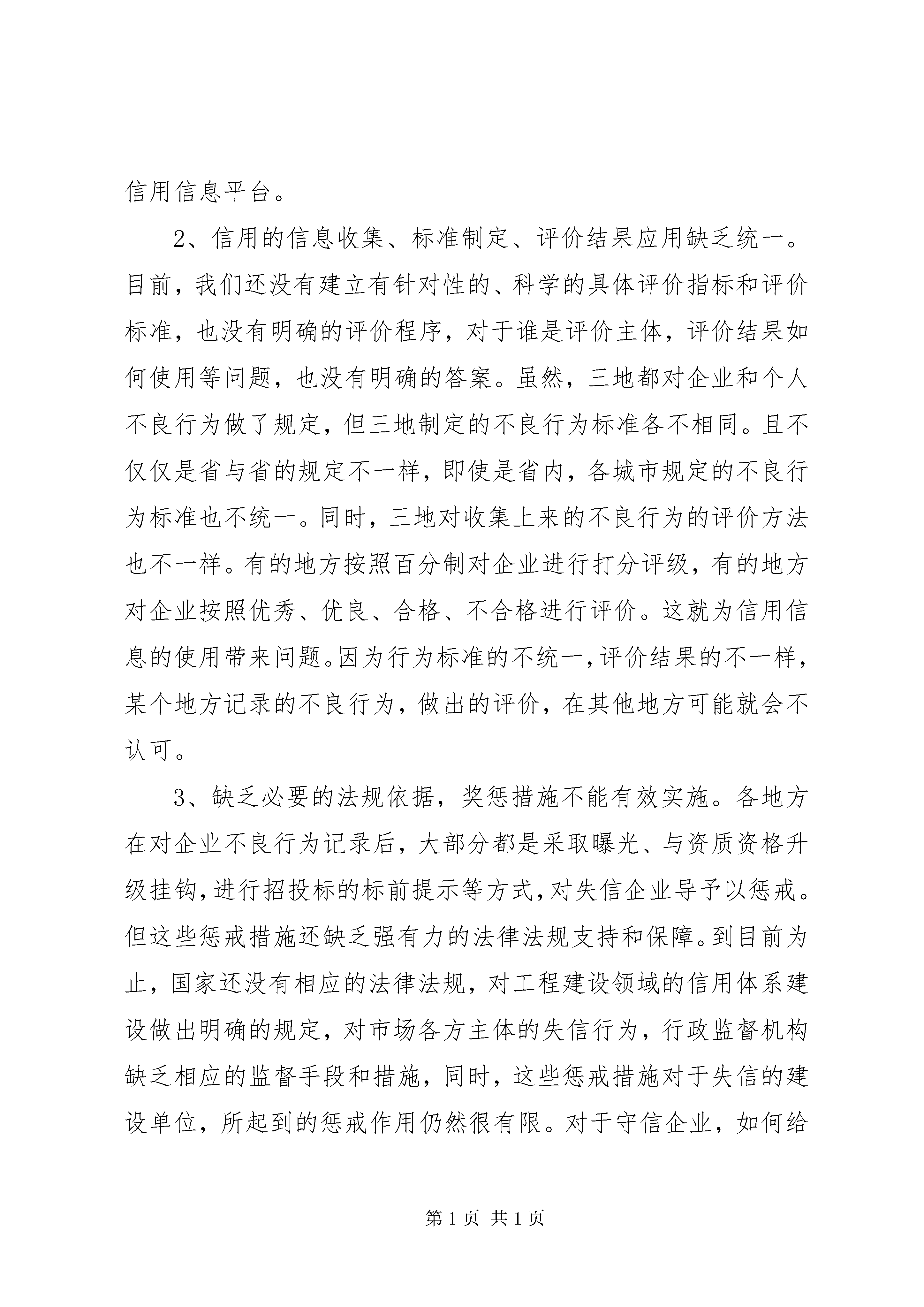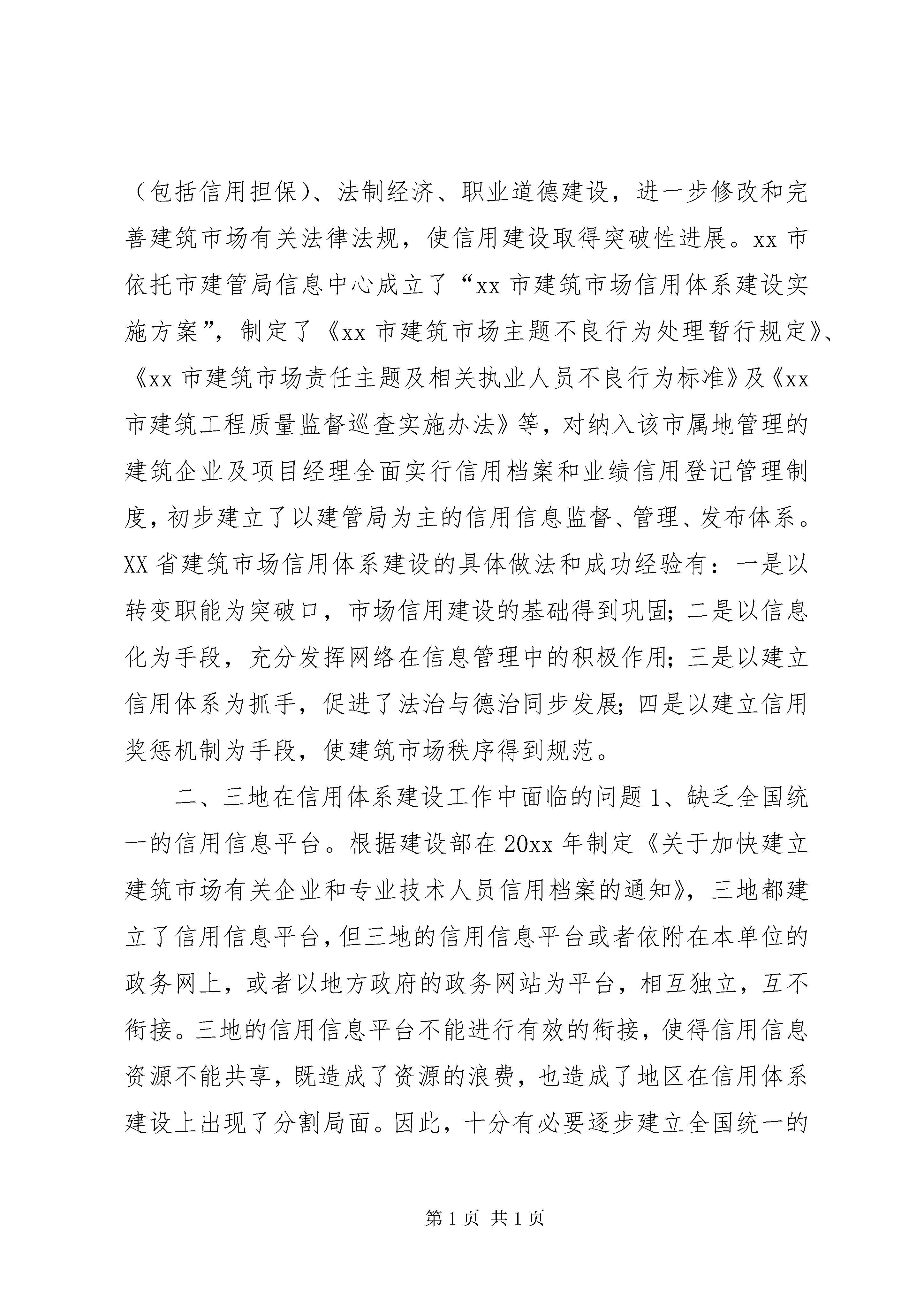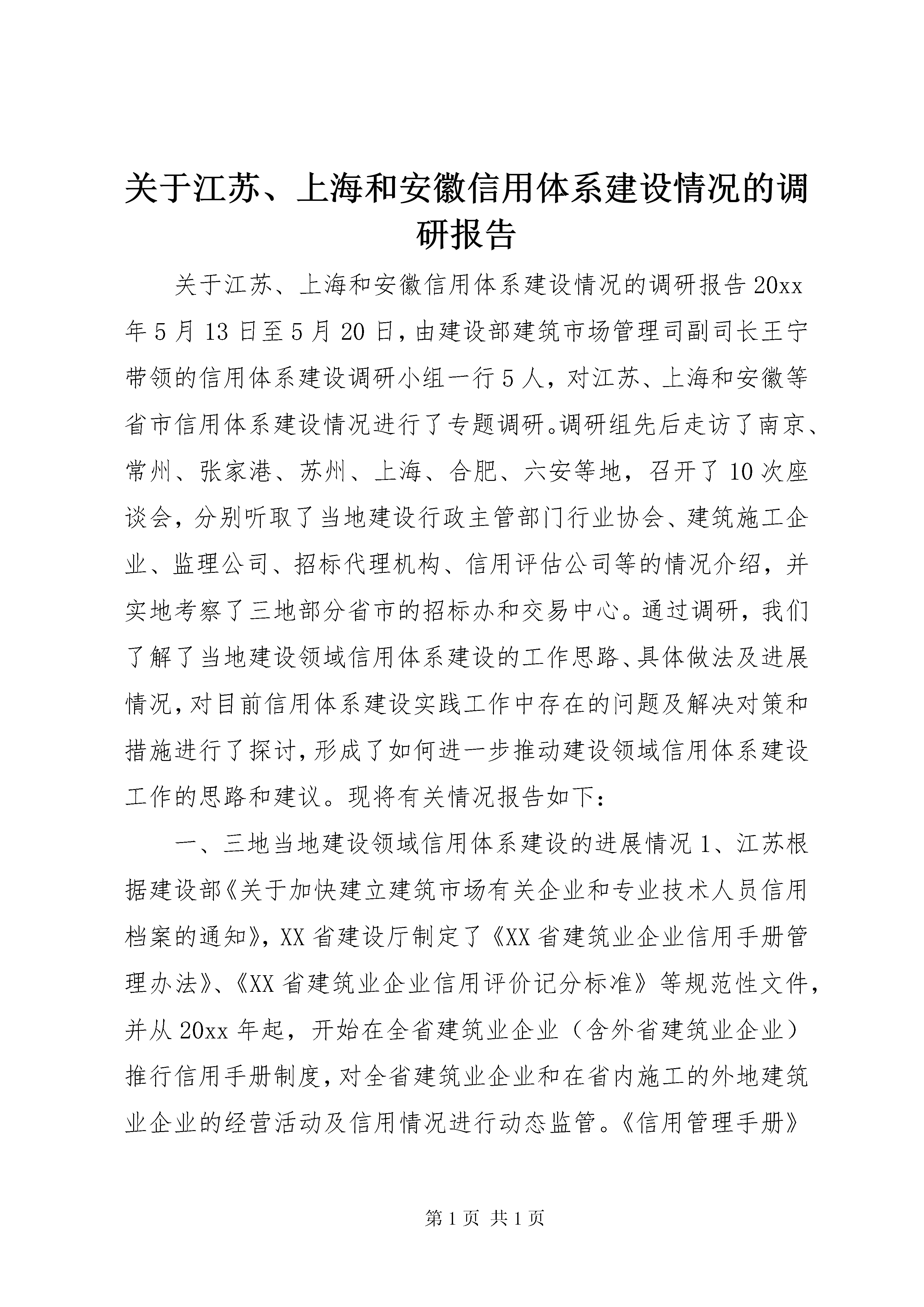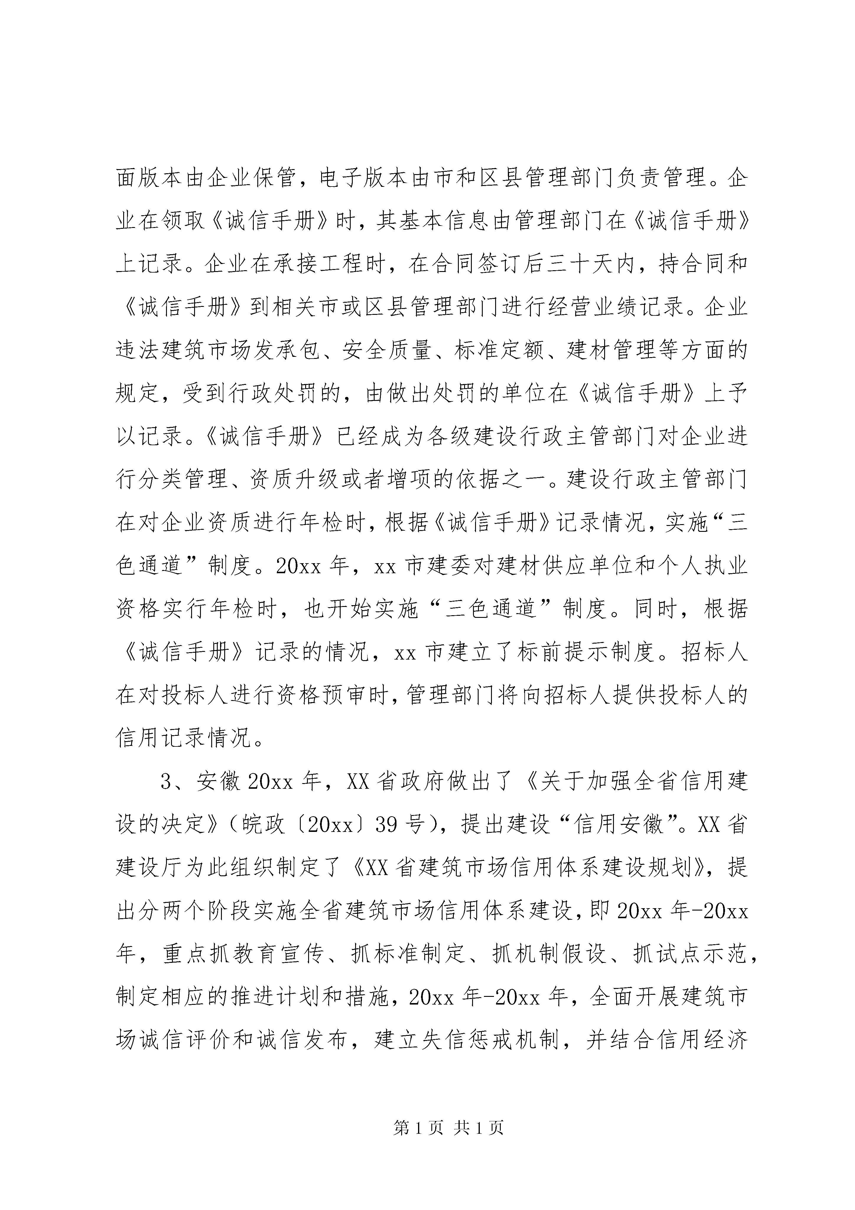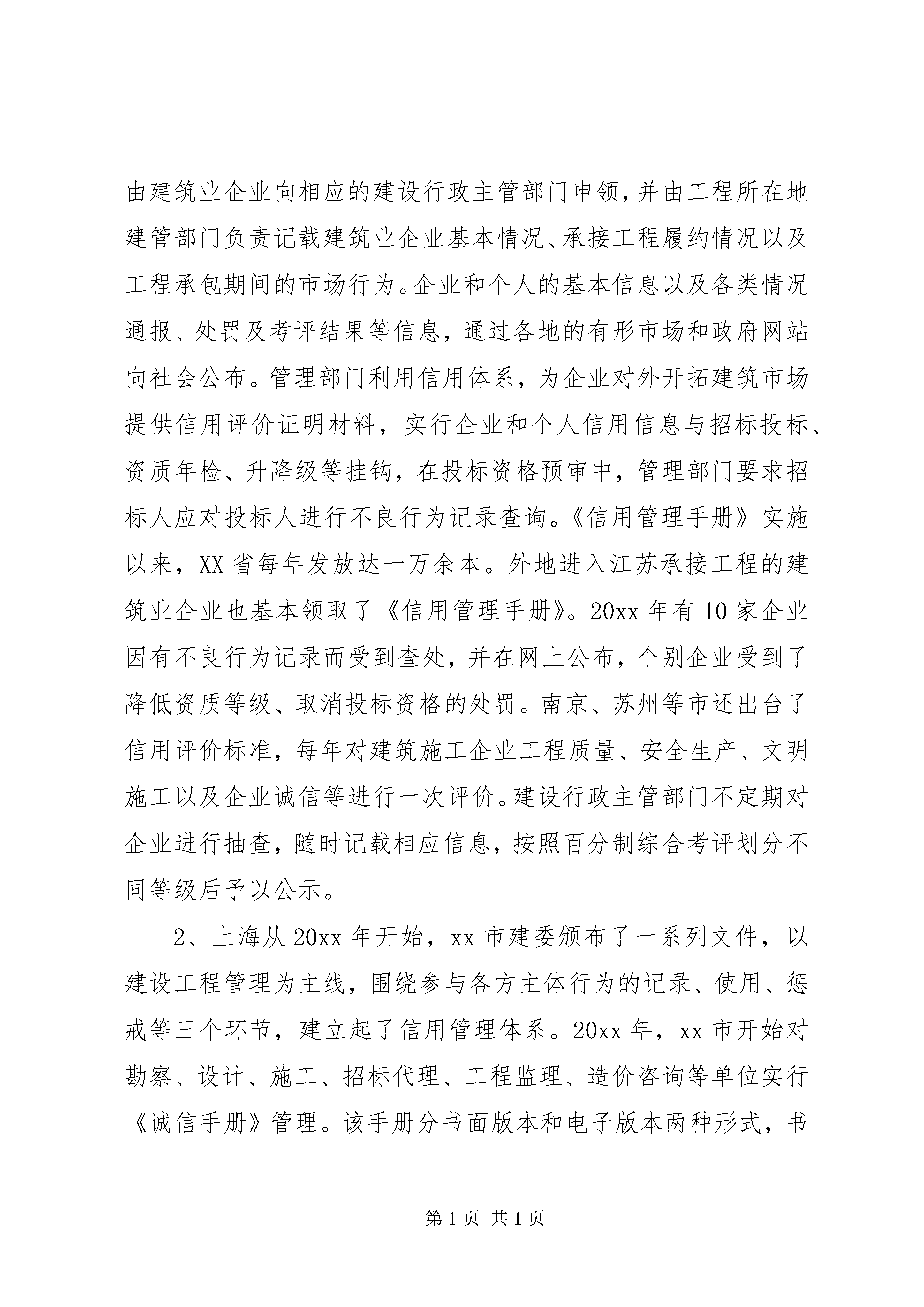 关于江苏、上海和安徽信用体系建设情况的调研报告关于江苏、上海和安徽信用体系建设情况的调研报告20xx年5月13日至5月20日,由建设部建筑市场管理司副司长王宁带领的信用体系建设调研小组一行5人,对江苏、上海和安徽等省市信用体系建设情况进行了专题调研。调研组先后走访了南京、常州、张家港、苏州、上海、合肥、六安等地,召开了10次座谈会,分别听取了当地建设行政主管部门行业协会、建筑施工企业、监理公司、招标代理机构、信用评估公司等的情况介绍,并实地考察了三地部分省市的招标办和交易中心。通过调研,我们了解了当地建设领域信用体系建设的工作思路、具体做法及进展情况,对目前信用体系建设实践工作中存在的问题及解决对策和措施进行了探讨,形成了如何进一步推动建设领域信用体系建设工作的思路和建议。现将有关情况报告如下:一、三地当地建设领域信用体系建设的进展情况1、江苏根据建设部《关于加快建立建筑市场有关企业和专业技术人员信用档案的通知》,XX省建设厅制定了《XX省建筑业企业信用手册管理办法》、《XX省建筑业企业信用评价记分标准》等规范性文件,并从20xx年起,开始在全省建筑业企业(含外省建筑业企业)推行信用手册制度,对全省建筑业企业和在省内施工的外地建筑业企业的经营活动及信用情况进行动态监管。《信用管理手册》由建筑业企业向相应的建设行政主管部门申领,并由工程所在地建管部门负责记载建筑业企业基本情况、承接工程履约情况以及工程承包期间的市场行为。企业和个人的基本信息以及各类情况通报、处罚及考评结果等信息,通过各地的有形市场和政府网站向社会公布。管理部门利用信用体系,为企业对外开拓建筑市场提供信用评价证明材料,实行企业和个人信用信息与招标投标、资质年检、升降级等挂钩,在投标资格预审中,管理部门要求招标人应对投标人进行不良行为记录查询。《信用管理手册》实施以来,XX省每年发放达一万余本。外地进入江苏承接工程的建筑业企业也基本领取了《信用管理手册》。20xx年有10家企业因有不良行为记录而受到查处,并在网上公布,个别企业受到了降低资质等级、取消投标资格的处罚。南京、苏州等市还出台了信用评价标准,每年对建筑施工企业工程质量、安全生产、文明施工以及企业诚信等进行一次评价。建设行政主管部门不定期对企业进行抽查,随时记载相应信息,按照百分制综合考评划分不同等级后予以公示。2、上海从20xx年开始,xx市建委颁布了一系列文件,以建设工程管理为主线,围绕参与各方主体行为的记录、使用、惩戒等三个环节,建立起了信用管理体系。20xx年,xx市开始对勘察、设计、施工、招标代理、工程监理、造价咨询等单位实行《诚信手册》管理。该手册分书面版本和电子版本两种形式,书面版本由企业保管,电子版本由市和区县管理部门负责管理。企业在领取《诚信手册》时,其基本信息由管理部门在《诚信手册》上记录。企业在承接工程时,在合同签订后三十天内,持合同和《诚信手册》到相关市或区县管理部门进行经营业绩记录。企业违法建筑市场发承包、安全质量、标准定额、建材管理等方面的规定,受到行政处罚的,由做出处罚的单位在《诚信手册》上予以记录。《诚信手册》已经成为各级建设行政主管部门对企业进行分类管理、资质升级或者增项的依据之一。建设行政主管部门在对企业资质进行年检时,根据《诚信手册》记录情况,实施“三色通道”制度。20xx年,xx市建委对建材供应单位和个人执业资格实行年检时,也开始实施“三色通道”制度。同时,根据《诚信手册》记录的情况,xx市建立了标前提示制度。招标人在对投标人进行资格预审时,管理部门将向招标人提供投标人的信用记录情况。3、安徽20xx年,XX省政府做出了《关于加强全省信用建设的决定》(皖政〔20xx〕39号),提出建设“信用安徽”。XX省建设厅为此组织制定了《XX省建筑市场信用体系建设规划》,提出分两个阶段实施全省建筑市场信用体系建设,即20xx年-20xx年,重点抓教育宣传、抓标准制定、抓机制假设、抓试点示范,制定相应的推进计划和措施,20xx年-20xx年,全面开展建筑市场诚信评价和诚信发布,建立失信惩戒机制,并结合信用经济(包括信用担保)、法制经济、职业道德建设,进一步修改和完善建筑市场有关法律法规,使信用建设取得突破性进展。xx市依托市建管局信息中心成立了“xx市建筑市场信用体系建设实施方案”,制定了《xx市建筑市场主题不良行为处理暂行规定》、《xx市建筑市场责任主题及相关执业人员不良行为标准》及《xx市建筑工程质量监督巡查实施办法》等,对纳入该市属地管理的建筑企业及项目经理全面实行信用档案和业绩信用登记管理制度,初步建立了以建管局为主的信用信息监督、管理、发布体系。XX省建筑市场信用体系建设的具体做法和成功经验有:一是以转变职能为突破口,市场信用建设的基础得到巩固;二