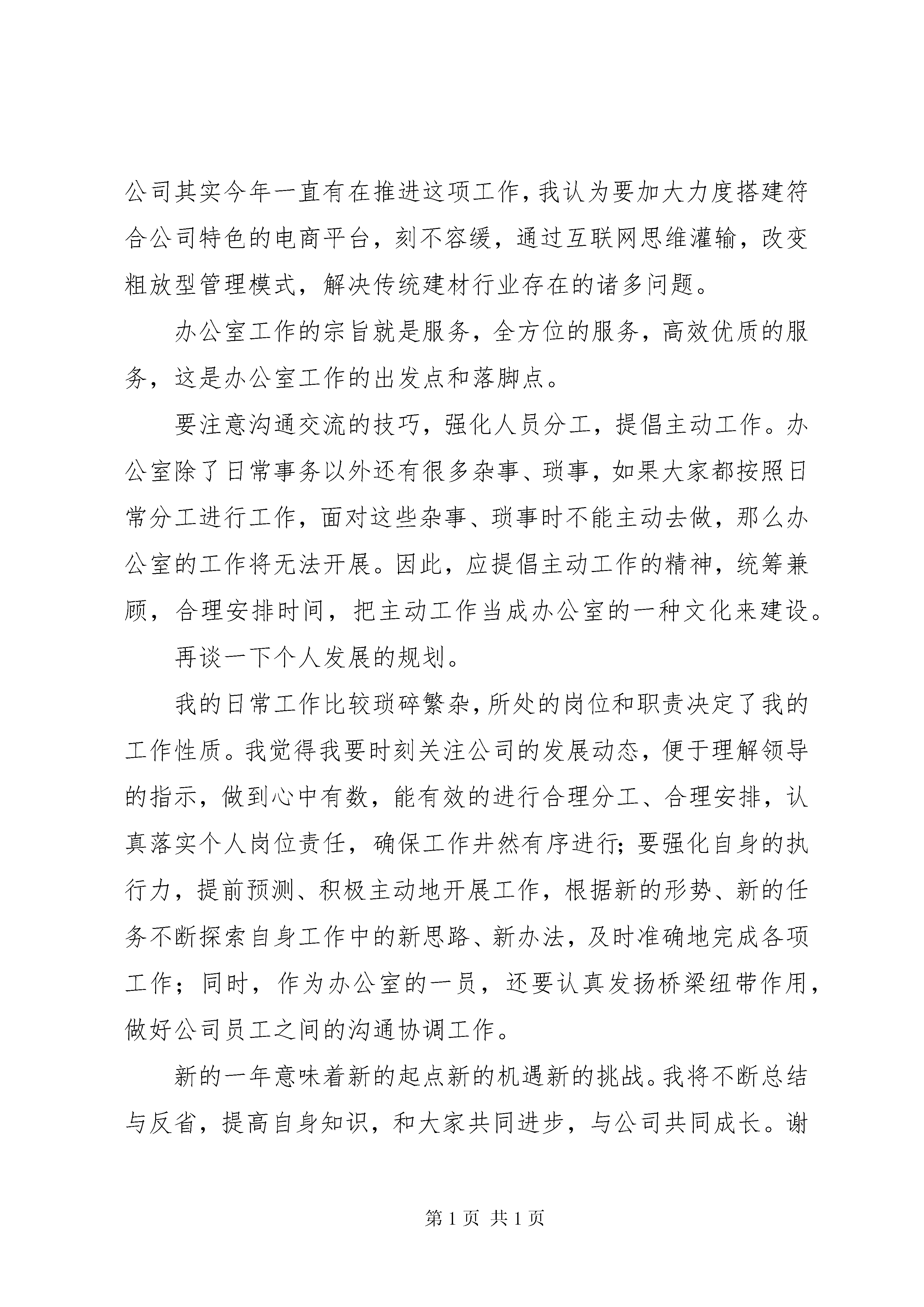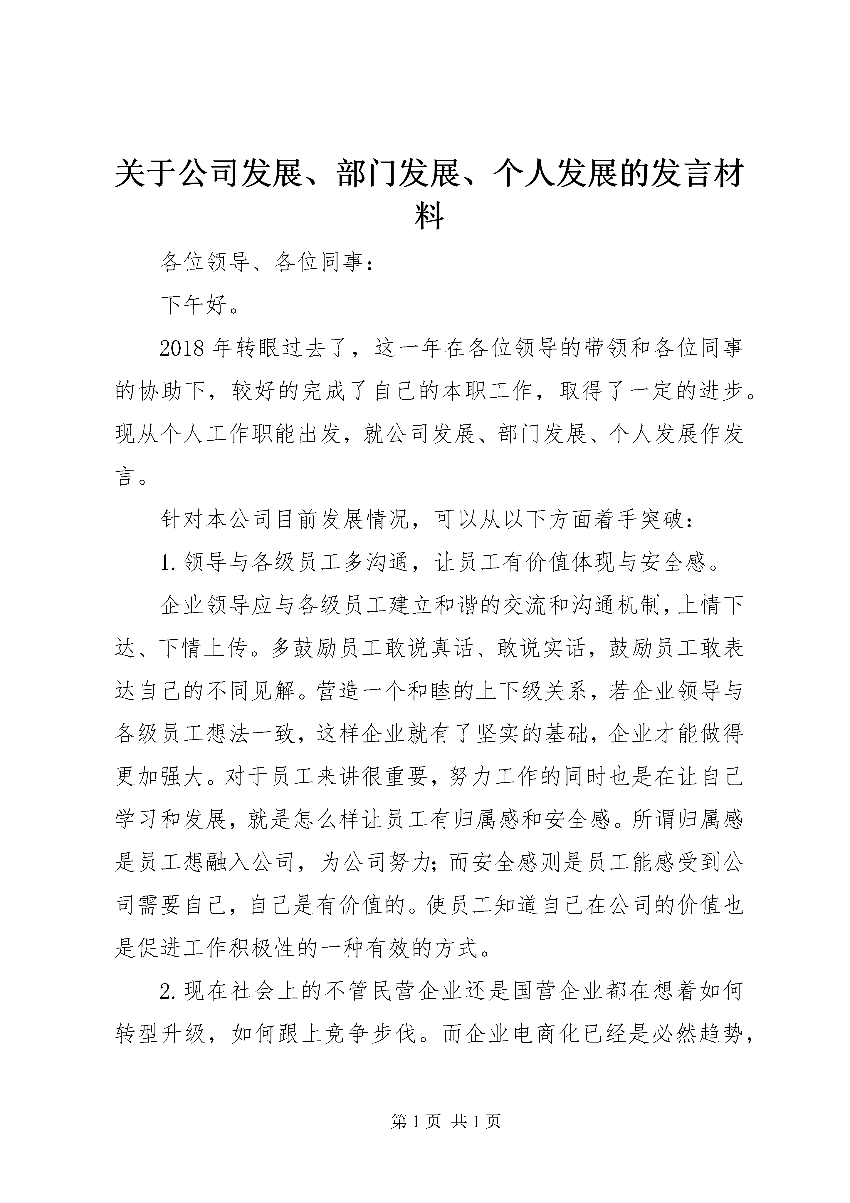关于公司发展、部门发展、个人发展的发言材料各位领导、各位同事:下午好。2018年转眼过去了,这一年在各位领导的带领和各位同事的协助下,较好的完成了自己的本职工作,取得了一定的进步。现从个人工作职能出发,就公司发展、部门发展、个人发展作发言。针对本公司目前发展情况,可以从以下方面着手突破:1.领导与各级员工多沟通,让员工有价值体现与安全感。企业领导应与各级员工建立和谐的交流和沟通机制,上情下达、下情上传。多鼓励员工敢说真话、敢说实话,鼓励员工敢表达自己的不同见解。营造一个和睦的上下级关系,若企业领导与各级员工想法一致,这样企业就有了坚实的基础,企业才能做得更加强大。对于员工来讲很重要,努力工作的同时也是在让自己学习和发展,就是怎么样让员工有归属感和安全感。所谓归属感是员工想融入公司,为公司努力;而安全感则是员工能感受到公司需要自己,自己是有价值的。使员工知道自己在公司的价值也是促进工作积极性的一种有效的方式。2.现在社会上的不管民营企业还是国营企业都在想着如何转型升级,如何跟上竞争步伐。而企业电商化已经是必然趋势,公司其实今年一直有在推进这项工作,我认为要加大力度搭建符合公司特色的电商平台,刻不容缓,通过互联网思维灌输,改变粗放型管理模式,解决传统建材行业存在的诸多问题。办公室工作的宗旨就是服务,全方位的服务,高效优质的服务,这是办公室工作的出发点和落脚点。要注意沟通交流的技巧,强化人员分工,提倡主动工作。办公室除了日常事务以外还有很多杂事、琐事,如果大家都按照日常分工进行工作,面对这些杂事、琐事时不能主动去做,那么办公室的工作将无法开展。因此,应提倡主动工作的精神,统筹兼顾,合理安排时间,把主动工作当成办公室的一种文化来建设。再谈一下个人发展的规划。我的日常工作比较琐碎繁杂,所处的岗位和职责决定了我的工作性质。我觉得我要时刻关注公司的发展动态,便于理解领导的指示,做到心中有数,能有效的进行合理分工、合理安排,认真落实个人岗位责任,确保工作井然有序进行;要强化自身的执行力,提前预测、积极主动地开展工作,根据新的形势、新的任务不断探索自身工作中的新思路、新办法,及时准确地完成各项工作;同时,作为办公室的一员,还要认真发扬桥梁纽带作用,做好公司员工之间的沟通协调工作。新的一年意味着新的起点新的机遇新的挑战。我将不断总结与反省,提高自身知识,和大家共同进步,与公司共同成长。谢谢。