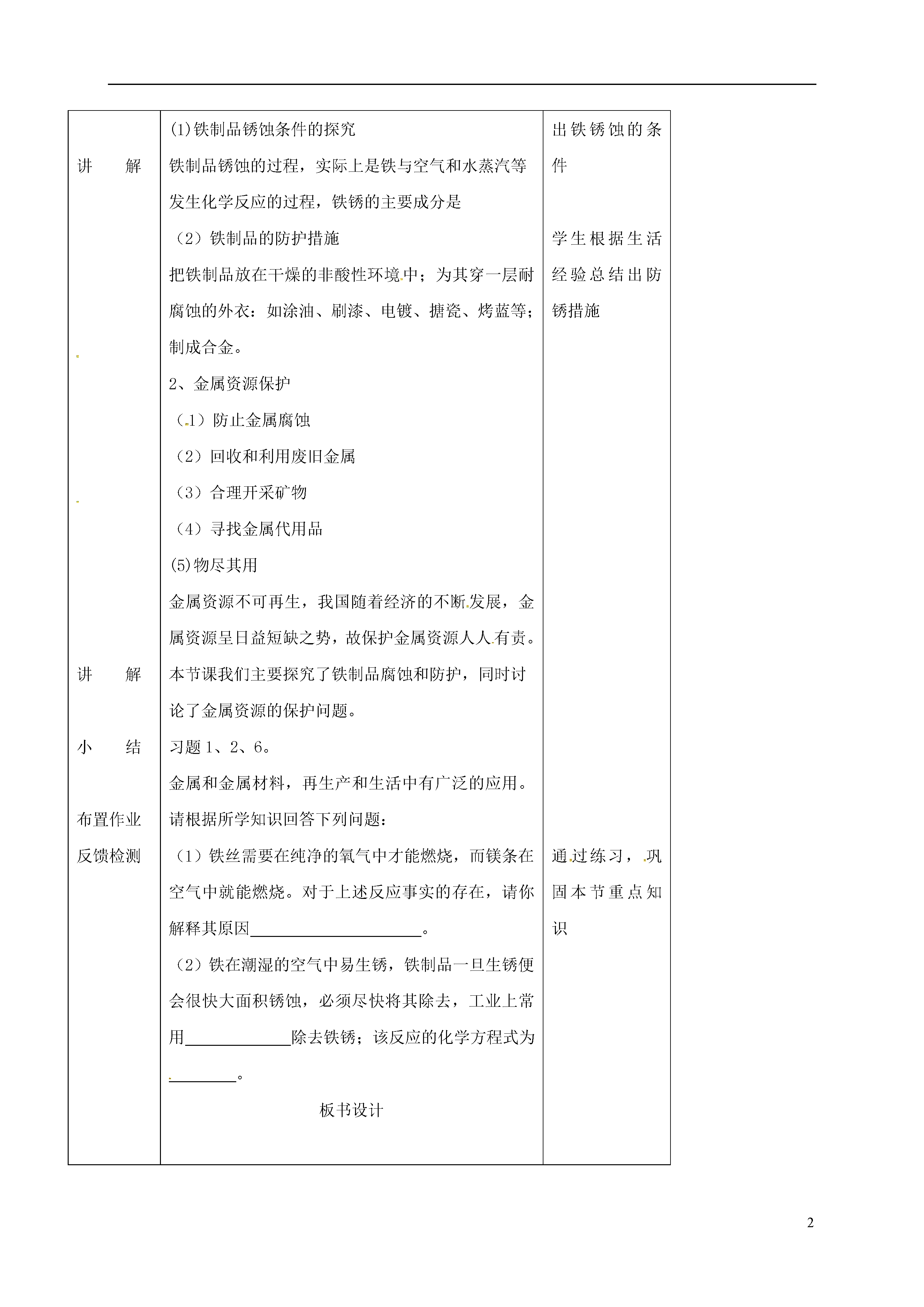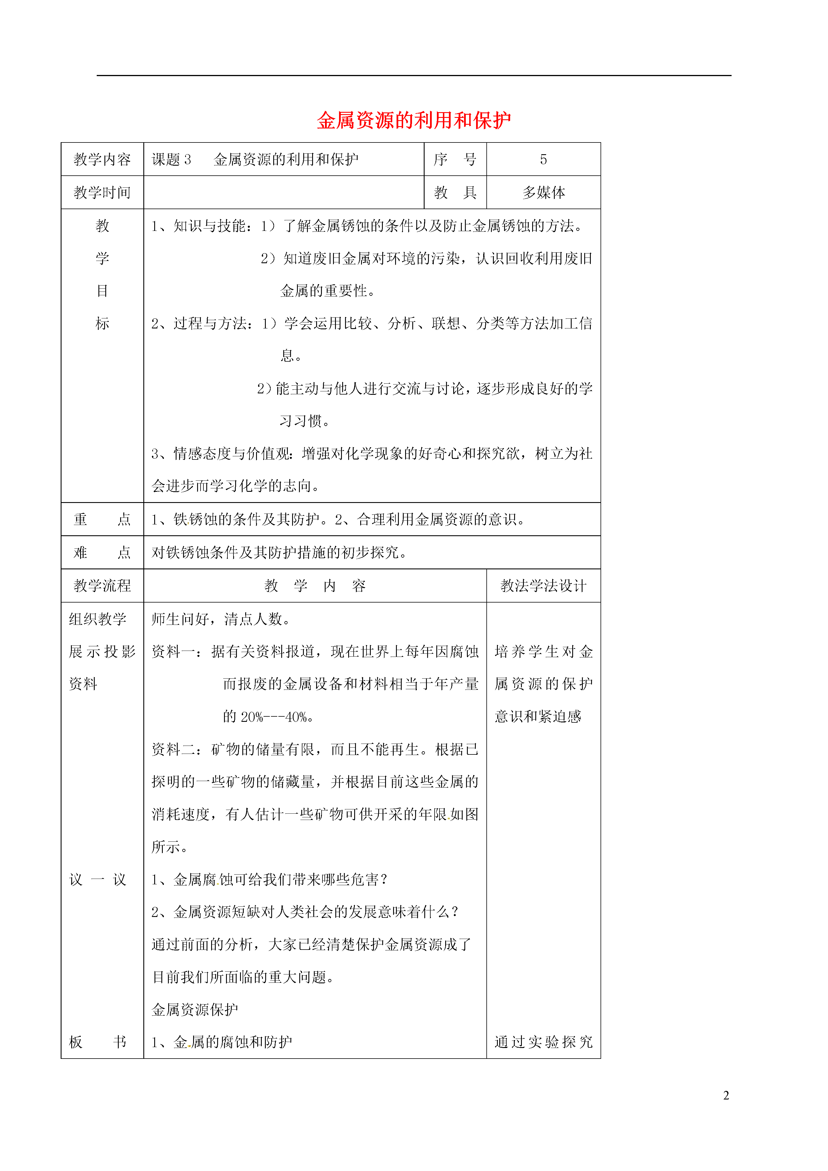 2金属资源的利用和保护教学内容课题3金属资源的利用和保护序号5教学时间教具多媒体教学目标1、知识与技能:1)了解金属锈蚀的条件以及防止金属锈蚀的方法。2)知道废旧金属对环境的污染,认识回收利用废旧金属的重要性。2、过程与方法:1)学会运用比较、分析、联想、分类等方法加工信息。2)能主动与他人进行交流与讨论,逐步形成良好的学习习惯。3、情感态度与价值观:增强对化学现象的好奇心和探究欲,树立为社会进步而学习化学的志向。重点1、铁锈蚀的条件及其防护。2、合理利用金属资源的意识。难点对铁锈蚀条件及其防护措施的初步探究。教学流程教学内容教法学法设计组织教学展示投影资料议一议板书讲解讲解小结布置作业反馈检测师生问好,清点人数。资料一:据有关资料报道,现在世界上每年因腐蚀而报废的金属设备和材料相当于年产量的20%---40%。资料二:矿物的储量有限,而且不能再生。根据已探明的一些矿物的储藏量,并根据目前这些金属的消耗速度,有人估计一些矿物可供开采的年限如图所示。1、金属腐蚀可给我们带来哪些危害?2、金属资源短缺对人类社会的发展意味着什么?通过前面的分析,大家已经清楚保护金属资源成了目前我们所面临的重大问题。金属资源保护1、金属的腐蚀和防护(1)铁制品锈蚀条件的探究铁制品锈蚀的过程,实际上是铁与空气和水蒸汽等发生化学反应的过程,铁锈的主要成分是(2)铁制品的防护措施把铁制品放在干燥的非酸性环境中;为其穿一层耐腐蚀的外衣:如涂油、刷漆、电镀、搪瓷、烤蓝等;制成合金。2、金属资源保护(1)防止金属腐蚀(2)回收和利用废旧金属(3)合理开采矿物(4)寻找金属代用品(5)物尽其用金属资源不可再生,我国随着经济的不断发展,金属资源呈日益短缺之势,故保护金属资源人人有责。本节课我们主要探究了铁制品腐蚀和防护,同时讨论了金属资源的保护问题。习题1、2、6。金属和金属材料,再生产和生活中有广泛的应用。请根据所学知识回答下列问题:(1)铁丝需要在纯净的氧气中才能燃烧,而镁条在空气中就能燃烧。对于上述反应事实的存在,请你解释其原因。(2)铁在潮湿的空气中易生锈,铁制品一旦生锈便会很快大面积锈蚀,必须尽快将其除去,工业上常用除去铁锈;该反应的化学方程式为。板书设计1、金属的腐蚀和防护(1)铁制品锈蚀条件的探究(2)铁制品的防护措施2、金属资源保护培养学生对金属资源的保护意识和紧迫感通过实验探究出铁锈蚀的条件学生根据生活经验总结出防锈措施通过练习,巩固本节重点知识教学反思
