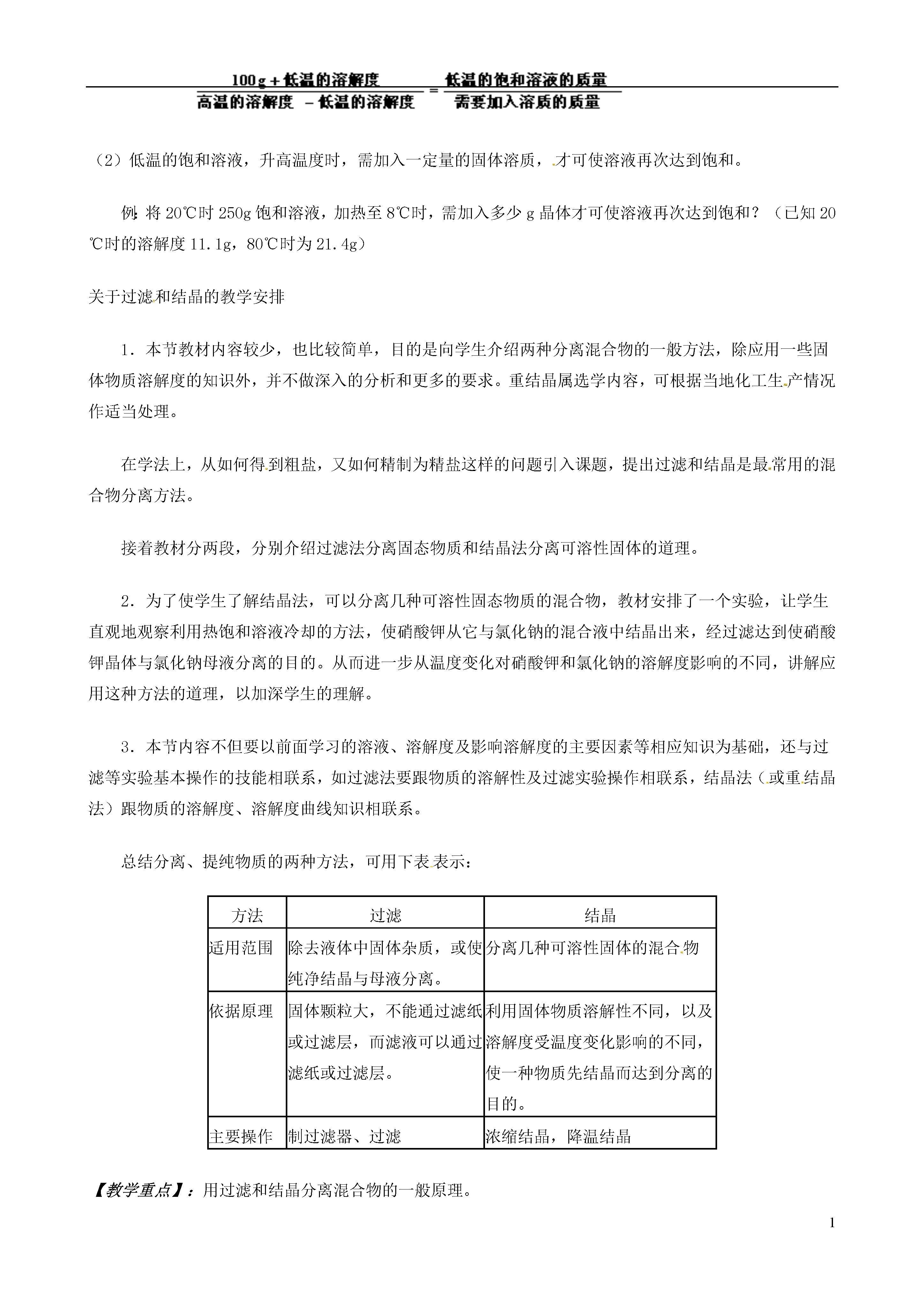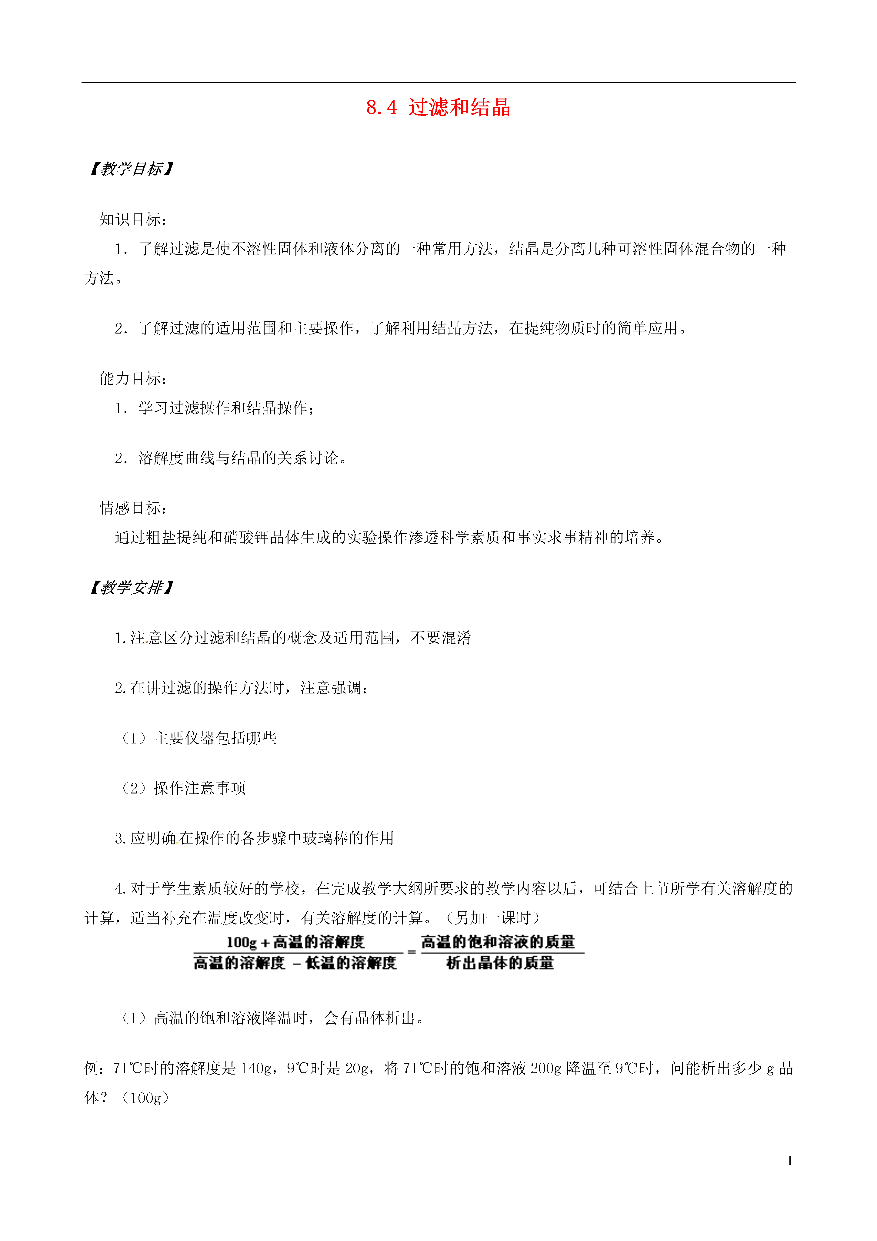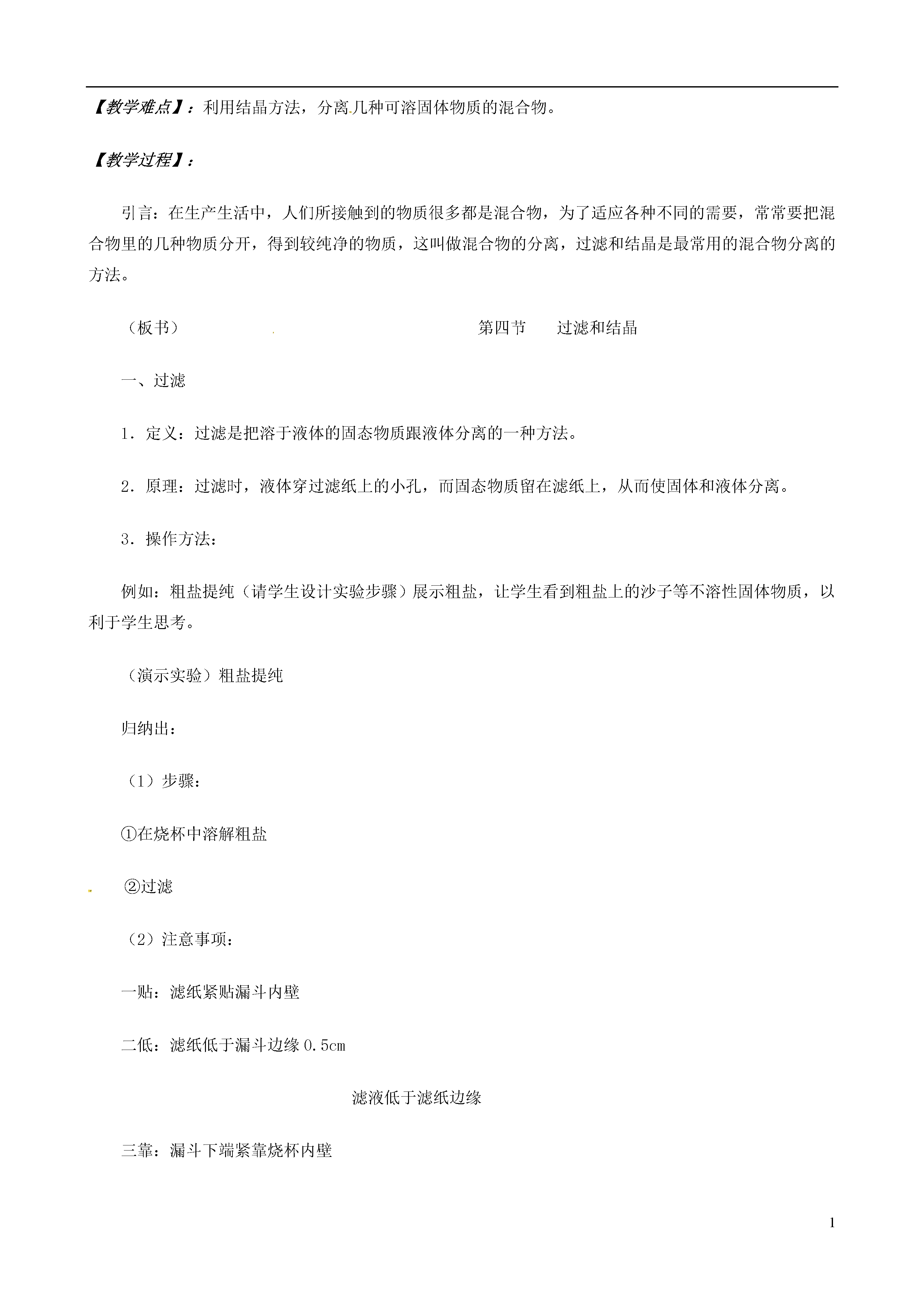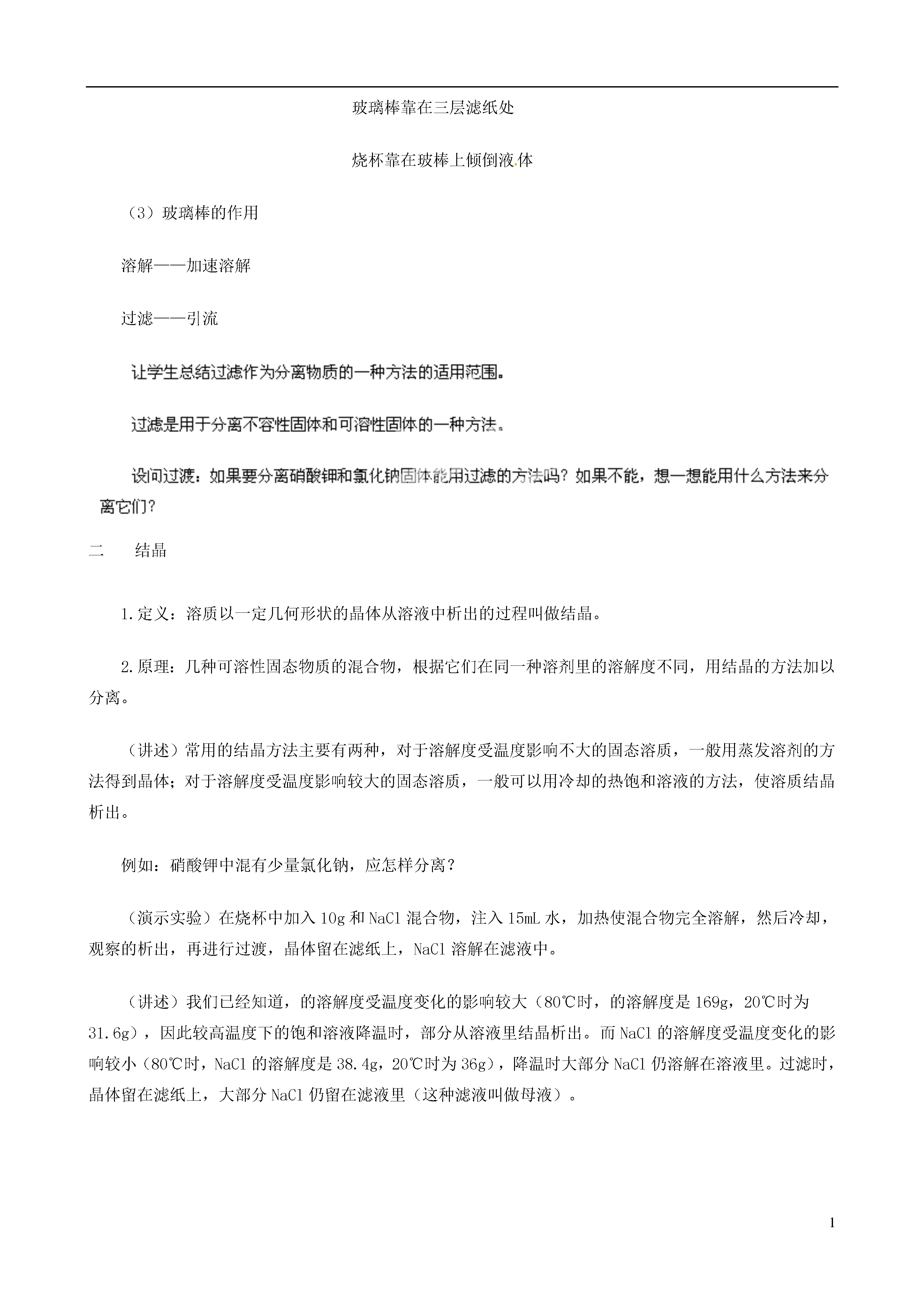 18.4过滤和结晶【教学目标】知识目标:1.了解过滤是使不溶性固体和液体分离的一种常用方法,结晶是分离几种可溶性固体混合物的一种方法。2.了解过滤的适用范围和主要操作,了解利用结晶方法,在提纯物质时的简单应用。能力目标:1.学习过滤操作和结晶操作;2.溶解度曲线与结晶的关系讨论。情感目标:通过粗盐提纯和硝酸钾晶体生成的实验操作渗透科学素质和事实求事精神的培养。【教学安排】1.注意区分过滤和结晶的概念及适用范围,不要混淆2.在讲过滤的操作方法时,注意强调:(1)主要仪器包括哪些(2)操作注意事项3.应明确在操作的各步骤中玻璃棒的作用4.对于学生素质较好的学校,在完成教学大纲所要求的教学内容以后,可结合上节所学有关溶解度的计算,适当补充在温度改变时,有关溶解度的计算。(另加一课时)(1)高温的饱和溶液降温时,会有晶体析出。例:71℃时的溶解度是140g,9℃时是20g,将71℃时的饱和溶液200g降温至9℃时,问能析出多少g晶体?(100g)(2)低温的饱和溶液,升高温度时,需加入一定量的固体溶质,才可使溶液再次达到饱和。例:将20℃时250g饱和溶液,加热至8℃时,需加入多少g晶体才可使溶液再次达到饱和?(已知20℃时的溶解度11.1g,80℃时为21.4g)关于过滤和结晶的教学安排1.本节教材内容较少,也比较简单,目的是向学生介绍两种分离混合物的一般方法,除应用一些固体物质溶解度的知识外,并不做深入的分析和更多的要求。重结晶属选学内容,可根据当地化工生产情况作适当处理。在学法上,从如何得到粗盐,又如何精制为精盐这样的问题引入课题,提出过滤和结晶是最常用的混合物分离方法。接着教材分两段,分别介绍过滤法分离固态物质和结晶法分离可溶性固体的道理。2.为了使学生了解结晶法,可以分离几种可溶性固态物质的混合物,教材安排了一个实验,让学生直观地观察利用热饱和溶液冷却的方法,使硝酸钾从它与氯化钠的混合液中结晶出来,经过滤达到使硝酸钾晶体与氯化钠母液分离的目的。从而进一步从温度变化对硝酸钾和氯化钠的溶解度影响的不同,讲解应用这种方法的道理,以加深学生的理解。3.本节内容不但要以前面学习的溶液、溶解度及影响溶解度的主要因素等相应知识为基础,还与过滤等实验基本操作的技能相联系,如过滤法要跟物质的溶解性及过滤实验操作相联系,结晶法(或重结晶法)跟物质的溶解度、溶解度曲线知识相联系。总结分离、提纯物质的两种方法,可用下表表示:方法过滤结晶适用范围除去液体中固体杂质,或使纯净结晶与母液分离。分离几种可溶性固体的混合物依据原理固体颗粒大,不能通过滤纸或过滤层,而滤液可以通过滤纸或过滤层。利用固体物质溶解性不同,以及溶解度受温度变化影响的不同,使一种物质先结晶而达到分离的目的。主要操作制过滤器、过滤浓缩结晶,降温结晶【教学重点】:用过滤和结晶分离混合物的一般原理。【教学难点】:利用结晶方法,分离几种可溶固体物质的混合物。【教学过程】:引言:在生产生活中,人们所接触到的物质很多都是混合物,为了适应各种不同的需要,常常要把混合物里的几种物质分开,得到较纯净的物质,这叫做混合物的分离,过滤和结晶是最常用的混合物分离的方法。(板书)第四节过滤和结晶一、过滤1.定义:过滤是把溶于液体的固态物质跟液体分离的一种方法。2.原理:过滤时,液体穿过滤纸上的小孔,而固态物质留在滤纸上,从而使固体和液体分离。3.操作方法:例如:粗盐提纯(请学生设计实验步骤)展示粗盐,让学生看到粗盐上的沙子等不溶性固体物质,以利于学生思考。(演示实验)粗盐提纯归纳出:(1)步骤:①在烧杯中溶解粗盐②过滤(2)注意事项:一贴:滤纸紧贴漏斗内壁二低:滤纸低于漏斗边缘0.5cm滤液低于滤纸边缘三靠:漏斗下端紧靠烧杯内壁玻璃棒靠在三层滤纸处烧杯靠在玻棒上倾倒液体(3)玻璃棒的作用溶解——加速溶解过滤——引流二结晶1.定义:溶质以一定几何形状的晶体从溶液中析出的过程叫做结晶。2.原理:几种可溶性固态物质的混合物,根据它们在同一种溶剂里的溶解度不同,用结晶的方法加以分离。(讲述)常用的结晶方法主要有两种,对于溶解度受温度影响不大的固态溶质,一般用蒸发溶剂的方法得到晶体;对于溶解度受温度影响较大的固态溶质,一般可以用冷却的热饱和溶液的方法,使溶质结晶析出。例如:硝酸钾中混有少量氯化钠,应怎样分离?(演示实验)在烧杯中加入10g和NaCl混合物,注入15mL水,加热使混合物完全溶解,然后冷却,观察的析出,再进行过渡,晶体留在滤纸上,NaCl溶解在滤液中。(讲述)我们已经知道,的溶解度受温度变化的影响较大(