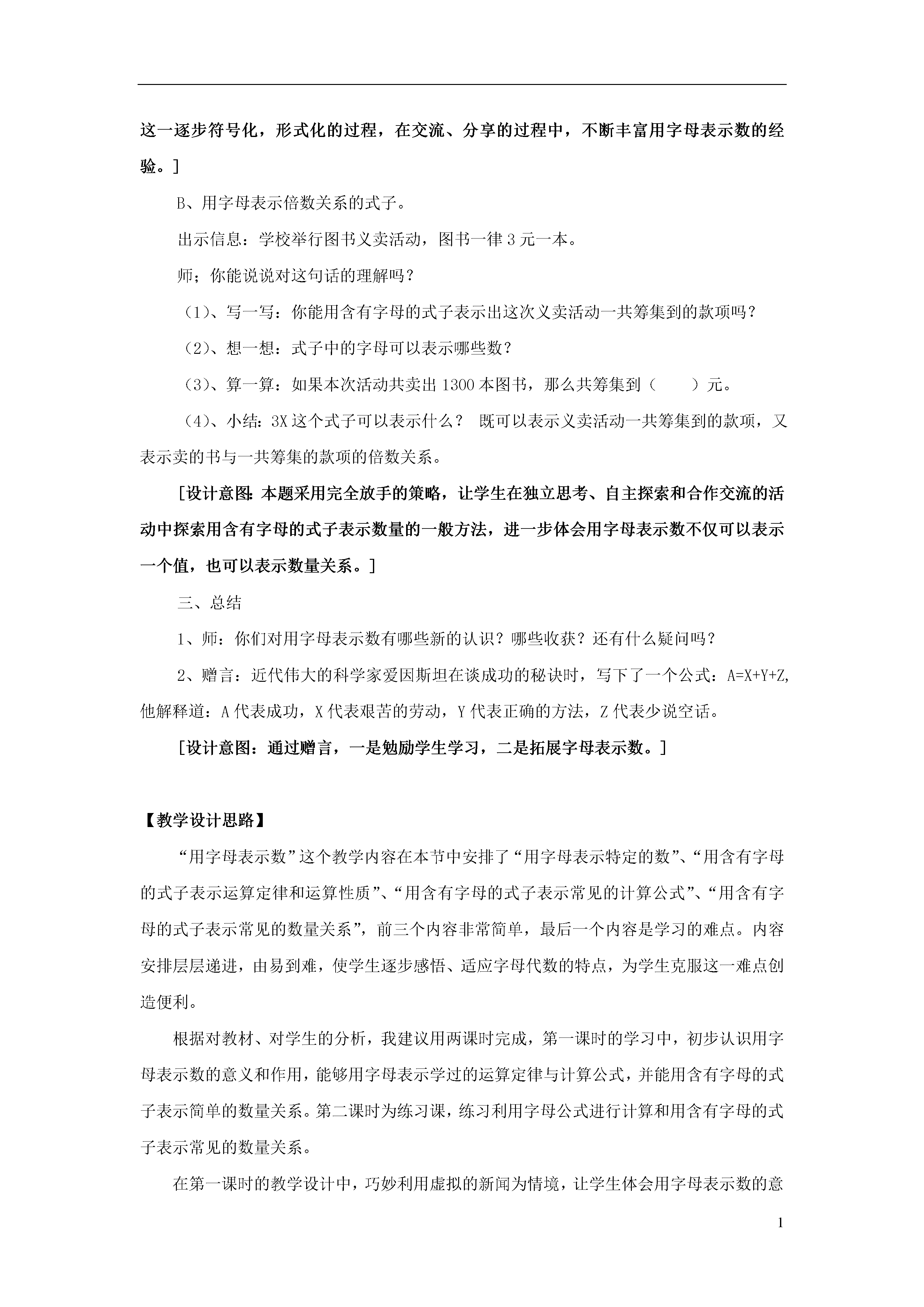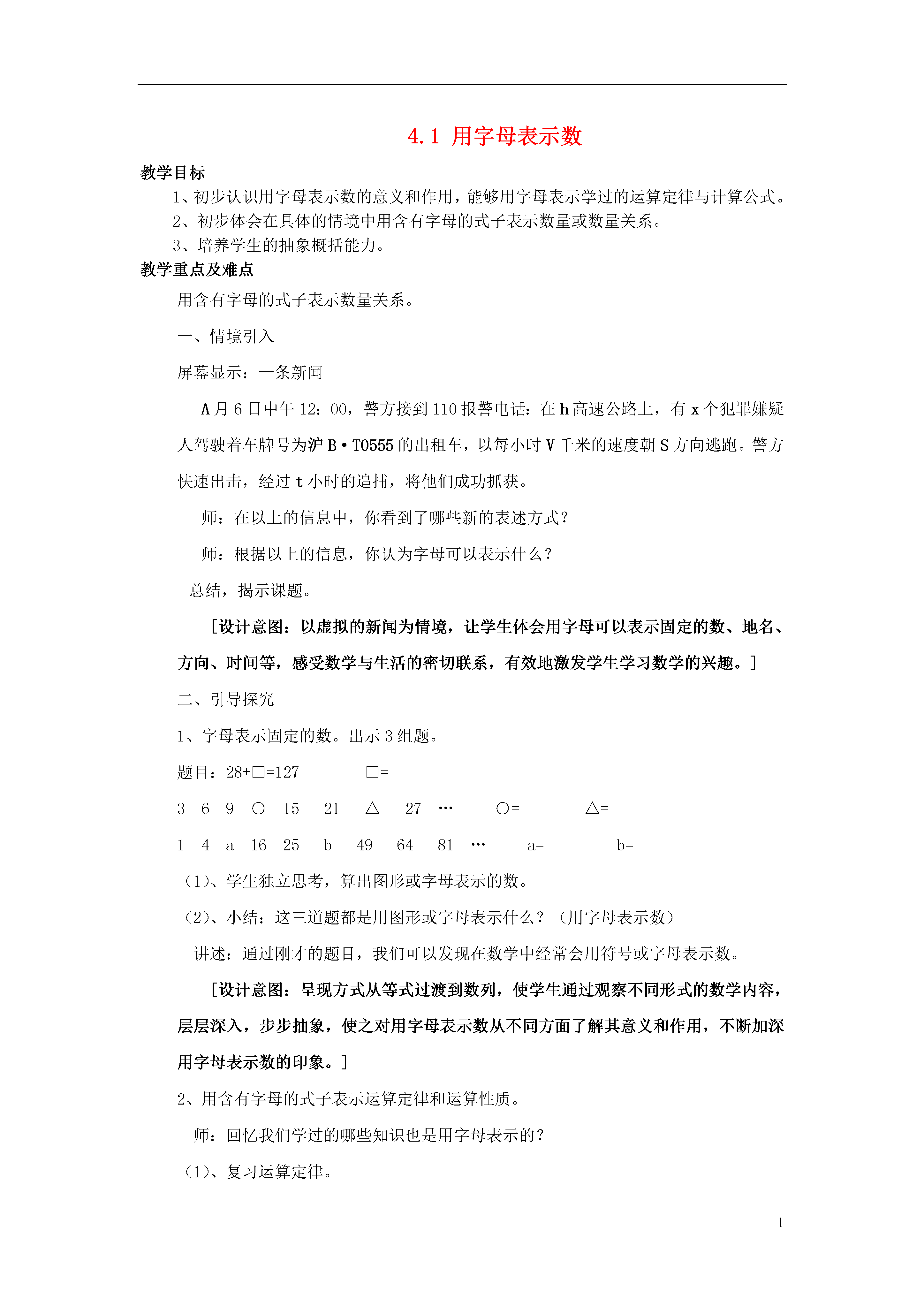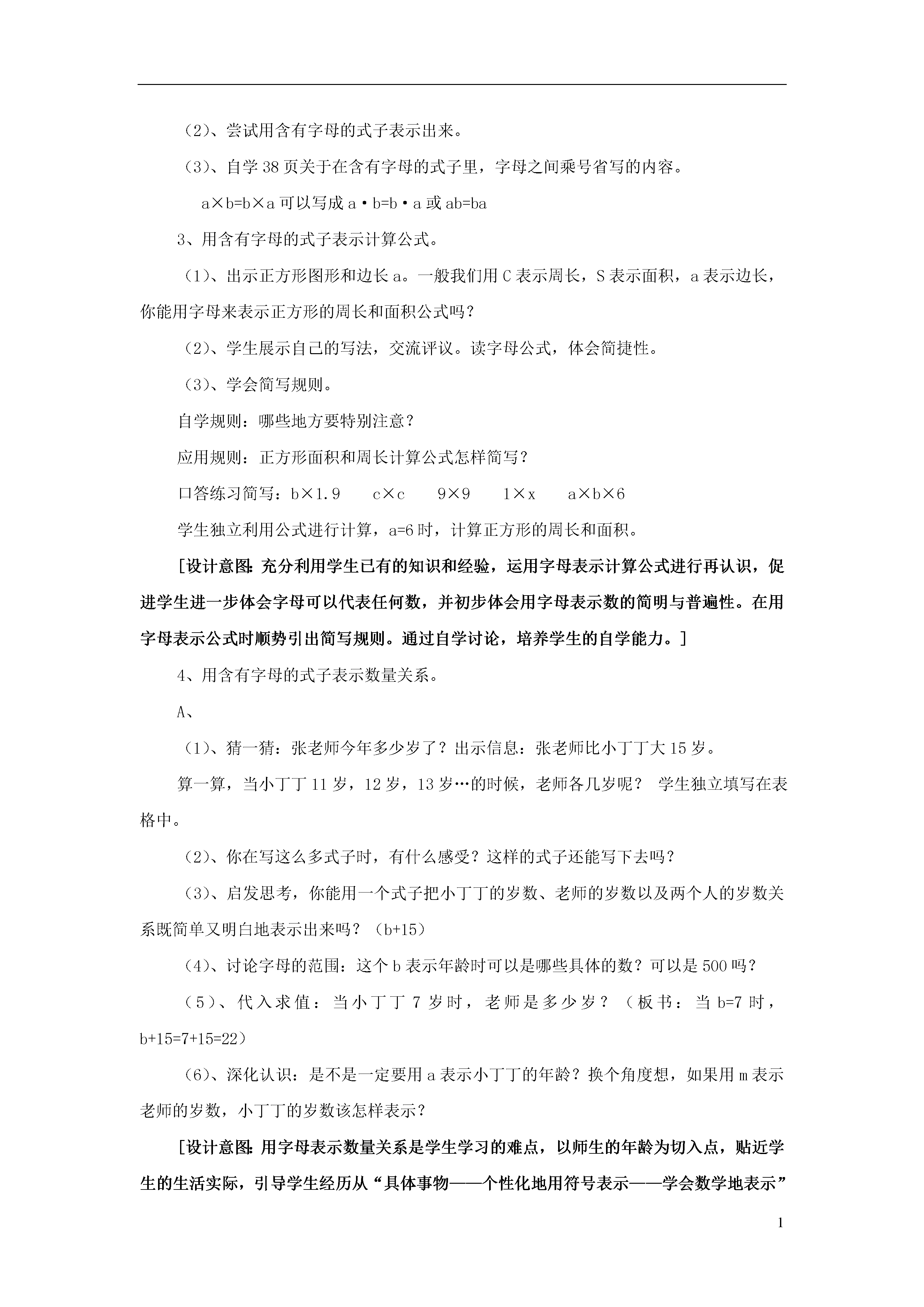 14.1用字母表示数教学目标1、初步认识用字母表示数的意义和作用,能够用字母表示学过的运算定律与计算公式。2、初步体会在具体的情境中用含有字母的式子表示数量或数量关系。3、培养学生的抽象概括能力。教学重点及难点用含有字母的式子表示数量关系。一、情境引入屏幕显示:一条新闻A月6日中午12:00,警方接到110报警电话:在h高速公路上,有x个犯罪嫌疑人驾驶着车牌号为沪B·T0555的出租车,以每小时V千米的速度朝S方向逃跑。警方快速出击,经过t小时的追捕,将他们成功抓获。师:在以上的信息中,你看到了哪些新的表述方式?师:根据以上的信息,你认为字母可以表示什么?总结,揭示课题。[设计意图:以虚拟的新闻为情境,让学生体会用字母可以表示固定的数、地名、方向、时间等,感受数学与生活的密切联系,有效地激发学生学习数学的兴趣。]二、引导探究1、字母表示固定的数。出示3组题。题目:28+□=127□=369○1521△27…○=△=14a1625b496481…a=b=(1)、学生独立思考,算出图形或字母表示的数。(2)、小结:这三道题都是用图形或字母表示什么?(用字母表示数)讲述:通过刚才的题目,我们可以发现在数学中经常会用符号或字母表示数。[设计意图:呈现方式从等式过渡到数列,使学生通过观察不同形式的数学内容,层层深入,步步抽象,使之对用字母表示数从不同方面了解其意义和作用,不断加深用字母表示数的印象。]2、用含有字母的式子表示运算定律和运算性质。师:回忆我们学过的哪些知识也是用字母表示的?(1)、复习运算定律。(2)、尝试用含有字母的式子表示出来。(3)、自学38页关于在含有字母的式子里,字母之间乘号省写的内容。a×b=b×a可以写成a·b=b·a或ab=ba3、用含有字母的式子表示计算公式。(1)、出示正方形图形和边长a。一般我们用C表示周长,S表示面积,a表示边长,你能用字母来表示正方形的周长和面积公式吗?(2)、学生展示自己的写法,交流评议。读字母公式,体会简捷性。(3)、学会简写规则。自学规则:哪些地方要特别注意?应用规则:正方形面积和周长计算公式怎样简写?口答练习简写:b×1.9c×c9×91×xa×b×6学生独立利用公式进行计算,a=6时,计算正方形的周长和面积。[设计意图:充分利用学生已有的知识和经验,运用字母表示计算公式进行再认识,促进学生进一步体会字母可以代表任何数,并初步体会用字母表示数的简明与普遍性。在用字母表示公式时顺势引出简写规则。通过自学讨论,培养学生的自学能力。]4、用含有字母的式子表示数量关系。A、(1)、猜一猜:张老师今年多少岁了?出示信息:张老师比小丁丁大15岁。算一算,当小丁丁11岁,12岁,13岁…的时候,老师各几岁呢?学生独立填写在表格中。(2)、你在写这么多式子时,有什么感受?这样的式子还能写下去吗?(3)、启发思考,你能用一个式子把小丁丁的岁数、老师的岁数以及两个人的岁数关系既简单又明白地表示出来吗?(b+15)(4)、讨论字母的范围:这个b表示年龄时可以是哪些具体的数?可以是500吗?(5)、代入求值:当小丁丁7岁时,老师是多少岁?(板书:当b=7时,b+15=7+15=22)(6)、深化认识:是不是一定要用a表示小丁丁的年龄?换个角度想,如果用m表示老师的岁数,小丁丁的岁数该怎样表示?[设计意图:用字母表示数量关系是学生学习的难点,以师生的年龄为切入点,贴近学生的生活实际,引导学生经历从“具体事物——个性化地用符号表示——学会数学地表示”这一逐步符号化,形式化的过程,在交流、分享的过程中,不断丰富用字母表示数的经验。]B、用字母表示倍数关系的式子。出示信息:学校举行图书义卖活动,图书一律3元一本。师;你能说说对这句话的理解吗?(1)、写一写:你能用含有字母的式子表示出这次义卖活动一共筹集到的款项吗?(2)、想一想:式子中的字母可以表示哪些数?(3)、算一算:如果本次活动共卖出1300本图书,那么共筹集到()元。(4)、小结:3X这个式子可以表示什么?既可以表示义卖活动一共筹集到的款项,又表示卖的书与一共筹集的款项的倍数关系。[设计意图:本题采用完全放手的策略,让学生在独立思考、自主探索和合作交流的活动中探索用含有字母的式子表示数量的一般方法,进一步体会用字母表示数不仅可以表示一个值,也可以表示数量关系。]三、总结1、师:你们对用字母表示数有哪些新的认识?哪些收获?还有什么疑问吗?2、赠言:近代伟大的科学家爱因斯坦在谈成功的秘诀时,写下了一个公式:A=X+Y+Z,他解释道:A代表成功,X代表艰苦的劳动,Y代表正确的方法,Z代表少说空话。[设计意图:通过赠言,一